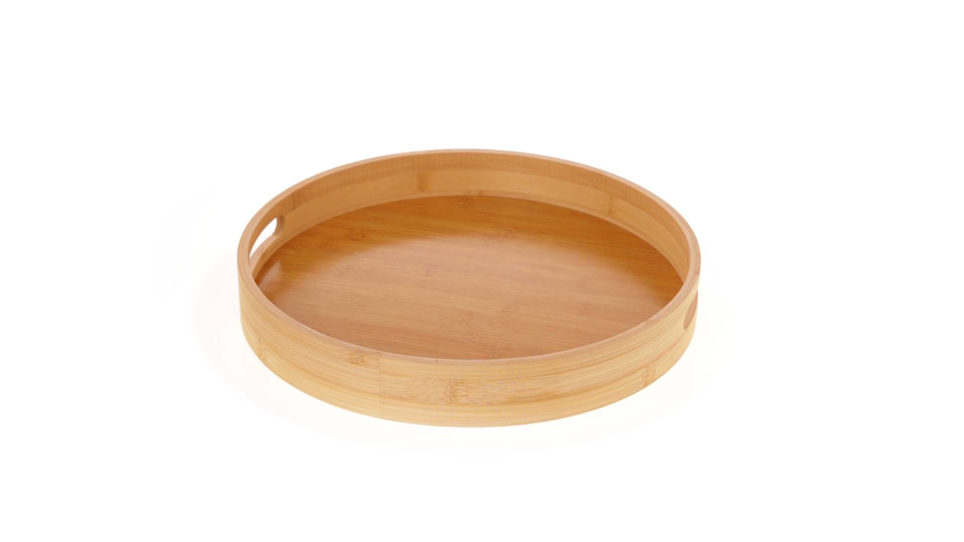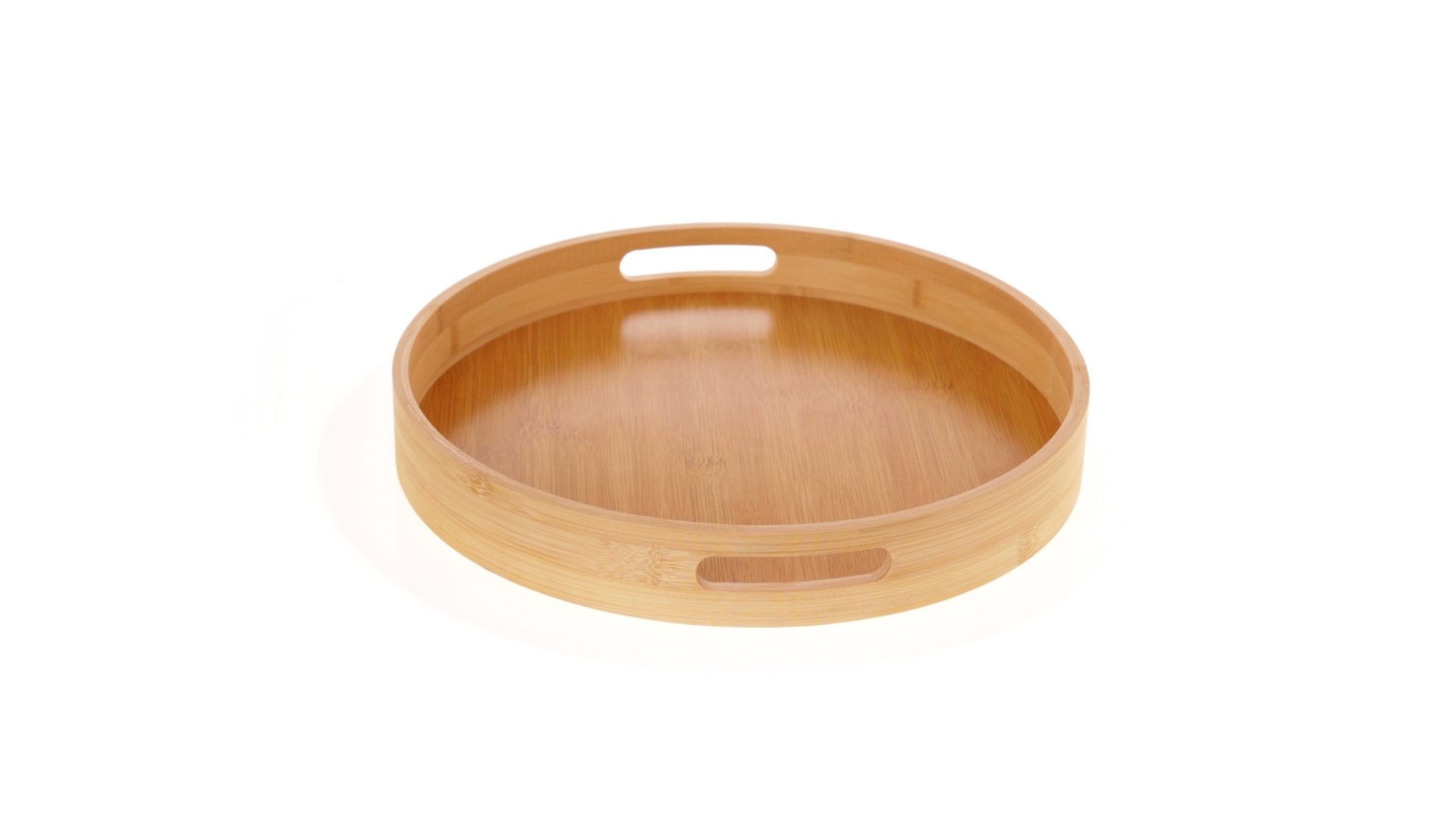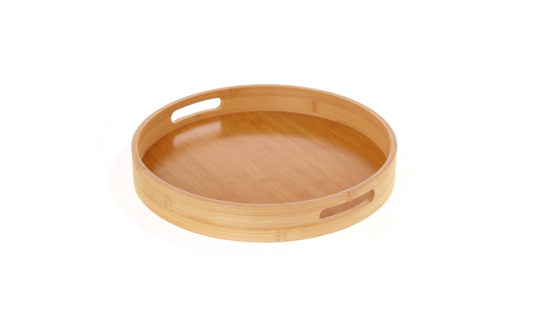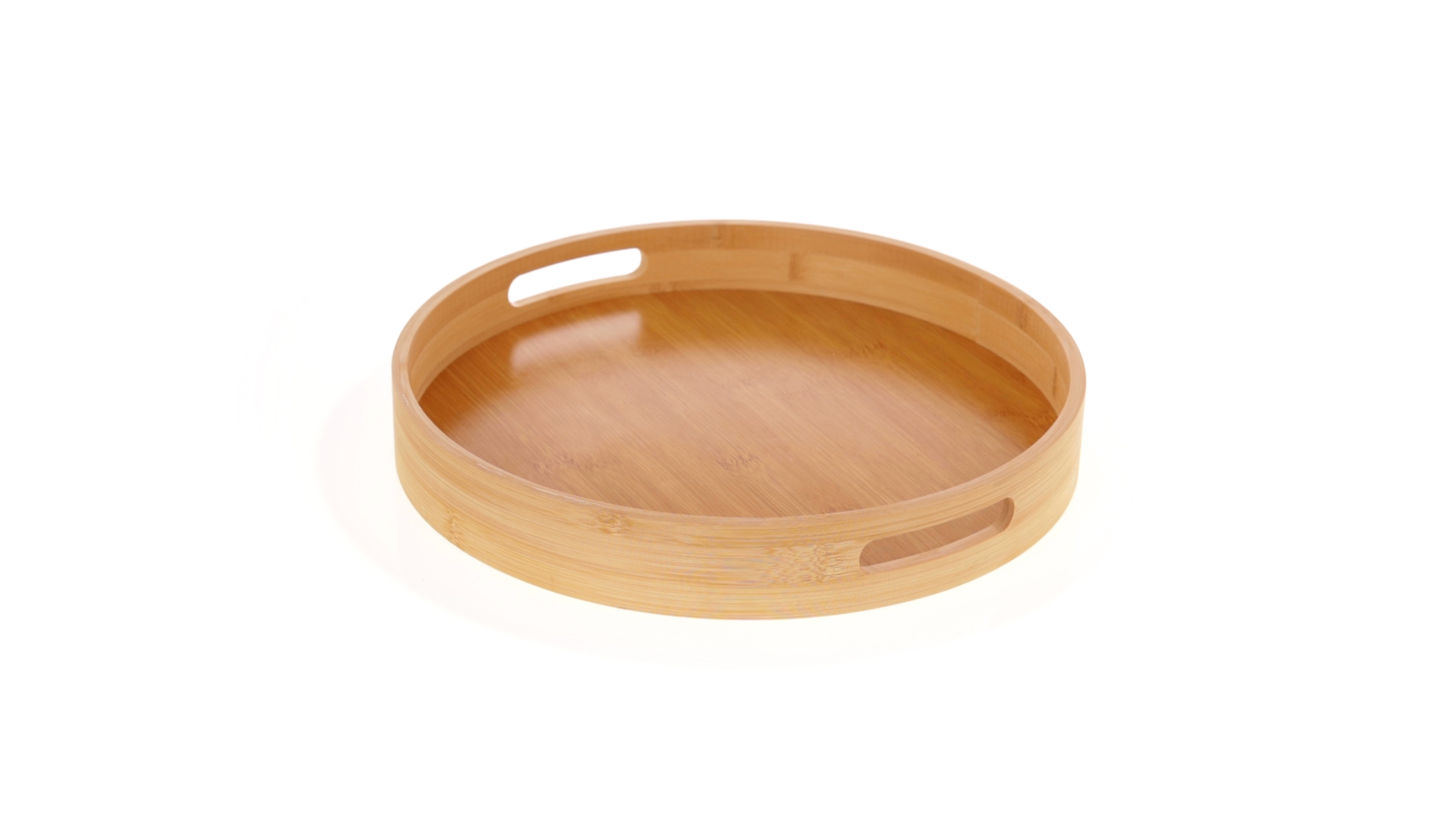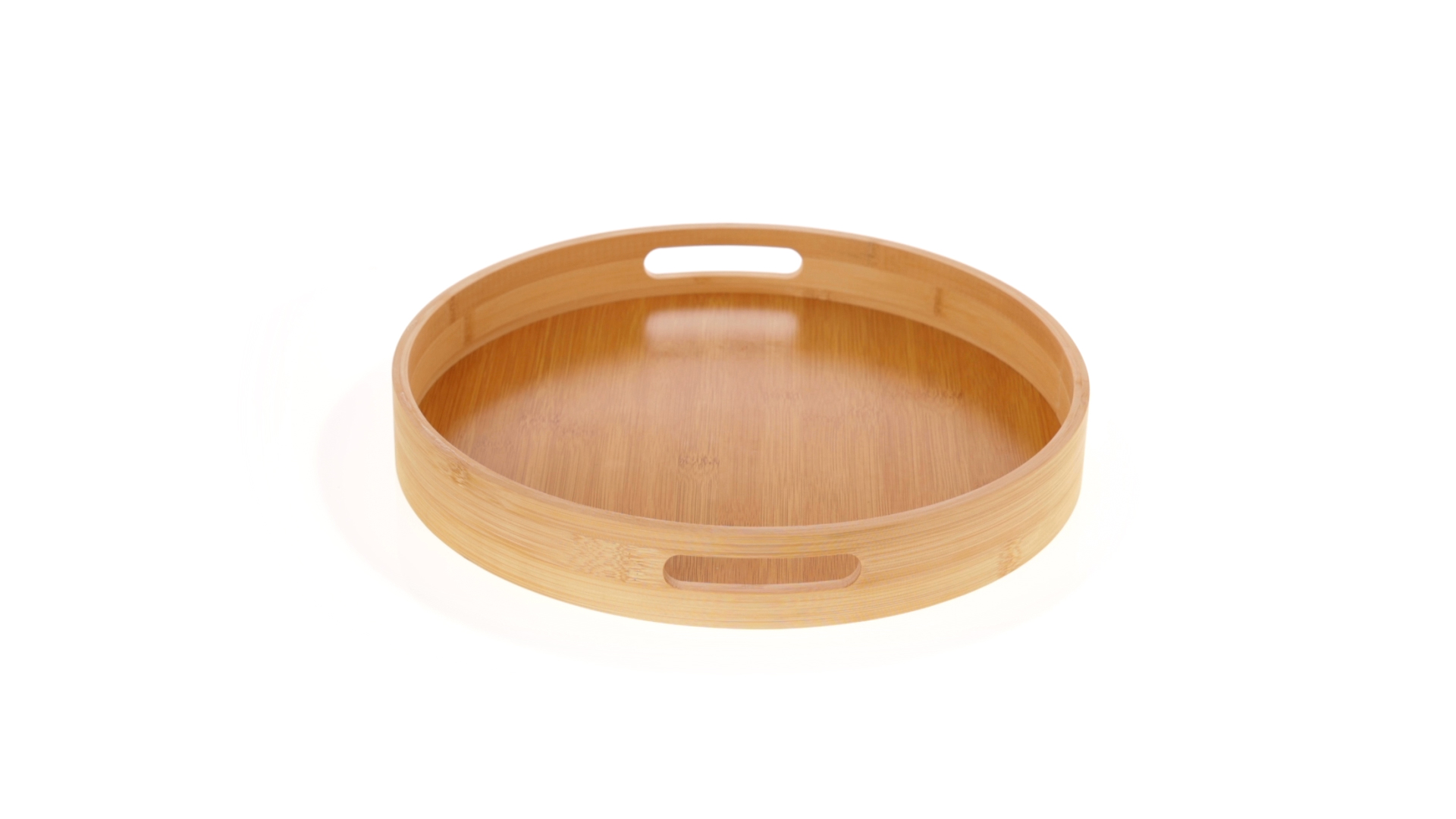 Tablett aus Bambus. Umweltfreundliches Design aus weichem Bambus zum bequemen Tragen von Getränken mithilfe der gestanzten Griffe. Materialien wie Bambus fördern die Verwendung natürlicher Rohstoffe und reduzieren den Schadstoffausstoss.