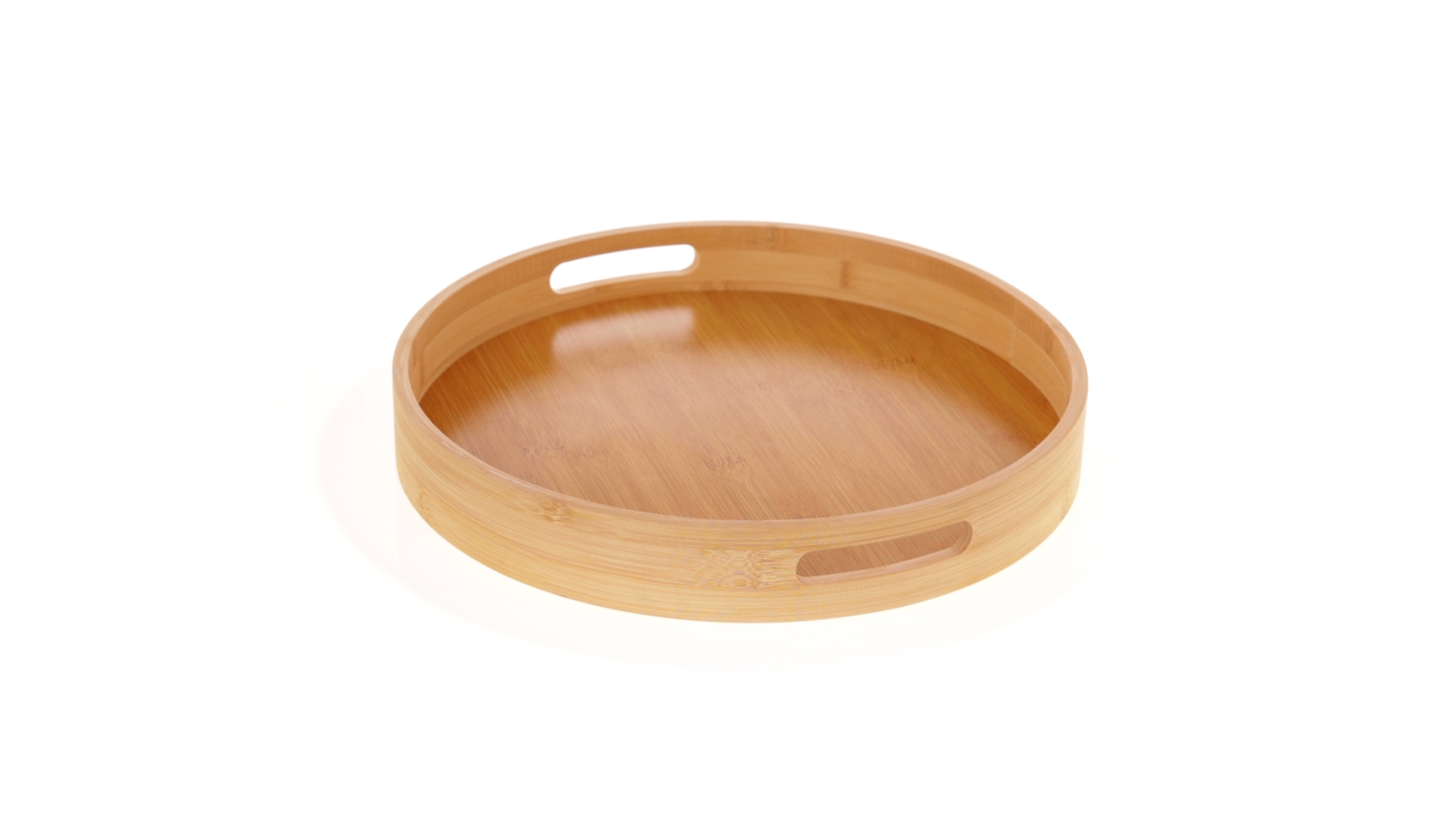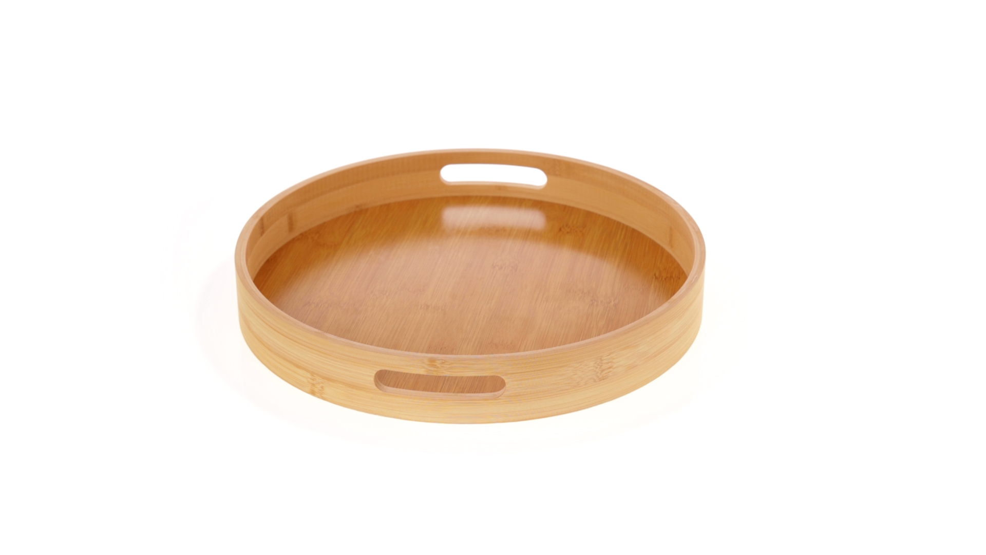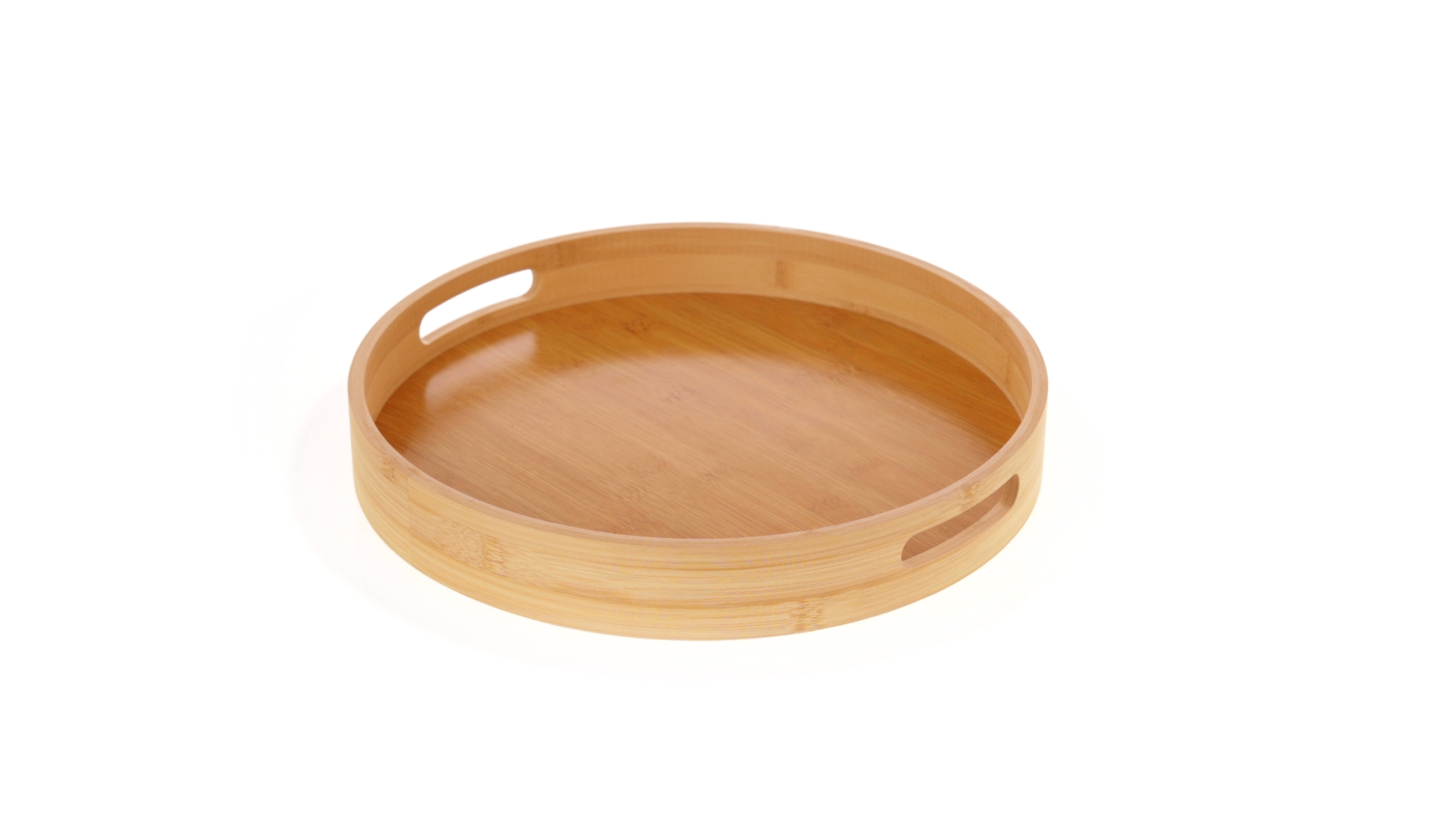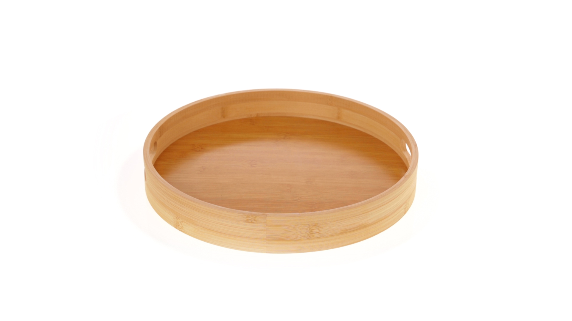 Tablett aus Bambus. Umweltfreundliches Design aus weichem Bambus zum bequemen Tragen von Getränken mithilfe der gestanzten Griffe. Materialien wie Bambus fördern die Verwendung natürlicher Rohstoffe und reduzieren den Schadstoffausstoss.
