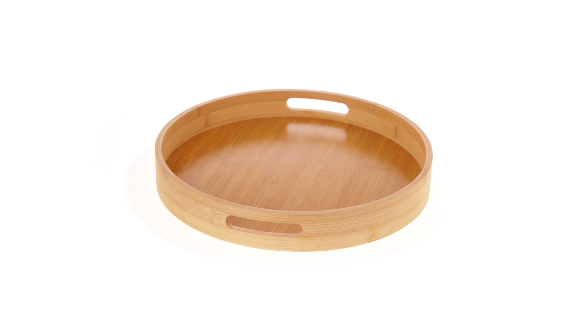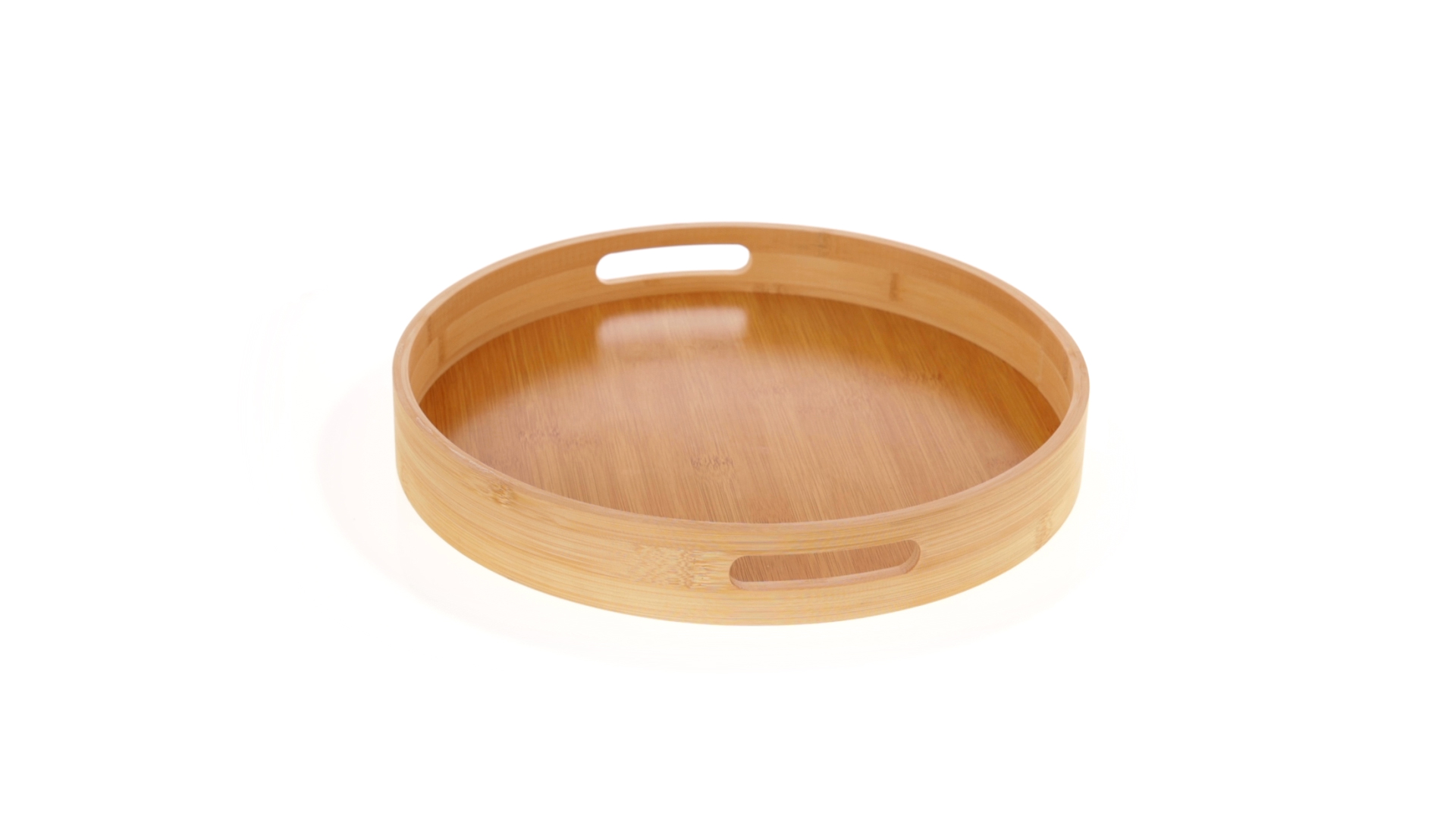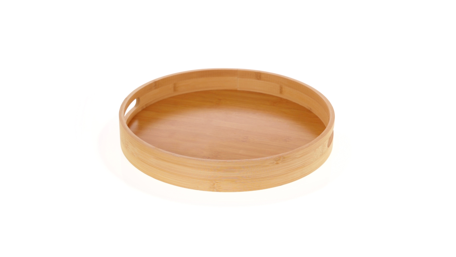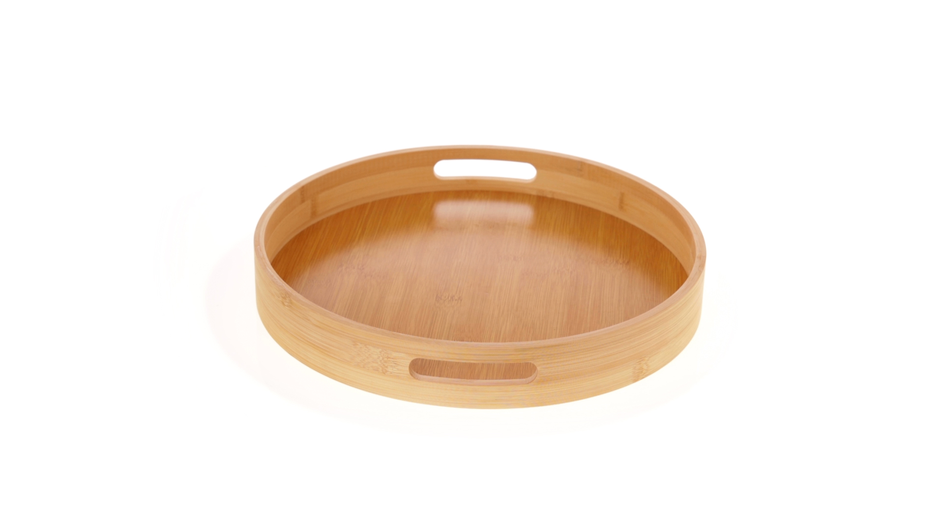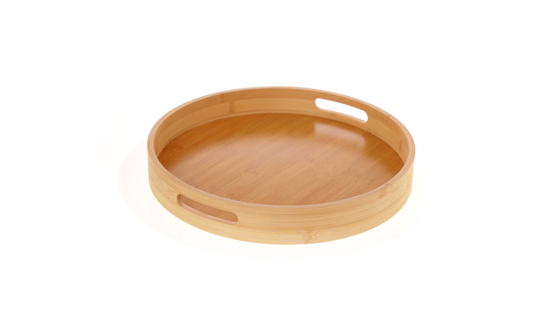 Tablett aus Bambus. Umweltfreundliches Design aus weichem Bambus zum bequemen Tragen von Getränken mithilfe der gestanzten Griffe. Materialien wie Bambus fördern die Verwendung natürlicher Rohstoffe und reduzieren den Schadstoffausstoss.