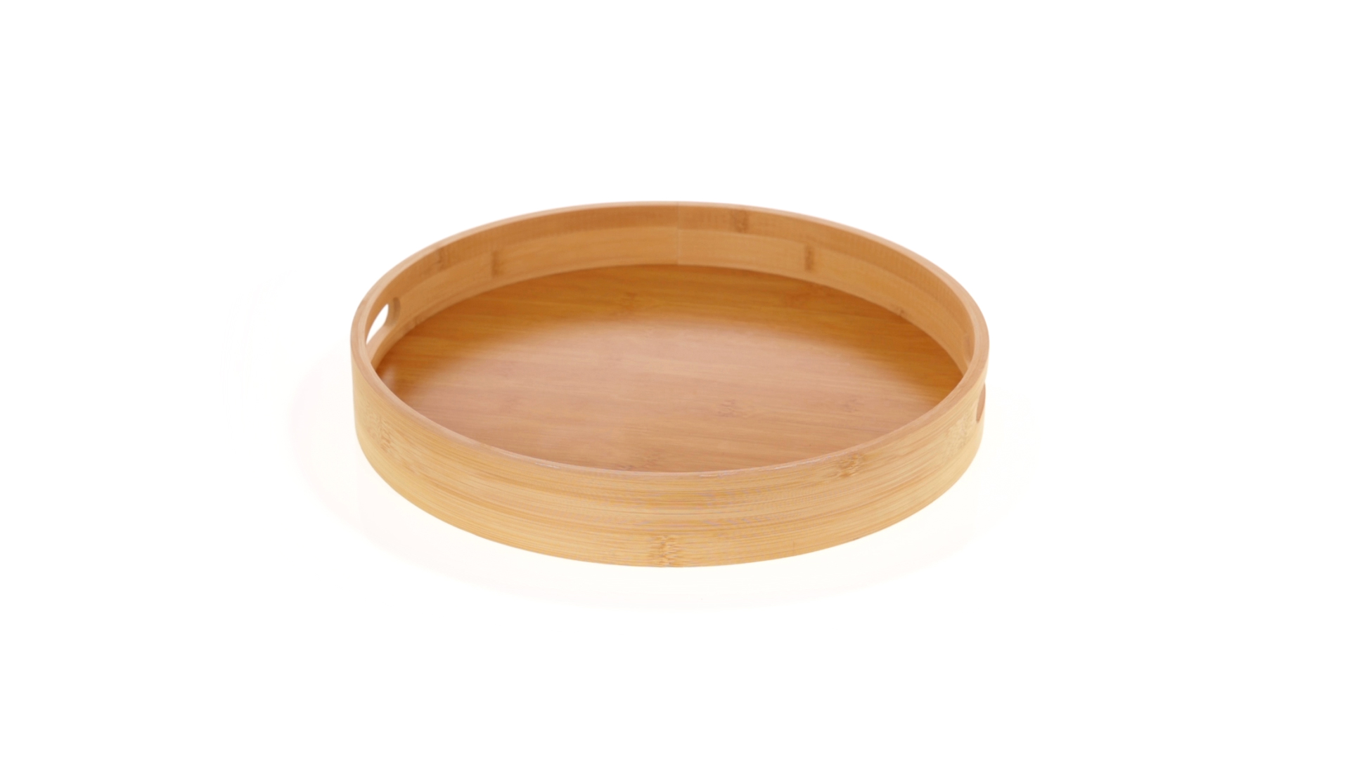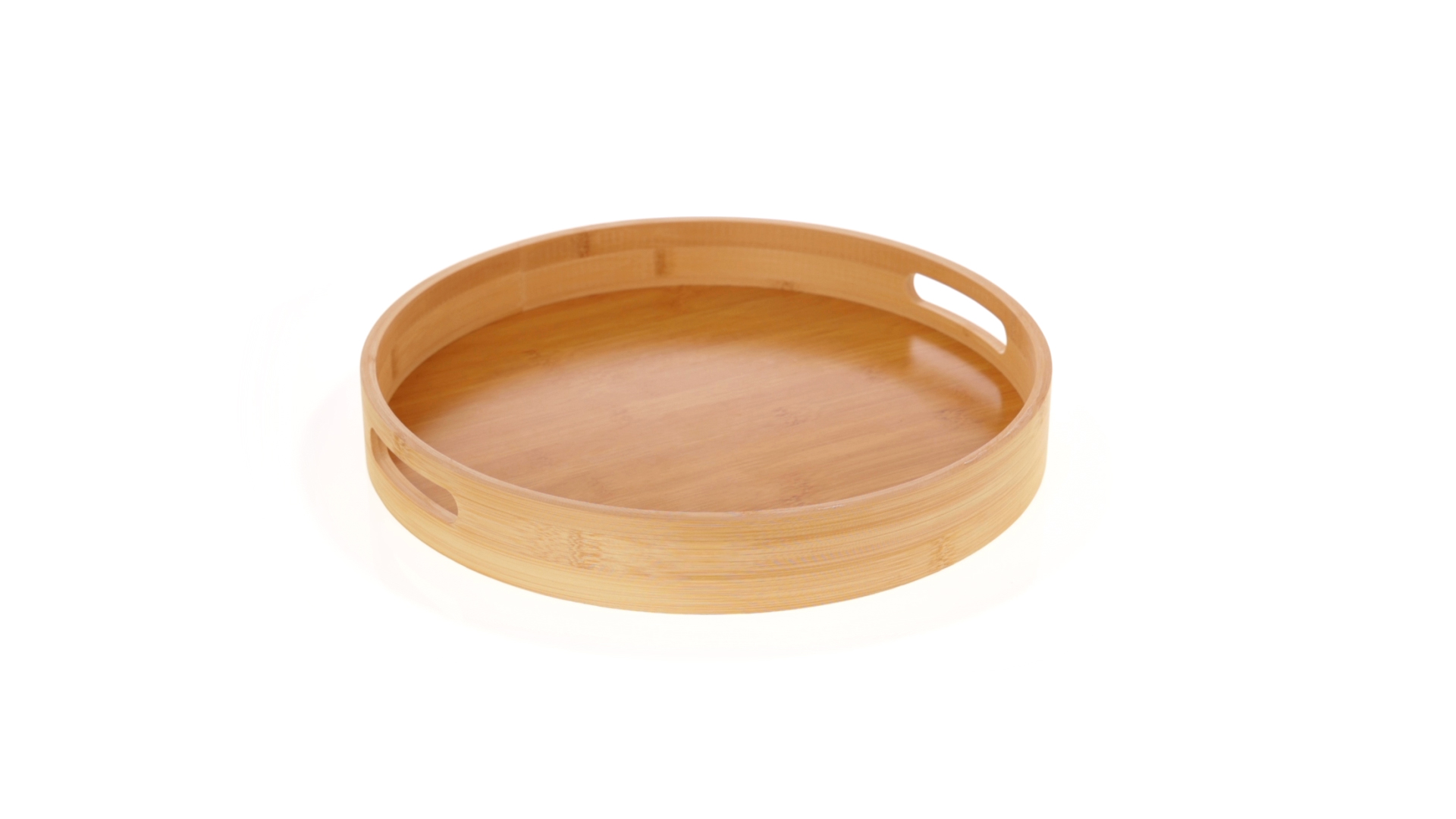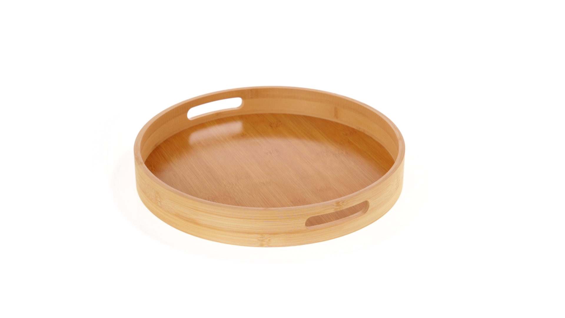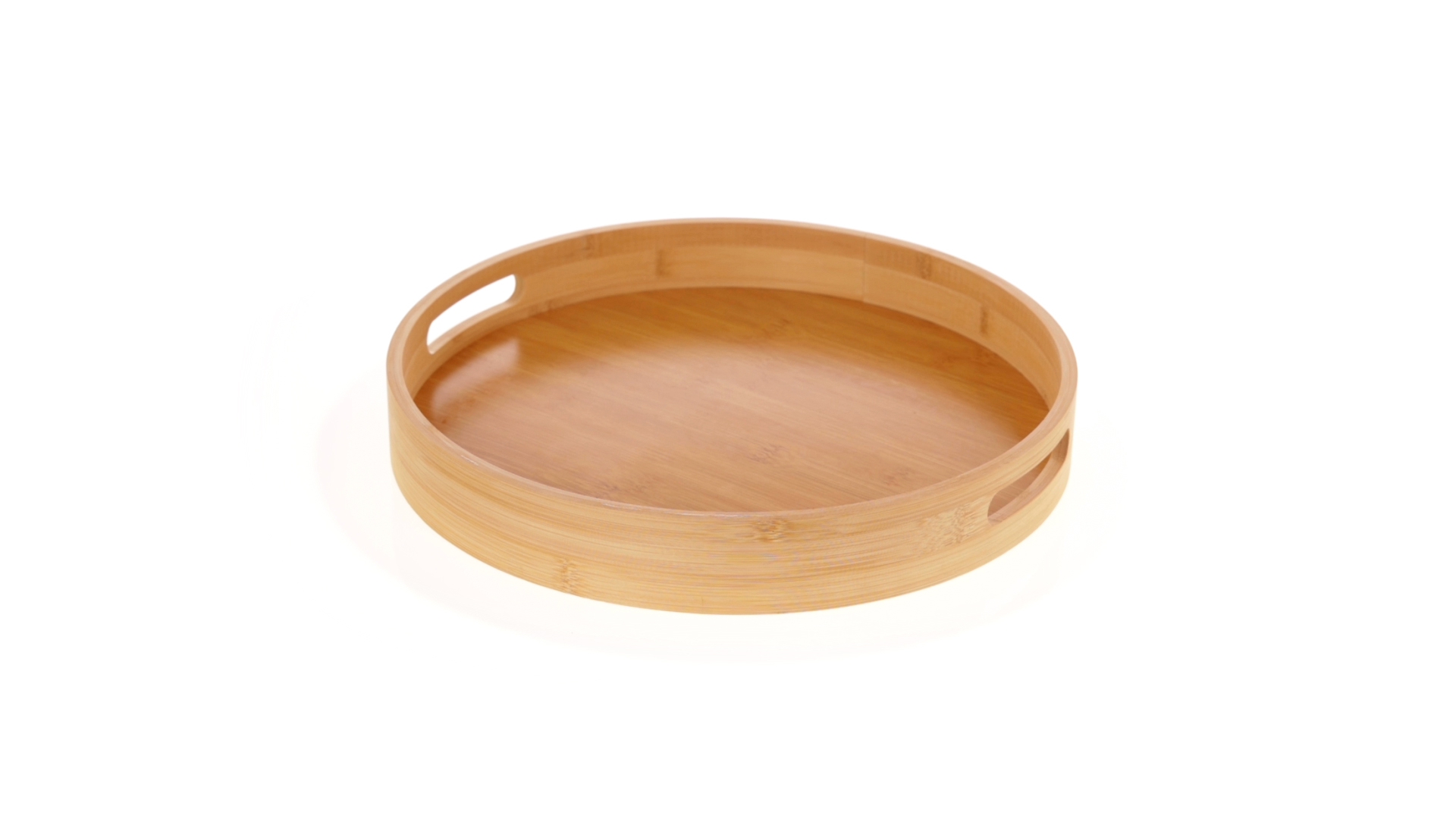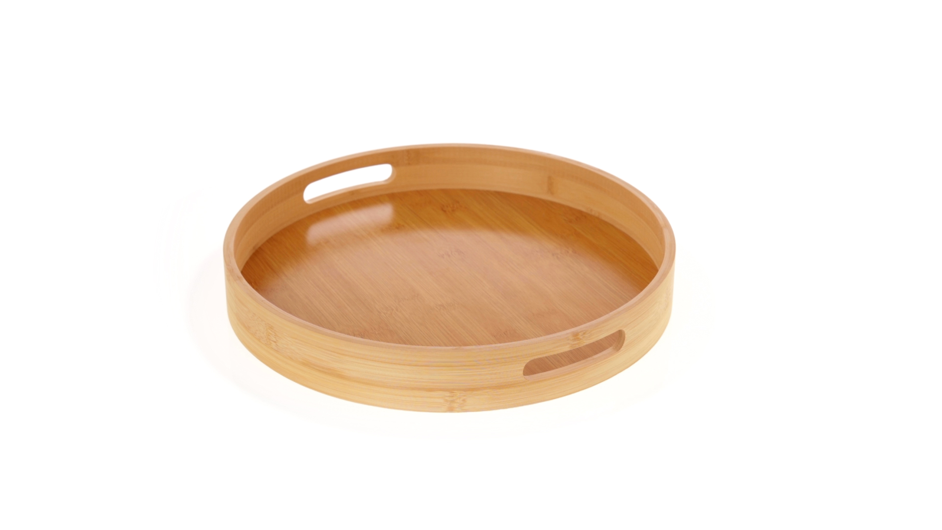 Tablett aus Bambus. Umweltfreundliches Design aus weichem Bambus zum bequemen Tragen von Getränken mithilfe der gestanzten Griffe. Materialien wie Bambus fördern die Verwendung natürlicher Rohstoffe und reduzieren den Schadstoffausstoss.