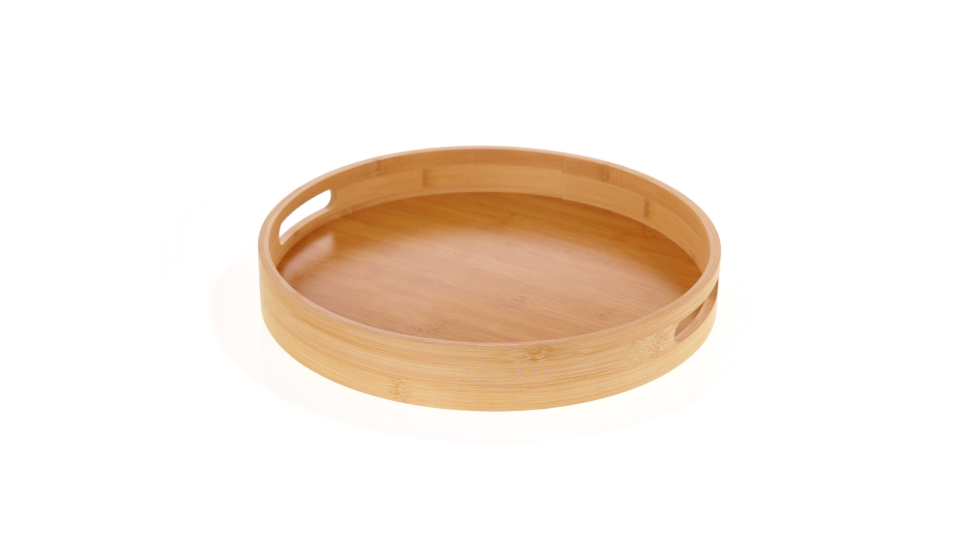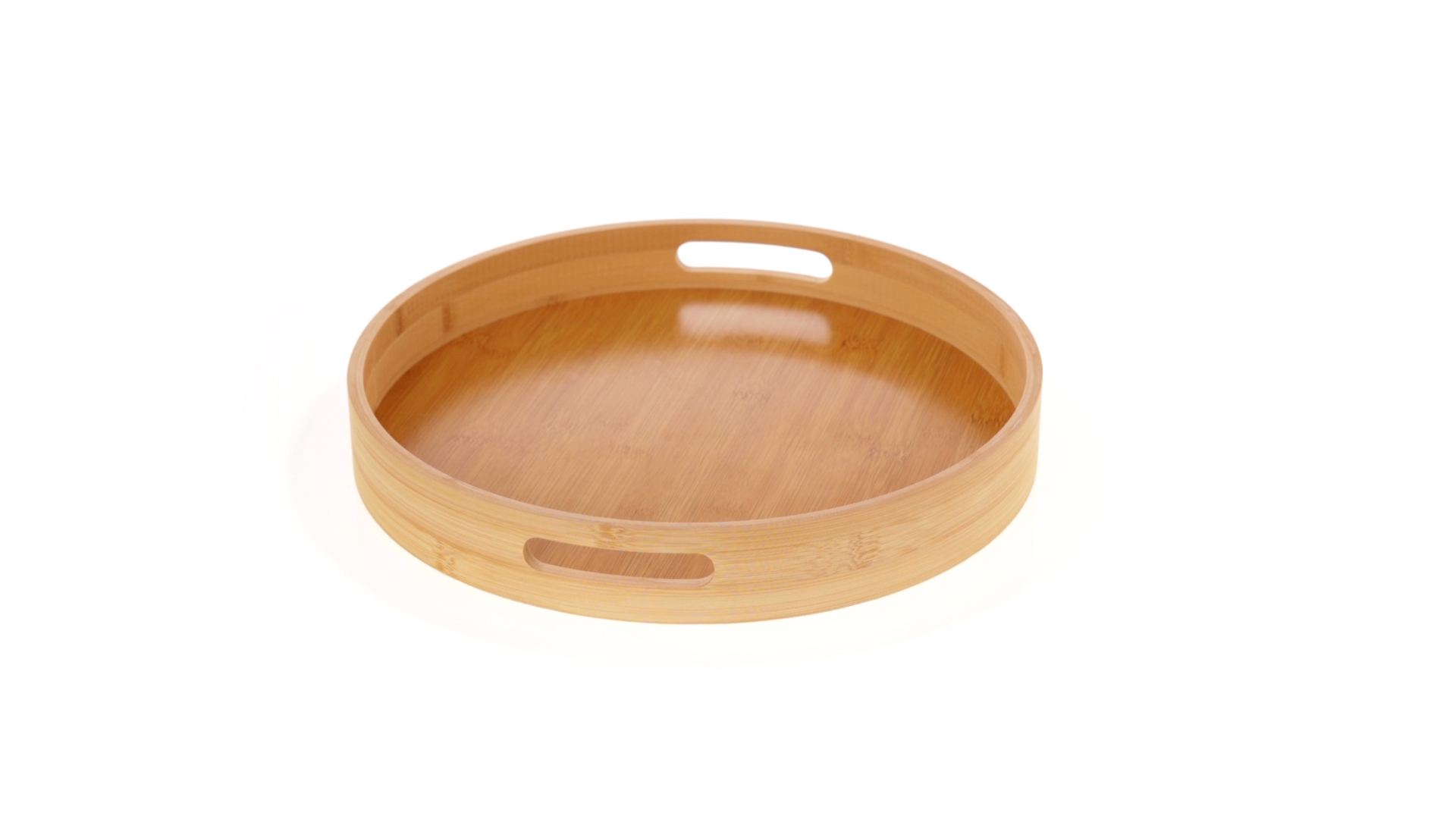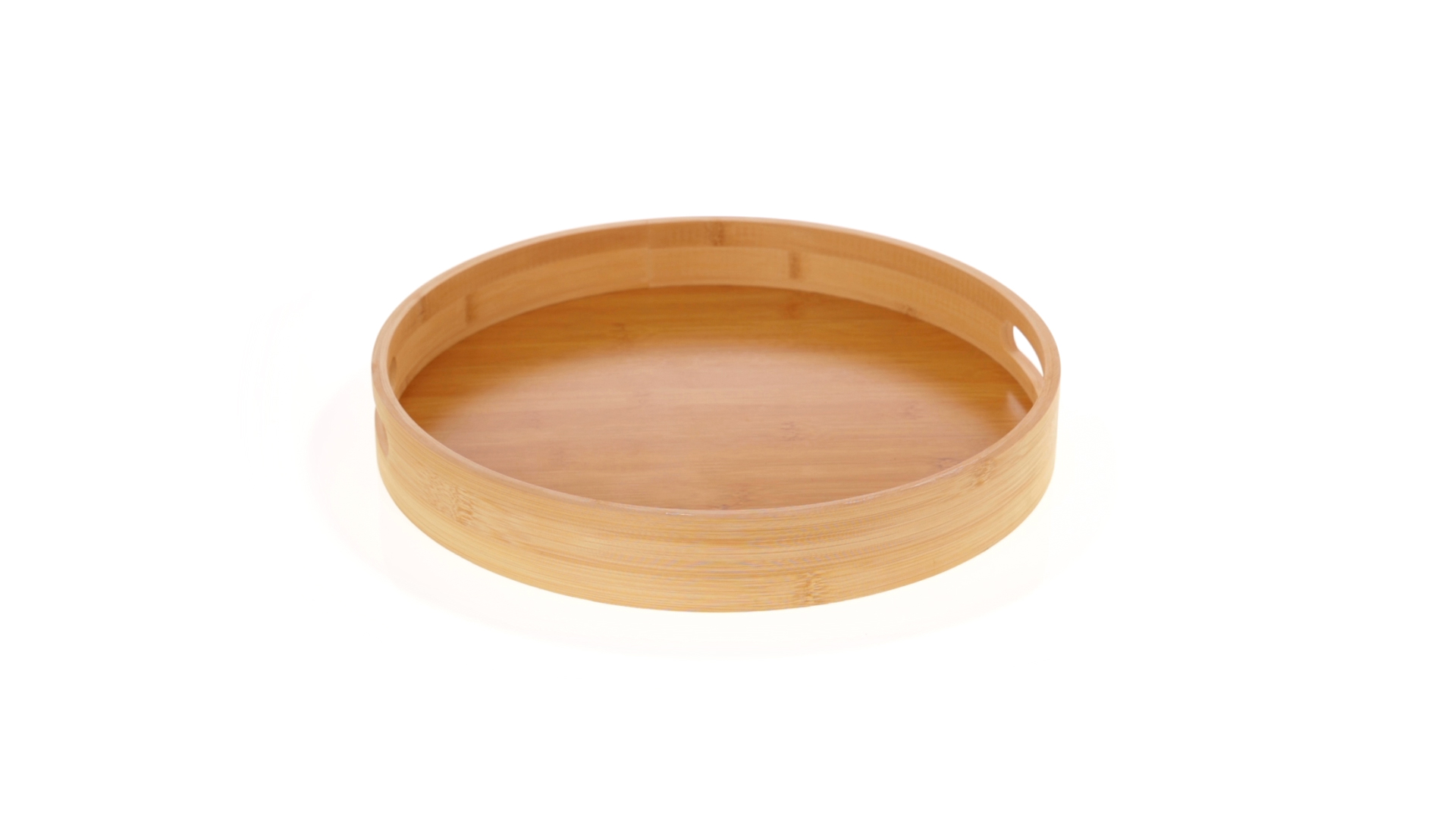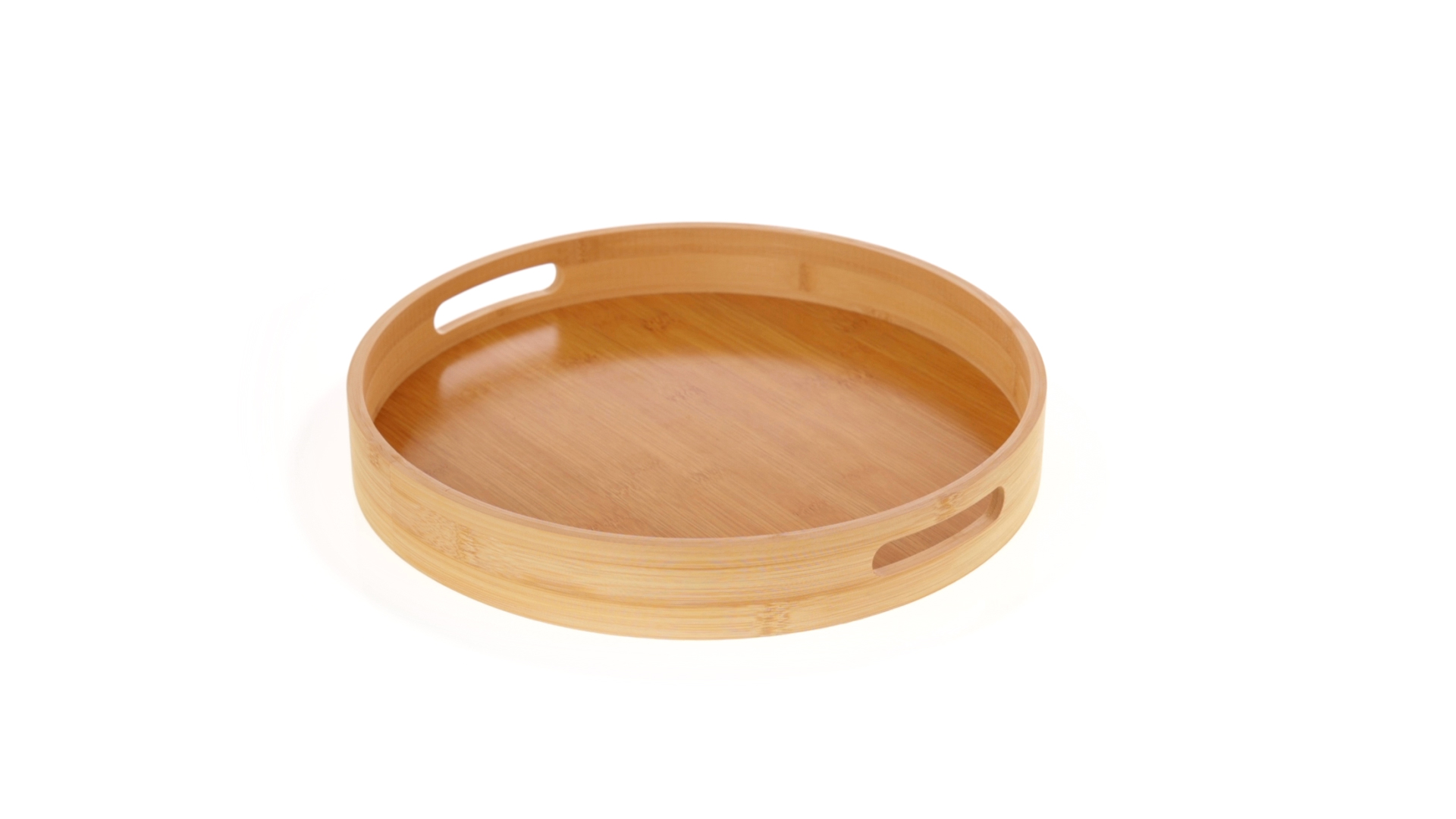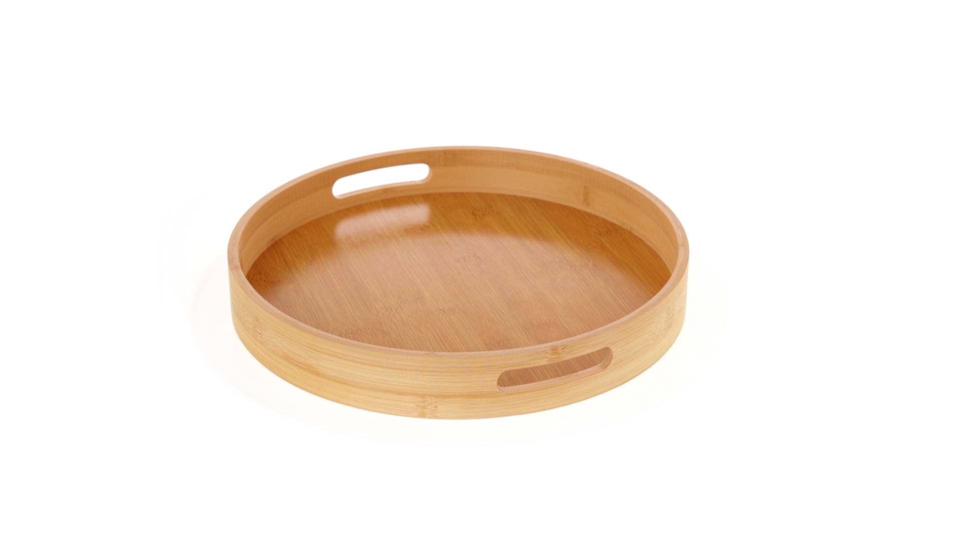 Tablett aus Bambus. Umweltfreundliches Design aus weichem Bambus zum bequemen Tragen von Getränken mithilfe der gestanzten Griffe. Materialien wie Bambus fördern die Verwendung natürlicher Rohstoffe und reduzieren den Schadstoffausstoss.