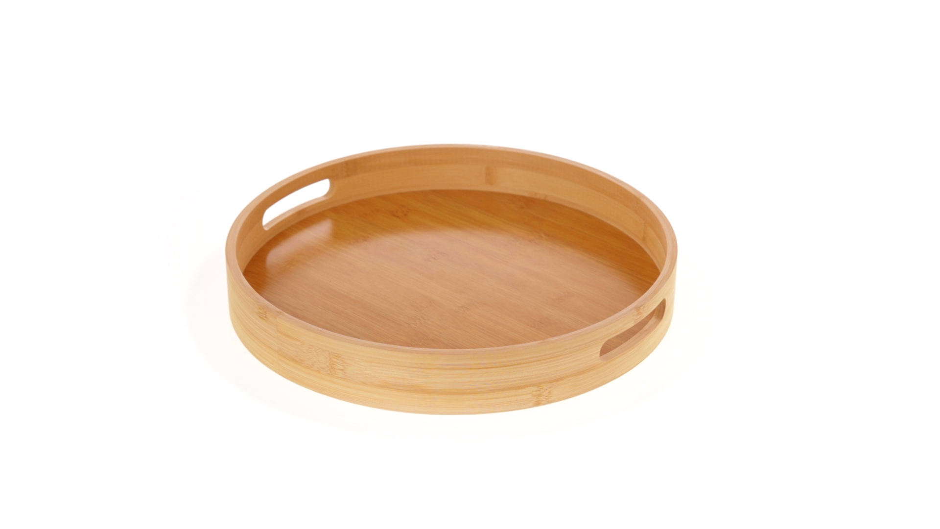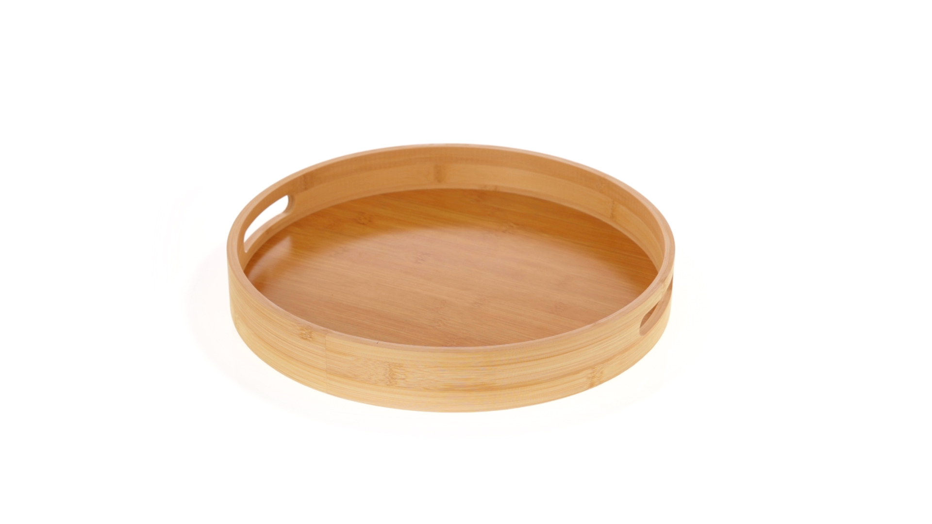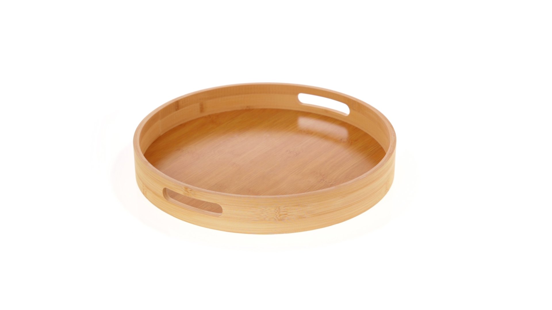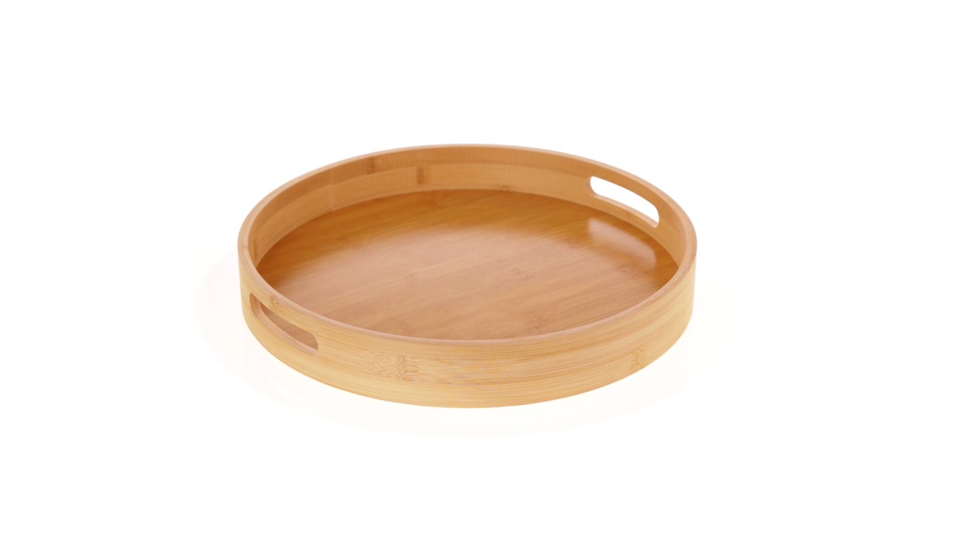 Tablett aus Bambus. Umweltfreundliches Design aus weichem Bambus zum bequemen Tragen von Getränken mithilfe der gestanzten Griffe. Materialien wie Bambus fördern die Verwendung natürlicher Rohstoffe und reduzieren den Schadstoffausstoss.