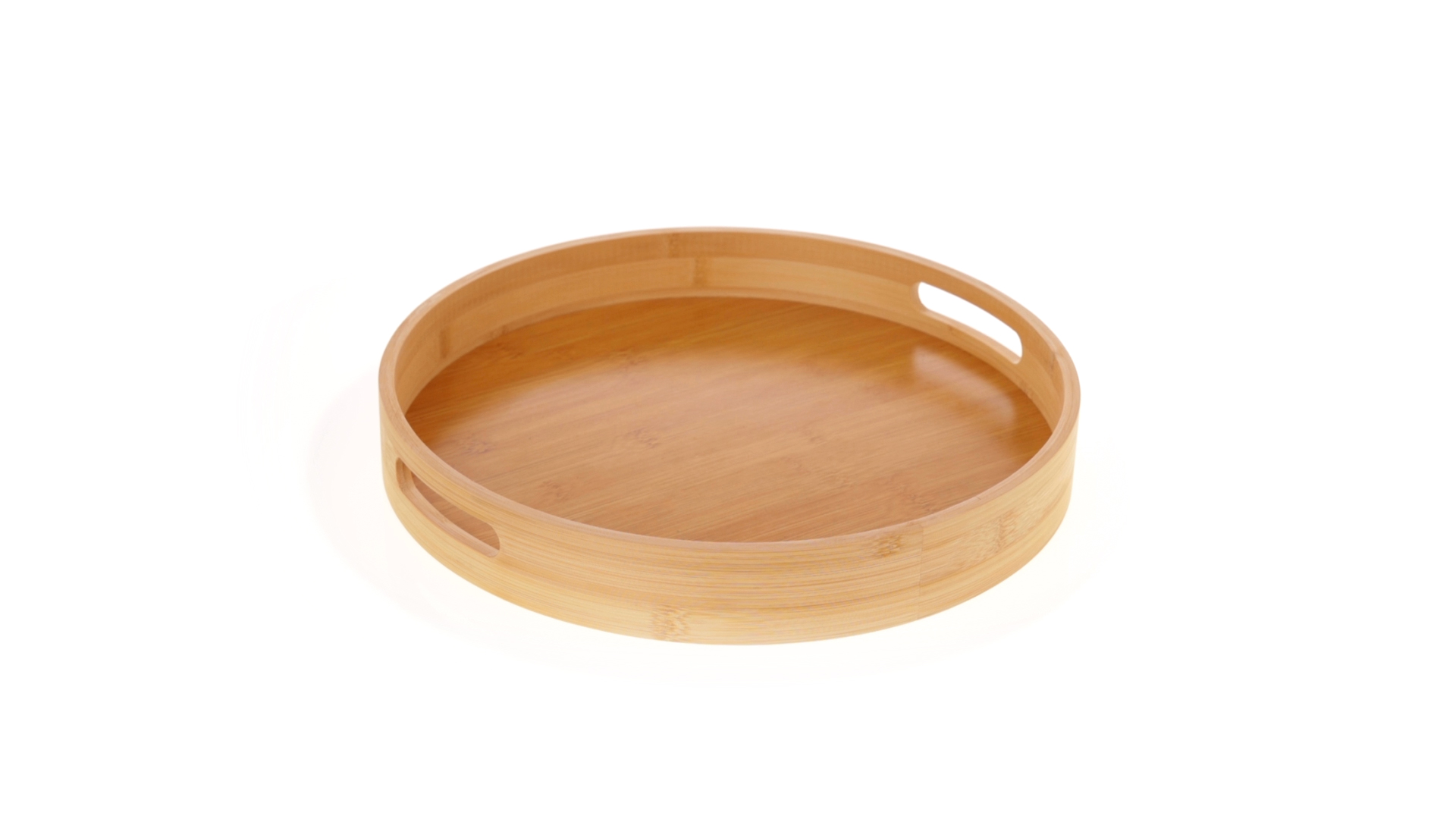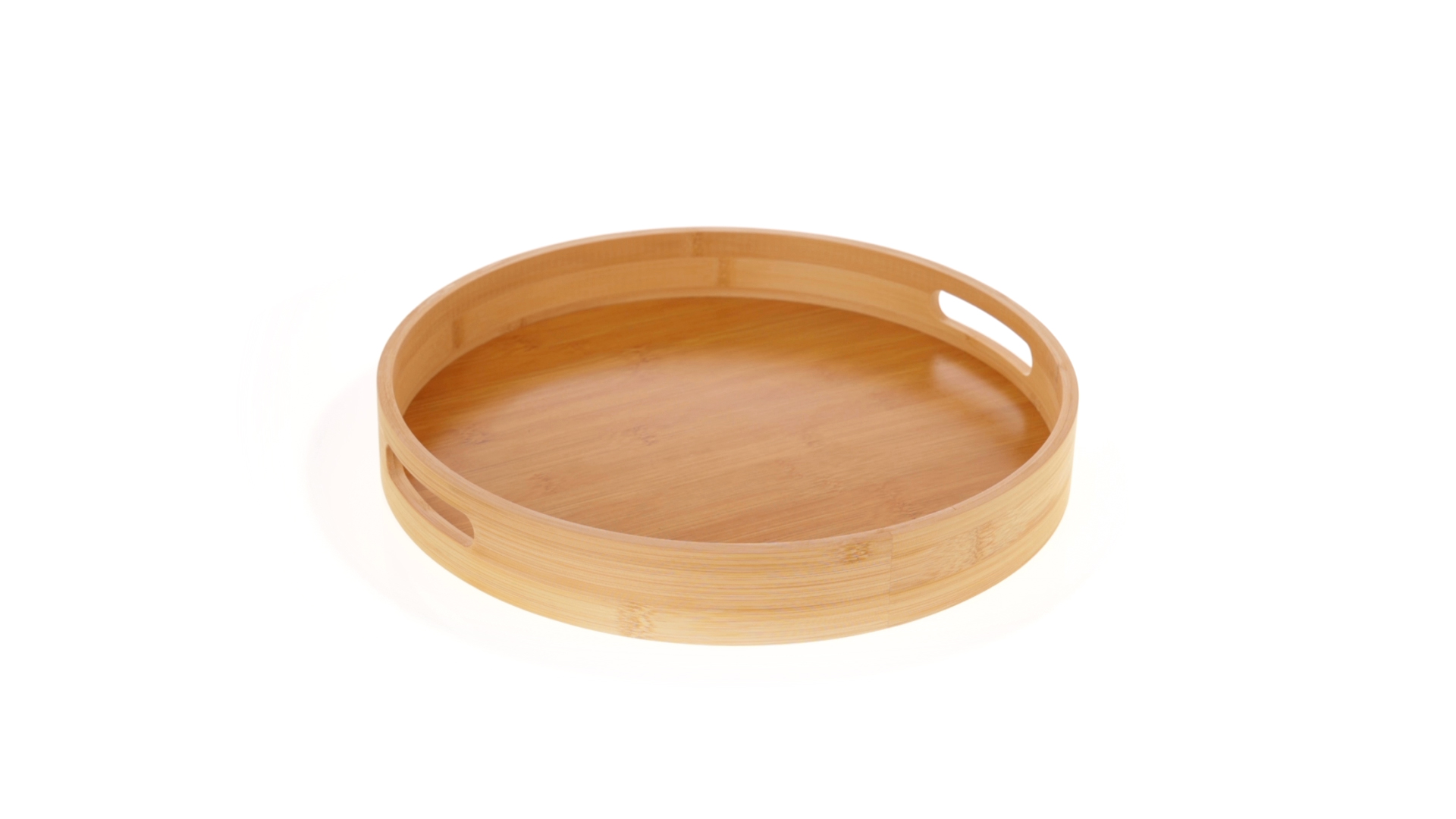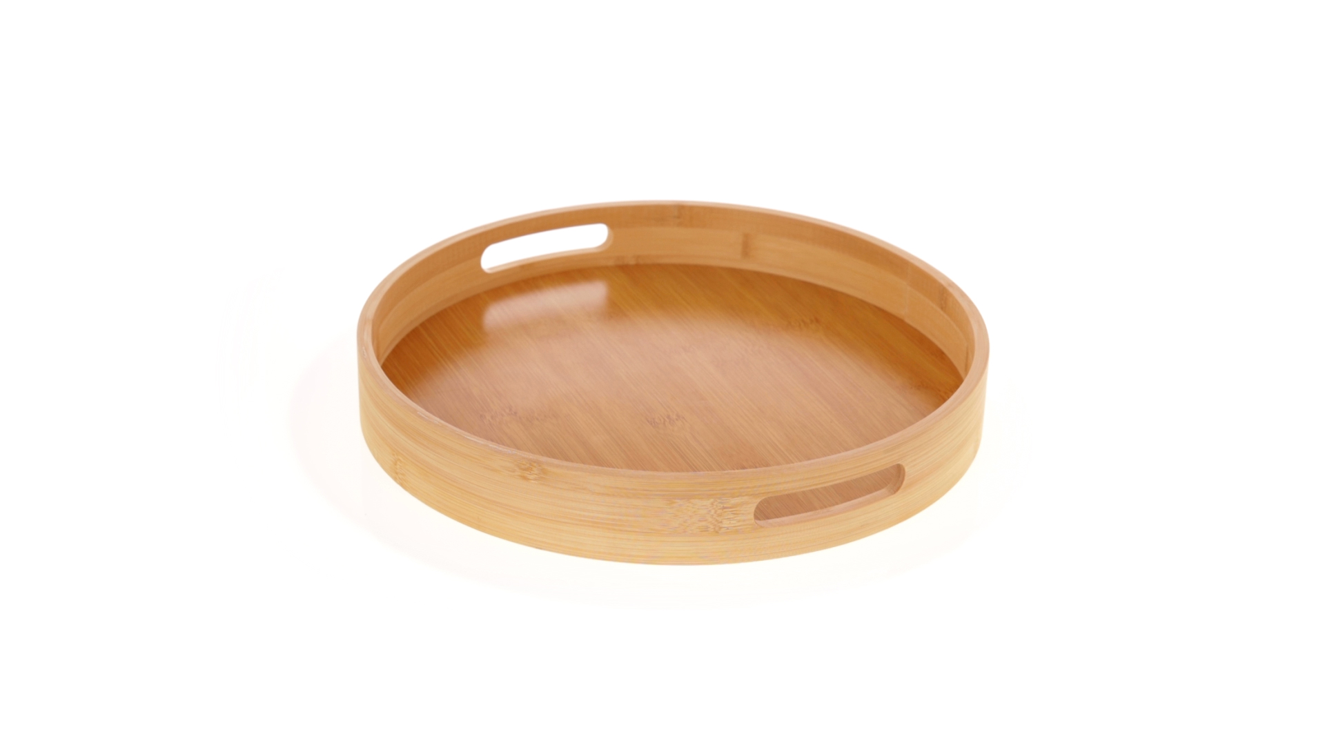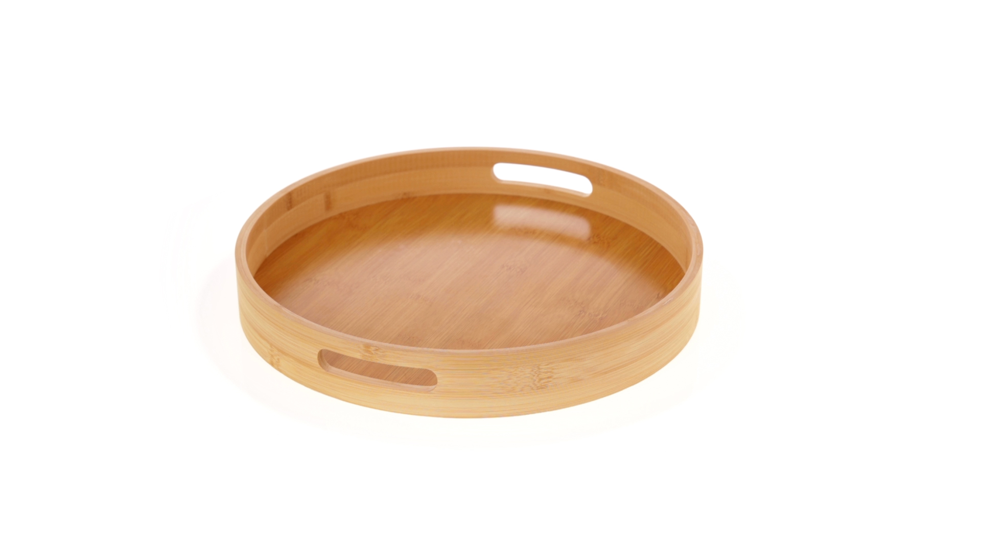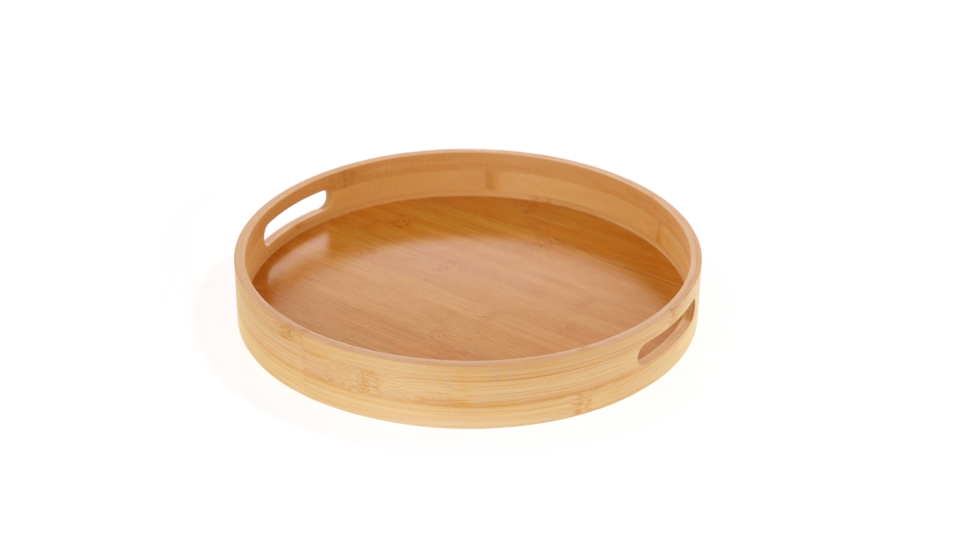 Tablett aus Bambus. Umweltfreundliches Design aus weichem Bambus zum bequemen Tragen von Getränken mithilfe der gestanzten Griffe. Materialien wie Bambus fördern die Verwendung natürlicher Rohstoffe und reduzieren den Schadstoffausstoss.