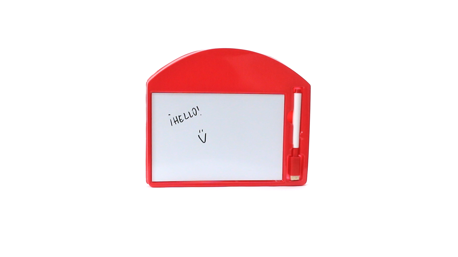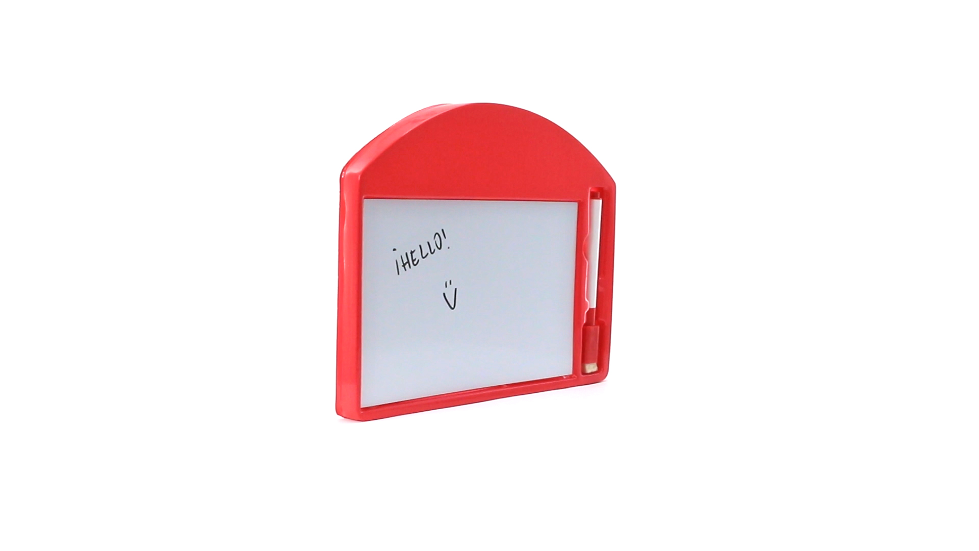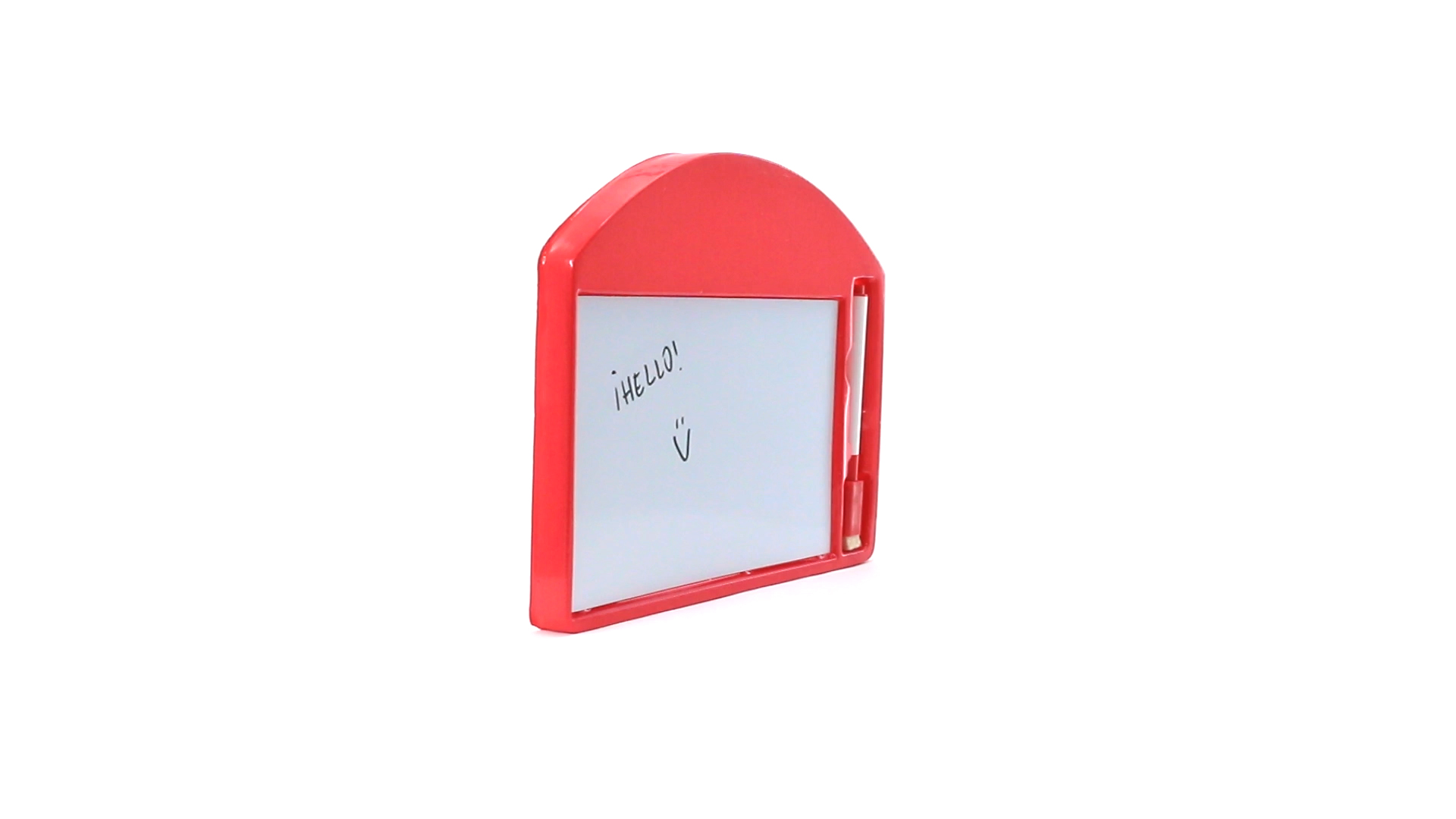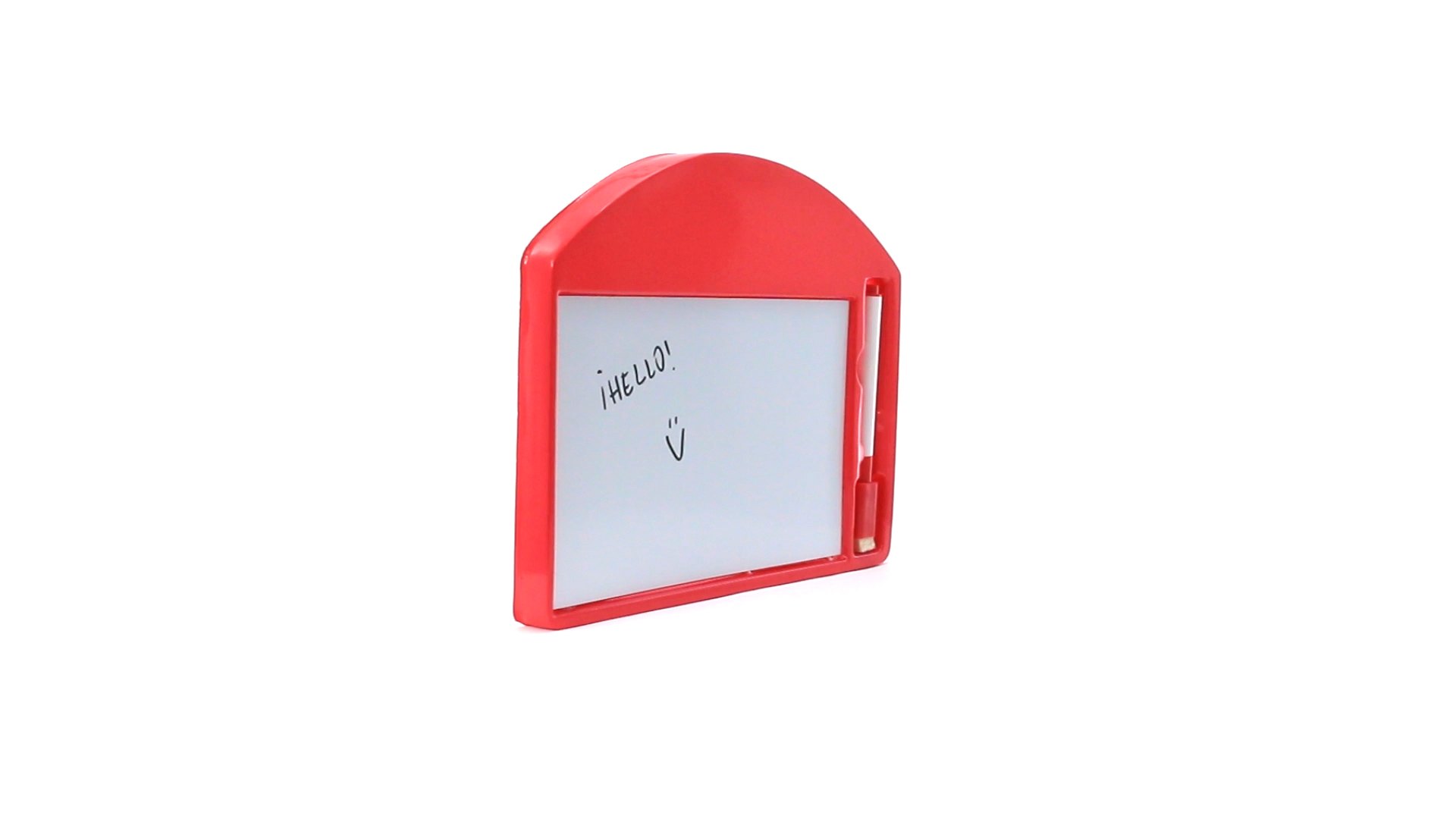 Tafel in einer Vielzahl von kräftigen Farben. Mit Stanzung im Rahmen für die Befestigung des Stifts. Magnetischer Stift und Radiergummi inklusive.