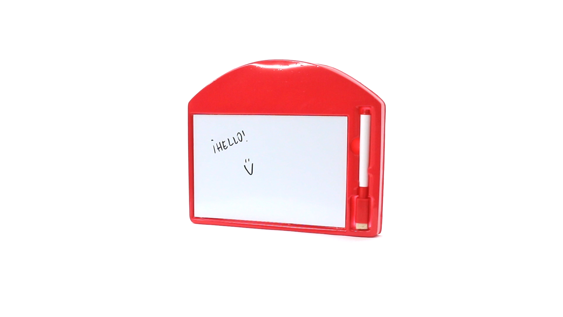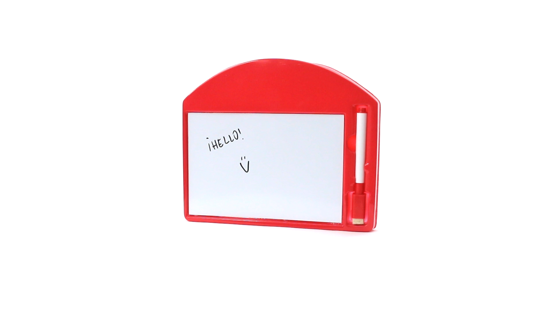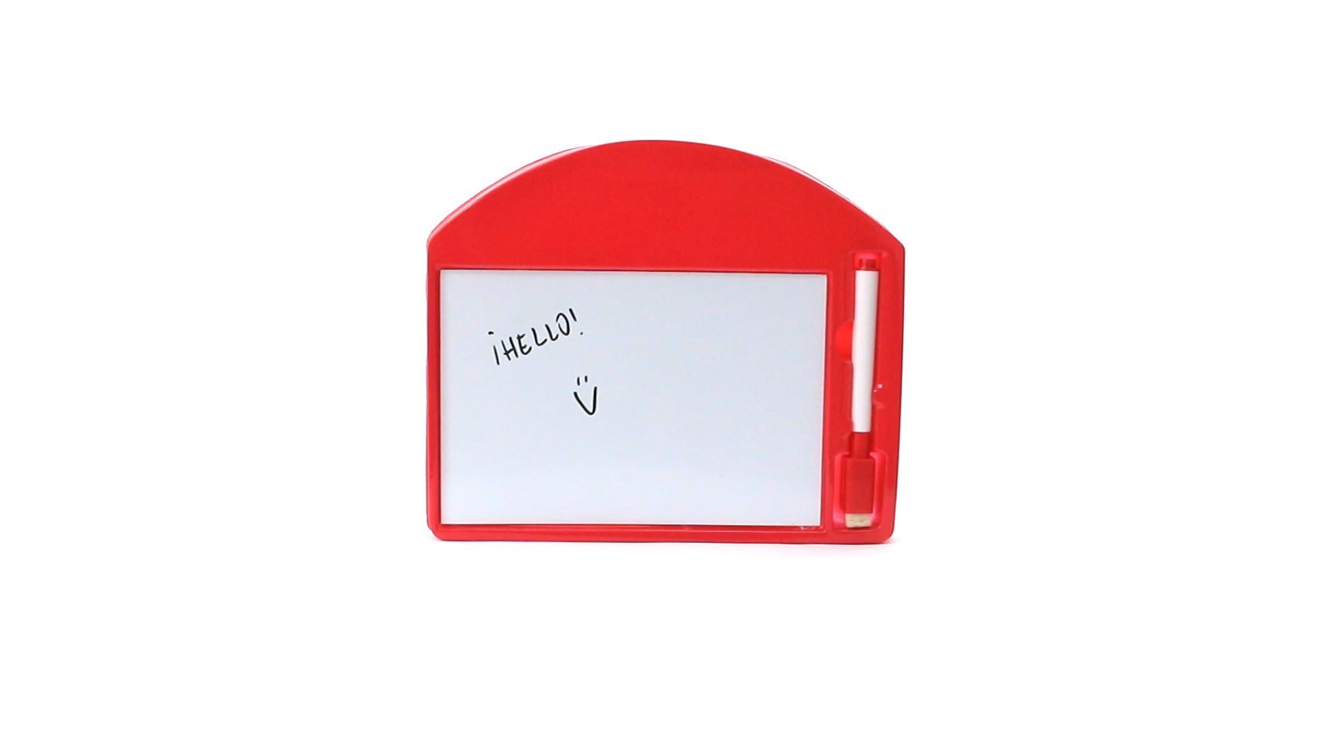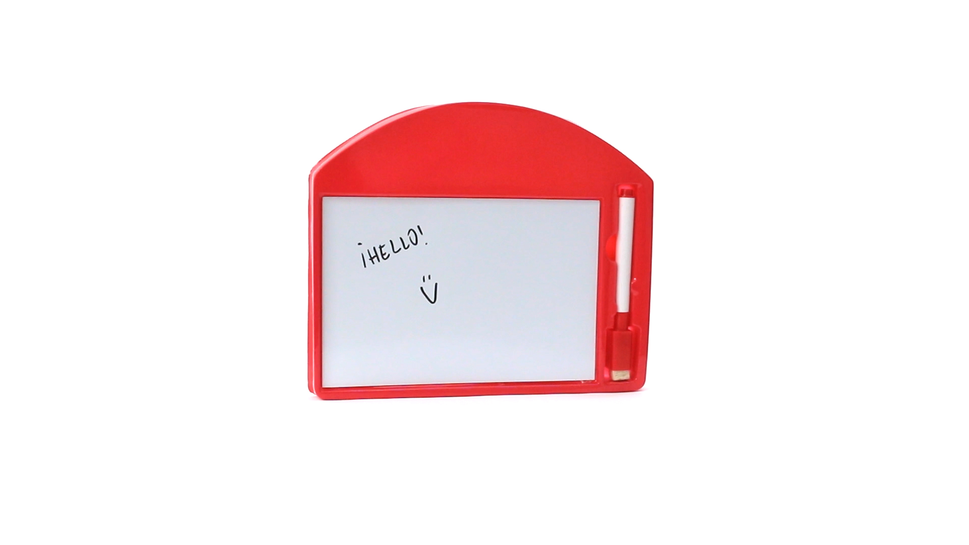 Tafel in einer Vielzahl von kräftigen Farben. Mit Stanzung im Rahmen für die Befestigung des Stifts. Magnetischer Stift und Radiergummi inklusive.
