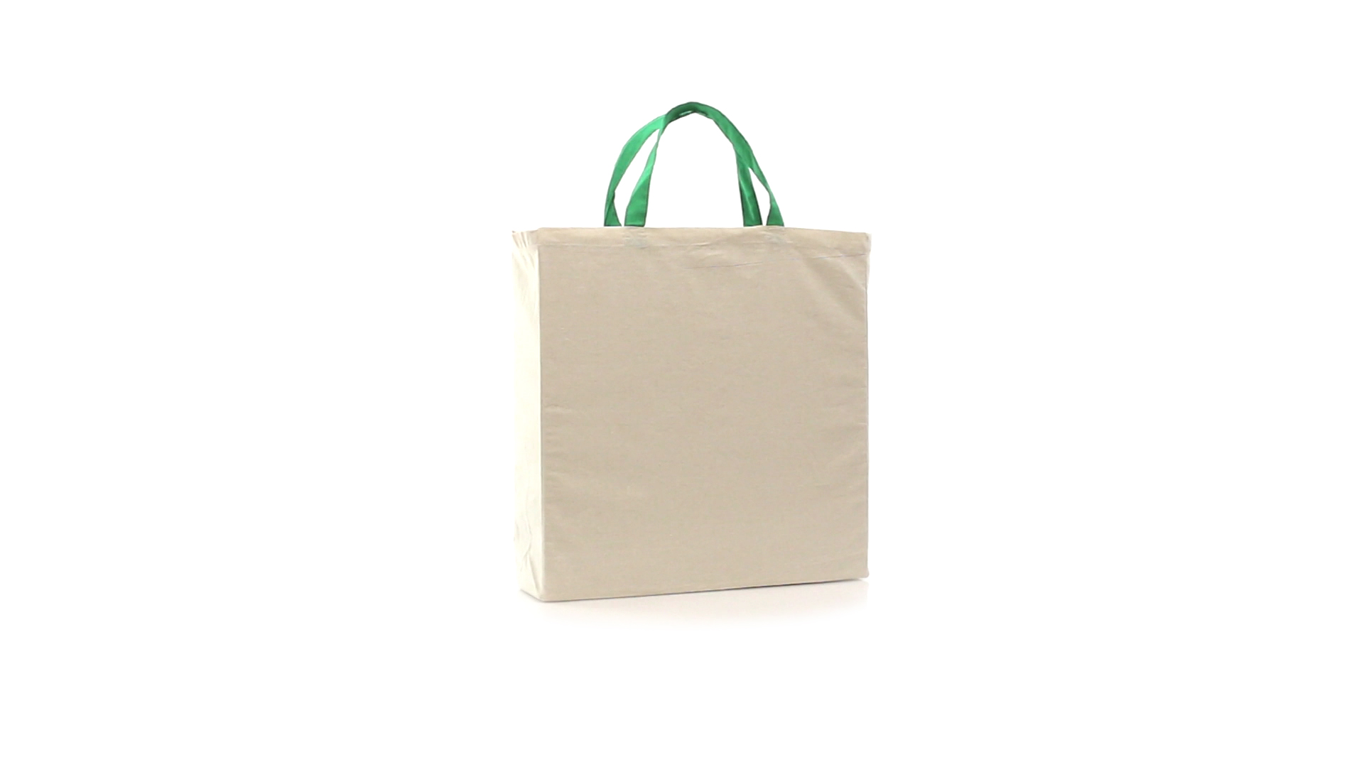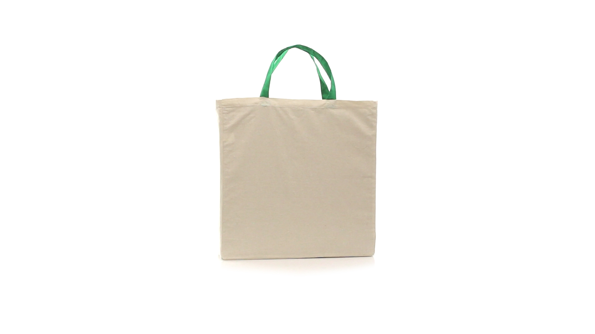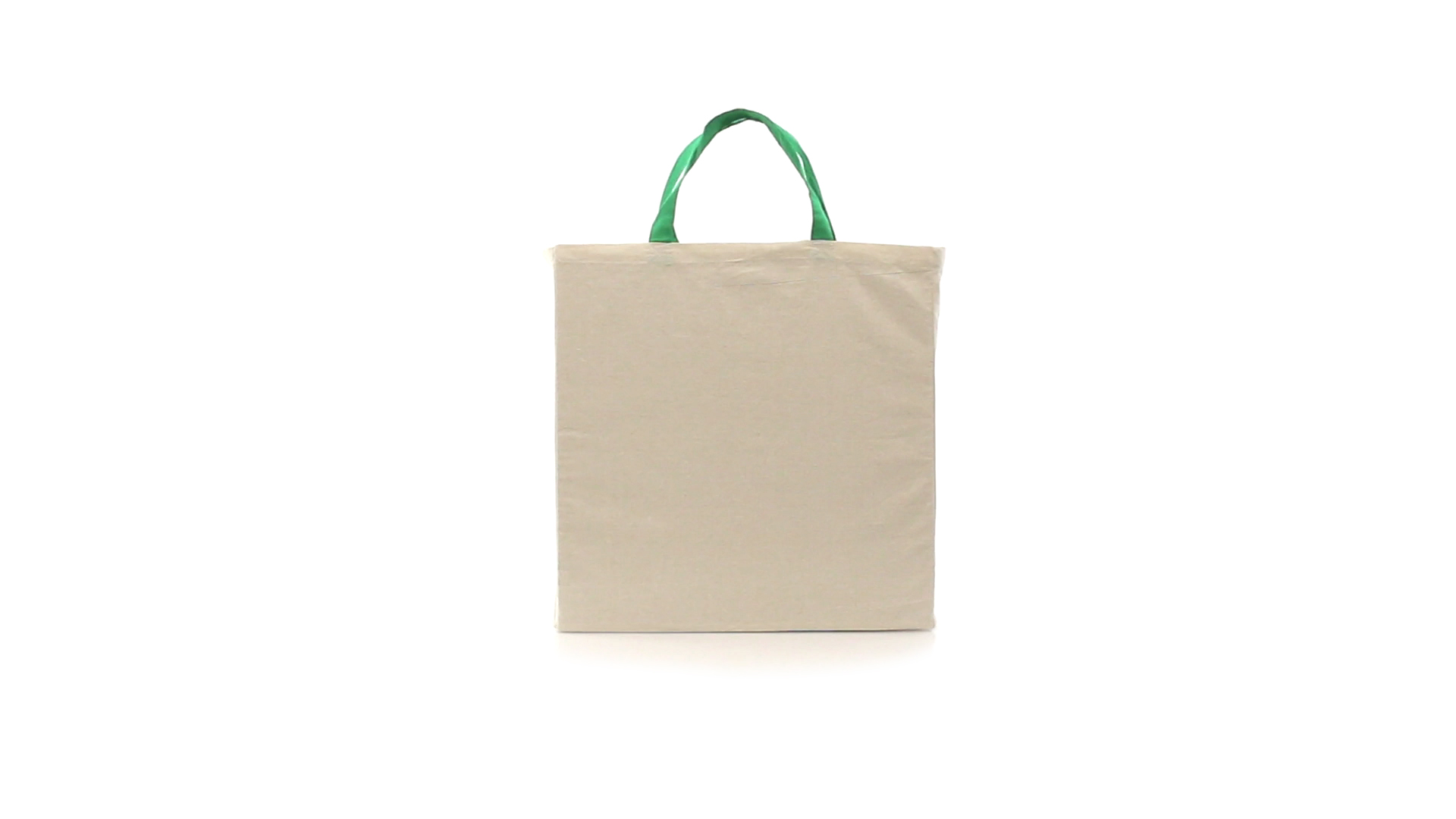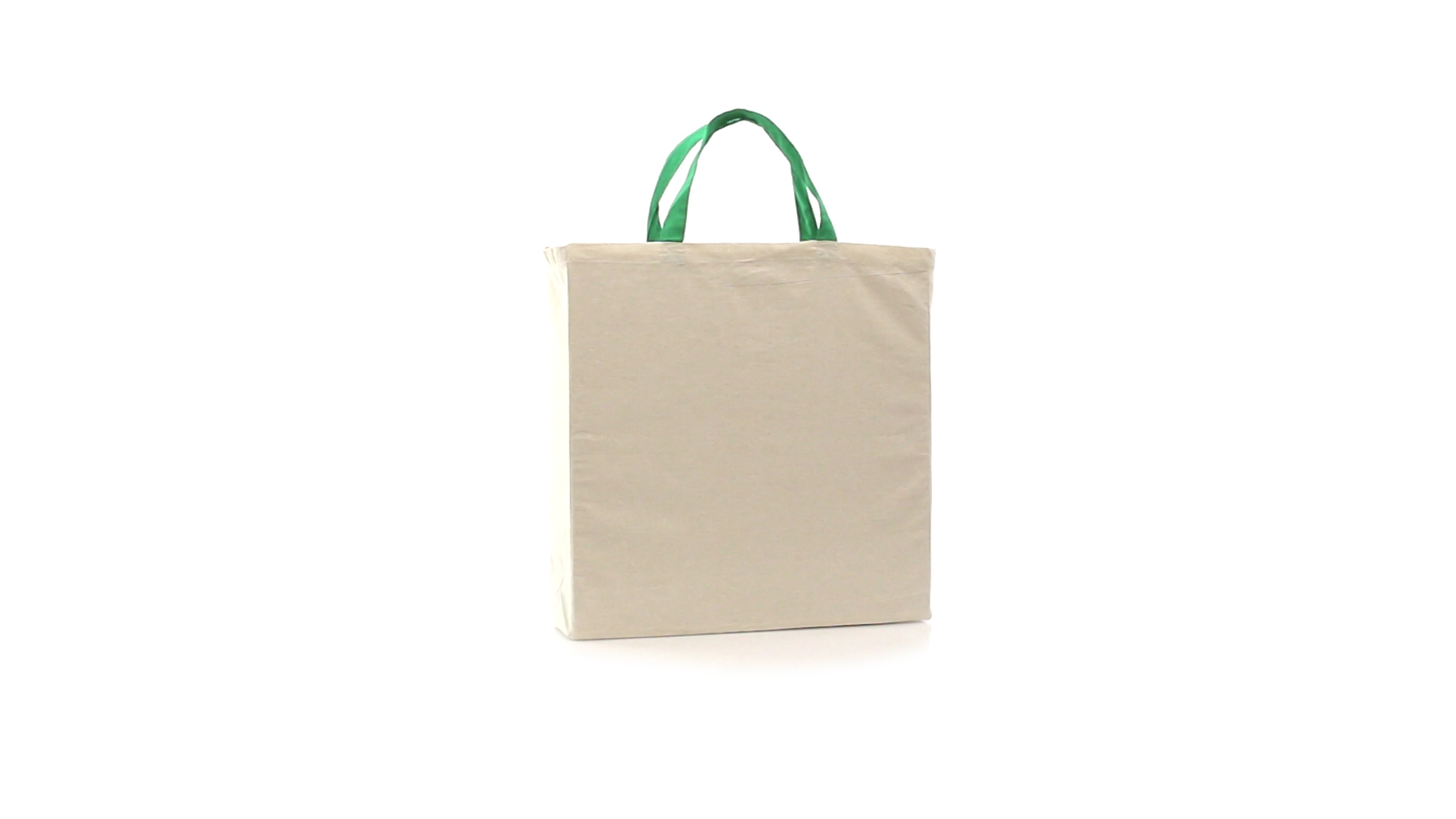 Tasche aus 100 % Baumwolle in Naturfarbe. Mit 35 cm langen, verstärkten Griffen in Grün, Zwickel und Steppnähten. Belastbar mit bis zu 9 kg.