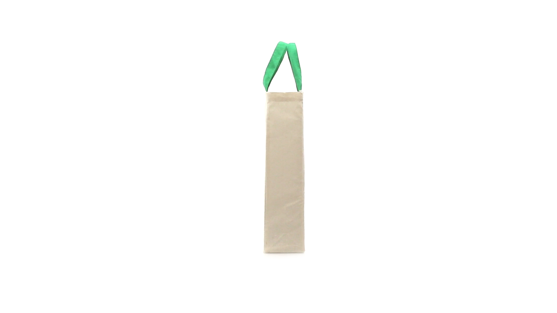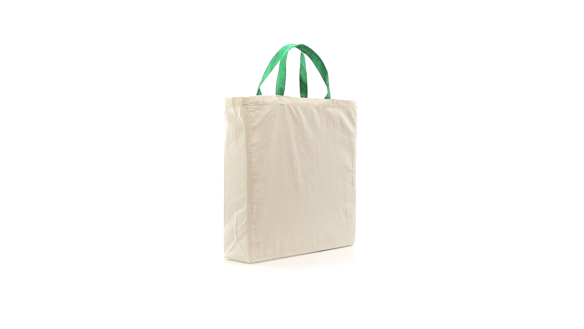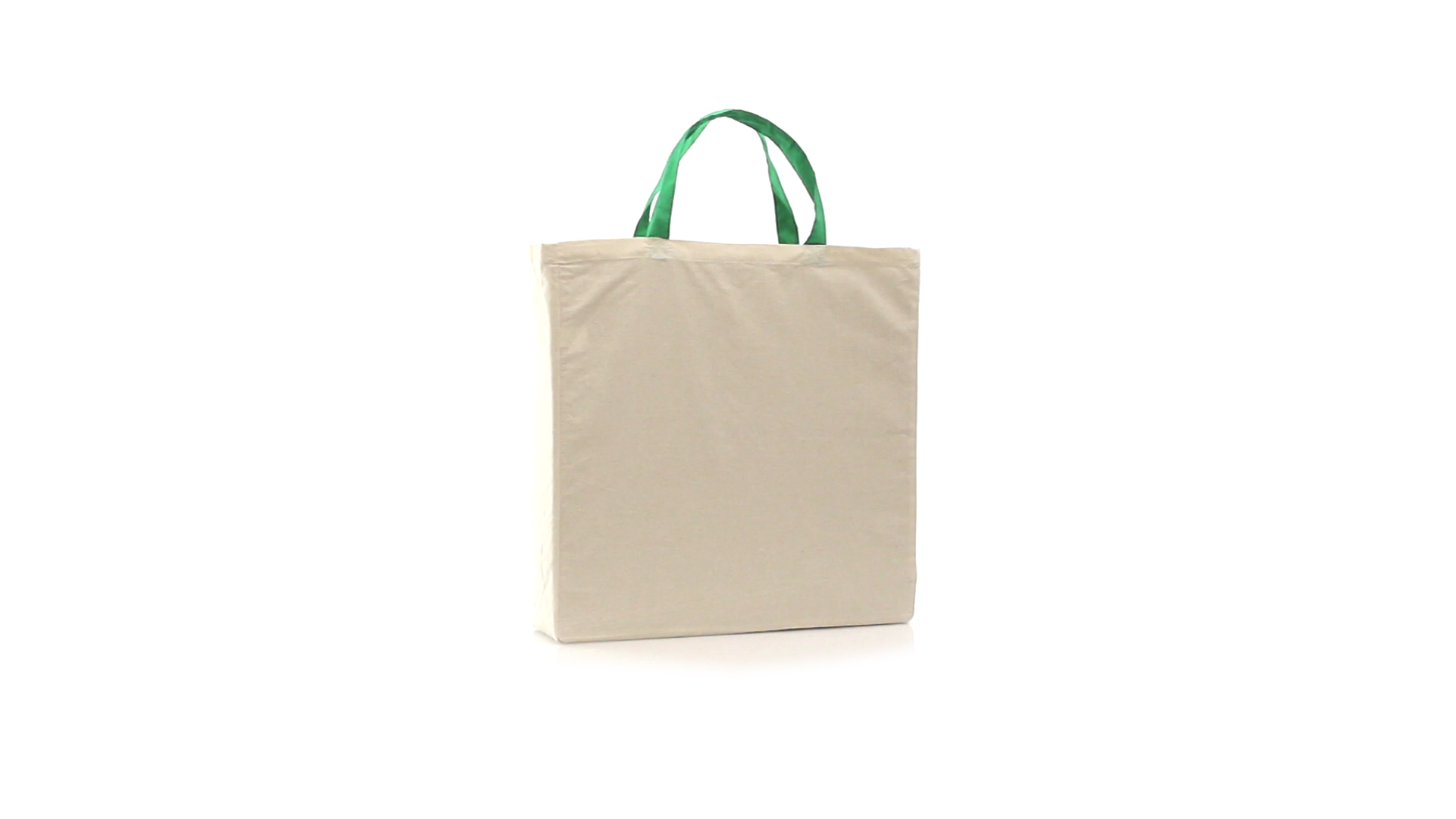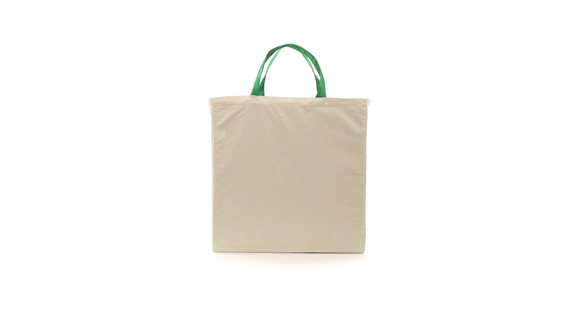 Tasche aus 100 % Baumwolle in Naturfarbe. Mit 35 cm langen, verstärkten Griffen in Grün, Zwickel und Steppnähten. Belastbar mit bis zu 9 kg.