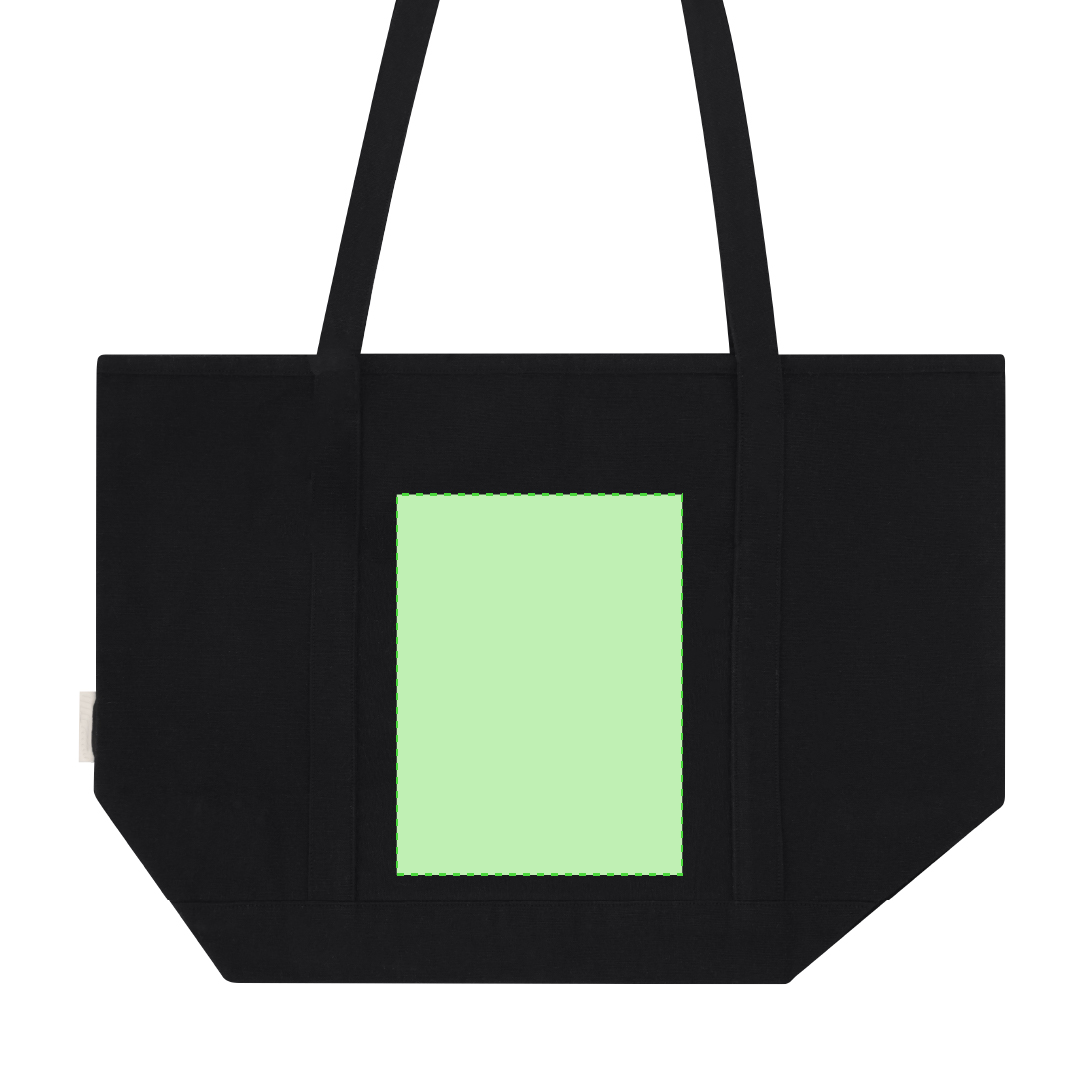 Tasche hauptsächlich aus widerstandsfähiger 300 g/m2 recycelter Baumwolle. Genäht mit Lotion und langen 70 cm verstärkten Griffen. Enthält eine leicht zugängliche Aussen Tasche. Logo am seitlichen Etikett und Tragfähigkeit bis zu 10 kg.