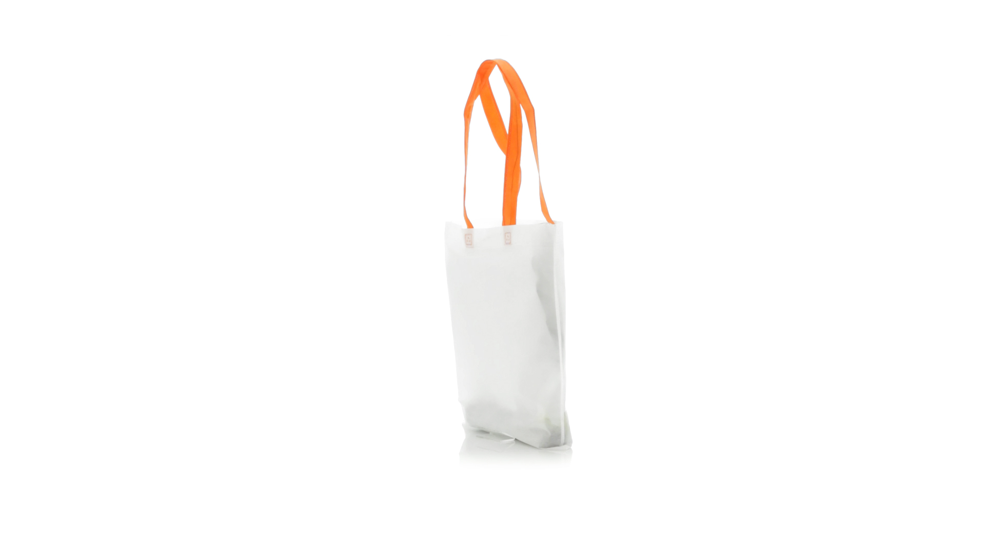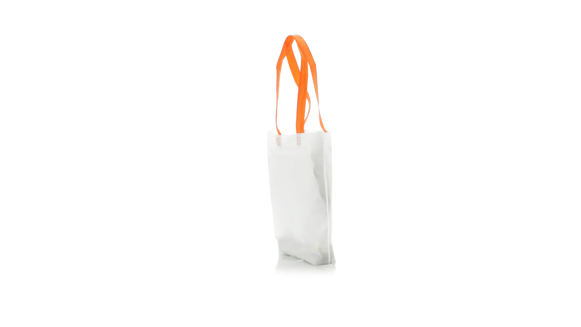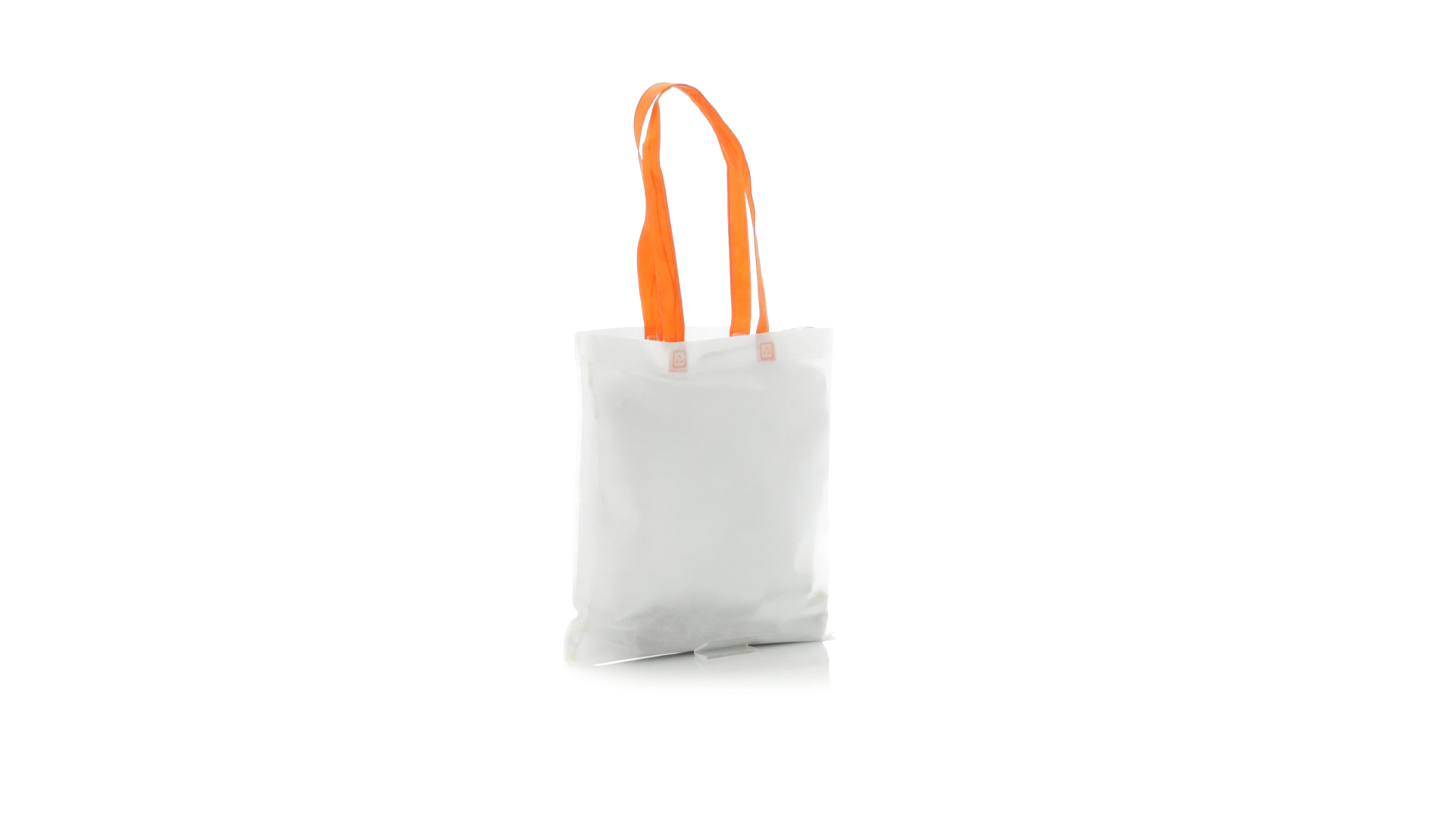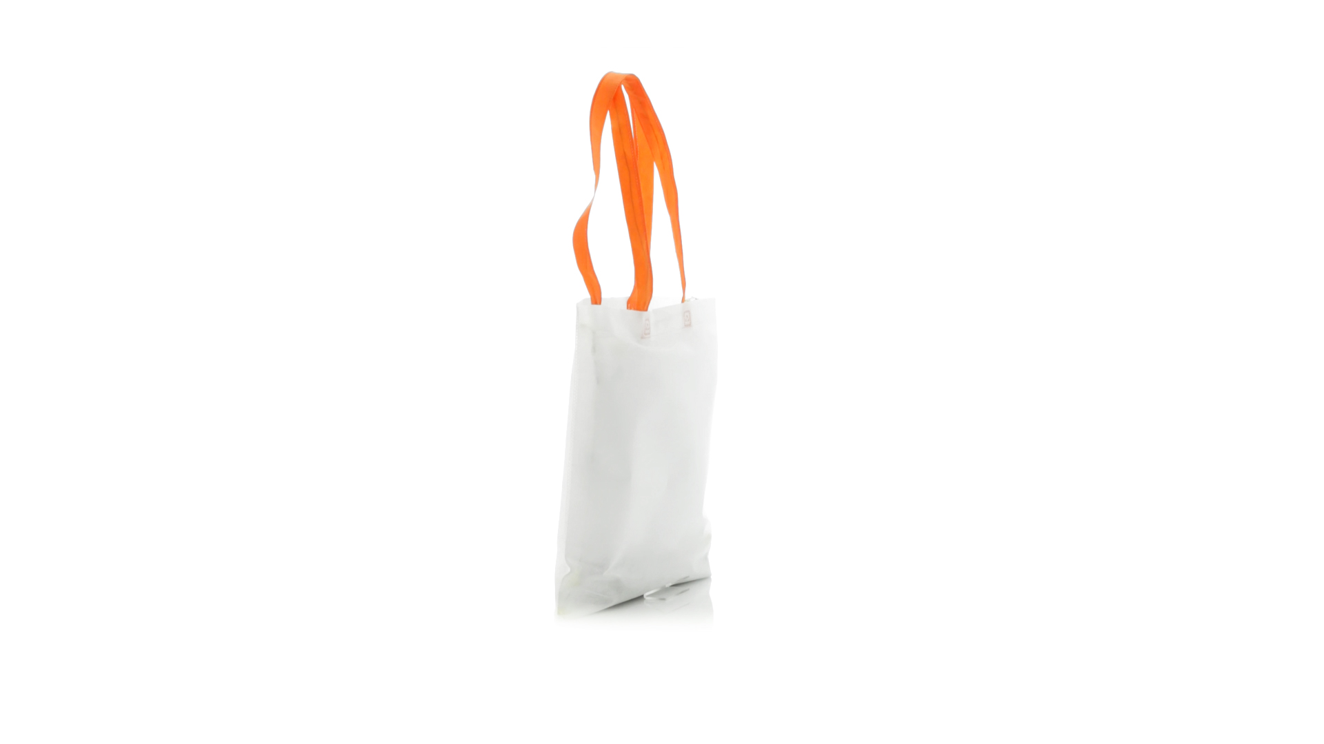 Non-Woven-Tasche aus Faservlies (80 g/m2) in Weiss, mit Henkeln in vielen verschiedenen Farben. Mit hitzeversiegeltem Finish und langen Henkeln mit Recycling-Logo. Belastbar mit bis zu 8 kg.