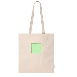 Tasche hauptsächlich aus 240 g/m2 recycelter Baumwolle. Lange verstärkte Tragriemen mit 70cm, genähter Ausführung. Logo auf seitlichem Etikett und Tragkraft bis zu 7 kg.