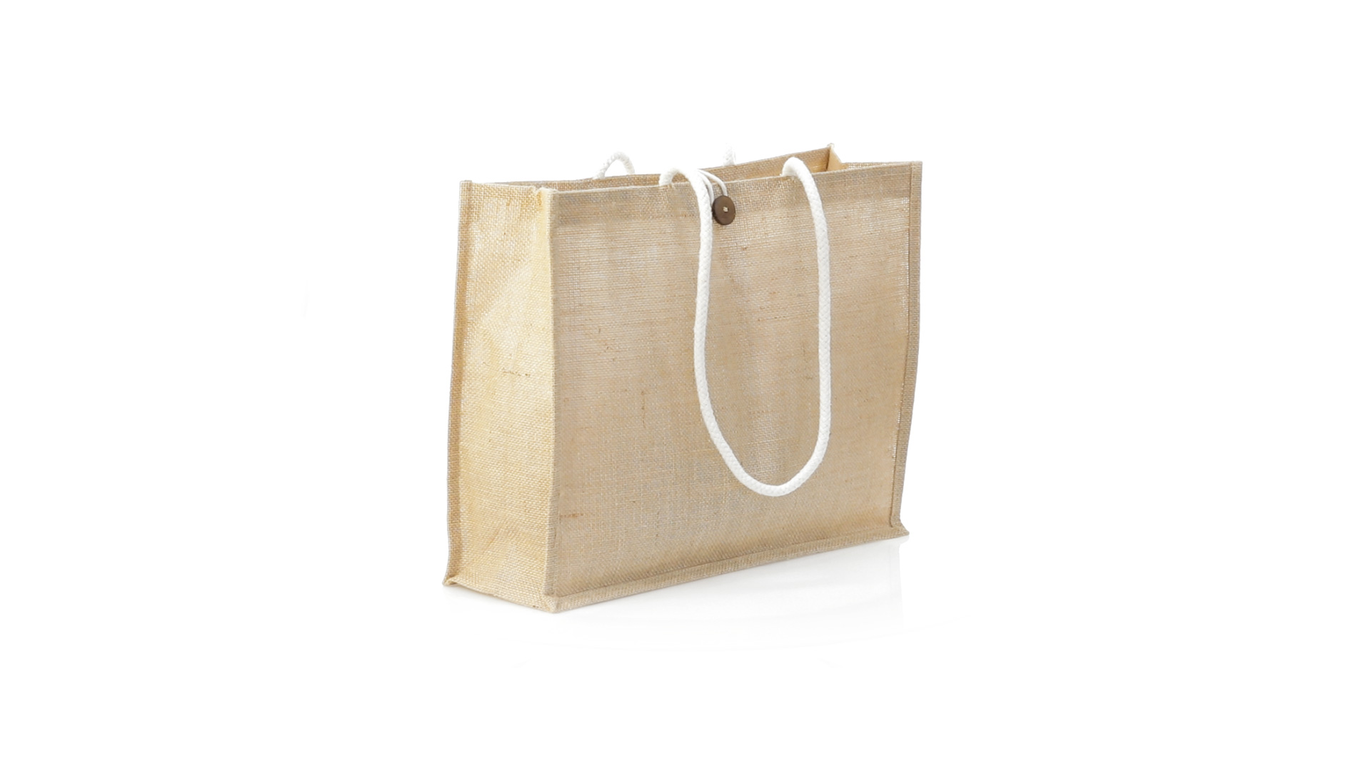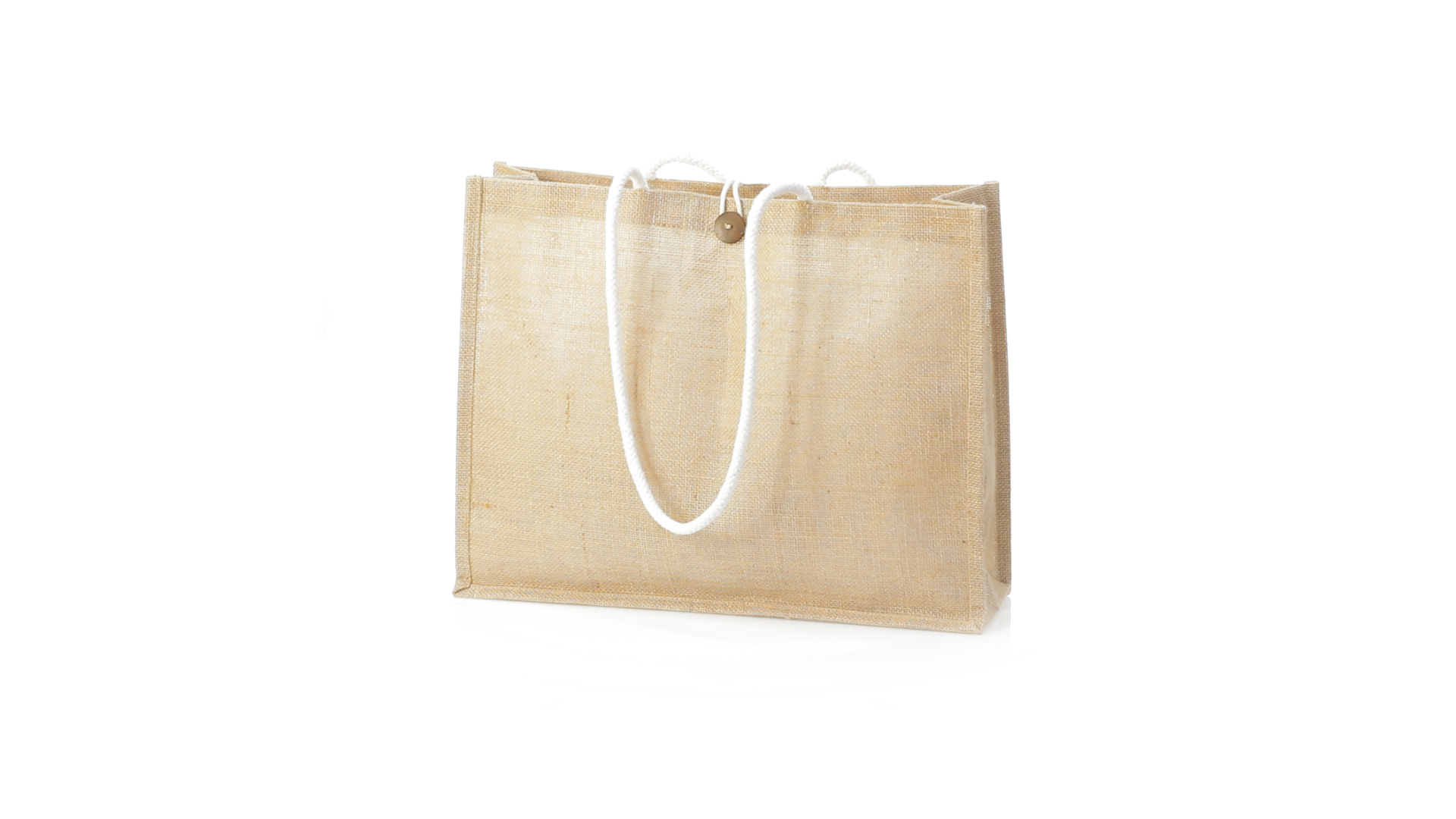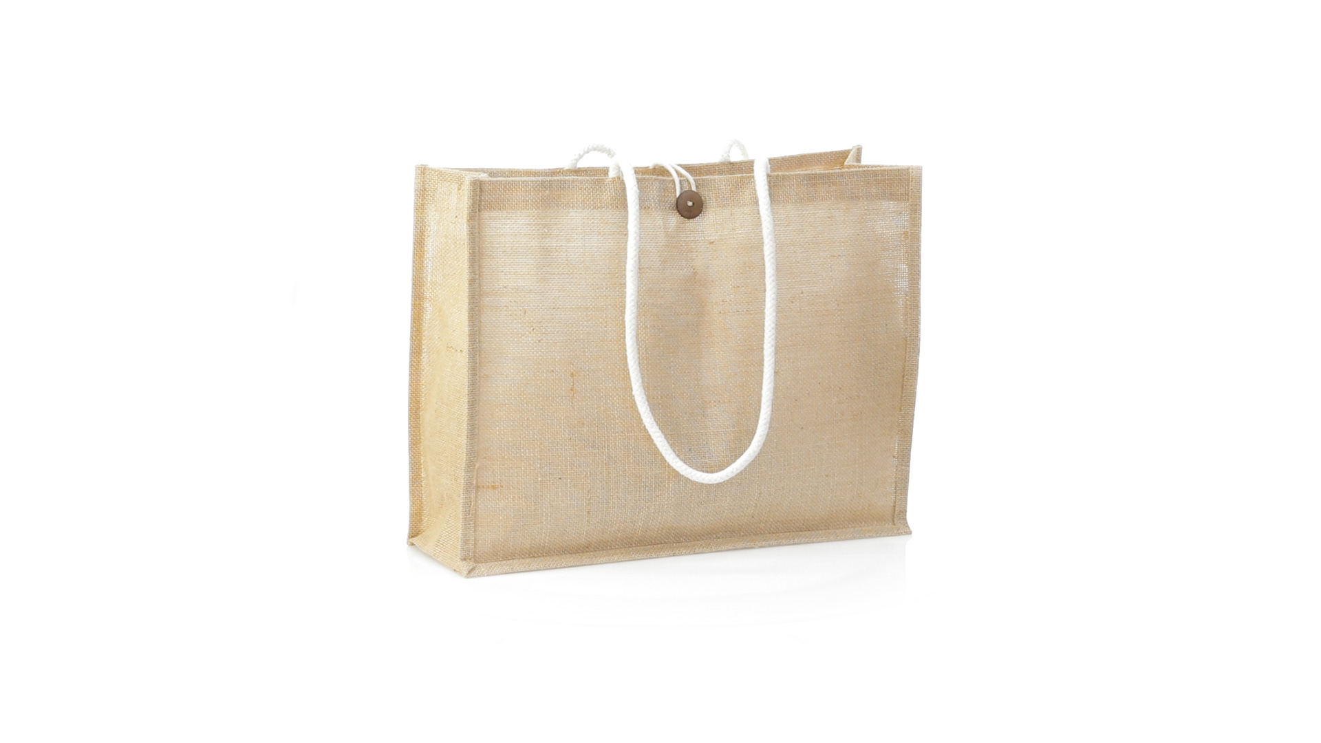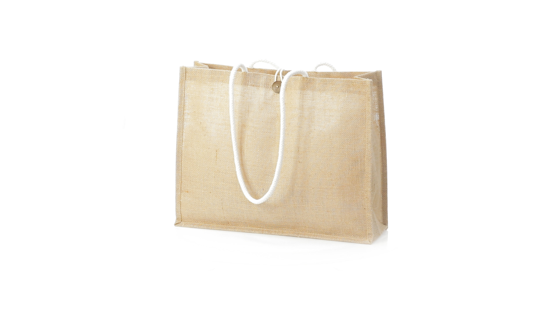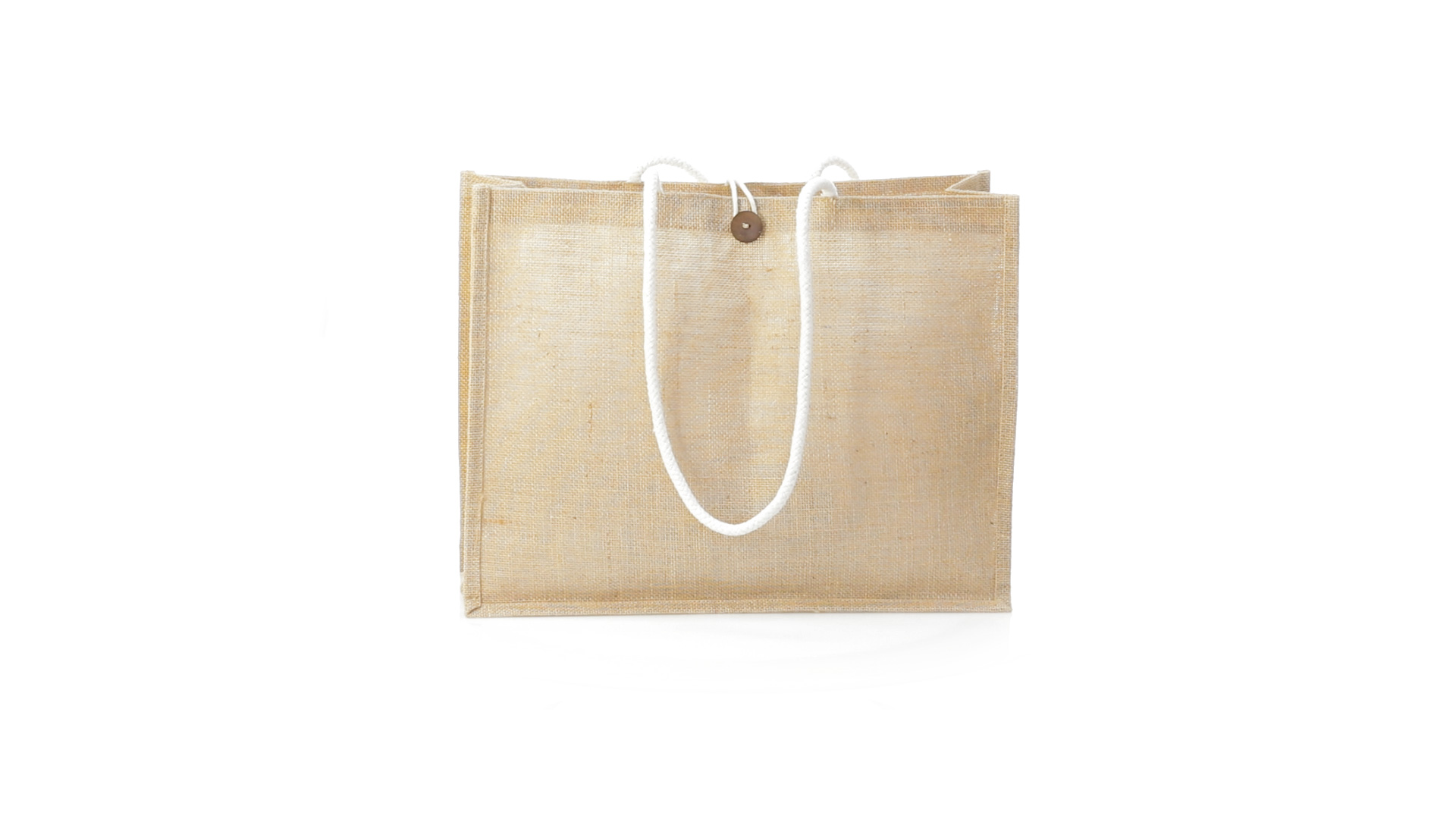 Nature Line Beutel aus widerstandsfähiger laminierter Jute (320g/m2) und originellem Knopfverschluss. Mit 70 cm langen Baumwollgriffen in Naturfarbe und verstärkt. Genähtes Finish und Widerstand bis zu 10 kg Gewicht.