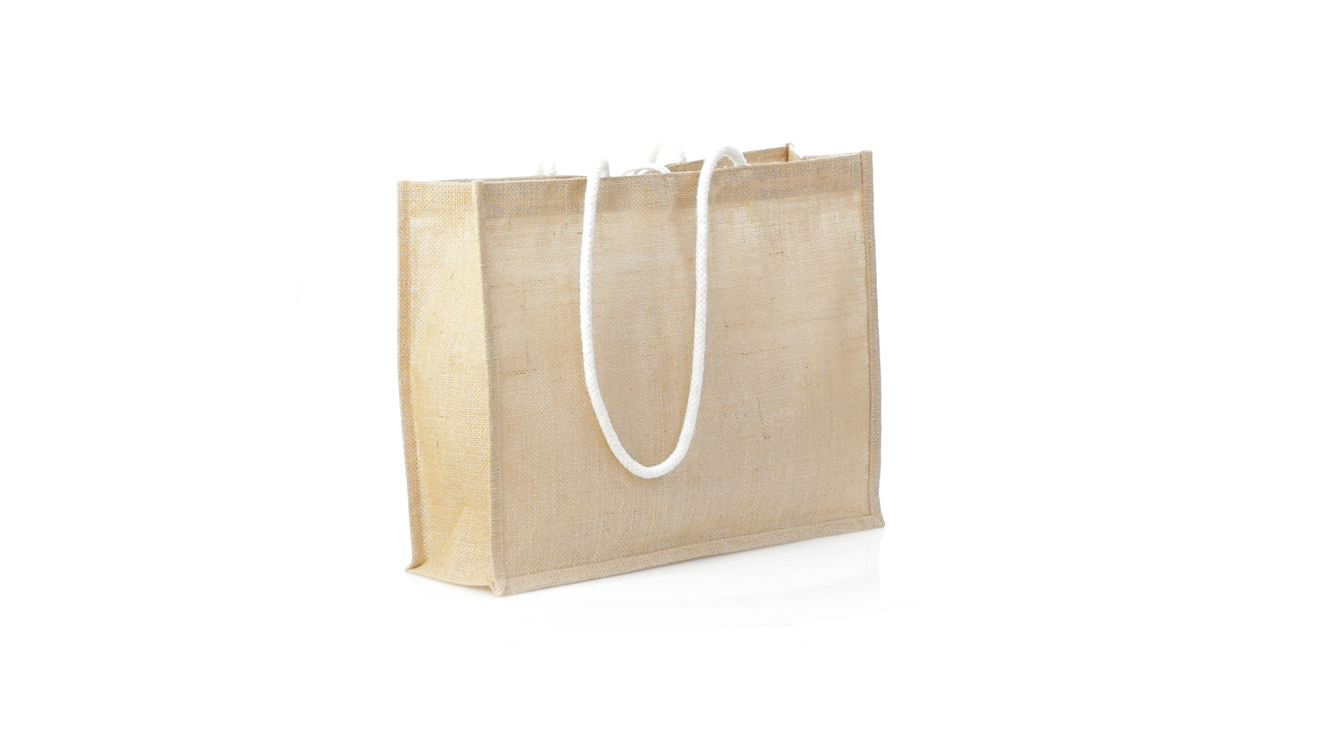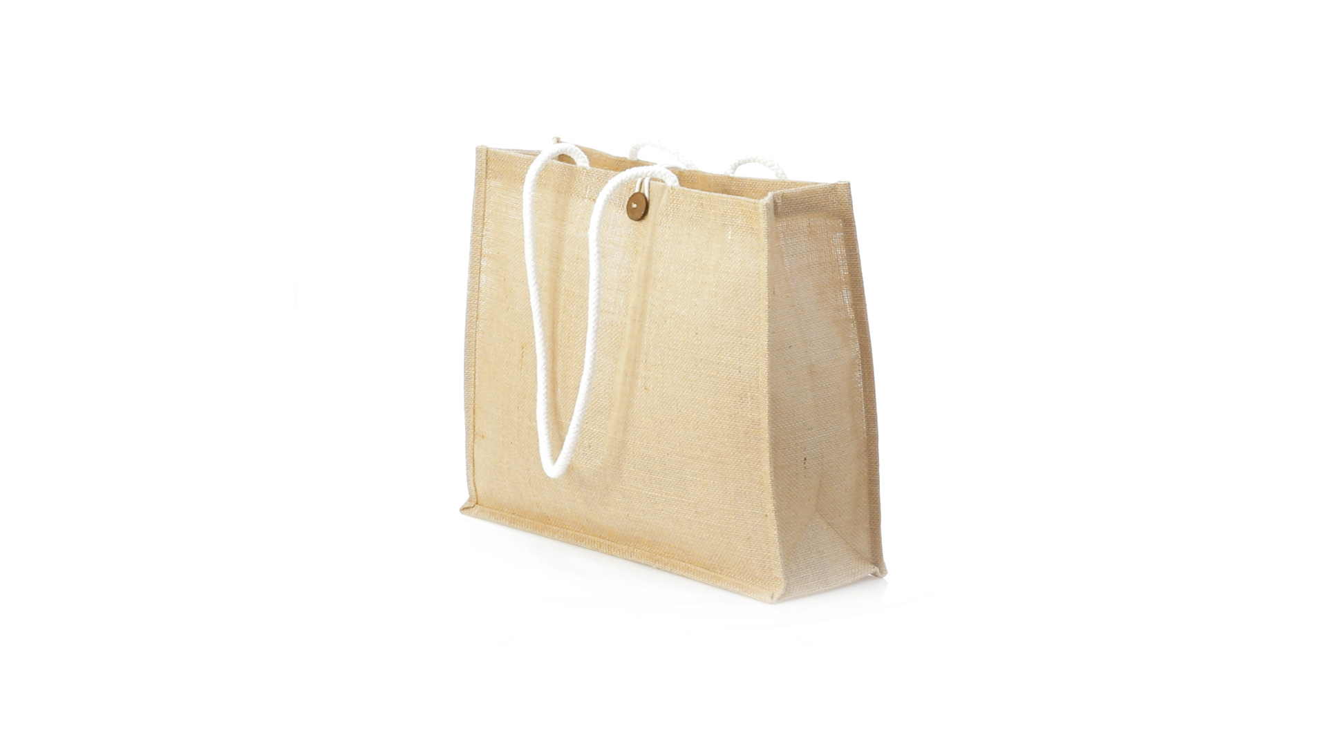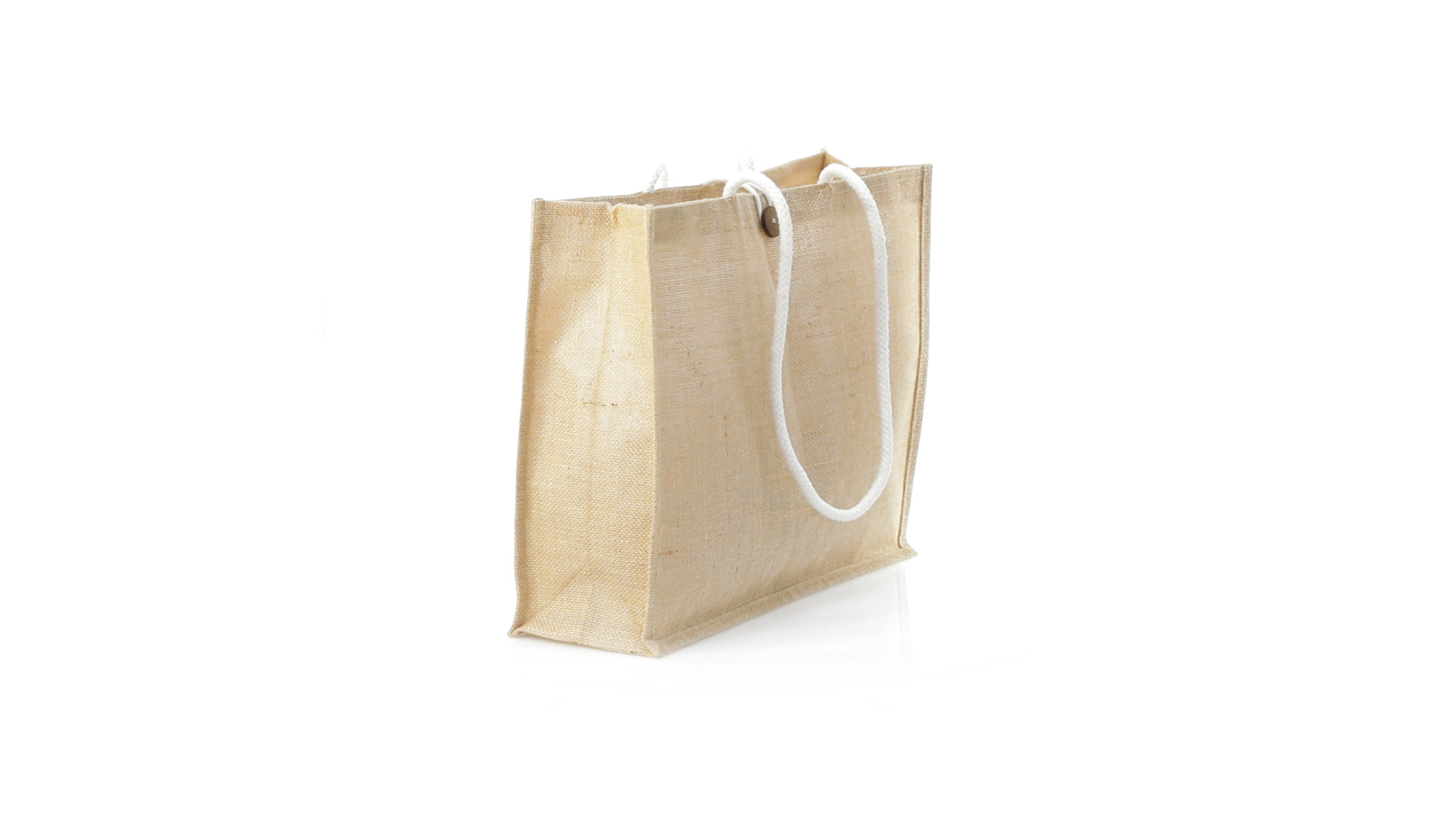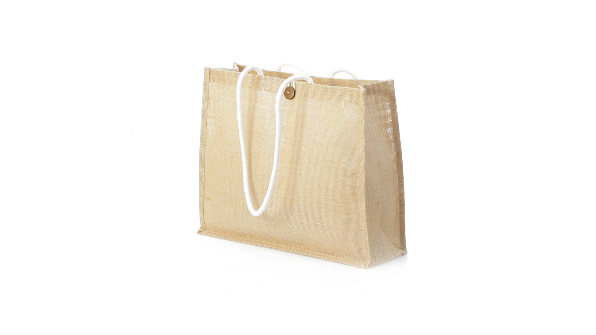 Nature Line Beutel aus widerstandsfähiger laminierter Jute (320g/m2) und originellem Knopfverschluss. Mit 70 cm langen Baumwollgriffen in Naturfarbe und verstärkt. Genähtes Finish und Widerstand bis zu 10 kg Gewicht.