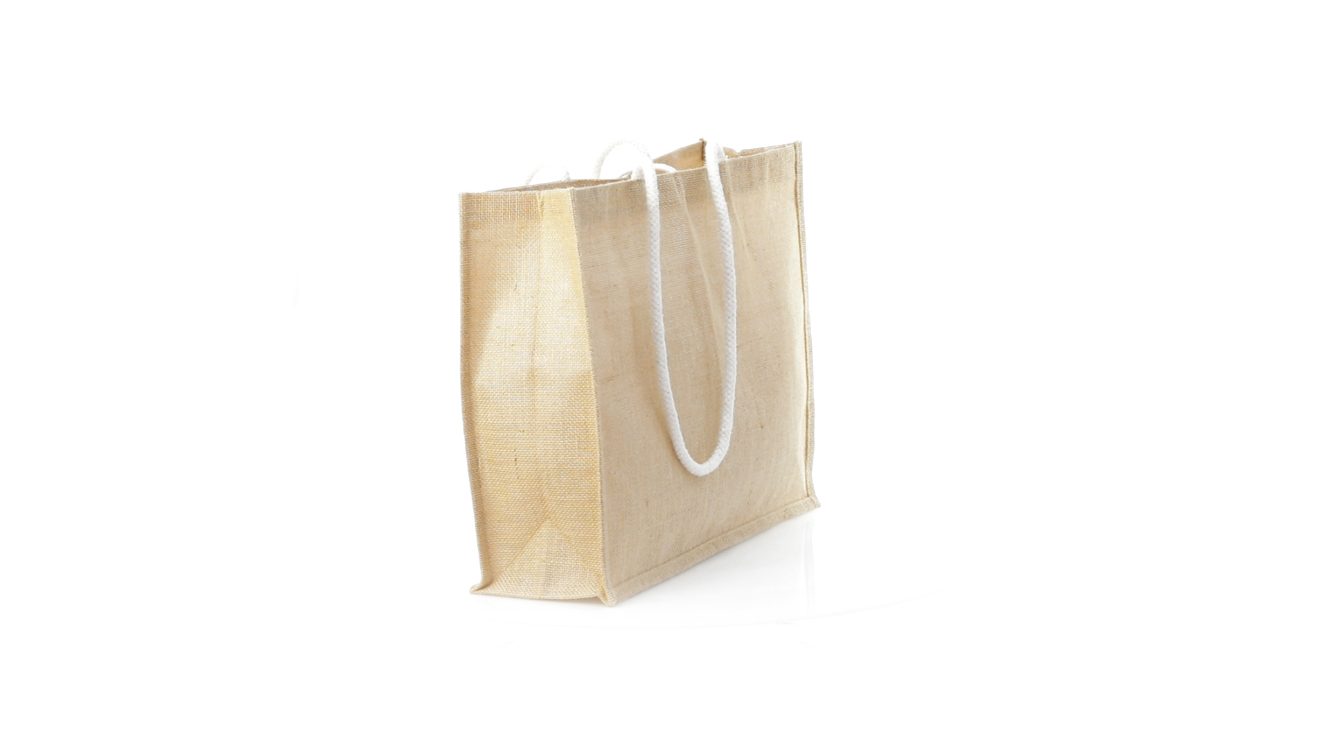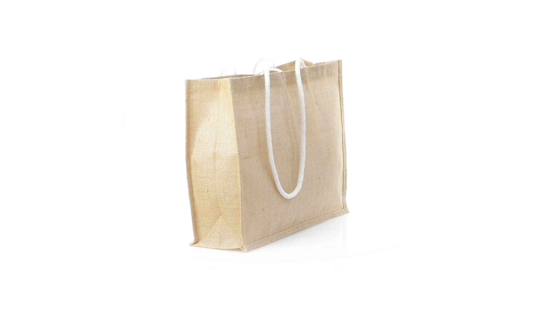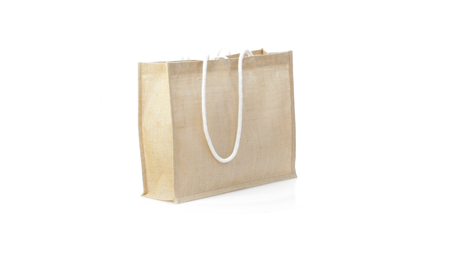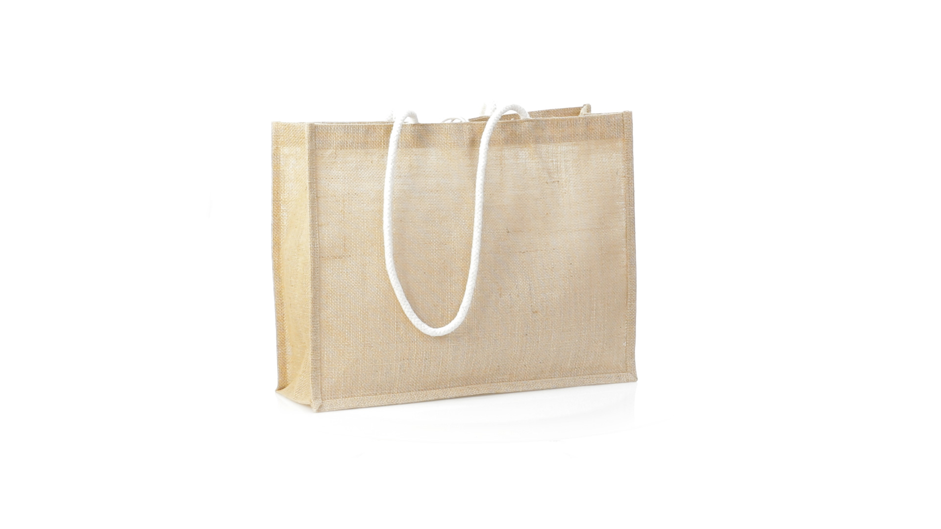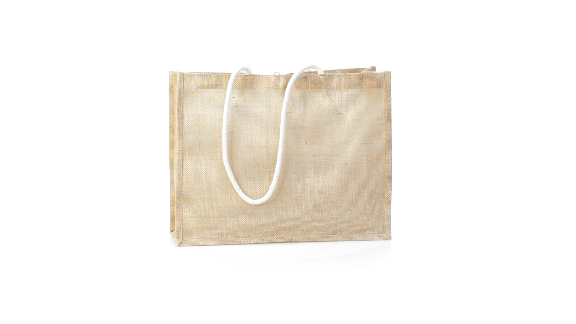 Nature Line Beutel aus widerstandsfähiger laminierter Jute (320g/m2) und originellem Knopfverschluss. Mit 70 cm langen Baumwollgriffen in Naturfarbe und verstärkt. Genähtes Finish und Widerstand bis zu 10 kg Gewicht.