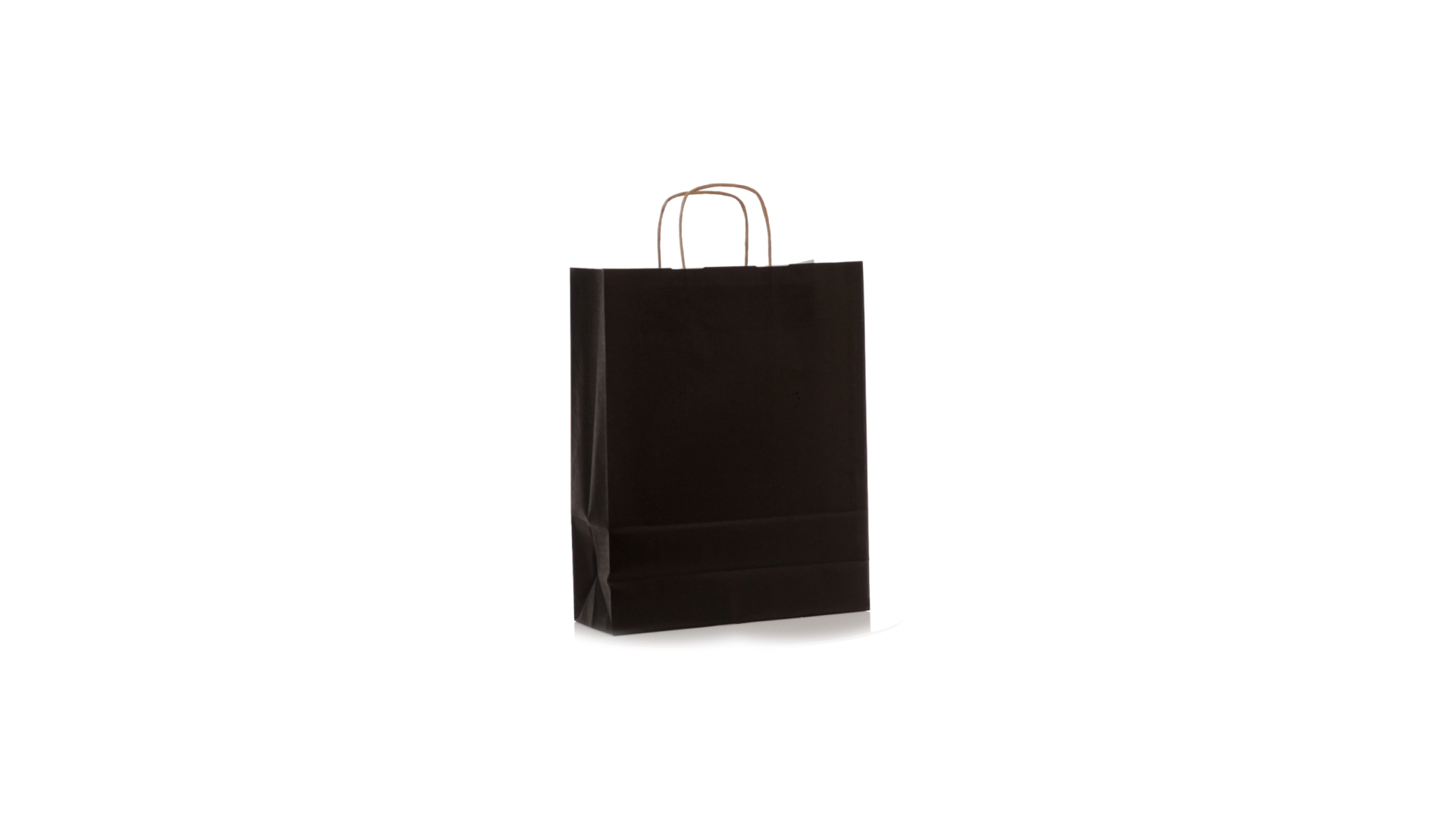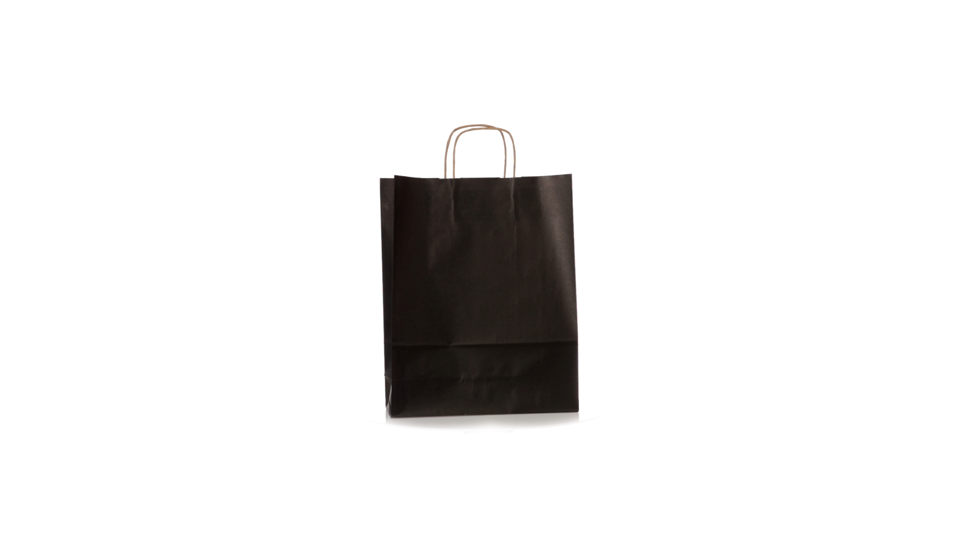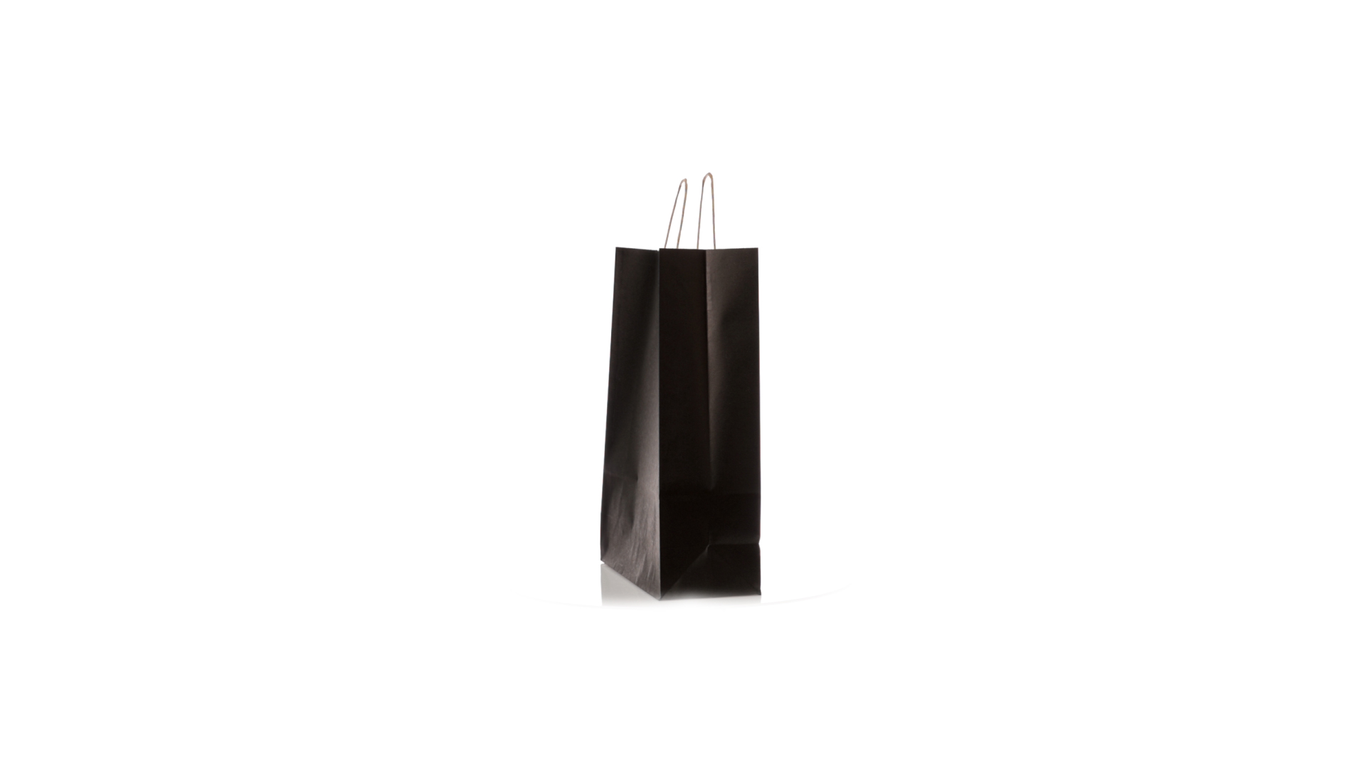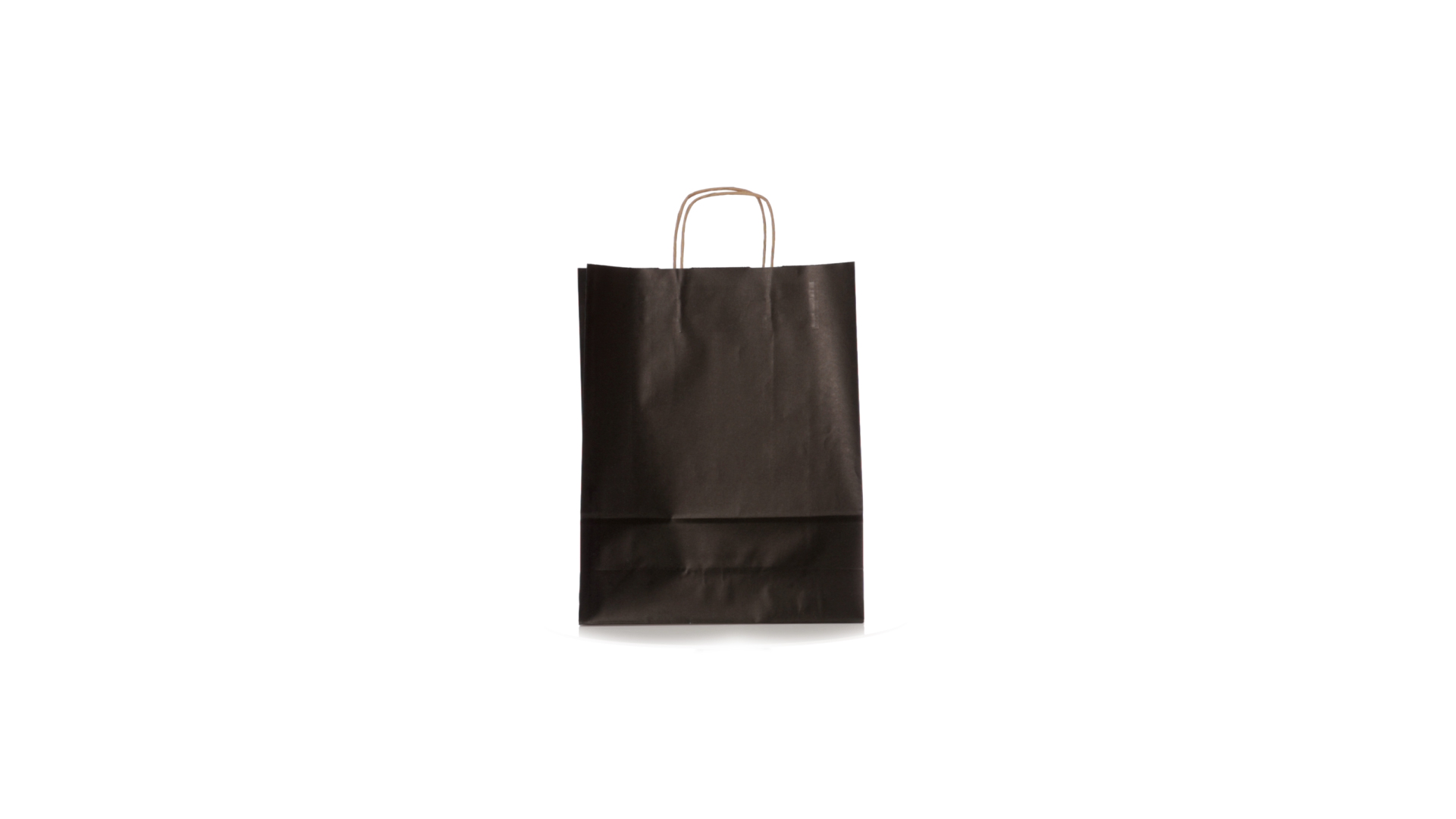 Natur Linie Tasche aus 100g/m2 Recyclingpapier in schwarzer Ausführung, mit kurzen, verstärkten Griffen in Naturfarbe und Zwickel. Belastbar bis zu einem Gewicht von 8 kg.