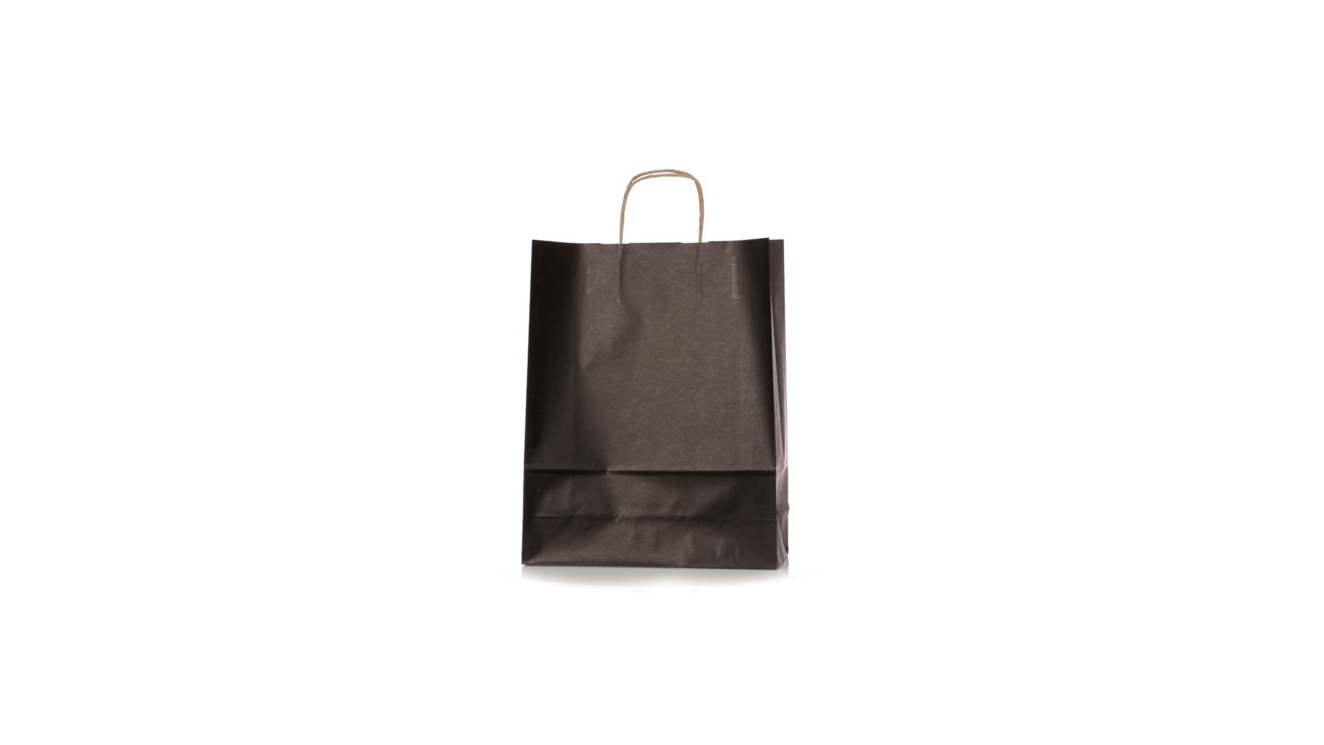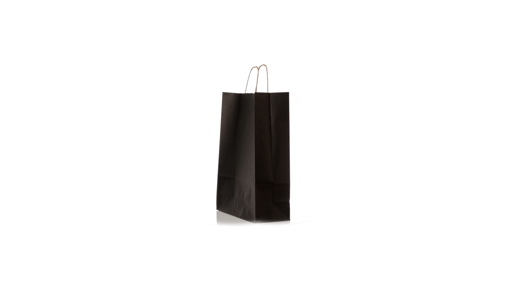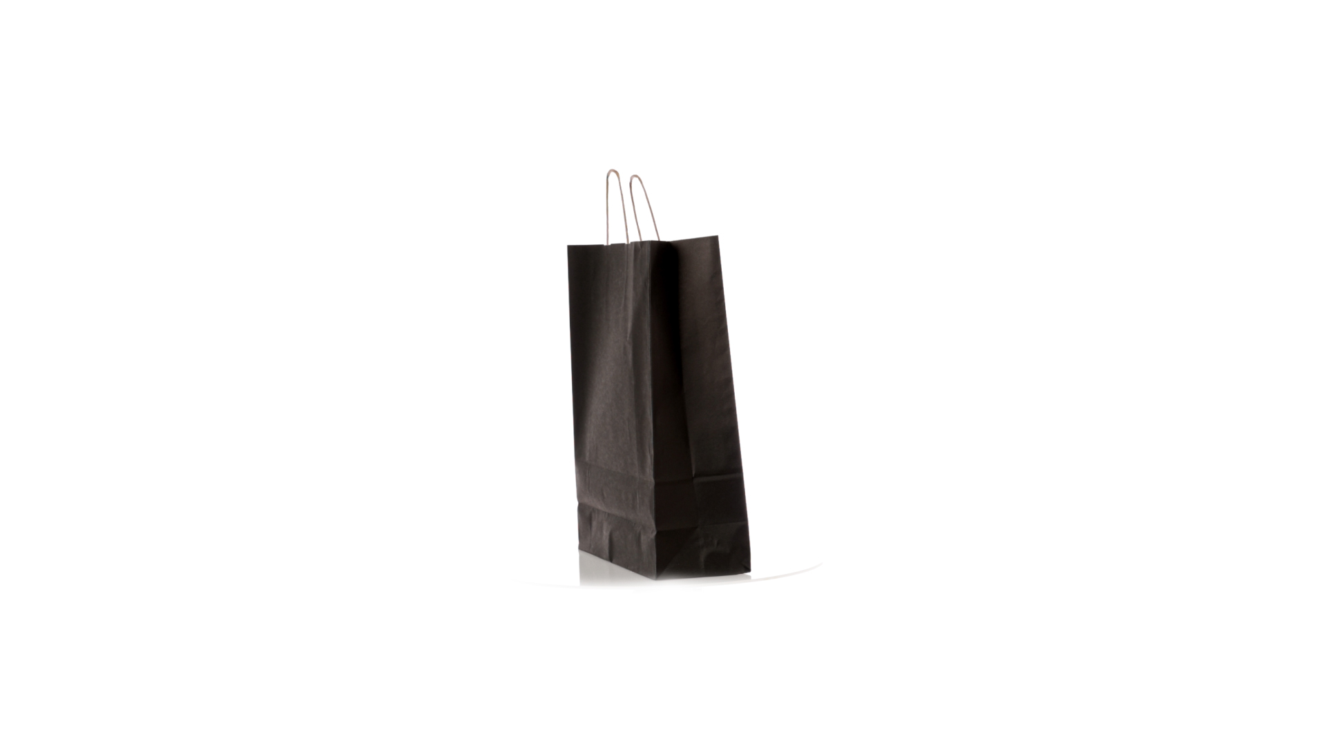 Natur Linie Tasche aus 100g/m2 Recyclingpapier in schwarzer Ausführung, mit kurzen, verstärkten Griffen in Naturfarbe und Zwickel. Belastbar bis zu einem Gewicht von 8 kg.