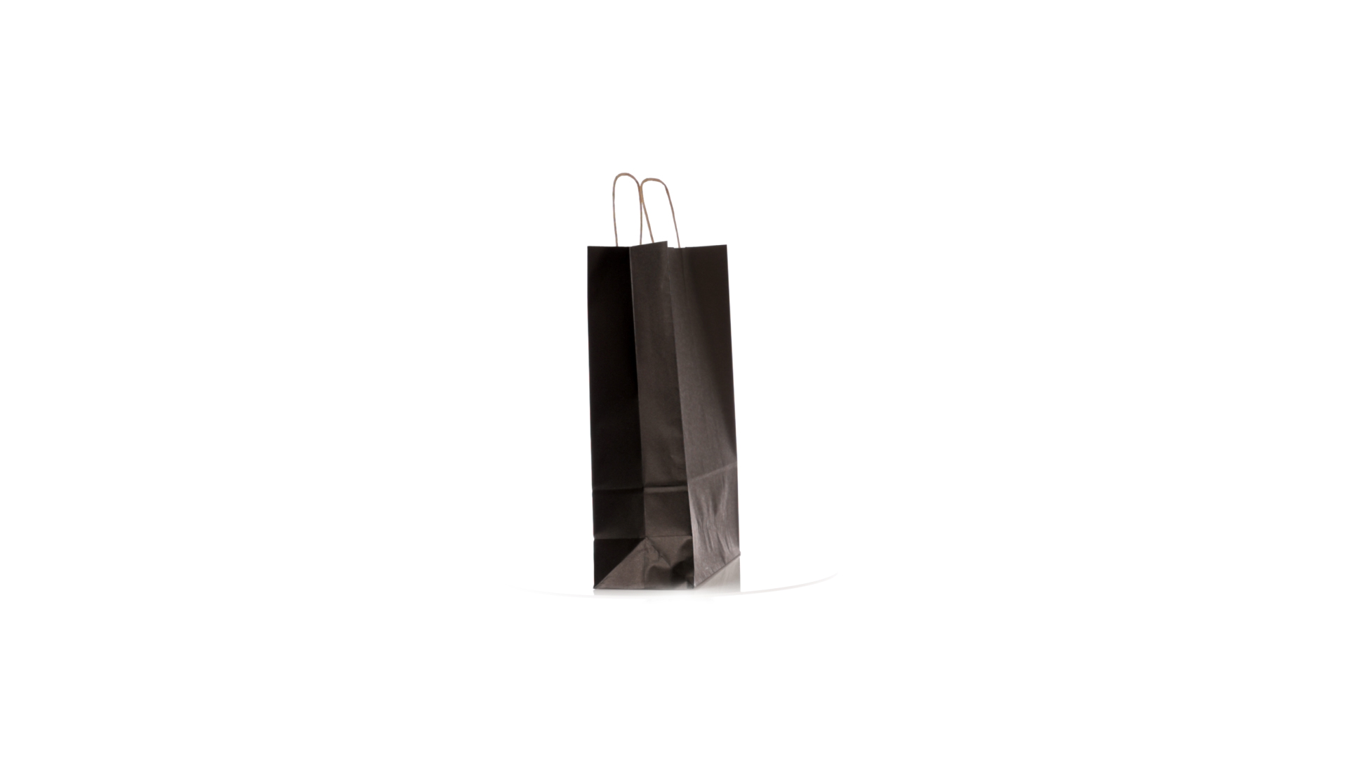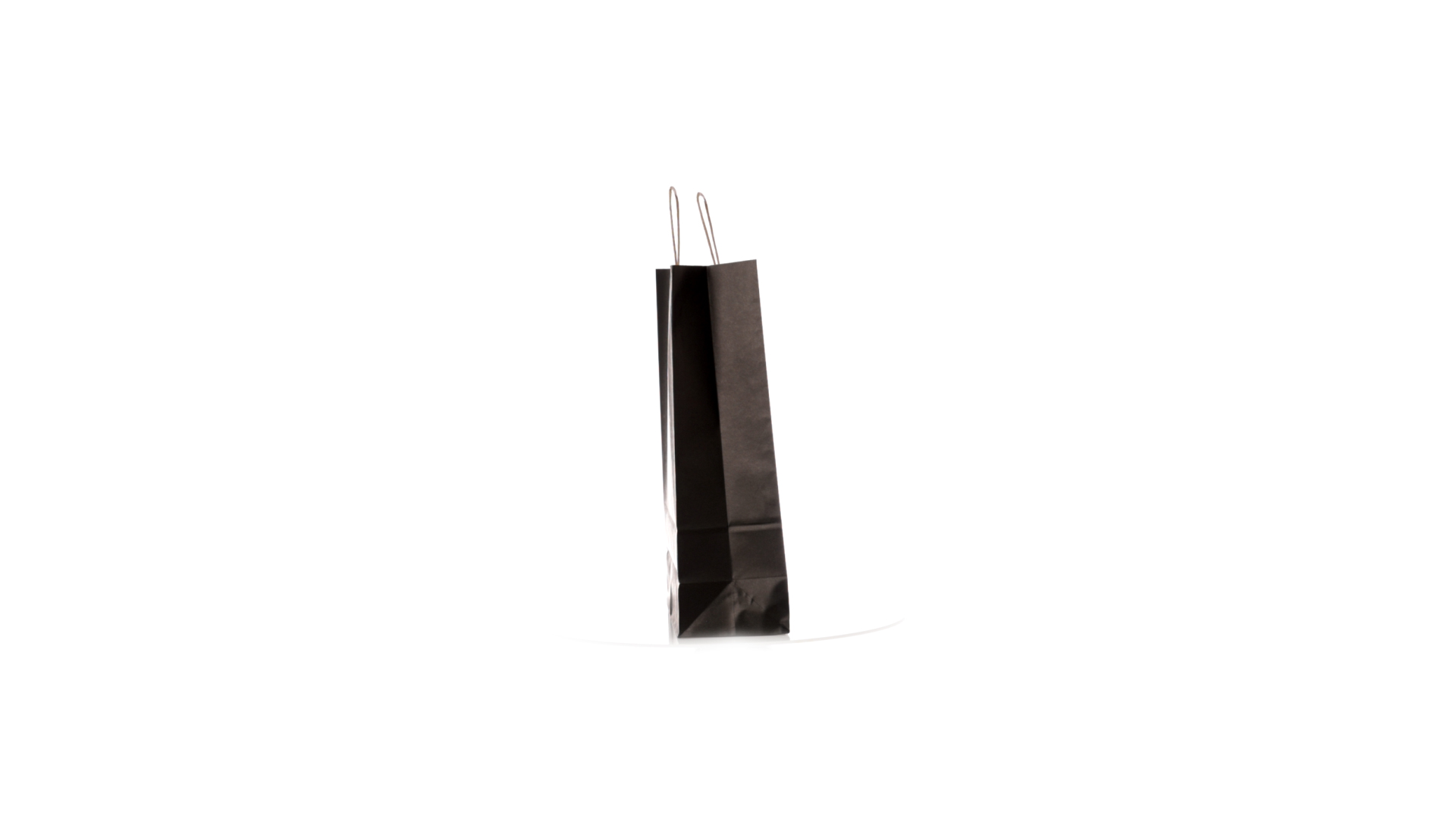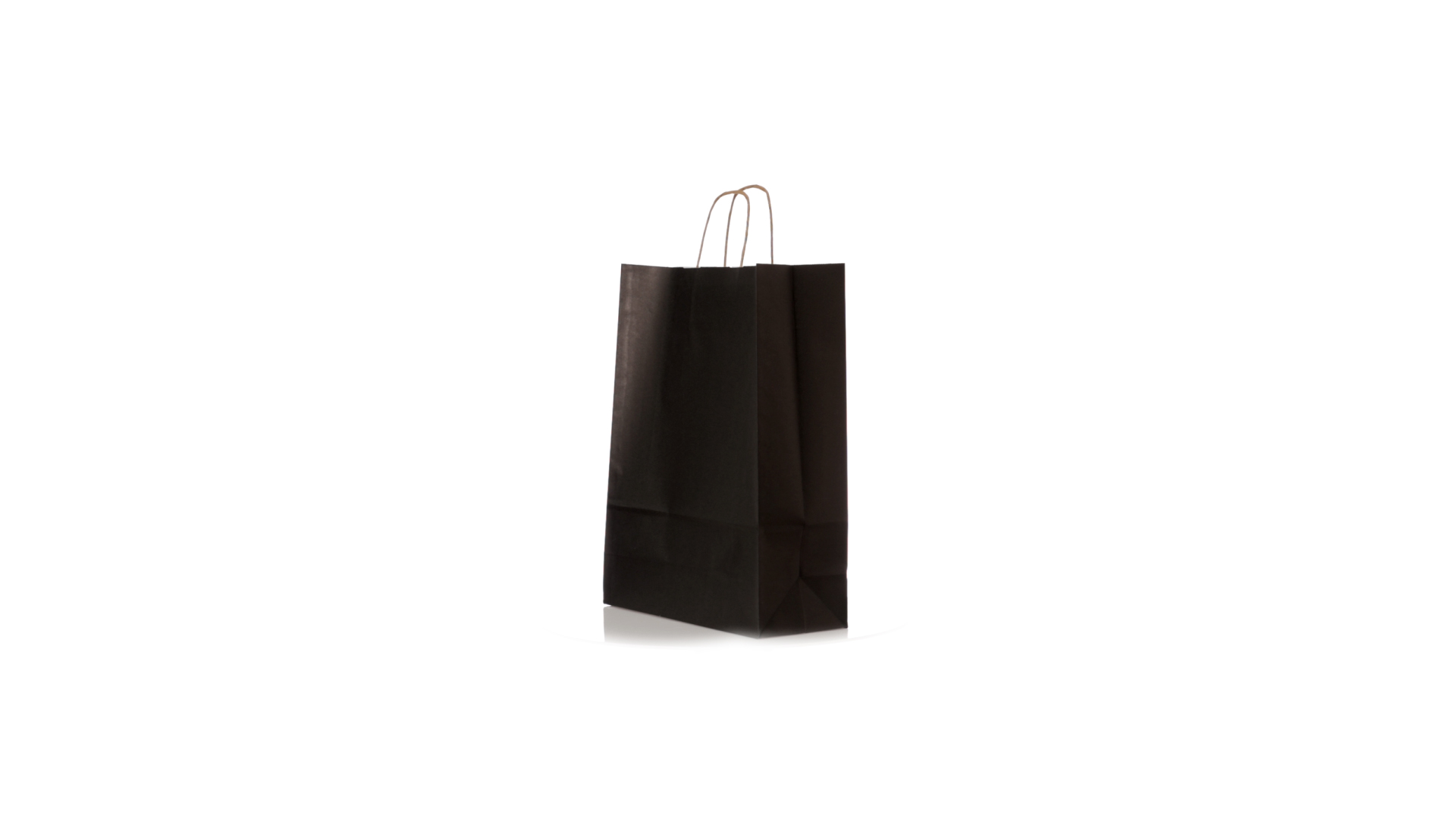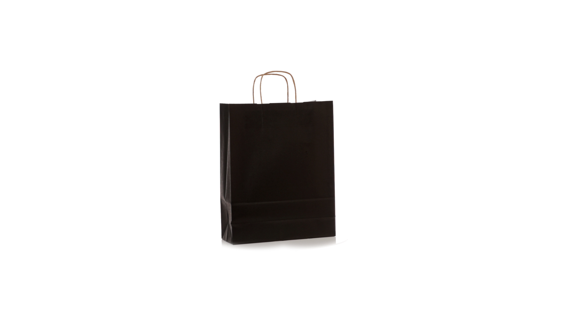 Natur Linie Tasche aus 100g/m2 Recyclingpapier in schwarzer Ausführung, mit kurzen, verstärkten Griffen in Naturfarbe und Zwickel. Belastbar bis zu einem Gewicht von 8 kg.