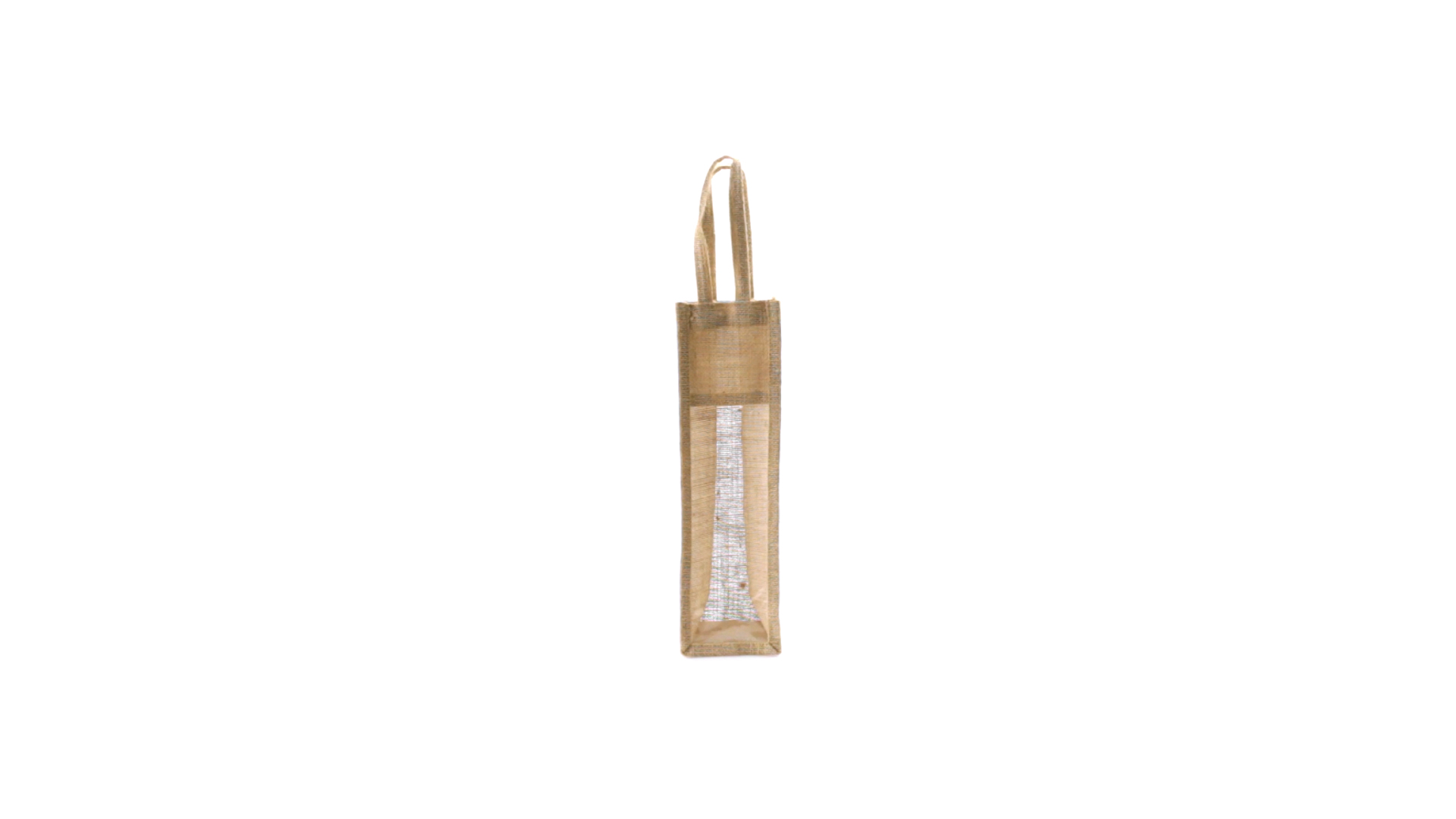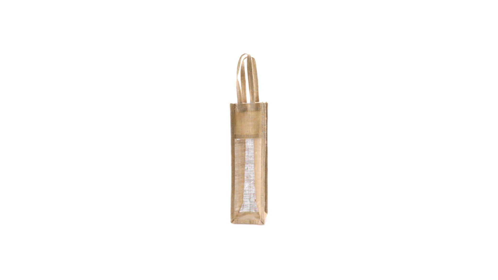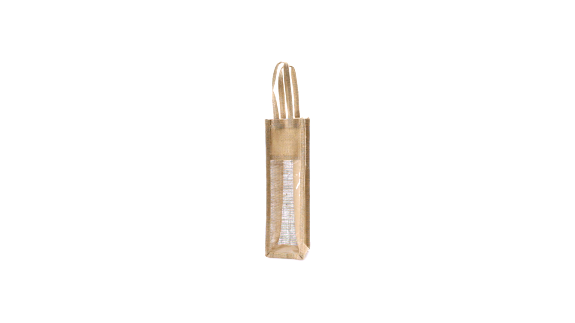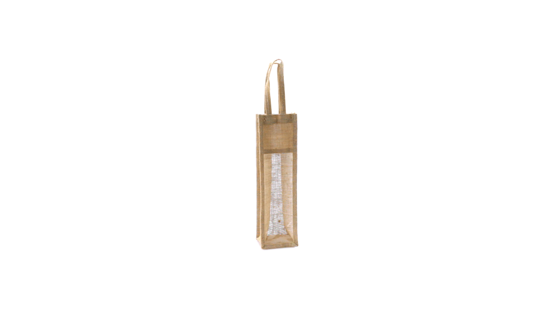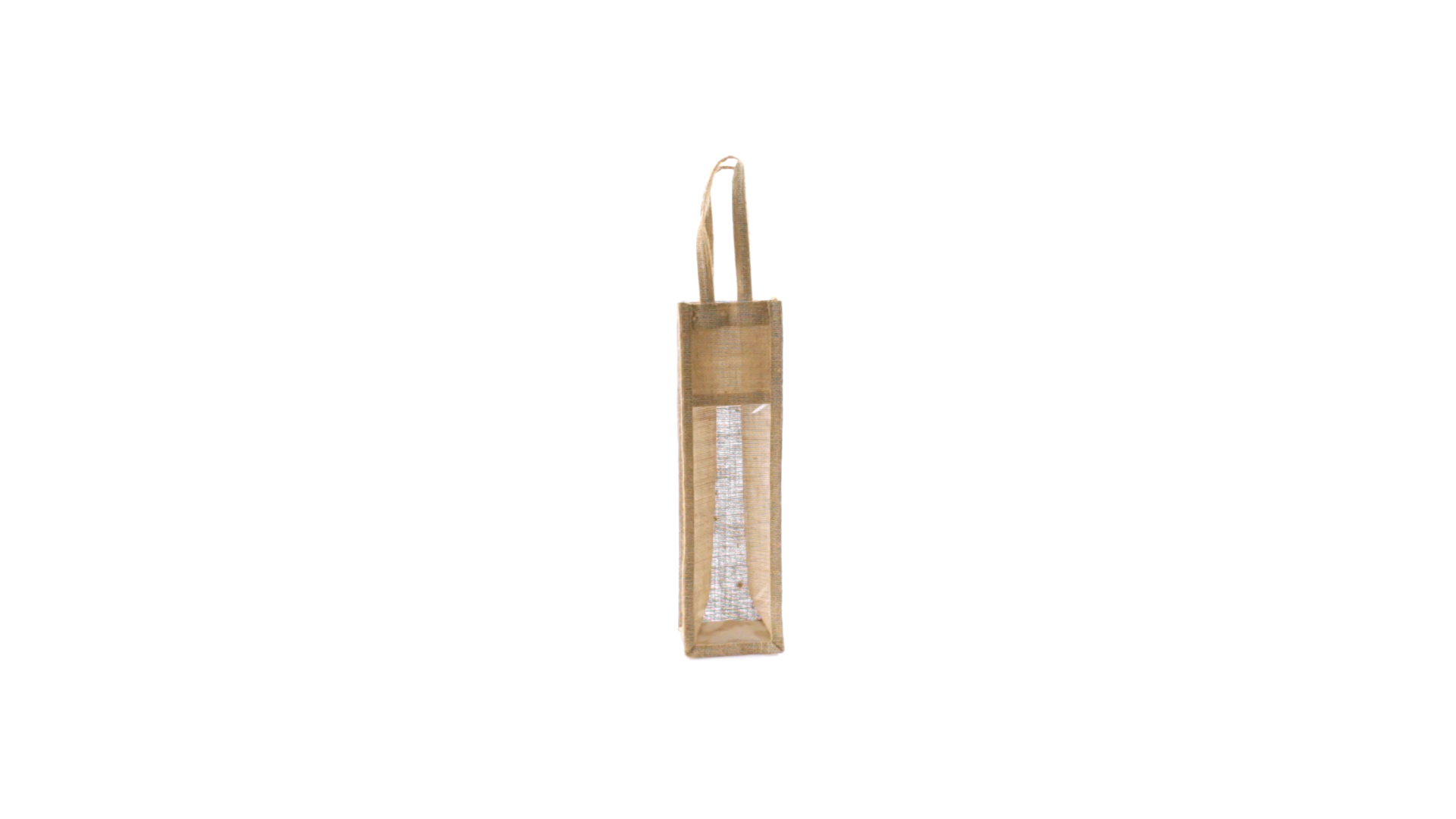 Robuster, laminierter Jutebeutel für 750 ml Weinflasche. Mit transparentem Fenster sowie verstärkten Rändern und Griffen.