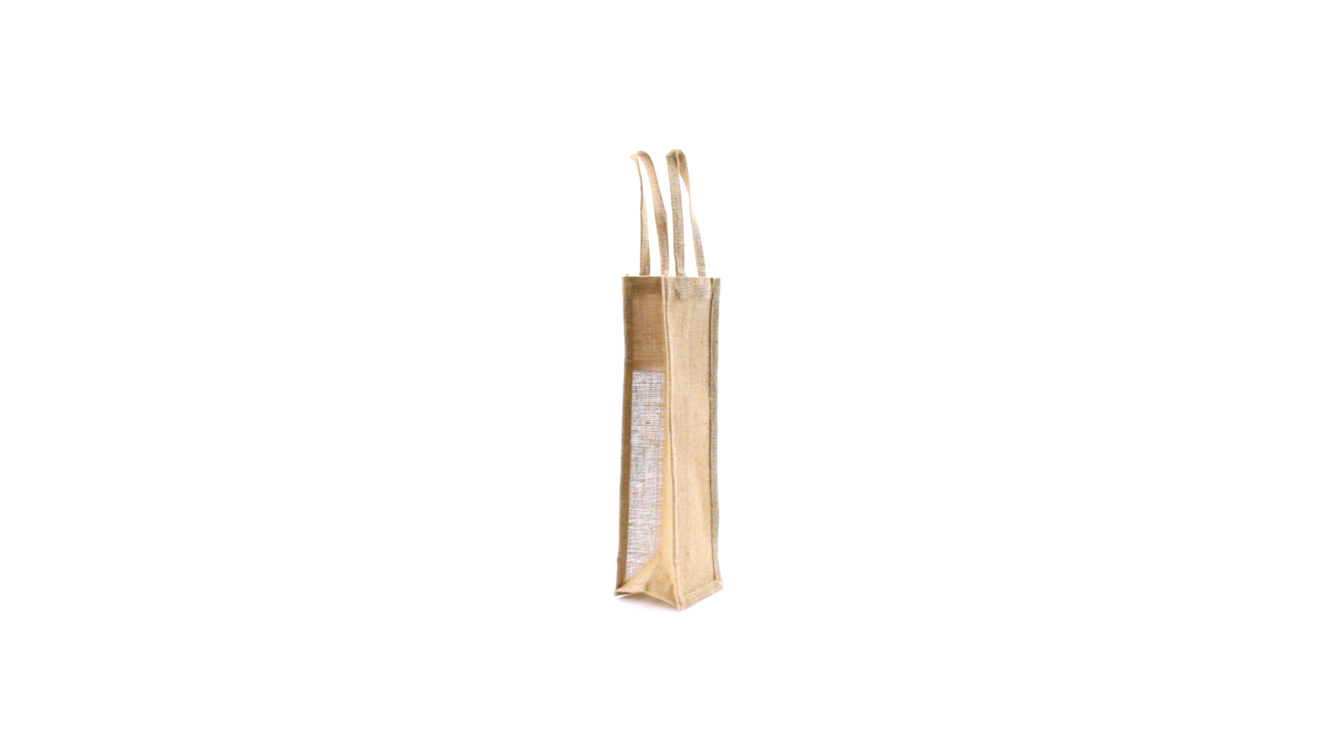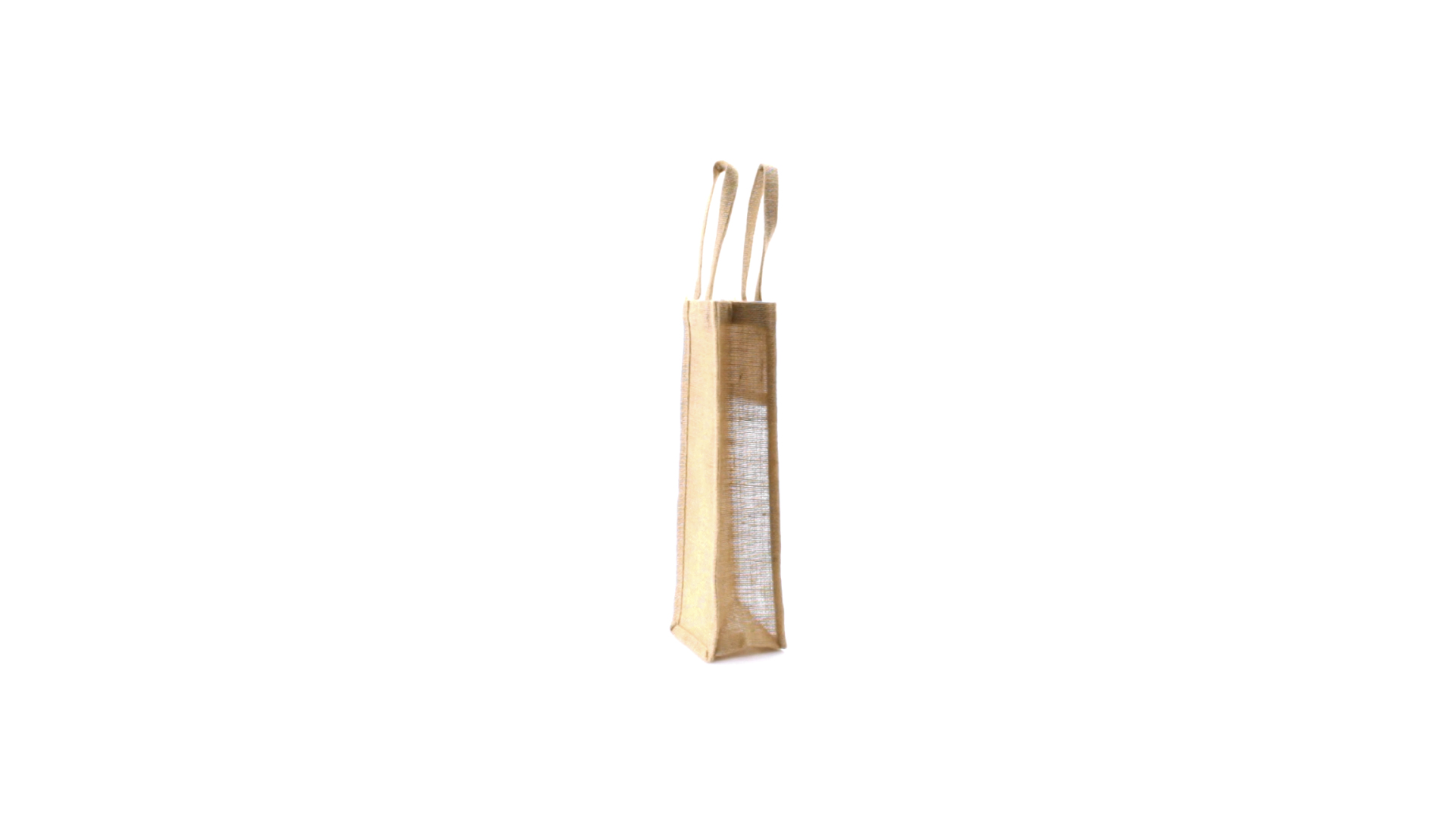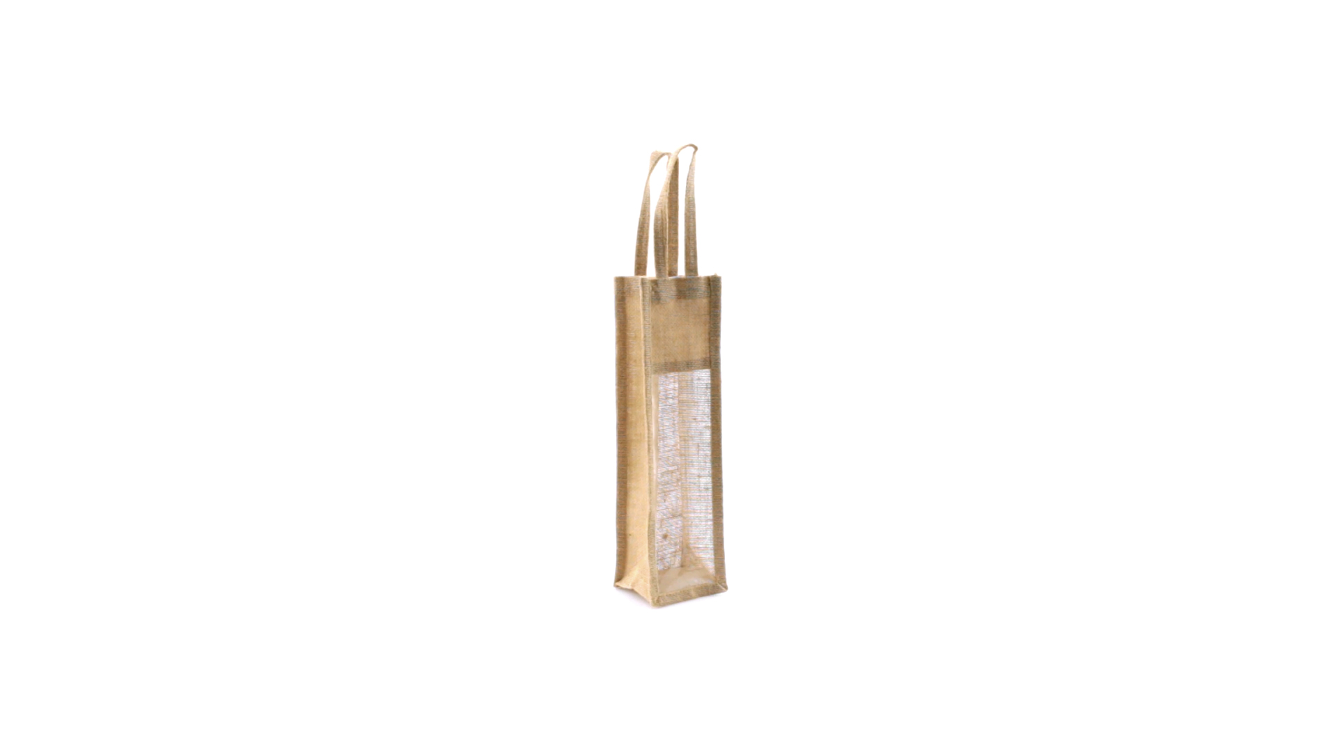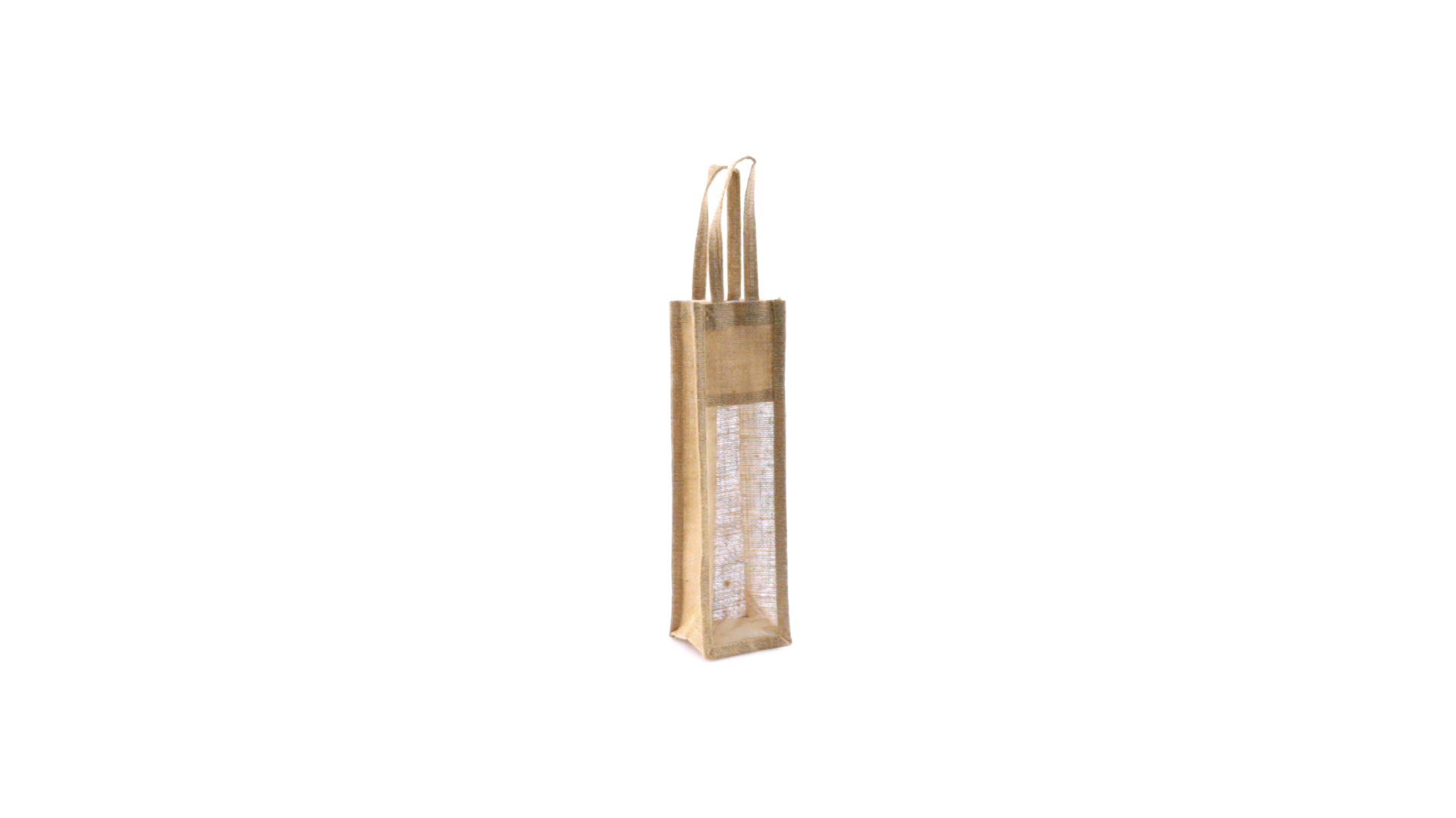 Robuster, laminierter Jutebeutel für 750 ml Weinflasche. Mit transparentem Fenster sowie verstärkten Rändern und Griffen.