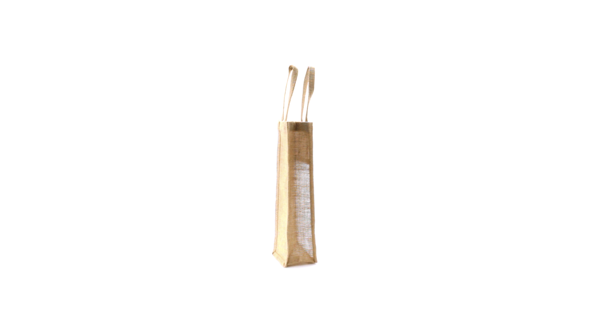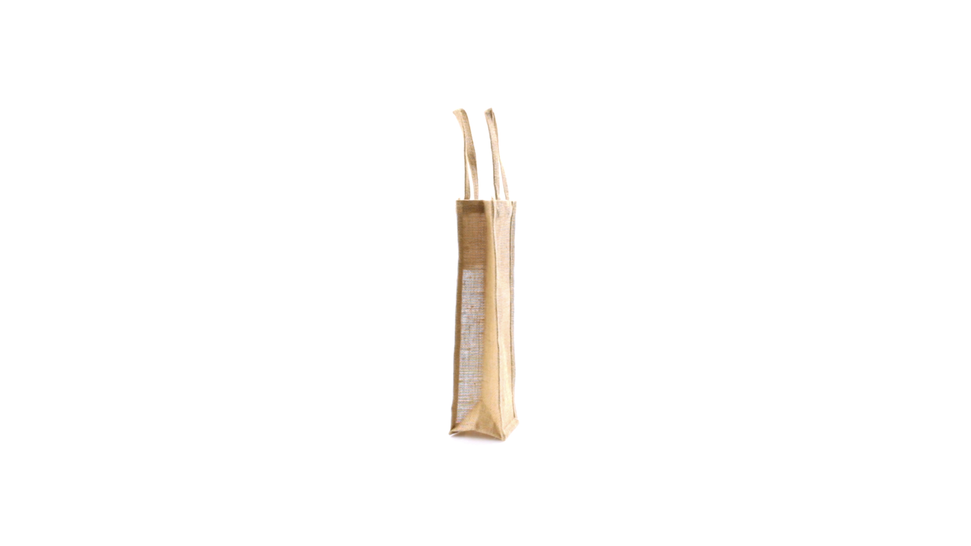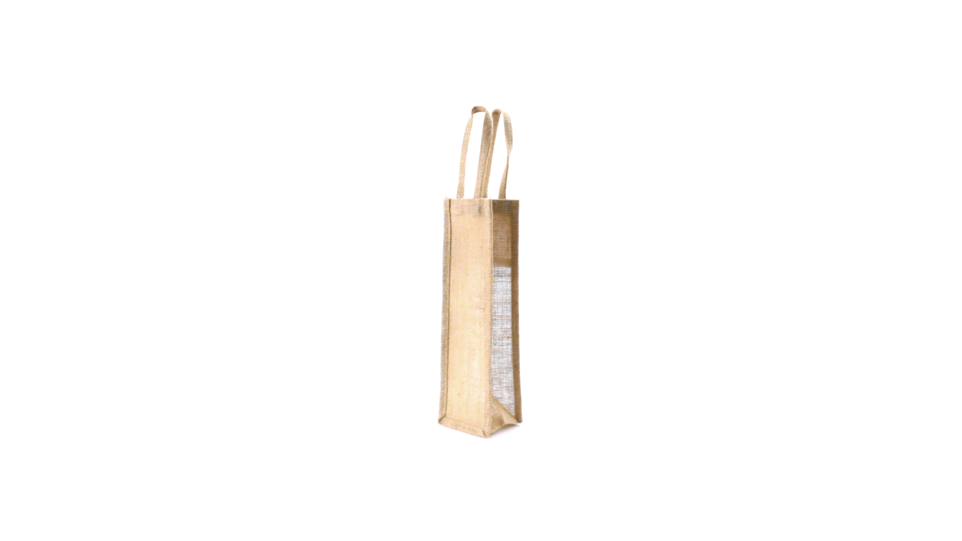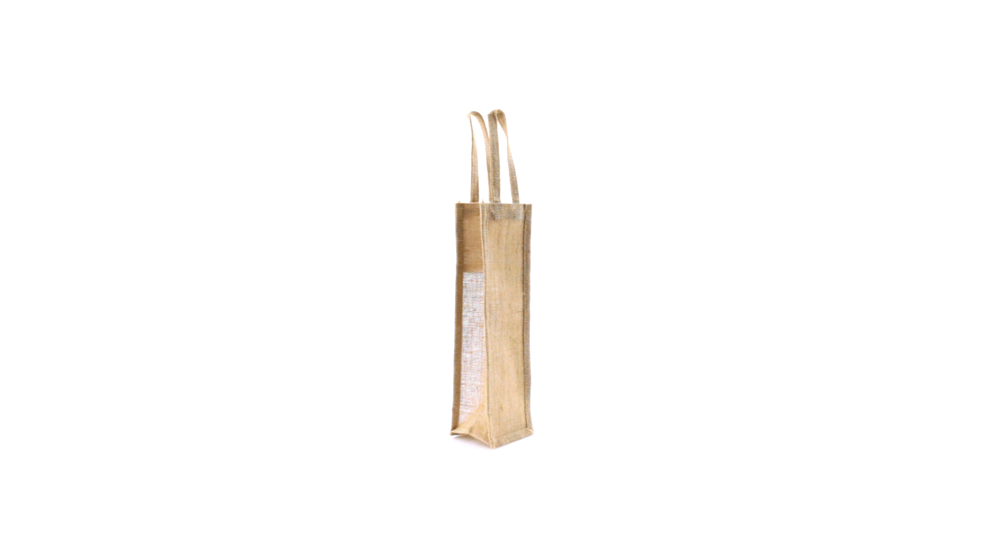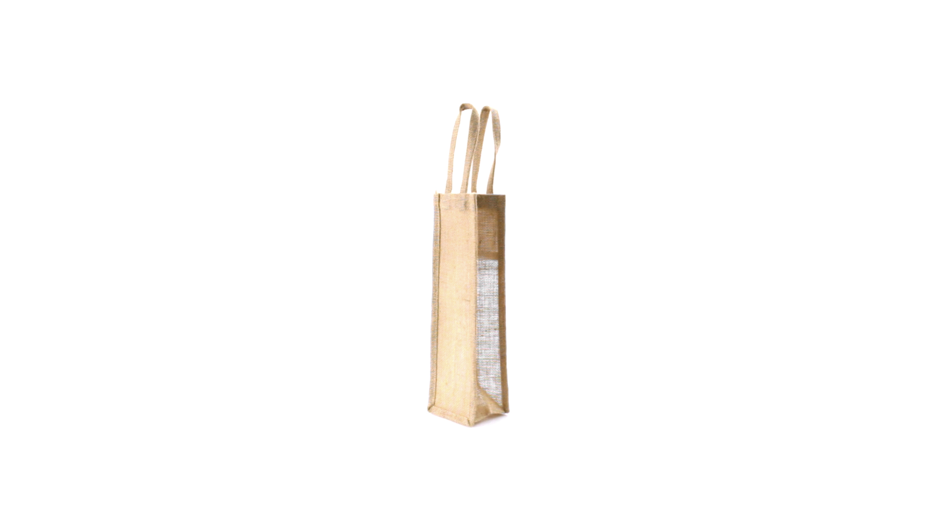 Robuster, laminierter Jutebeutel für 750 ml Weinflasche. Mit transparentem Fenster sowie verstärkten Rändern und Griffen.