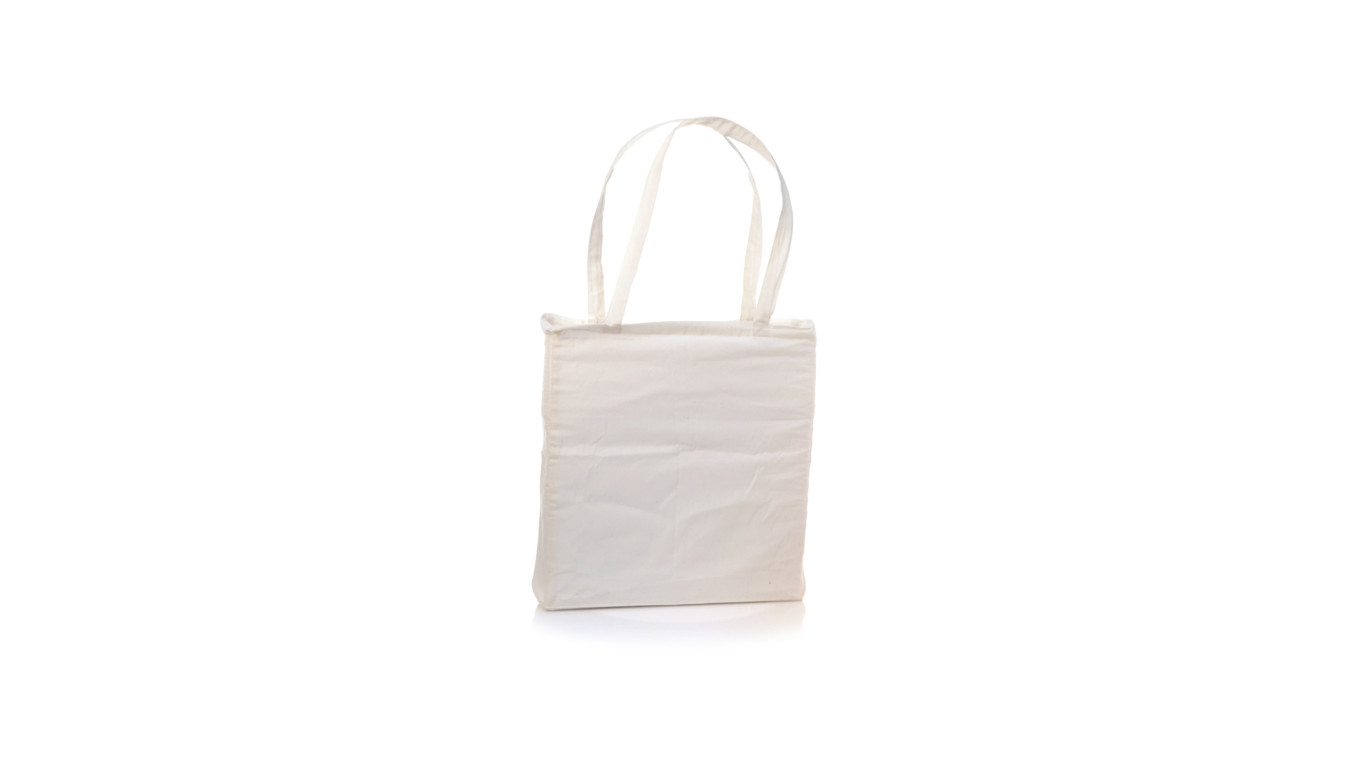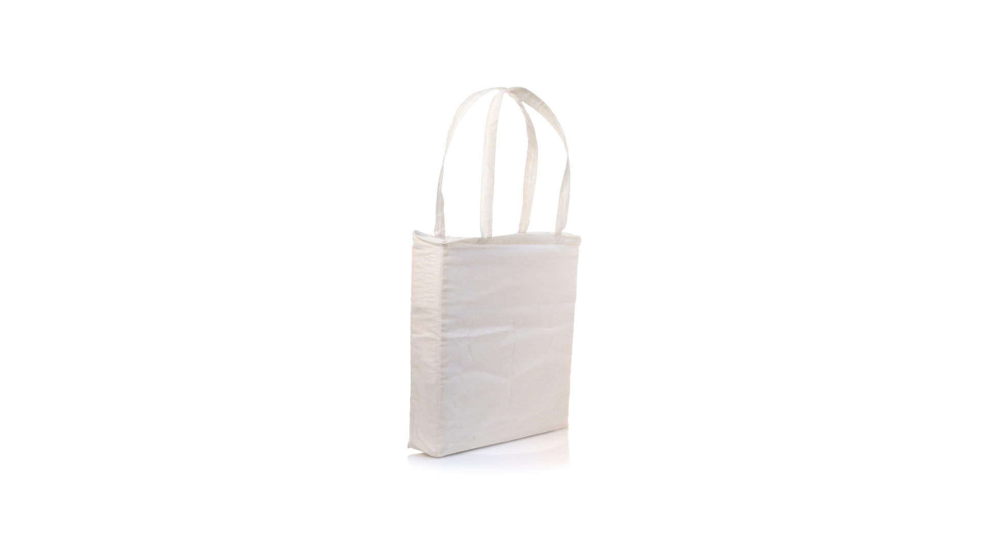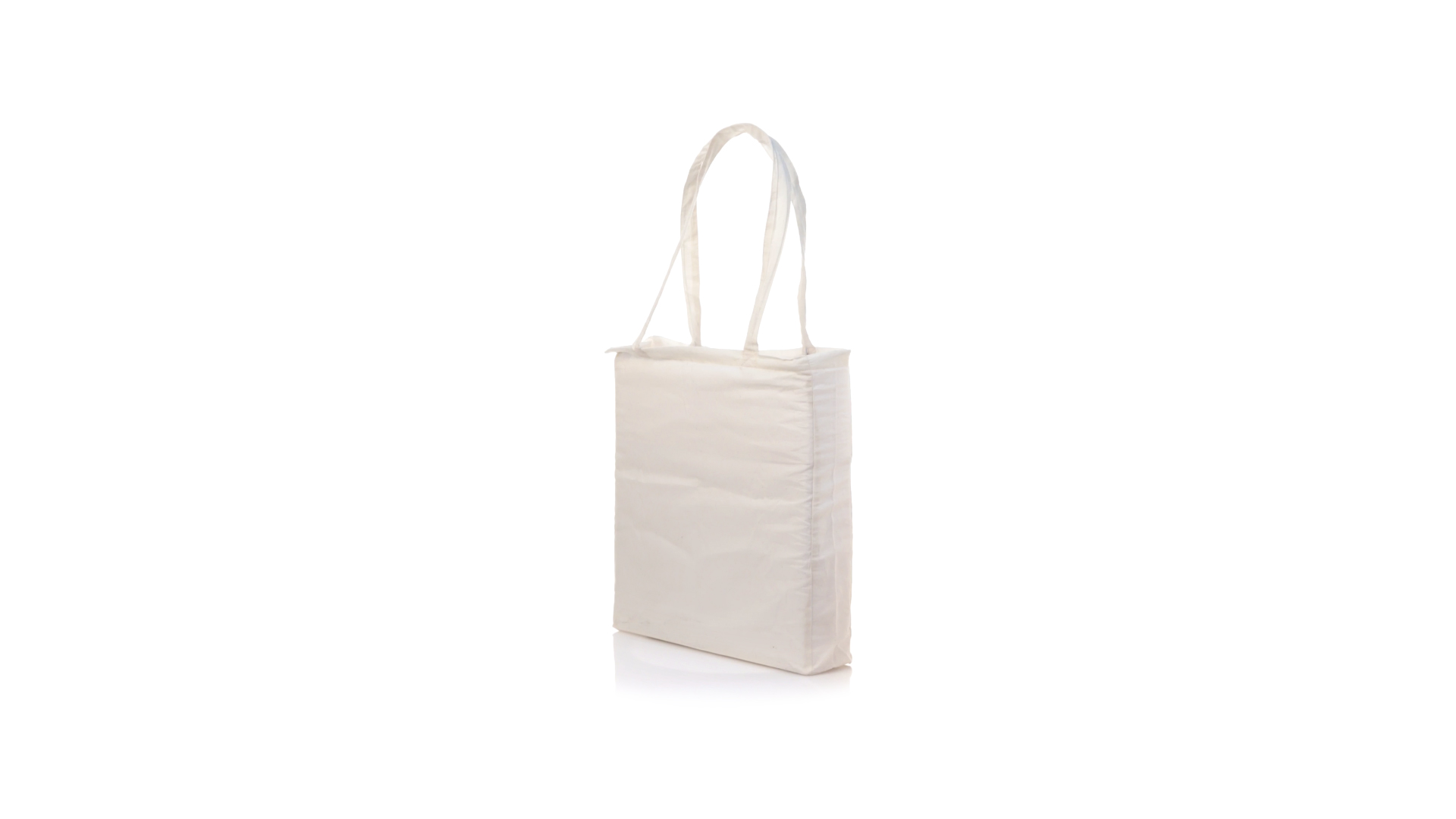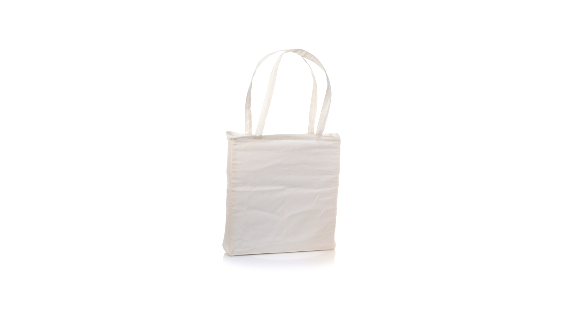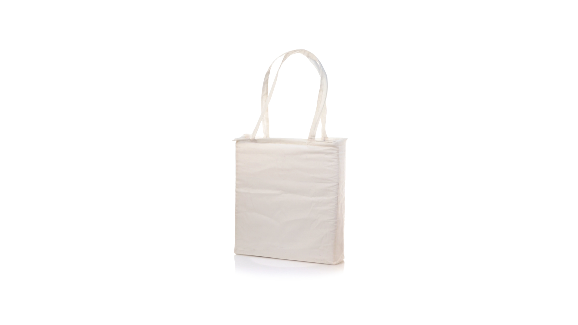 Tasche aus Baumwolle in Naturfarbe. Mit 70 cm langen, verstärkten Henkeln, Zwickel und Steppnähten. Belastbar mit bis zu 7 kg.