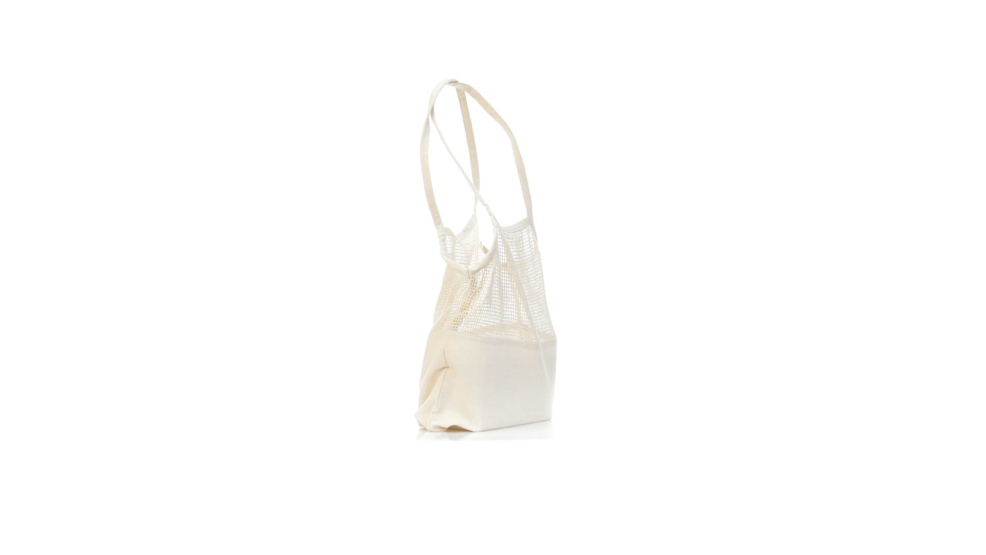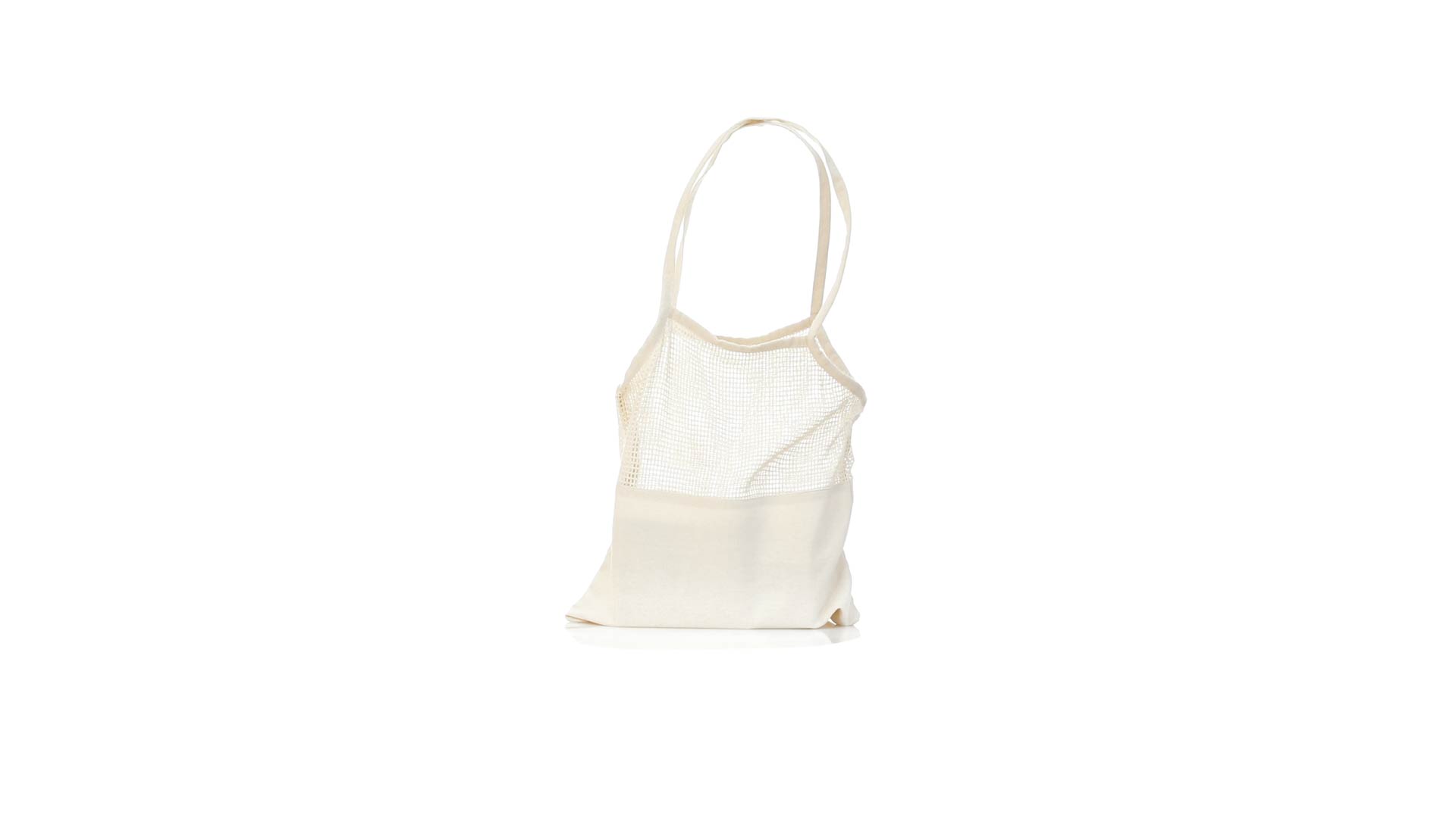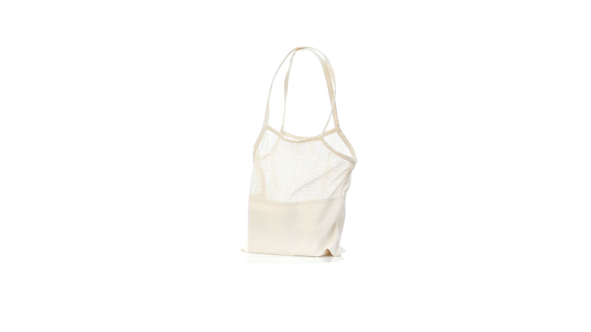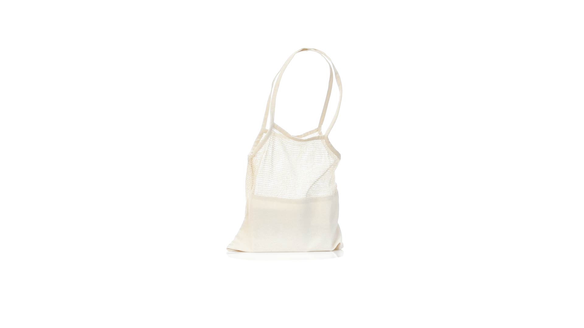 Netzbeutel aus naturfarbener Baumwolle 220g/m2, mit einem flachen Bereich zum Bedrucken. 60 cm lange, verstärkte Henkel.