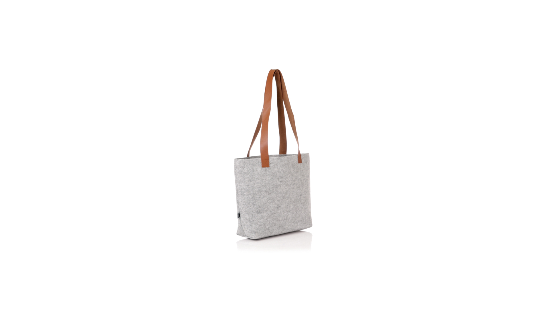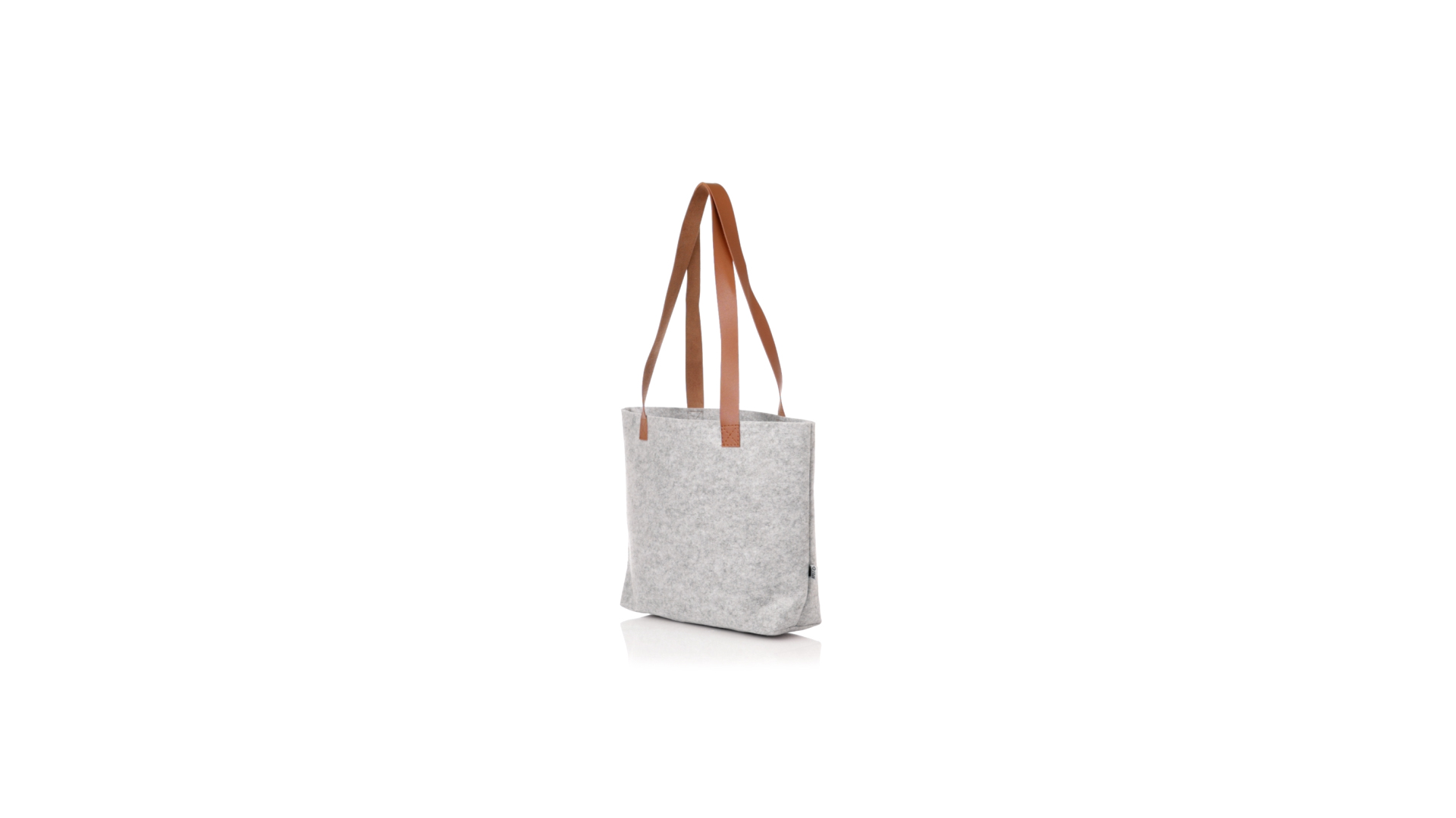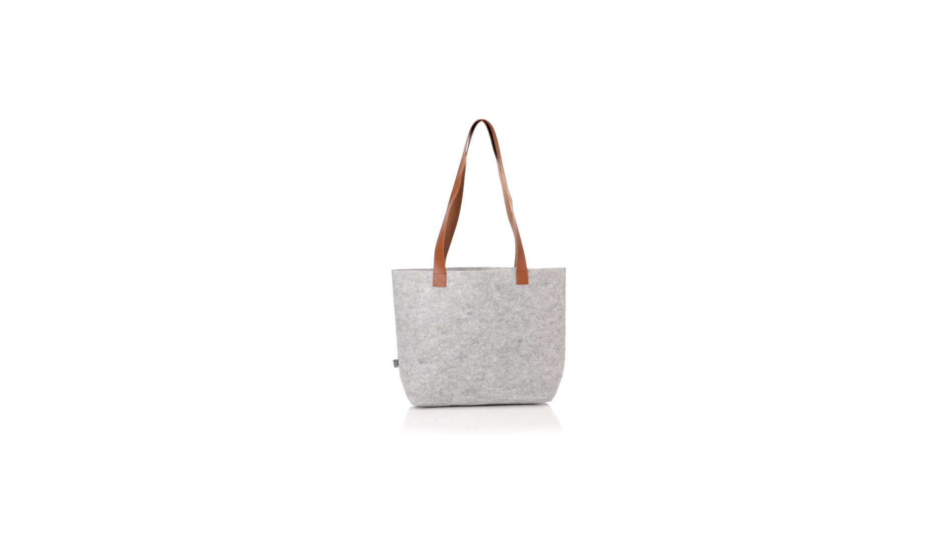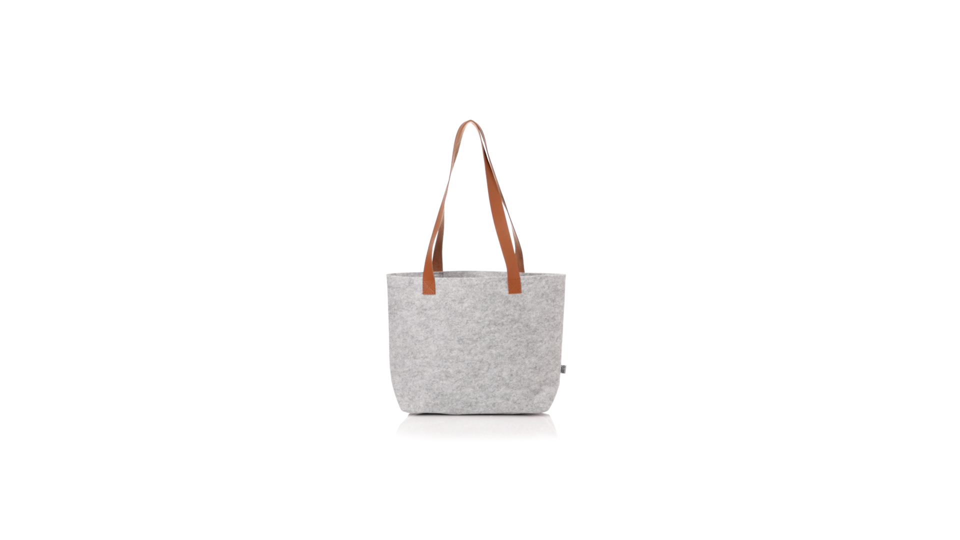 Natur Linie Tasche aus RPET-Filz, mit langen, verstärkten Griffen (70 x 3 cm) aus braunem PU-Leder. Abgenäht, mit Bodenfalte und Korpus in Grau und Naturfarben erhältlich. Aussenetikett mit RPET-Logo. Widerstandsfähigkeit bis zu 6 kg Gewicht.Filz RPET ist das Ergebnis der Kombination der Recyclingprozesse von Kunststoffen mit der jahrtausendealten Technik der Filzherstellung. Das Ergebnis ist ein Öko-Trend-Material, das nicht nur aus recyceltem Material besteht, sondern auch wiederverwertbar ist.