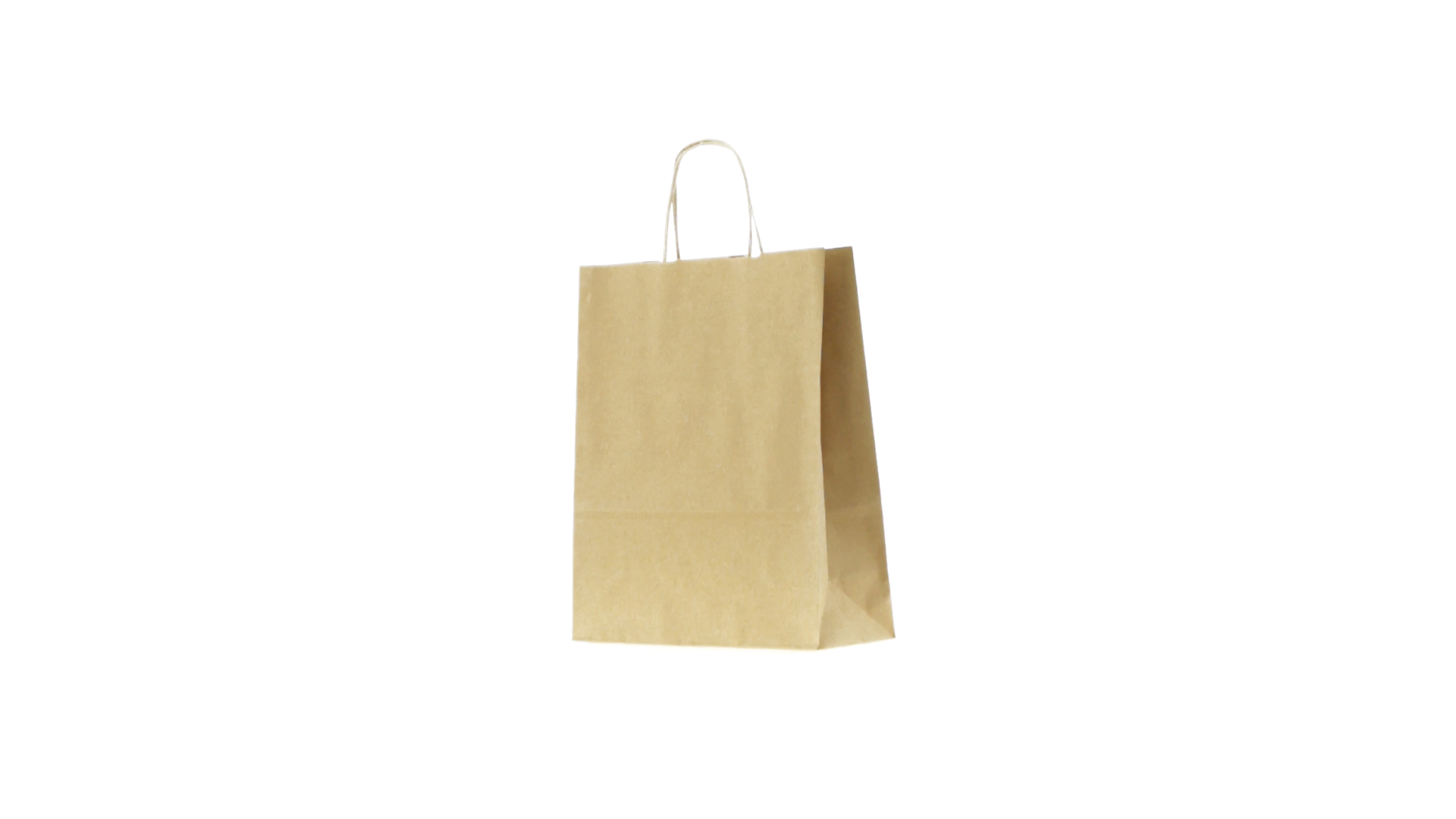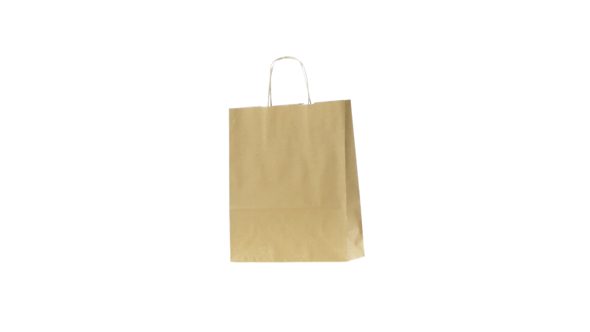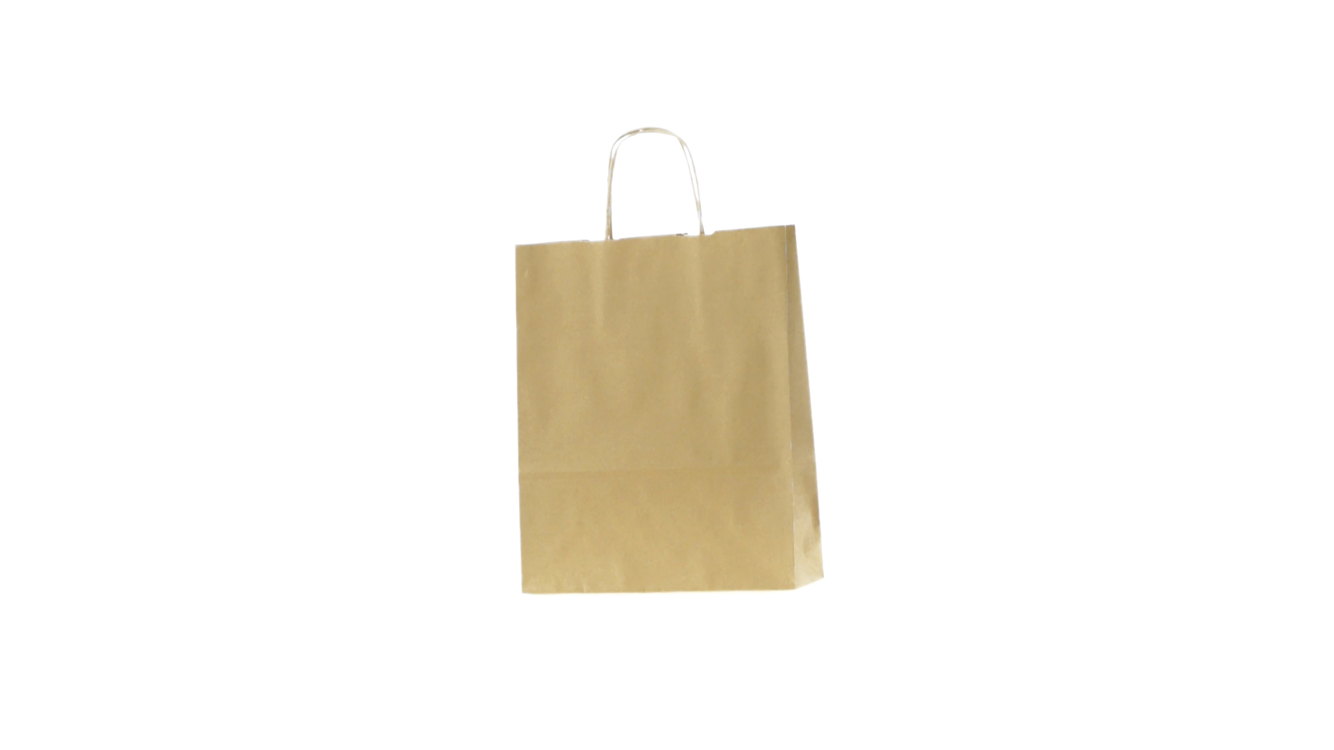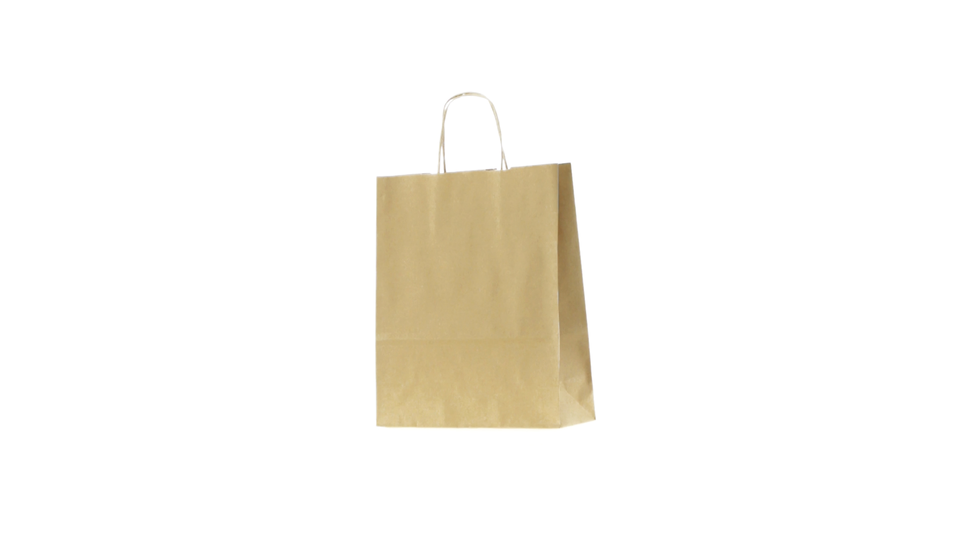 Tüte aus Papier (100 g/m2) in Naturfarbe mit kurzen, verstärkten Griffen und Zwickel. Belastbar mit bis zu 7 kg.