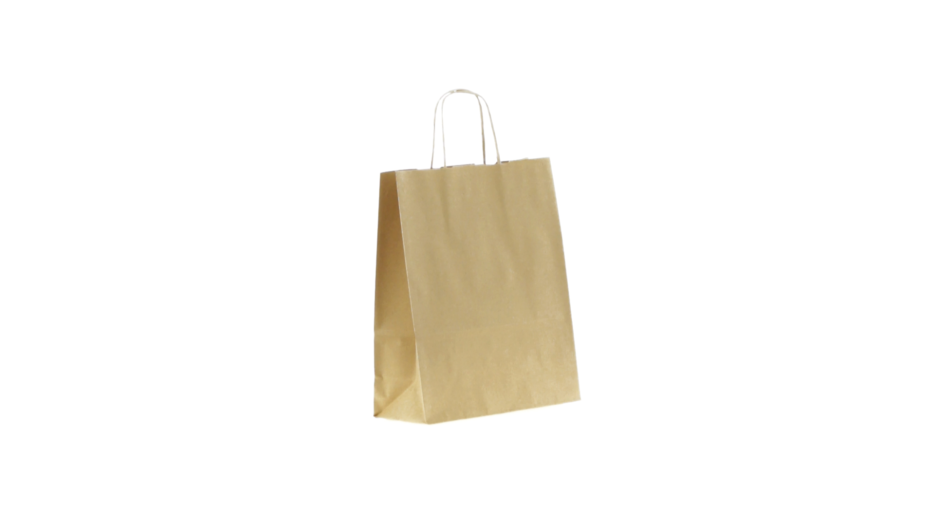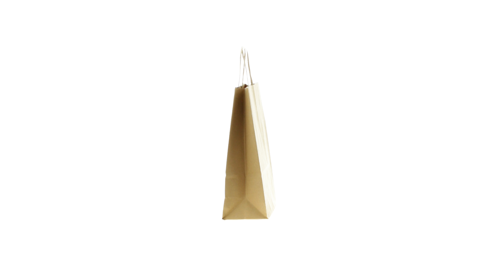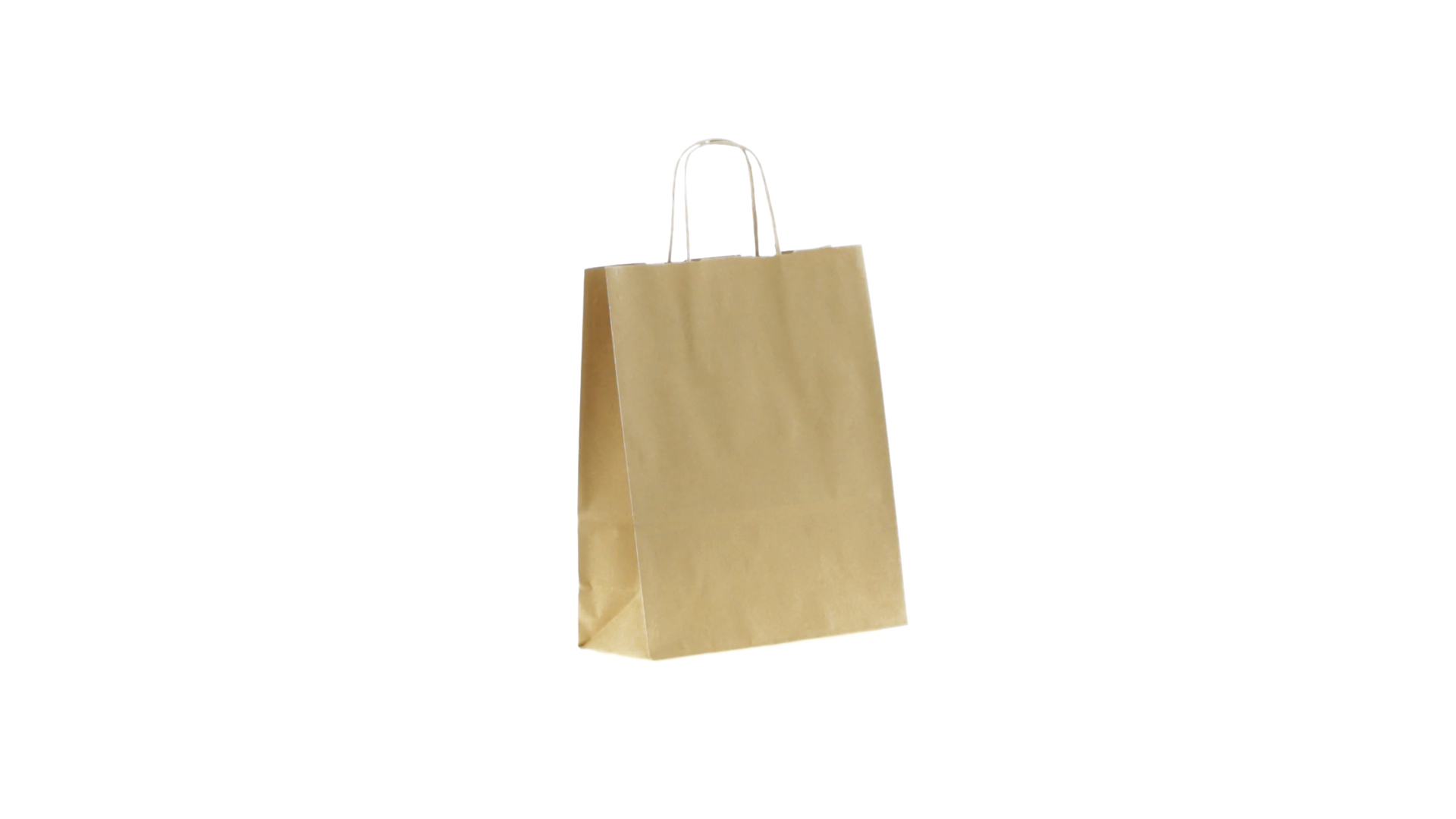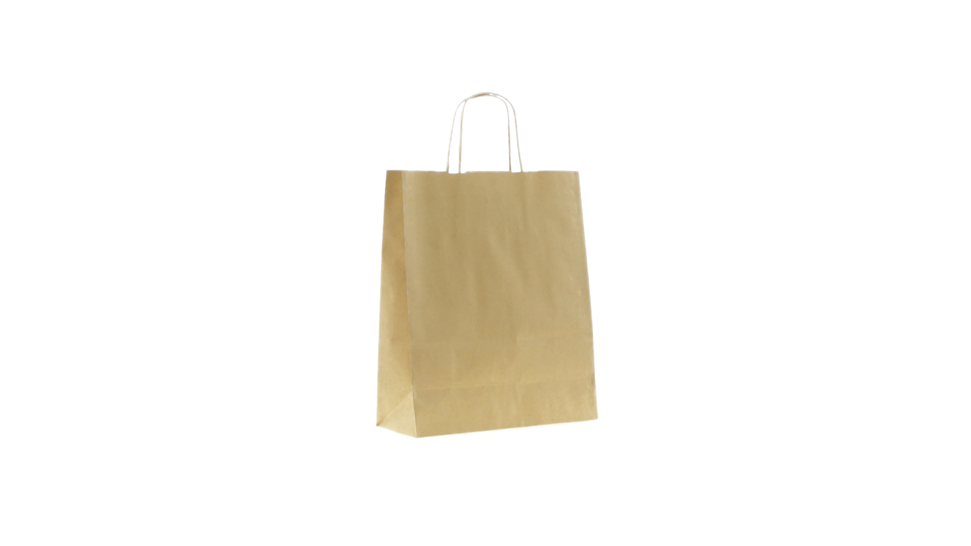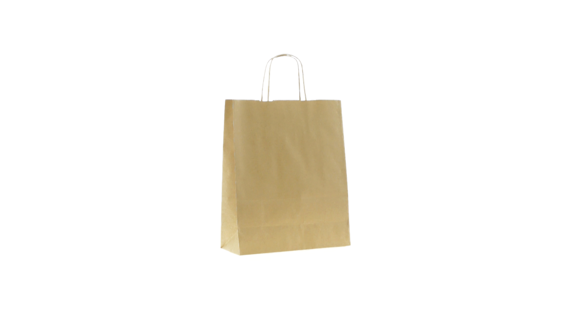 Tüte aus Papier (100 g/m2) in Naturfarbe mit kurzen, verstärkten Griffen und Zwickel. Belastbar mit bis zu 7 kg.