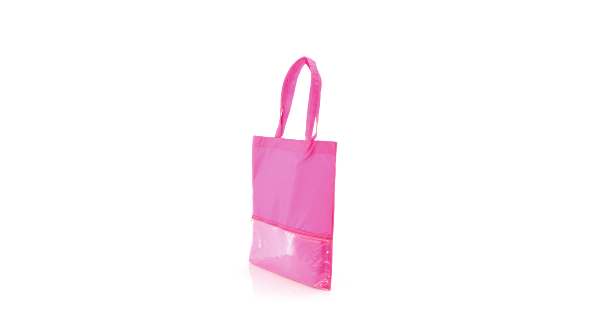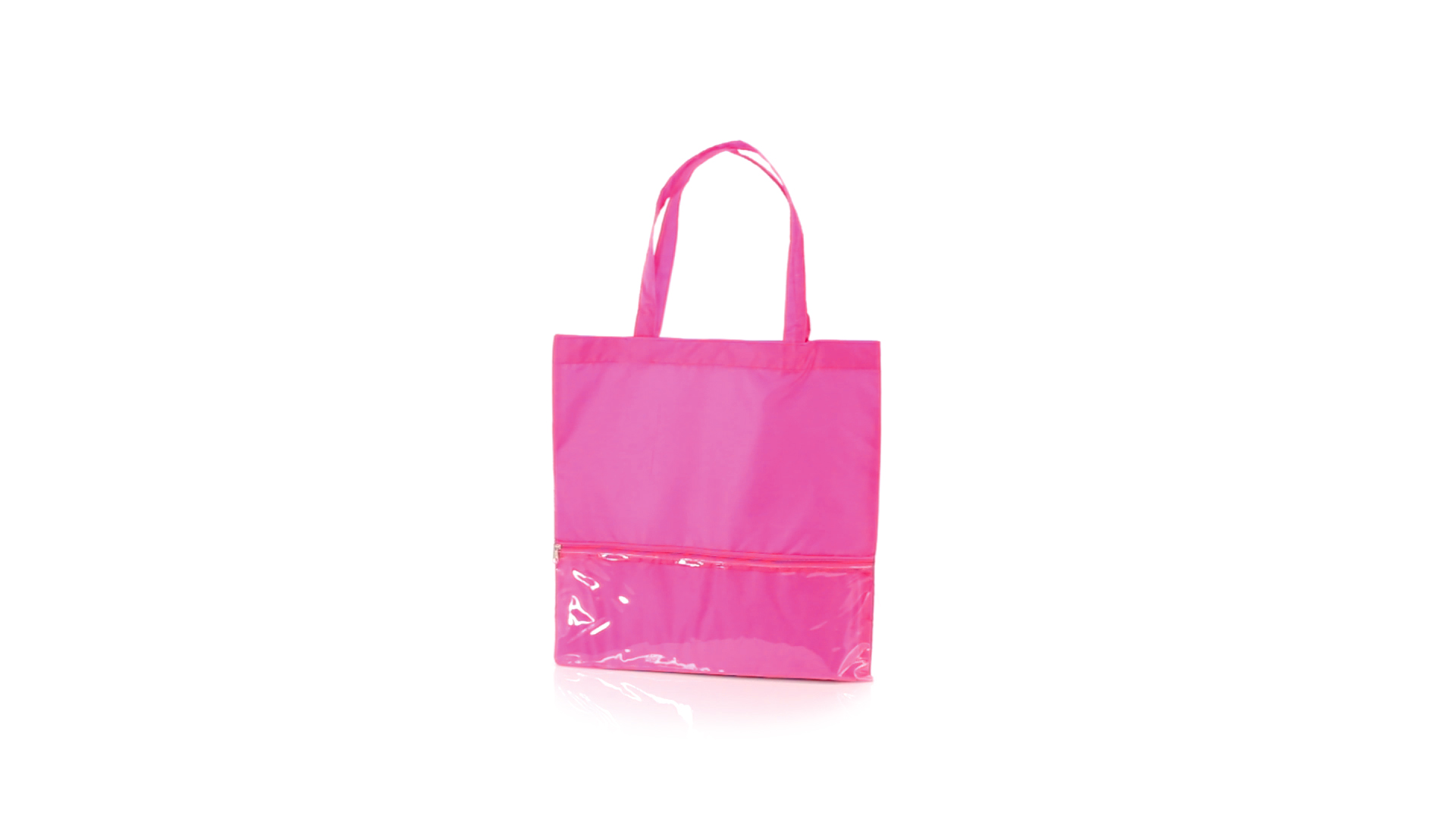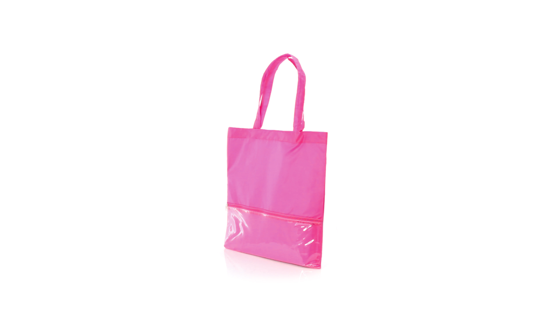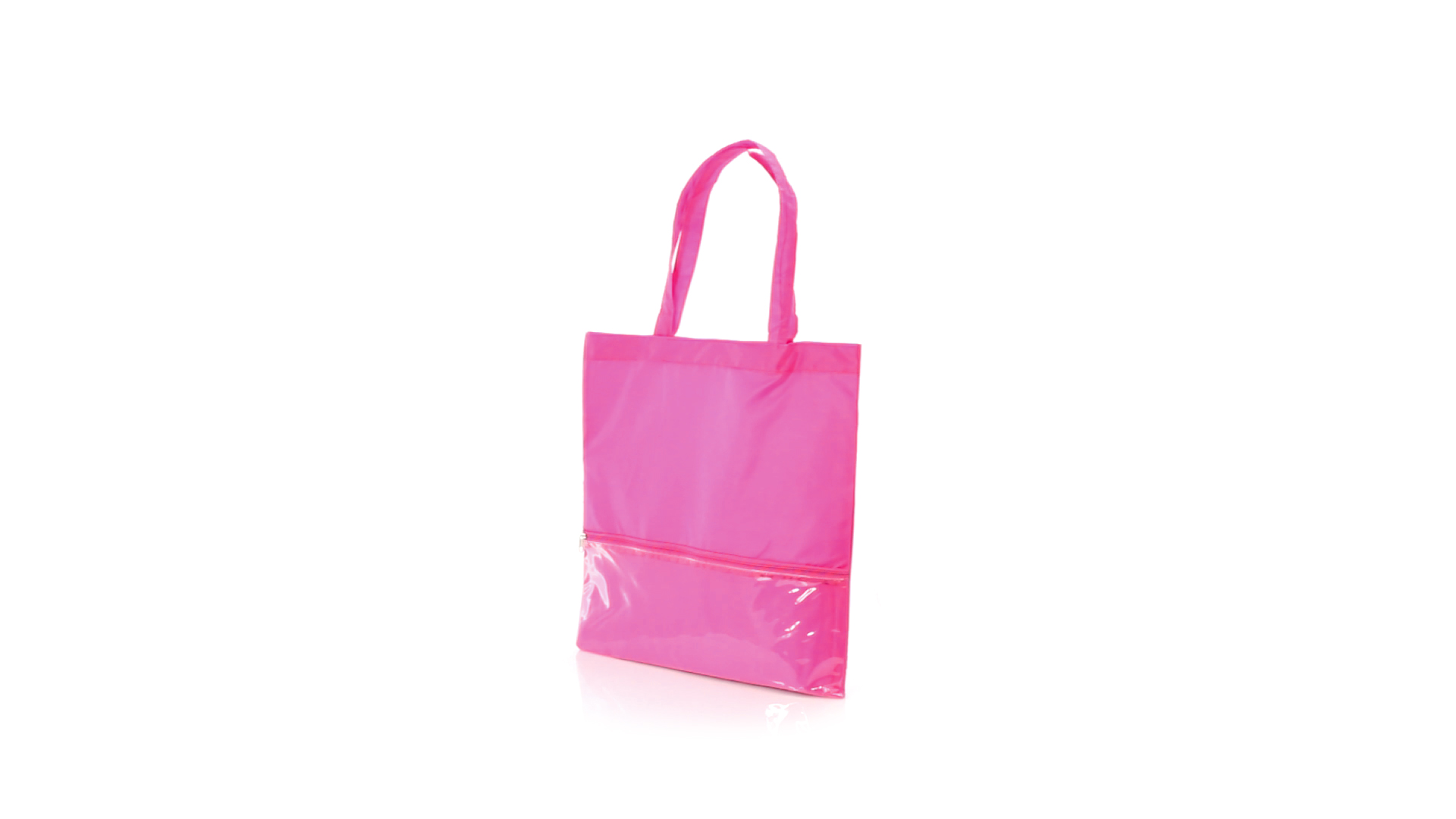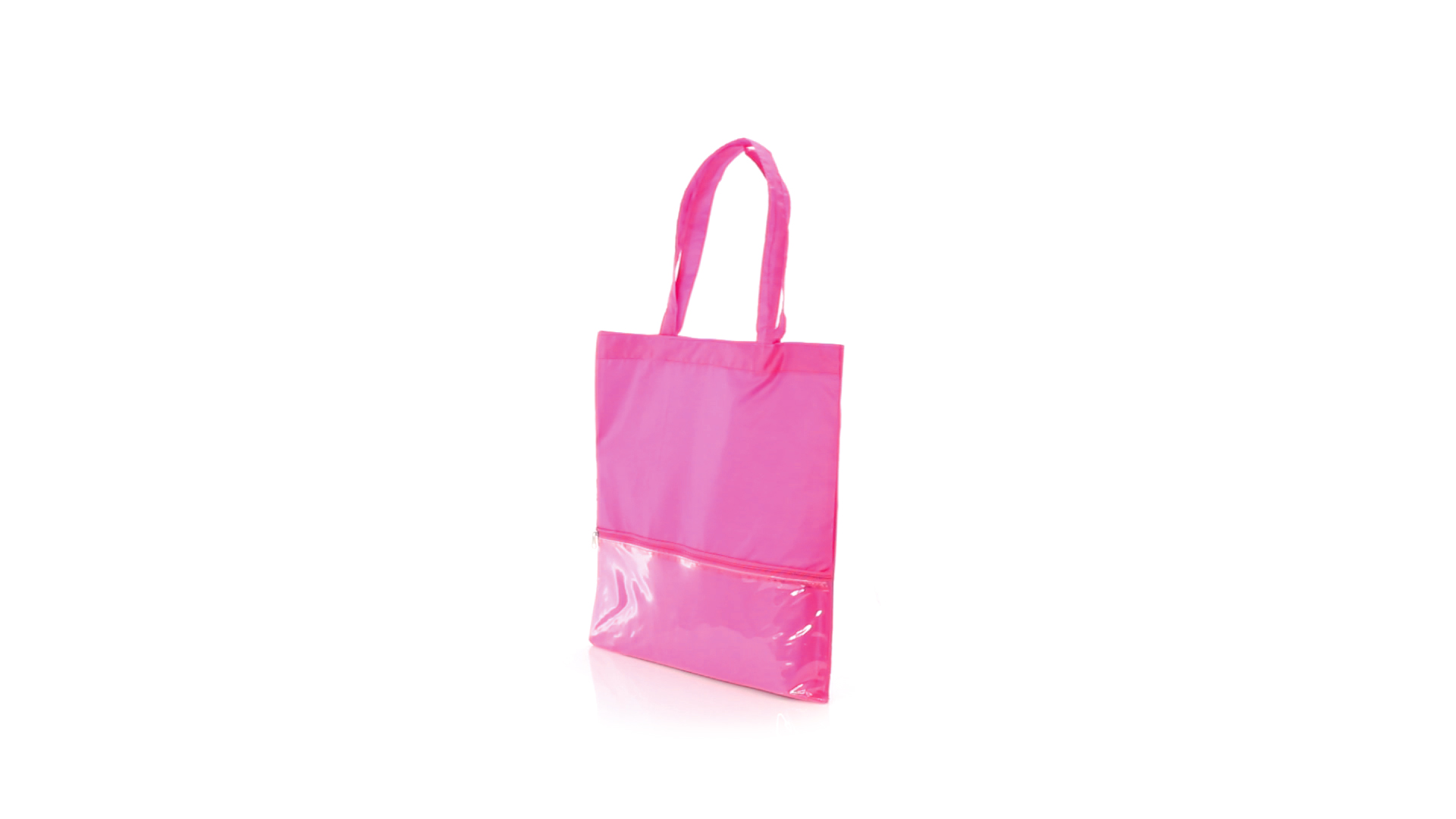 Originelle Tasche aus einer Kombination von weichem 190T Polyester und PVC. Mit mittellangen Henkeln, Steppnähten und aufgesetzter, transparenter PVC-Tasche.