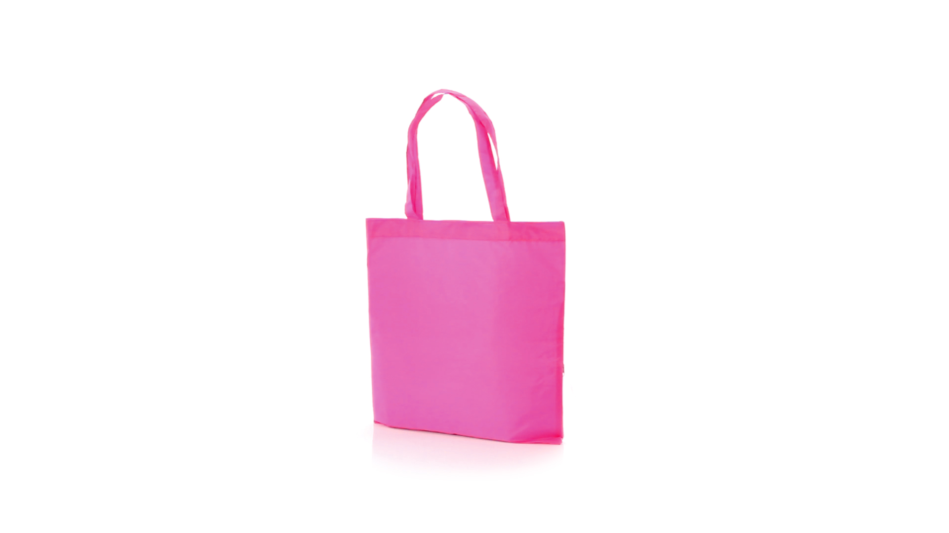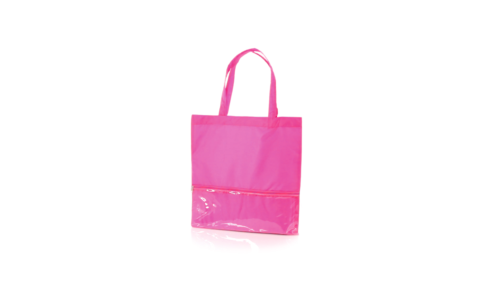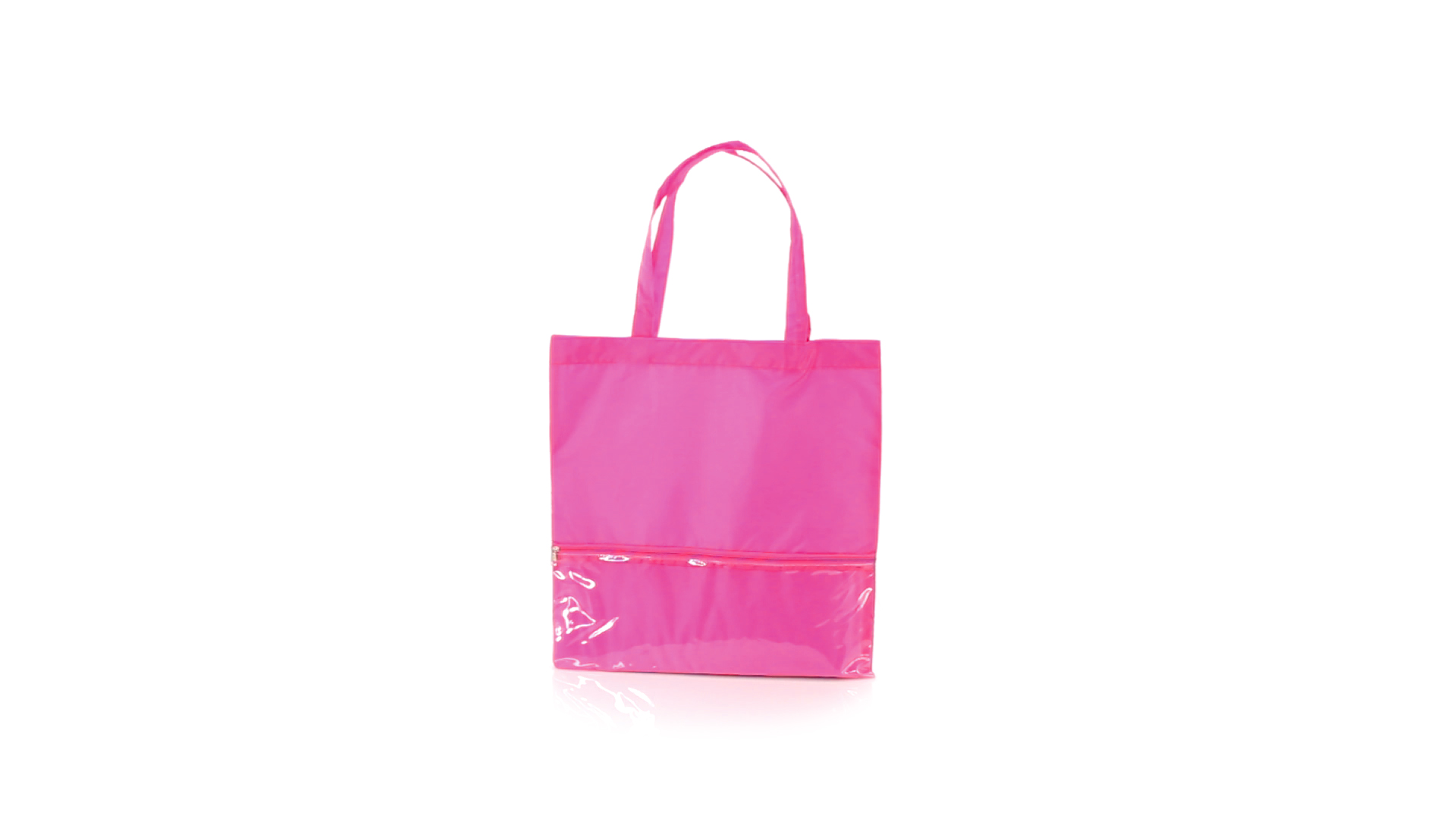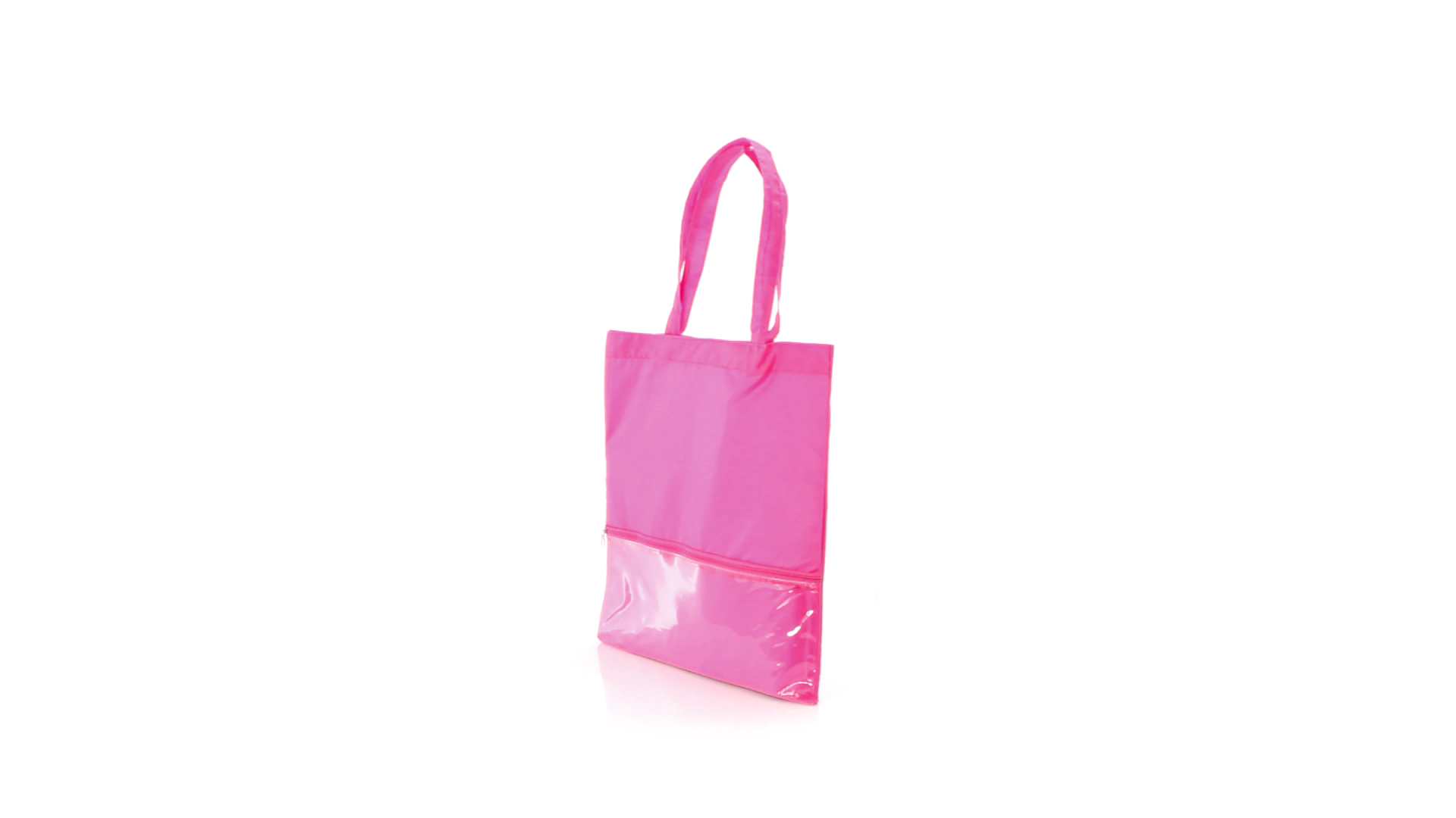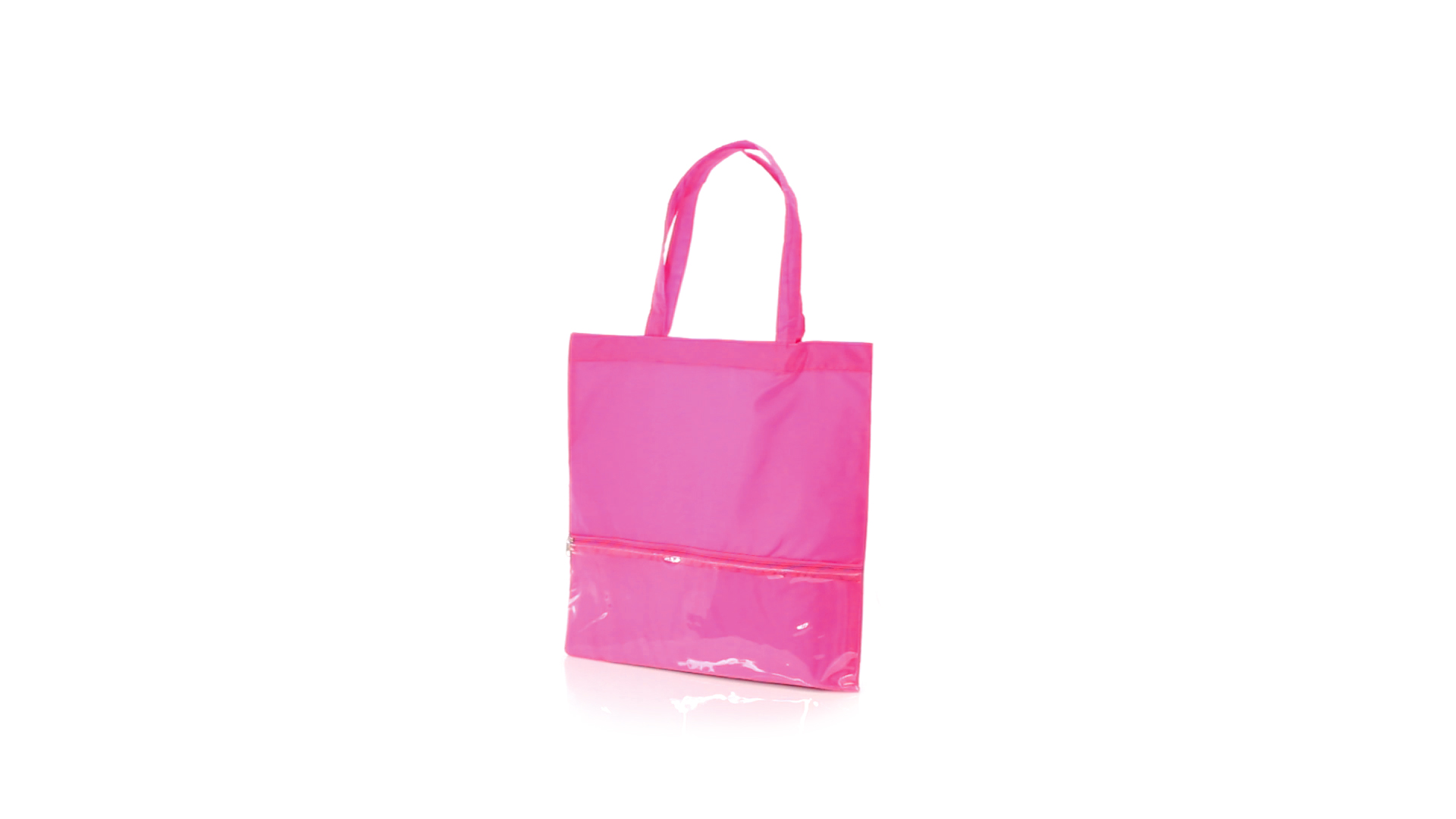 Originelle Tasche aus einer Kombination von weichem 190T Polyester und PVC. Mit mittellangen Henkeln, Steppnähten und aufgesetzter, transparenter PVC-Tasche.