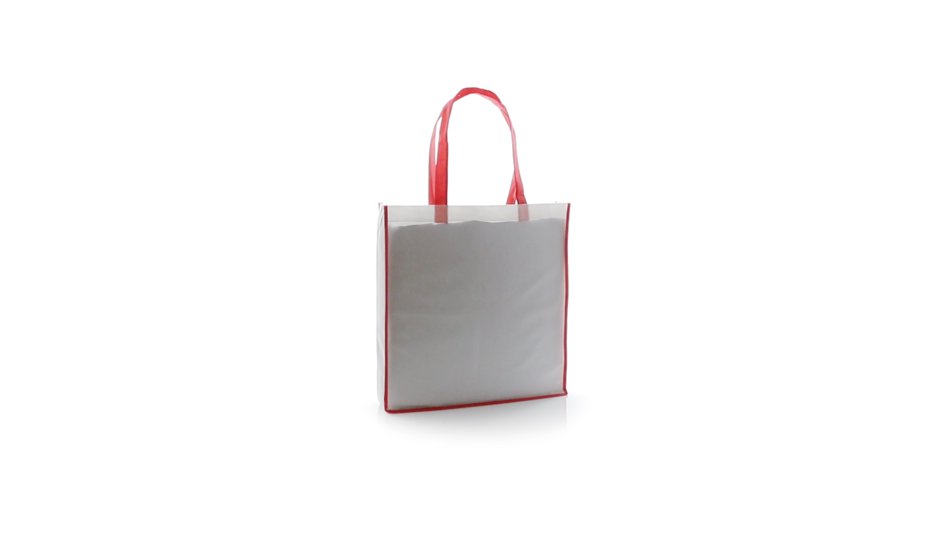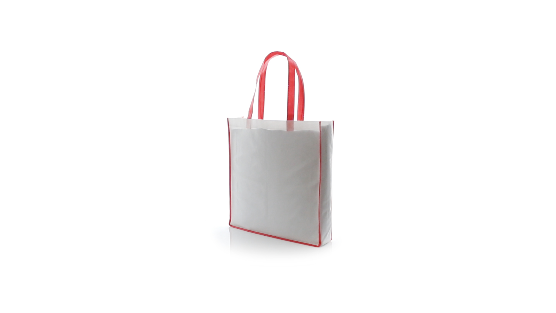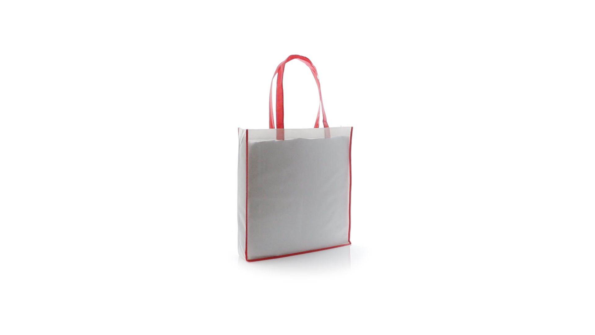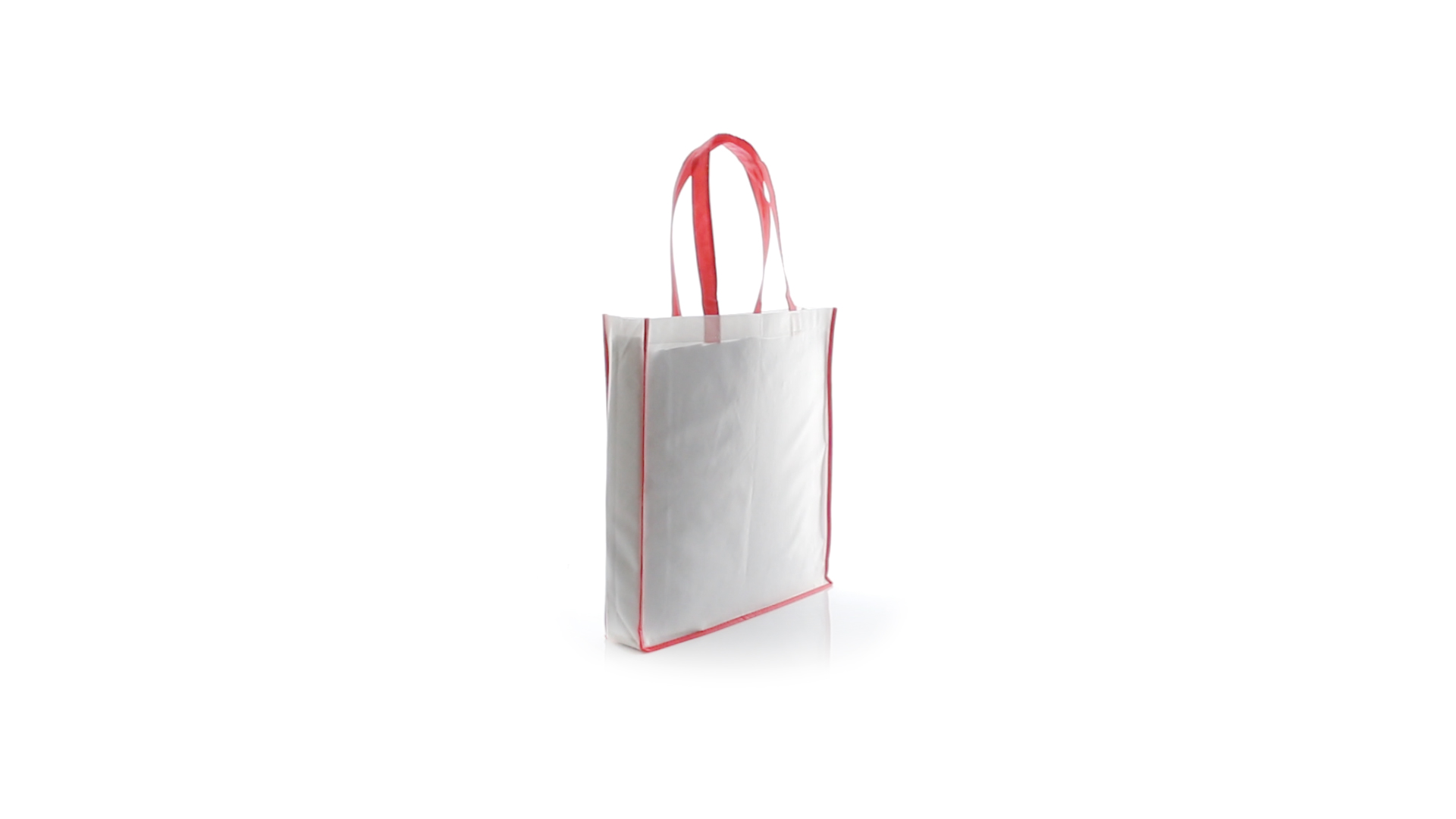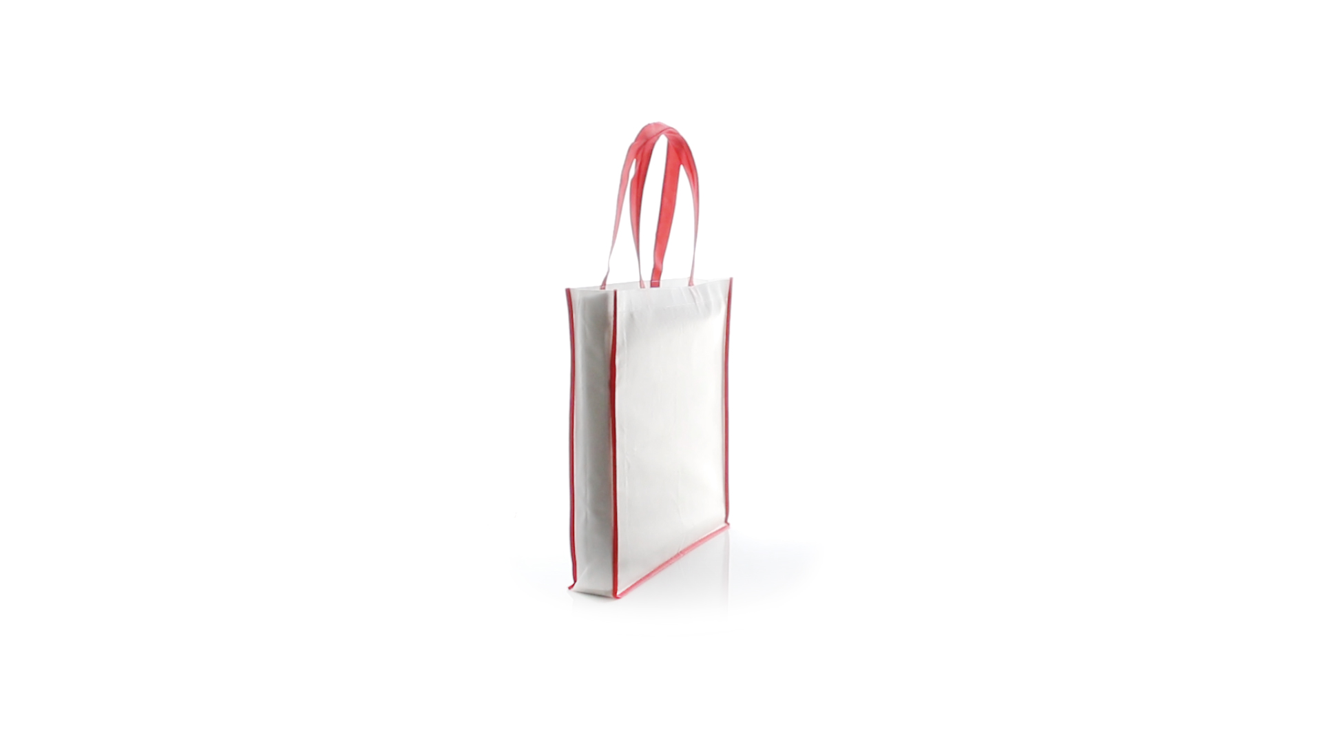 Non-Woven-Tasche aus Faservlies (90 g/m2) in Weiss mit Paspel und Griffen in verschiedenen kräftigen Farben. Mit mittellangen, verstärkten Henkeln von 53 cm Länge, verstärktem Zwickel sowie farblich passender Paspel und Steppnähten. Belastbar mit bis zu 9 kg.