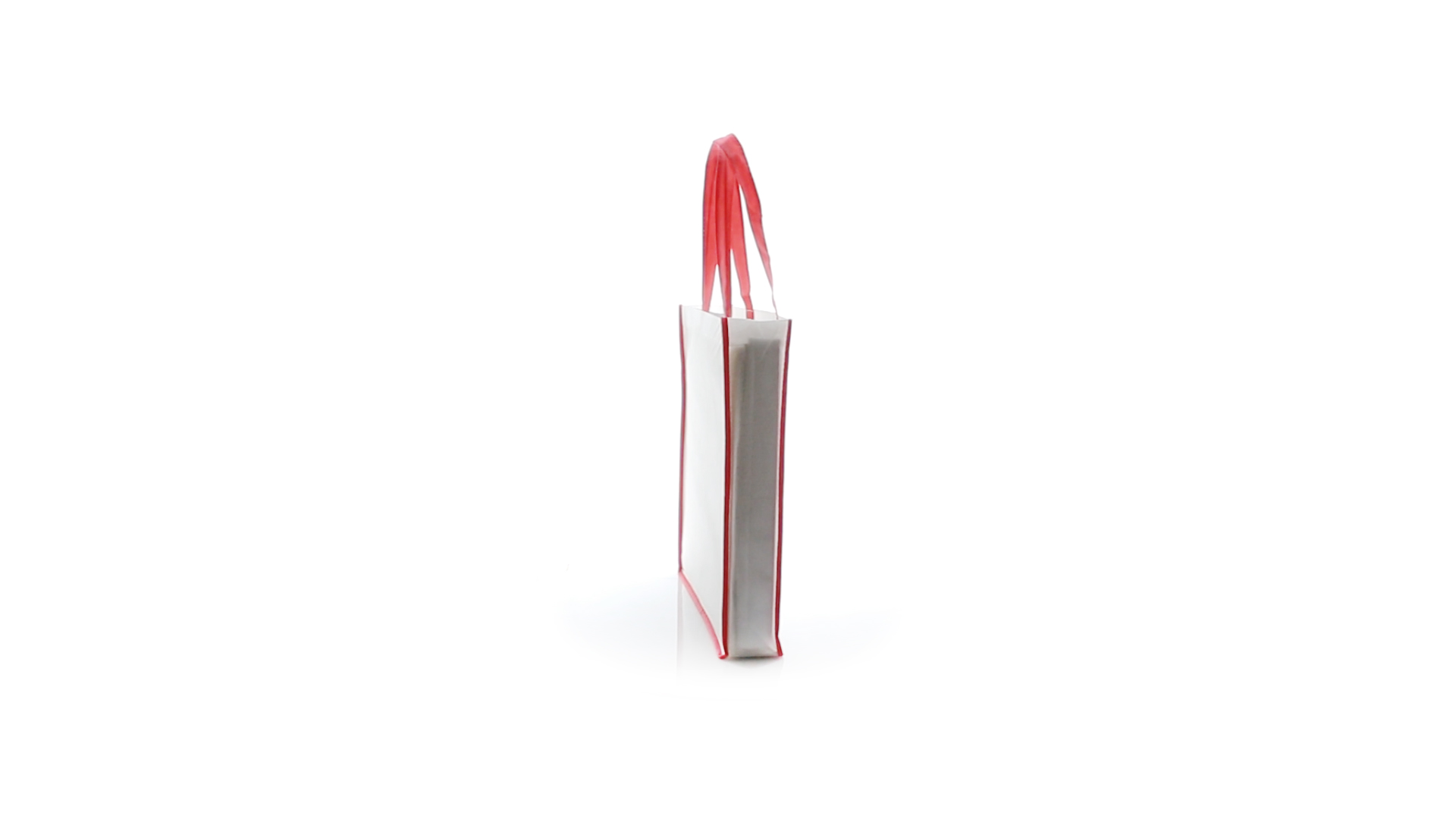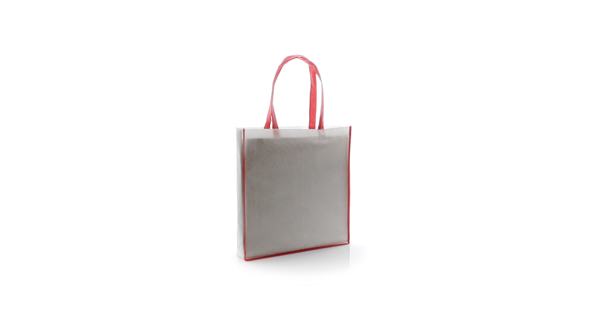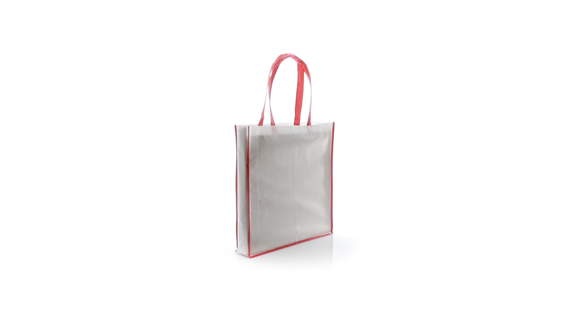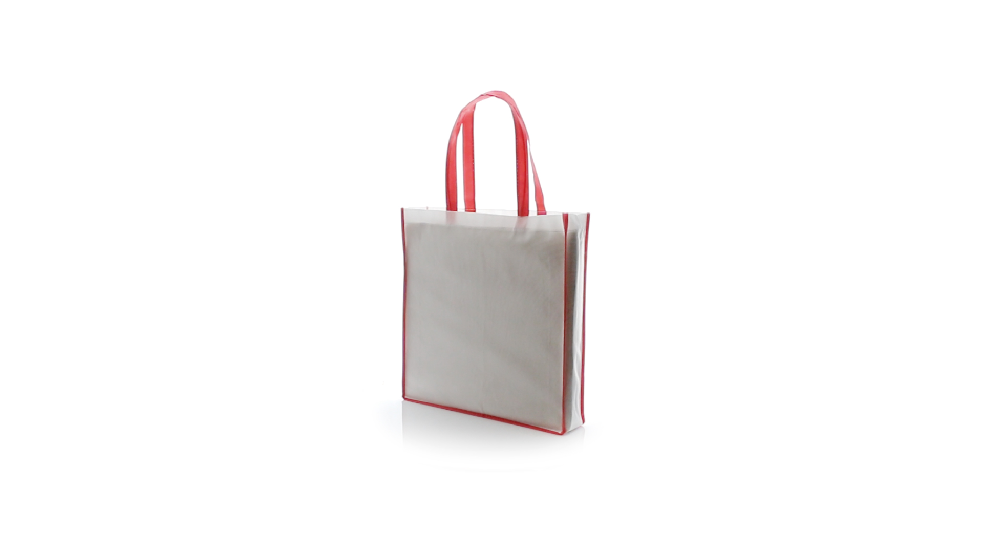 Non-Woven-Tasche aus Faservlies (90 g/m2) in Weiss mit Paspel und Griffen in verschiedenen kräftigen Farben. Mit mittellangen, verstärkten Henkeln von 53 cm Länge, verstärktem Zwickel sowie farblich passender Paspel und Steppnähten. Belastbar mit bis zu 9 kg.