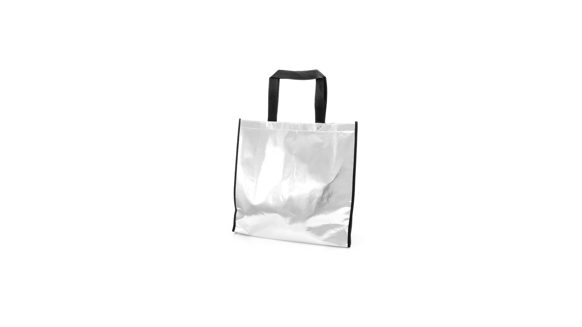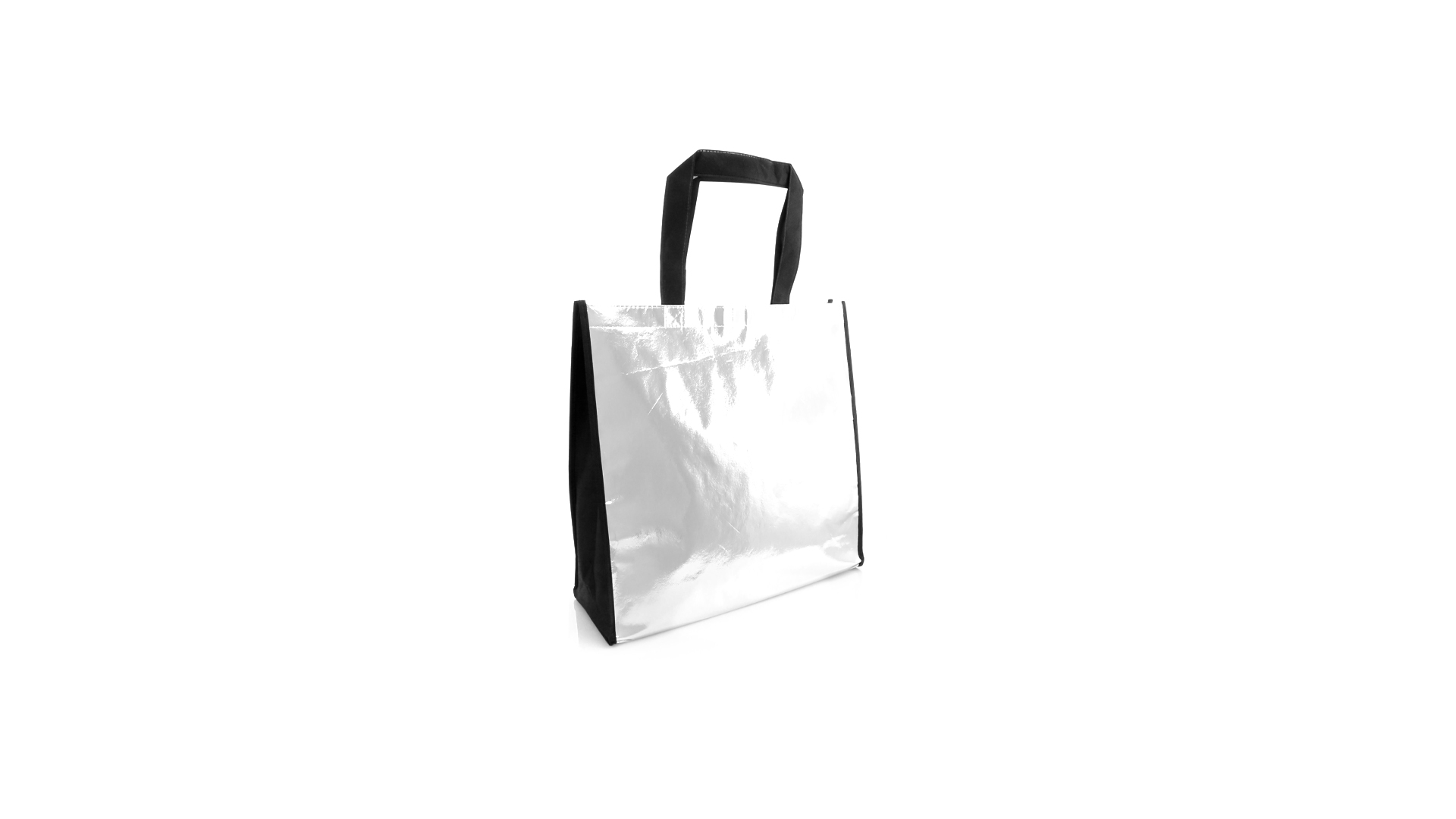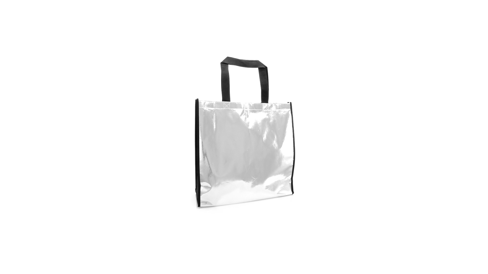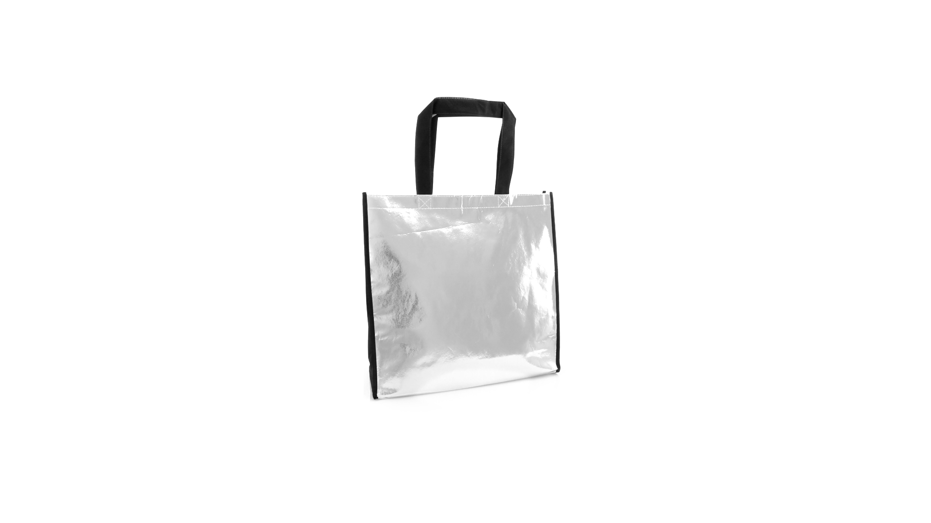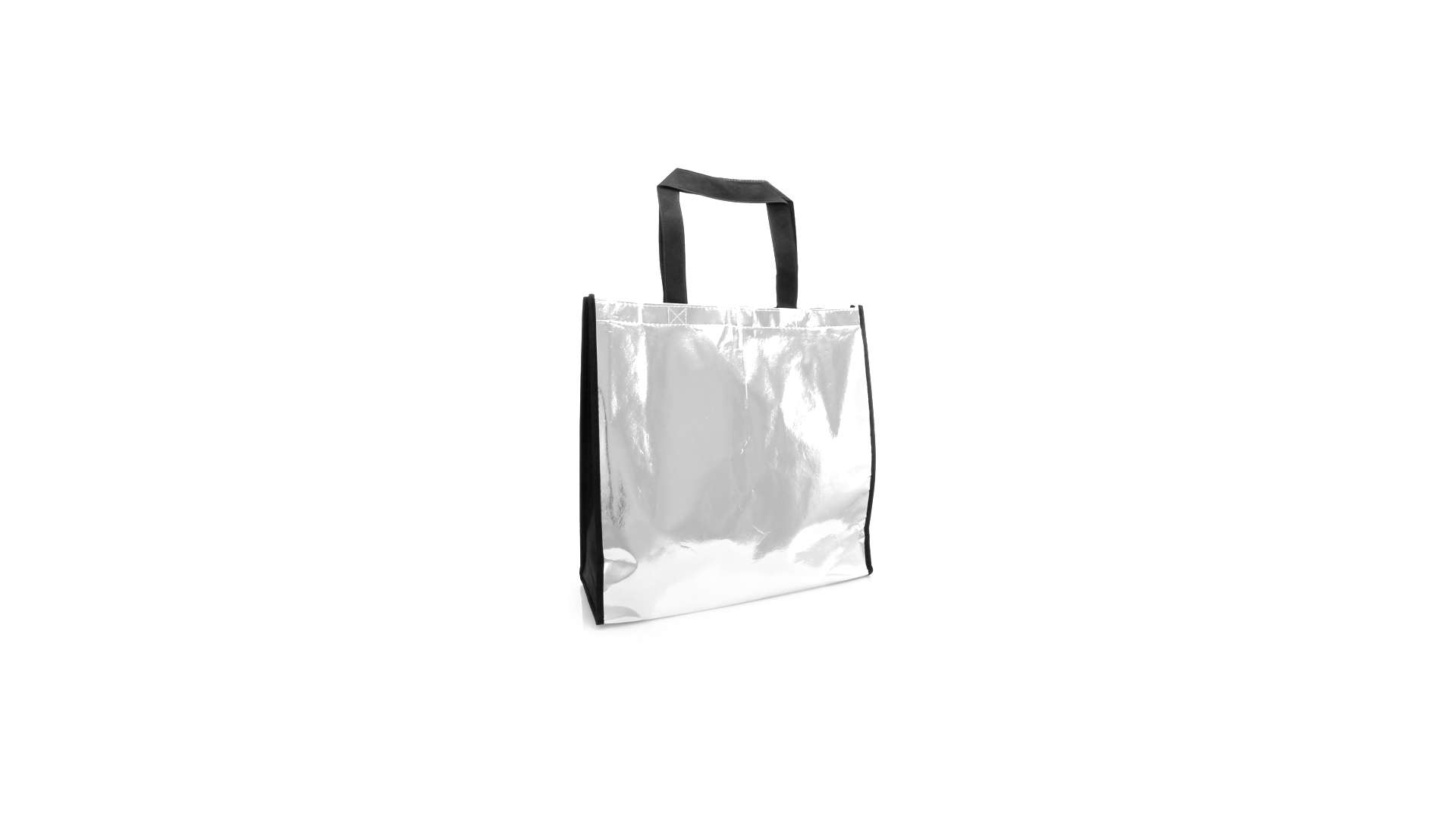 Non-Woven-Tasche aus laminiertem Faservlies (120 g/m2) in Metallic-Ausführung. Tasche in Silber mit Henkeln und Zwickel in einer Vielzahl von kräftigen Farben. Mit 55 cm langen, verstärkten Henkeln sowie verstärktem Zwickel und Steppnähten. Belastbar mit bis zu 9 kg.