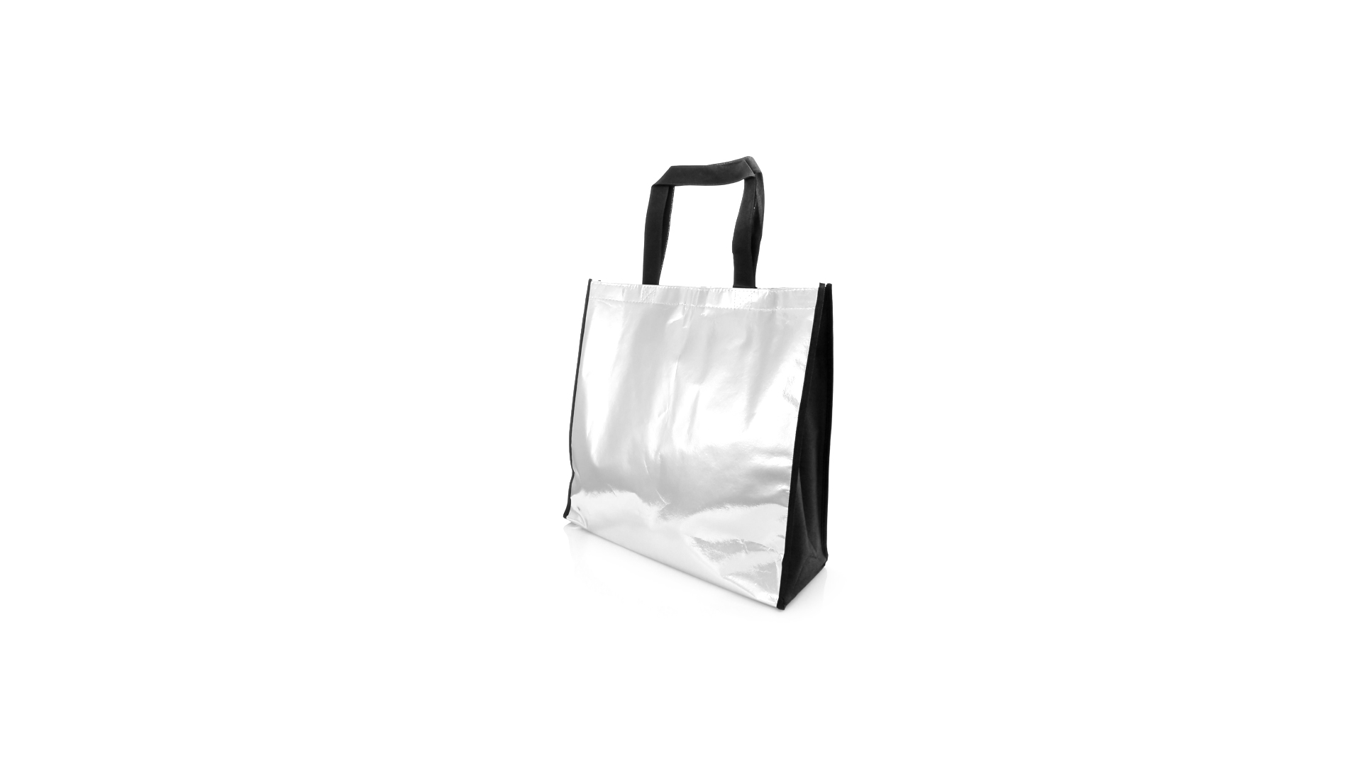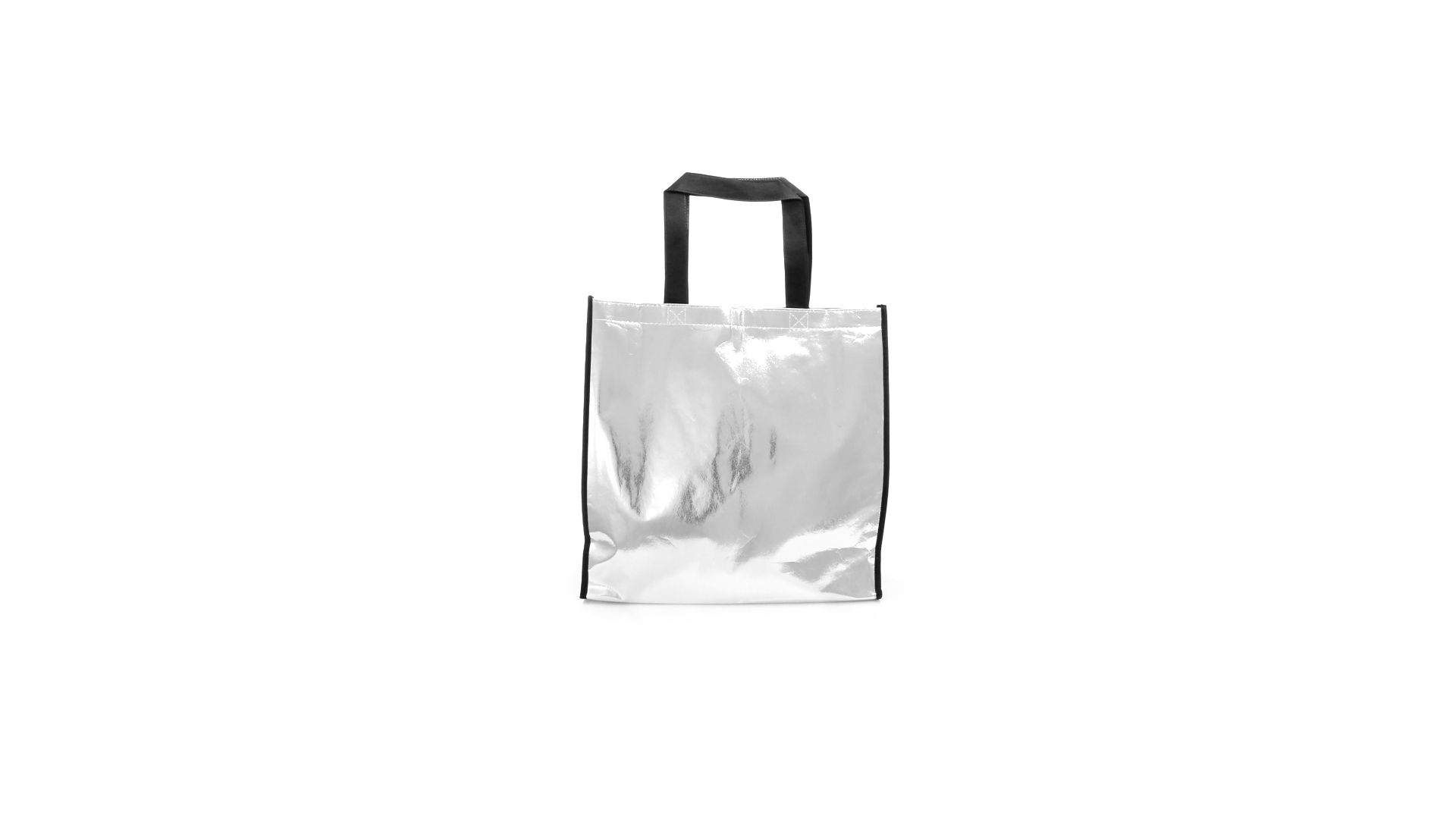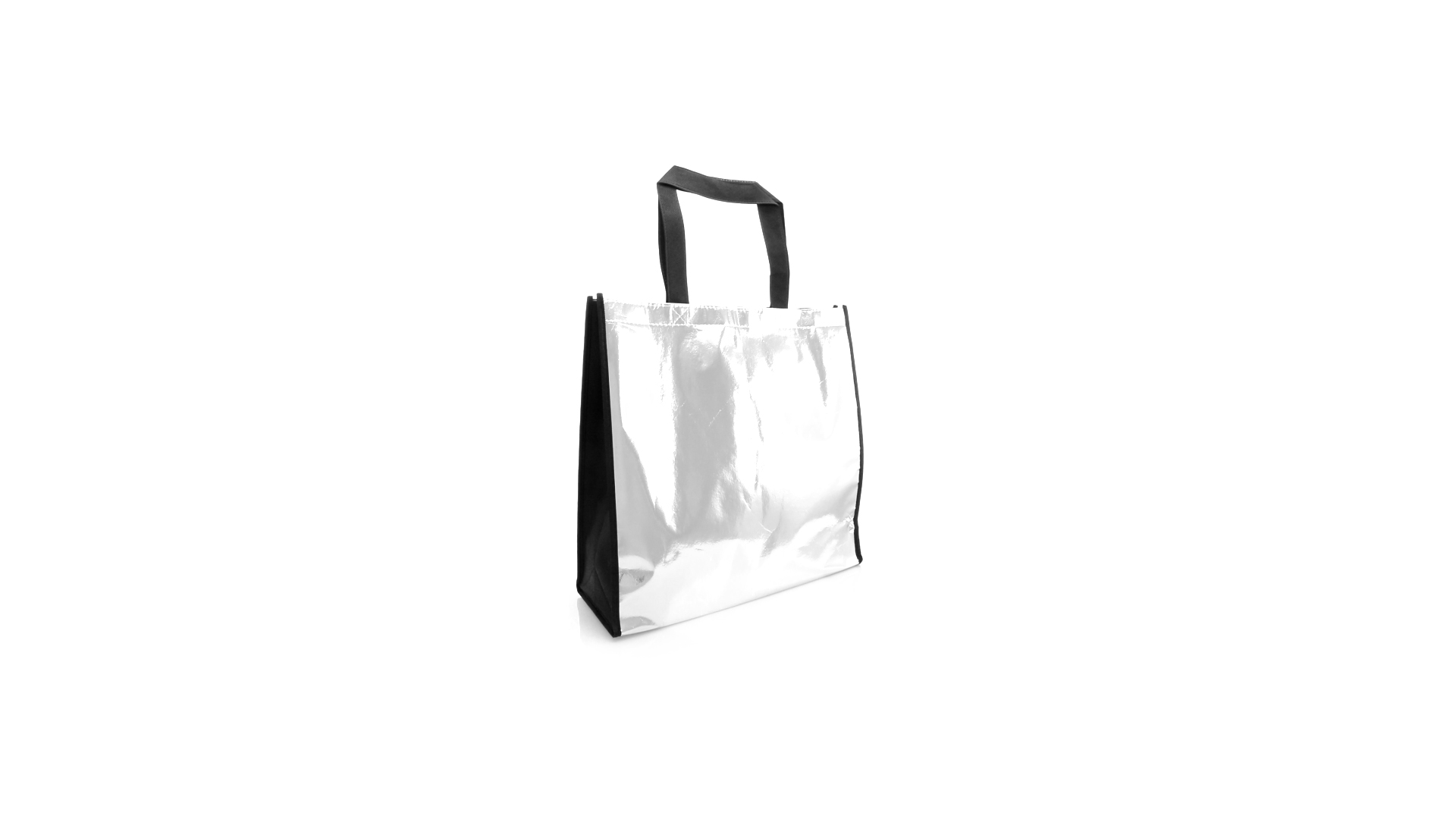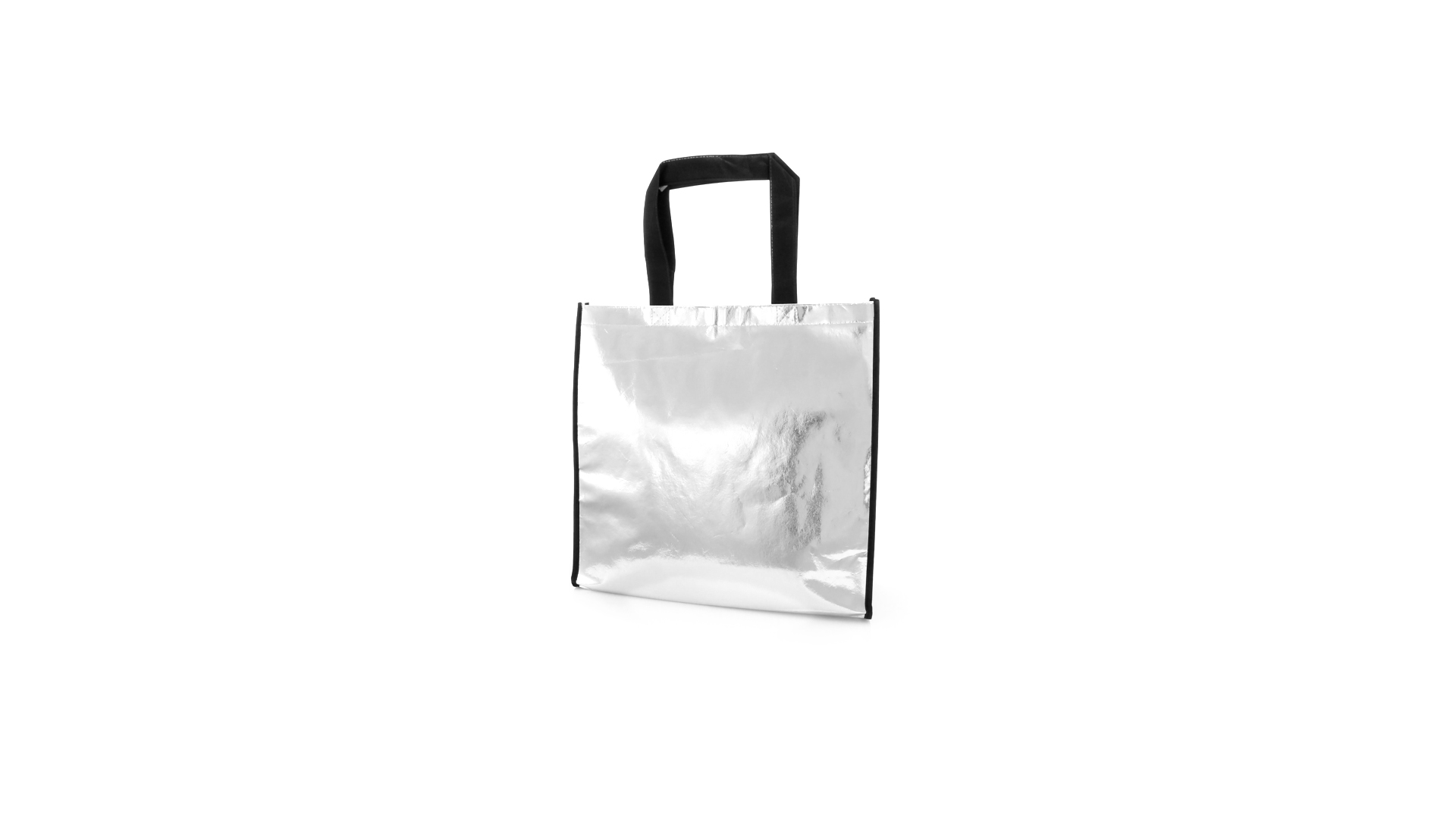 Non-Woven-Tasche aus laminiertem Faservlies (120 g/m2) in Metallic-Ausführung. Tasche in Silber mit Henkeln und Zwickel in einer Vielzahl von kräftigen Farben. Mit 55 cm langen, verstärkten Henkeln sowie verstärktem Zwickel und Steppnähten. Belastbar mit bis zu 9 kg.