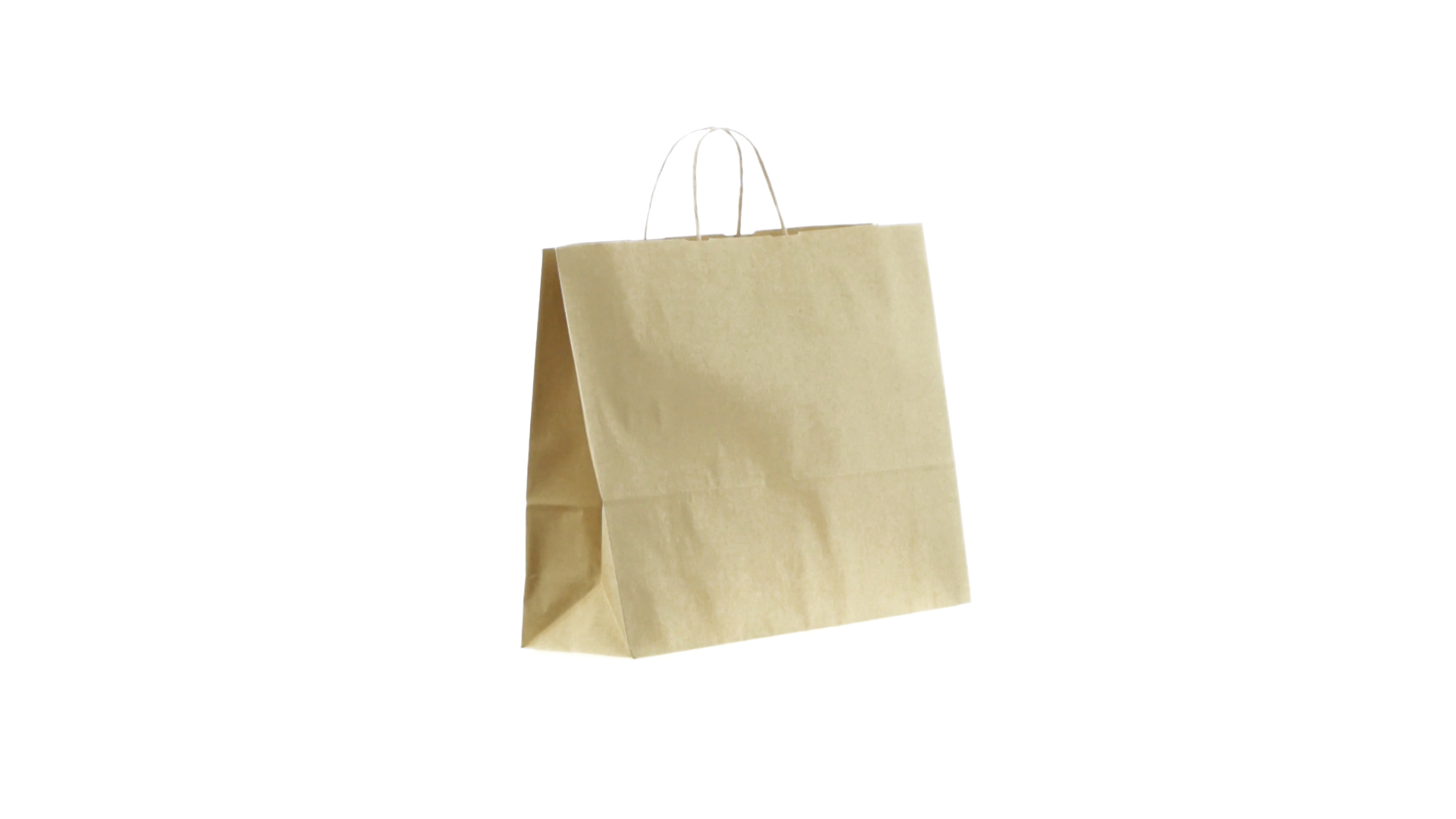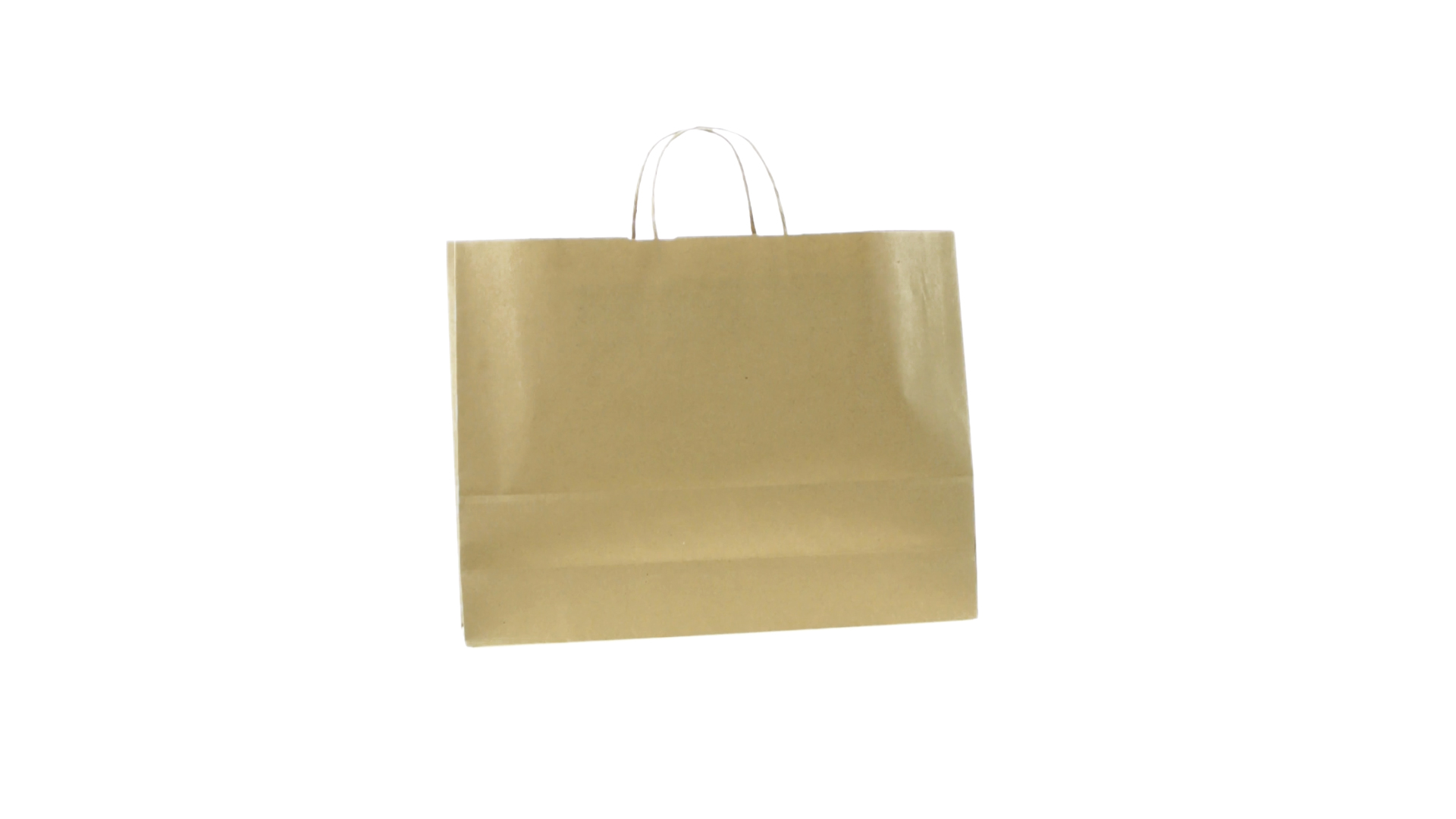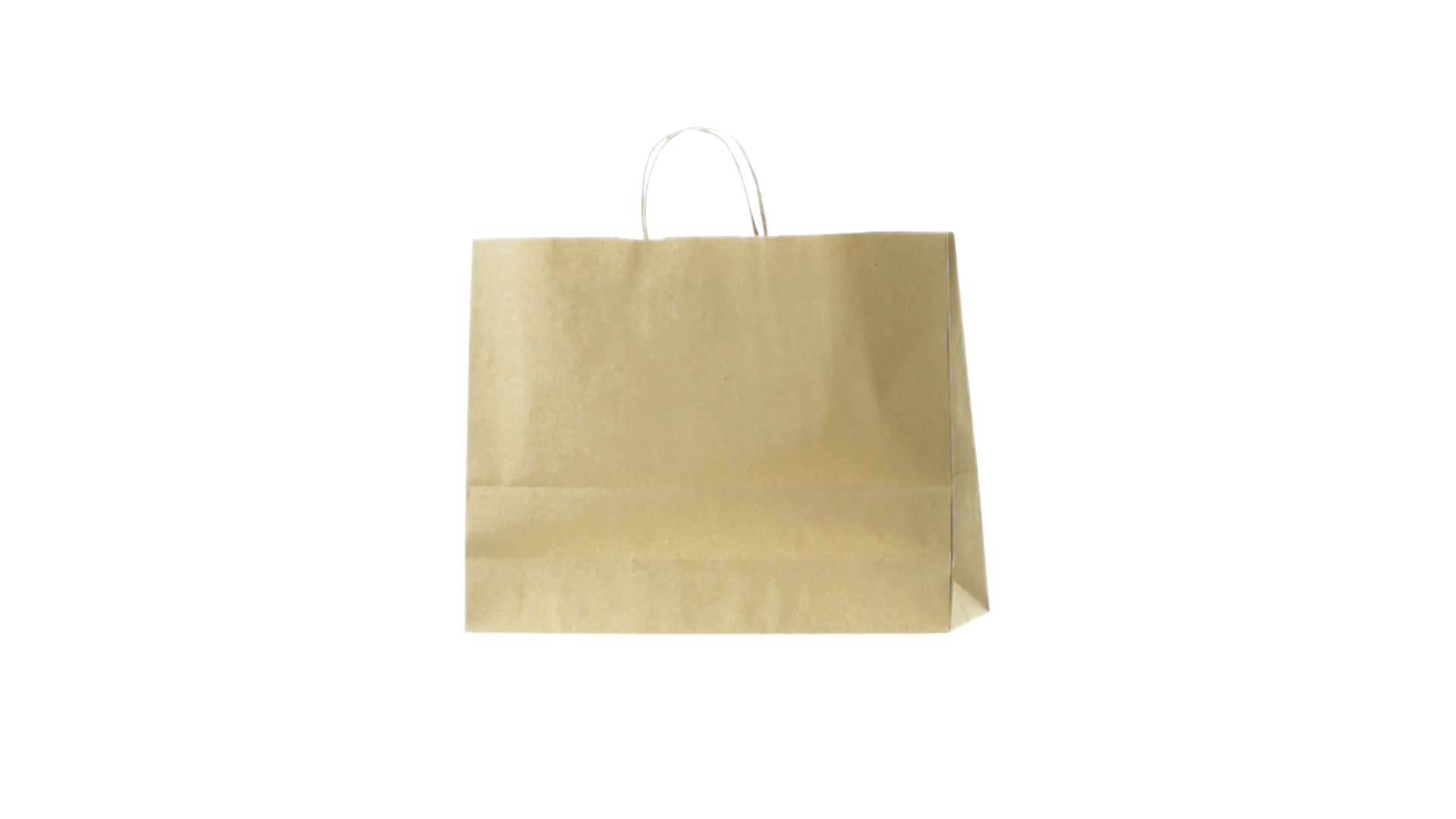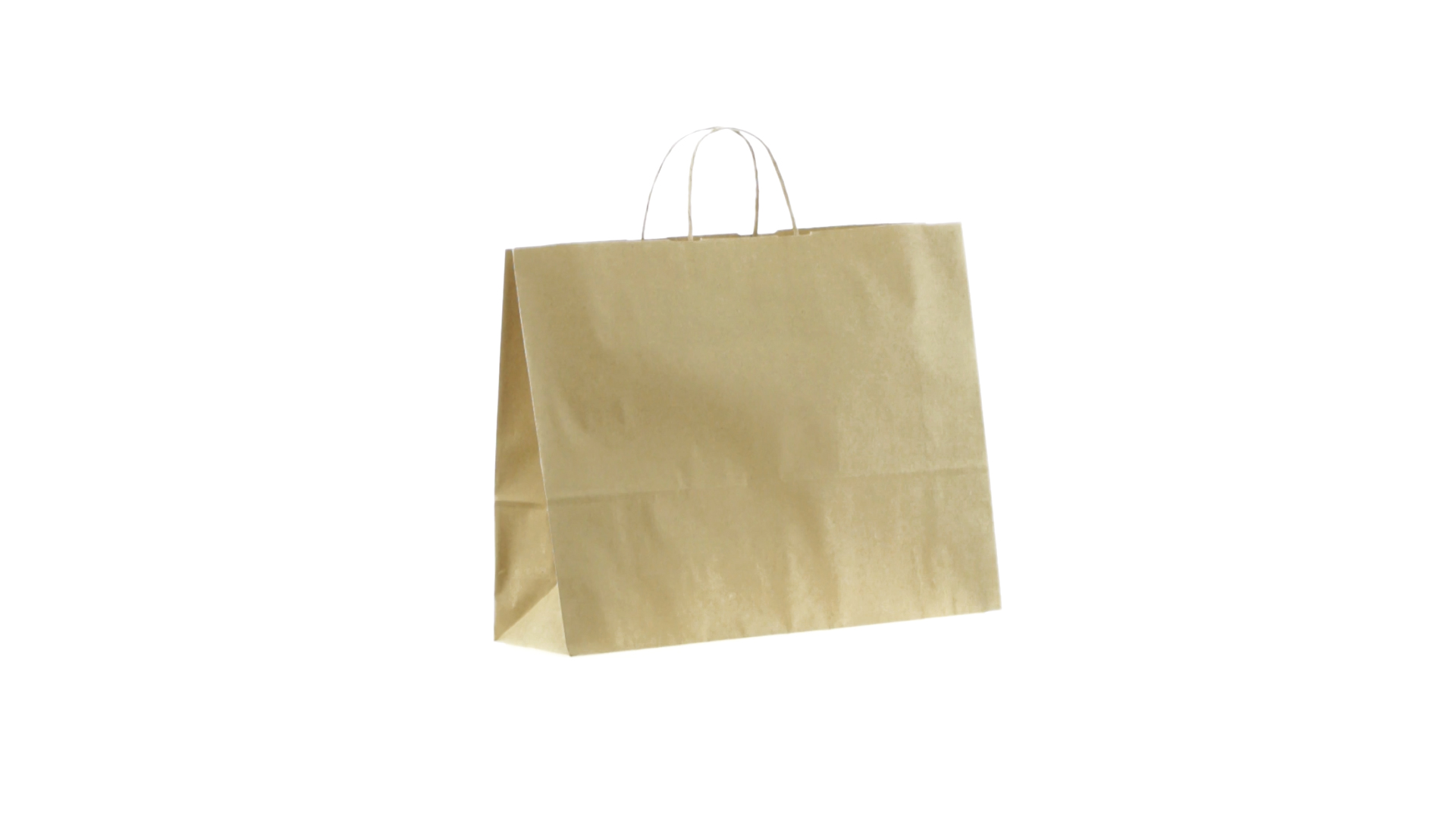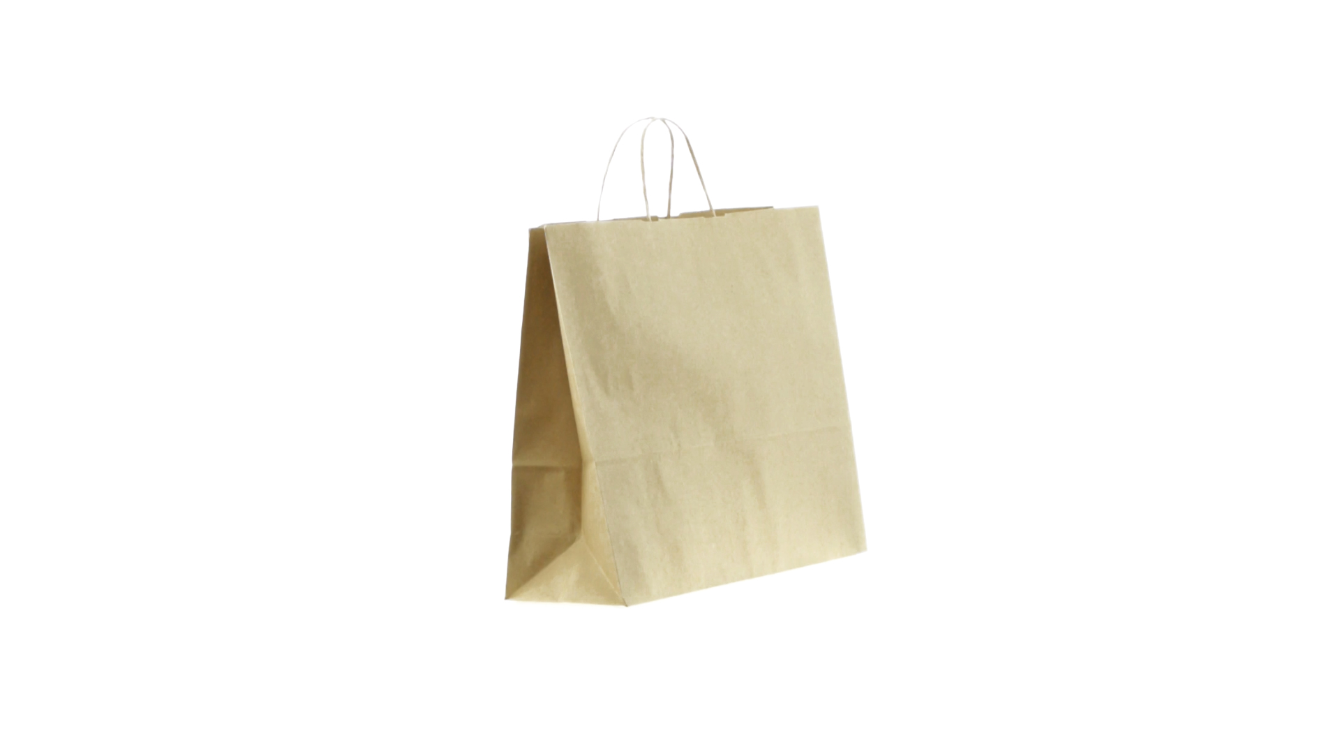 Tüte aus Papier (100 g/m2) in Naturfarbe mit kurzen, verstärkten Griffen und Zwickel. Belastbar mit bis zu 7 kg.