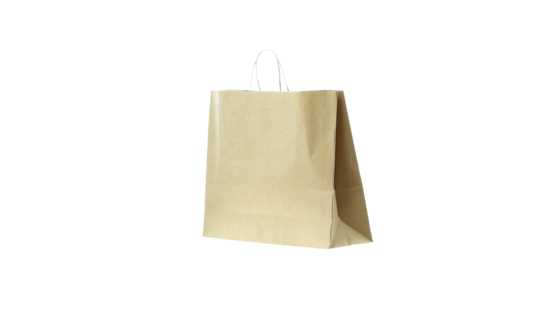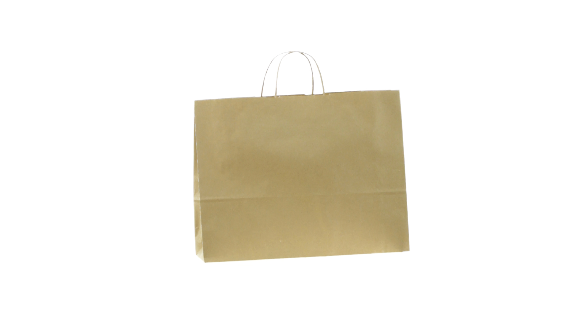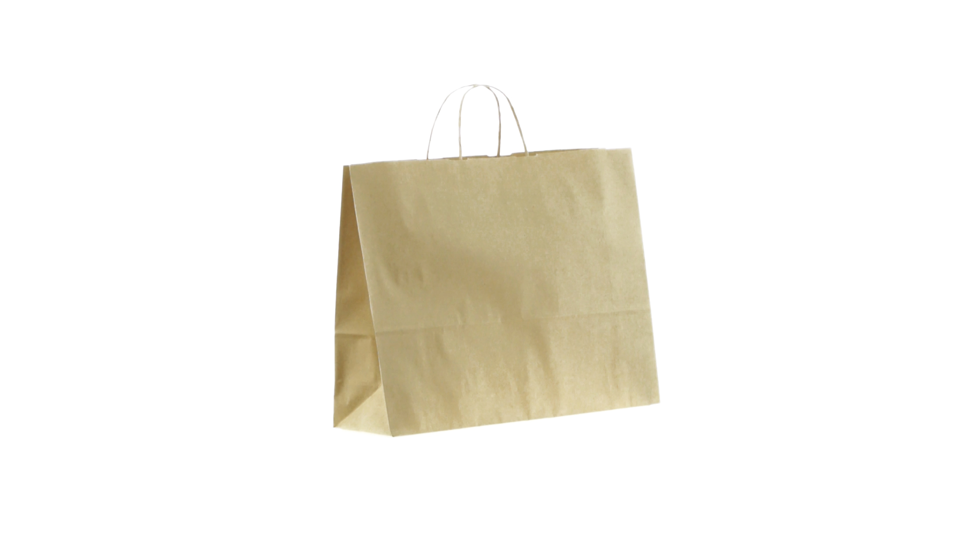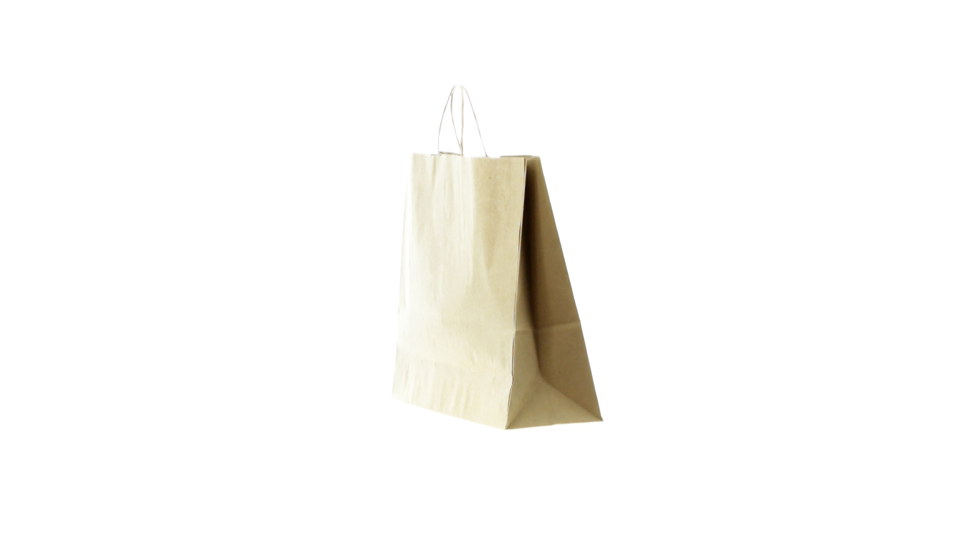 Tüte aus Papier (100 g/m2) in Naturfarbe mit kurzen, verstärkten Griffen und Zwickel. Belastbar mit bis zu 7 kg.