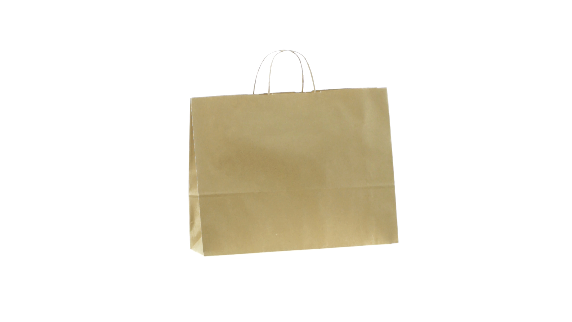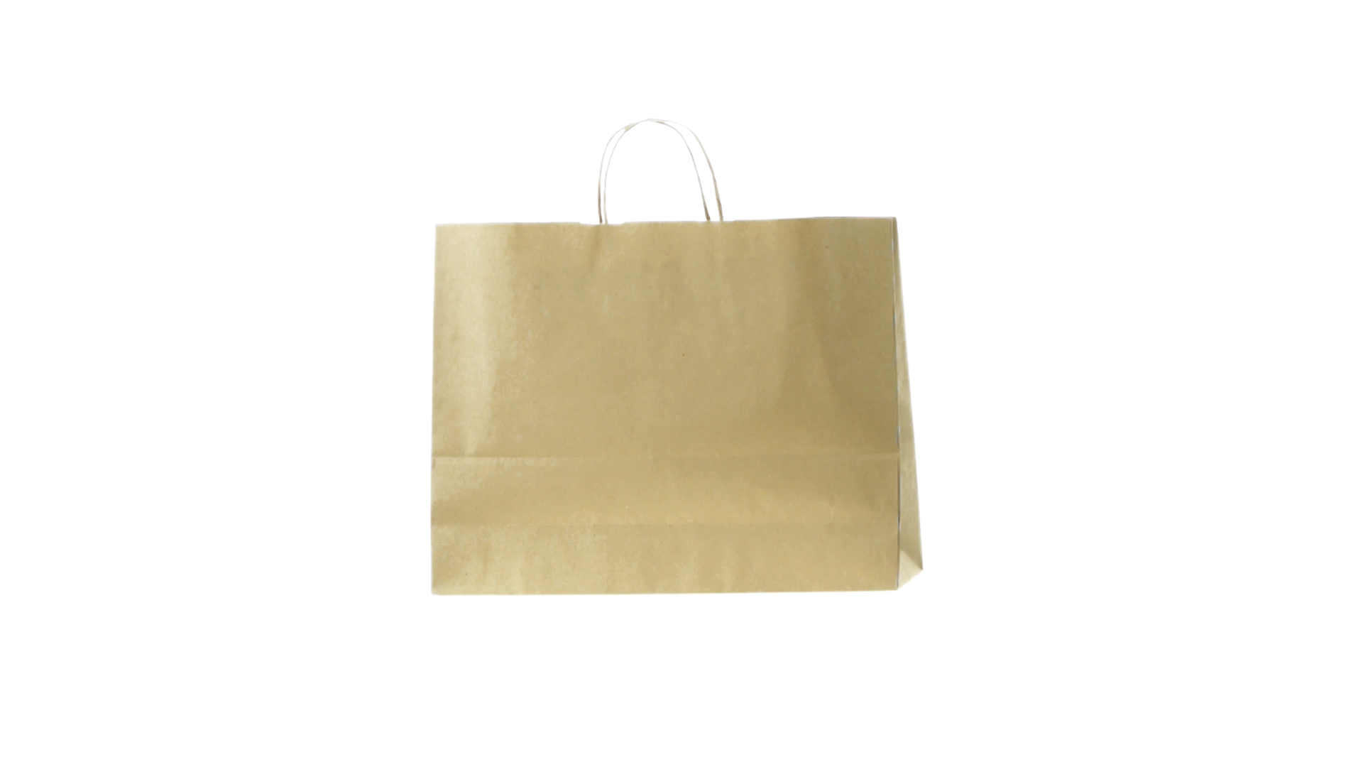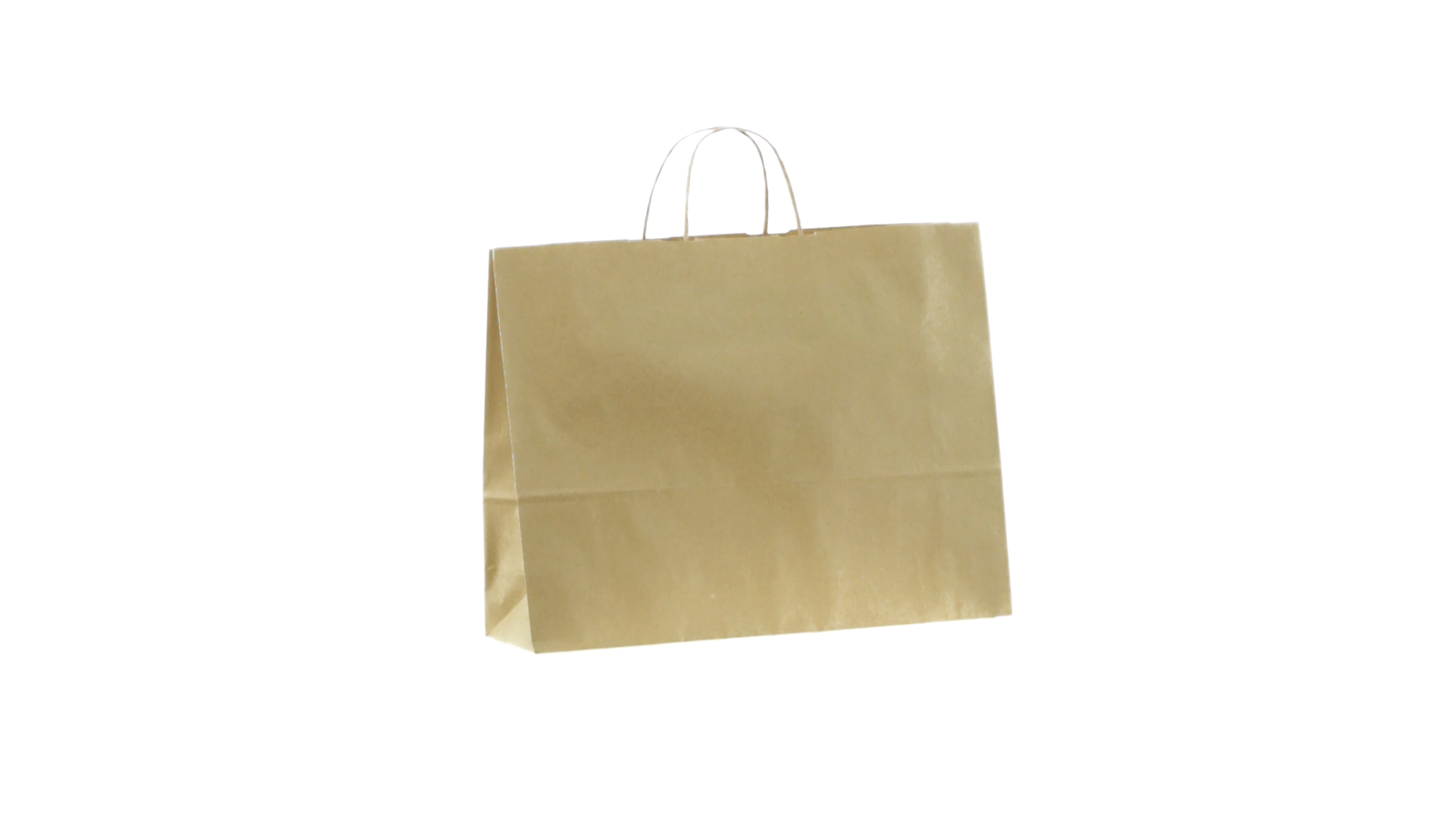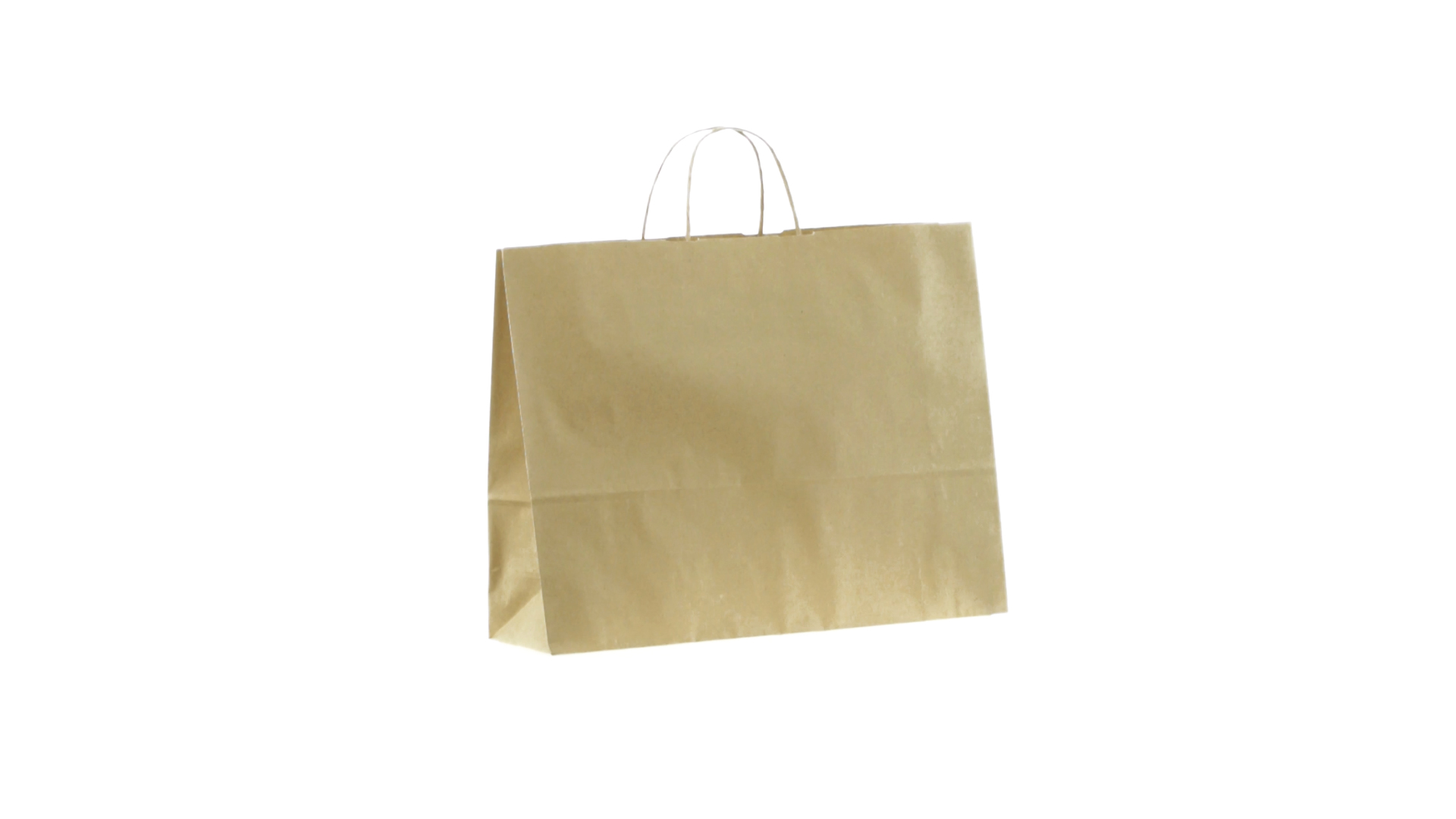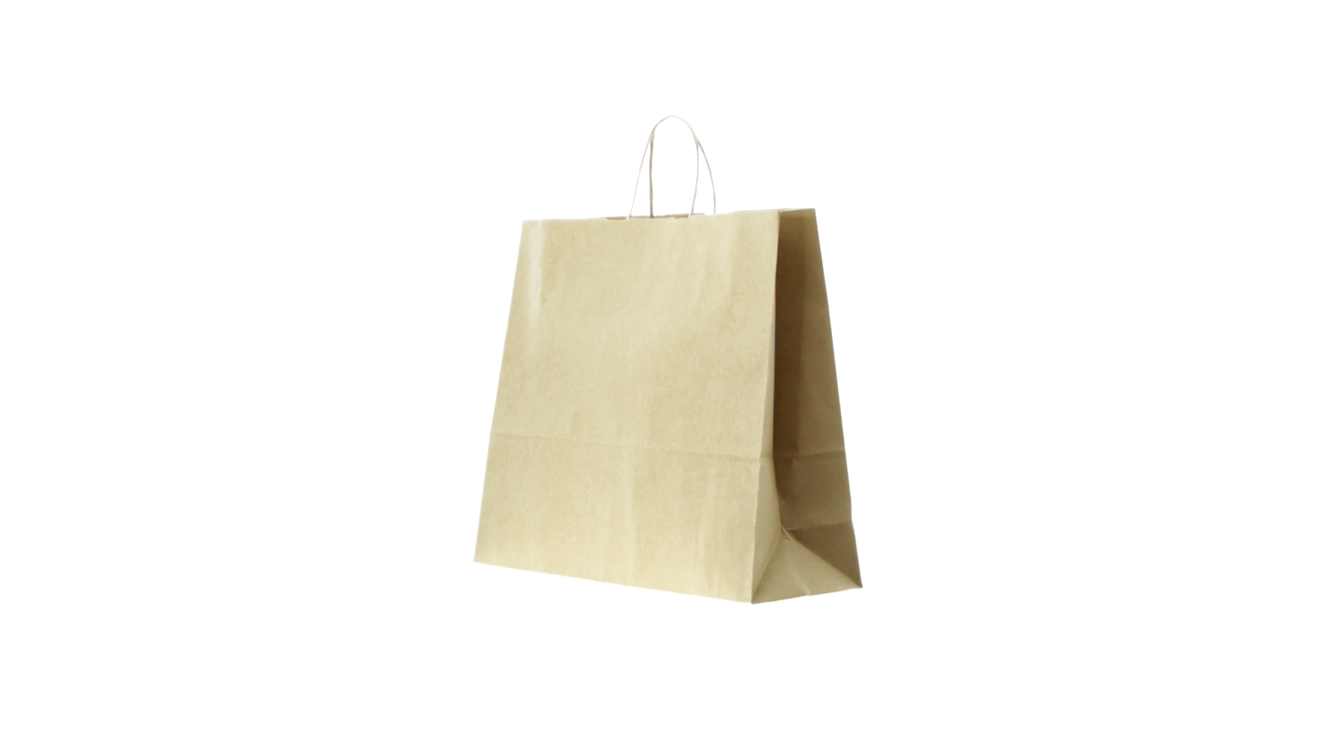 Tüte aus Papier (100 g/m2) in Naturfarbe mit kurzen, verstärkten Griffen und Zwickel. Belastbar mit bis zu 7 kg.