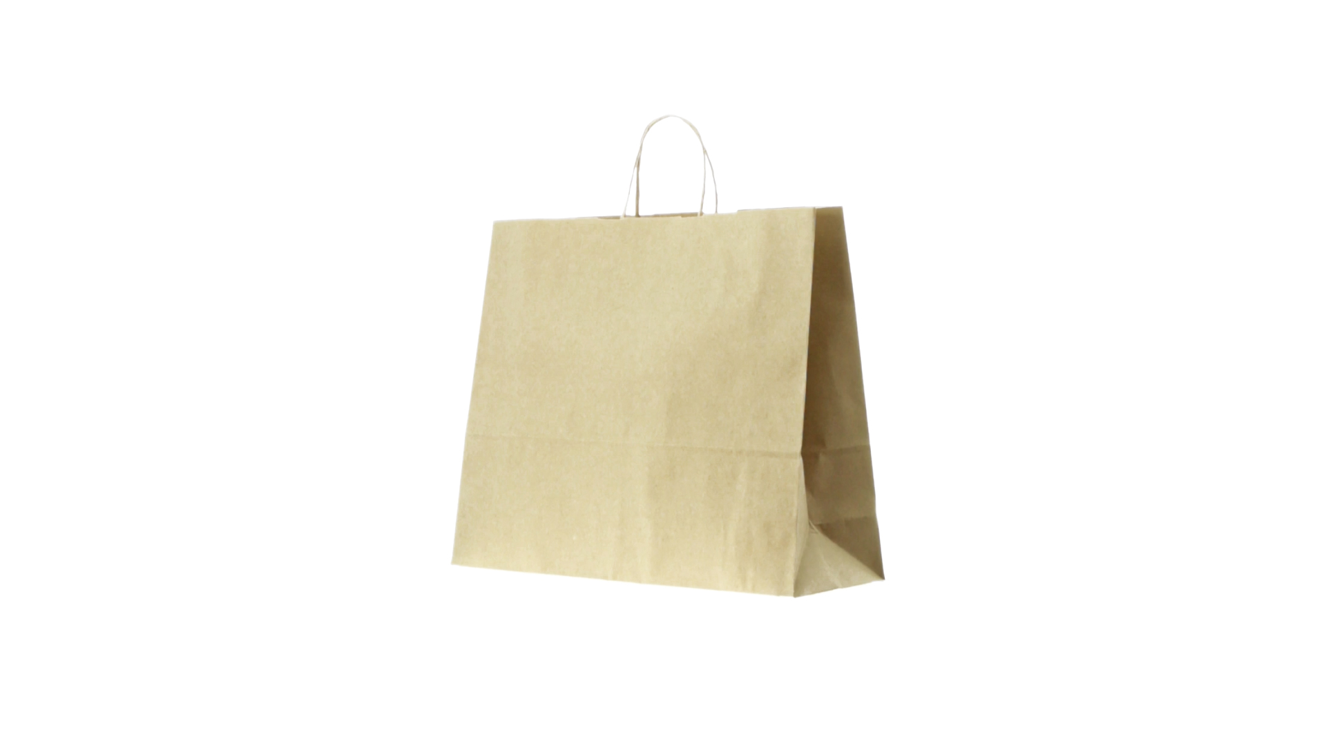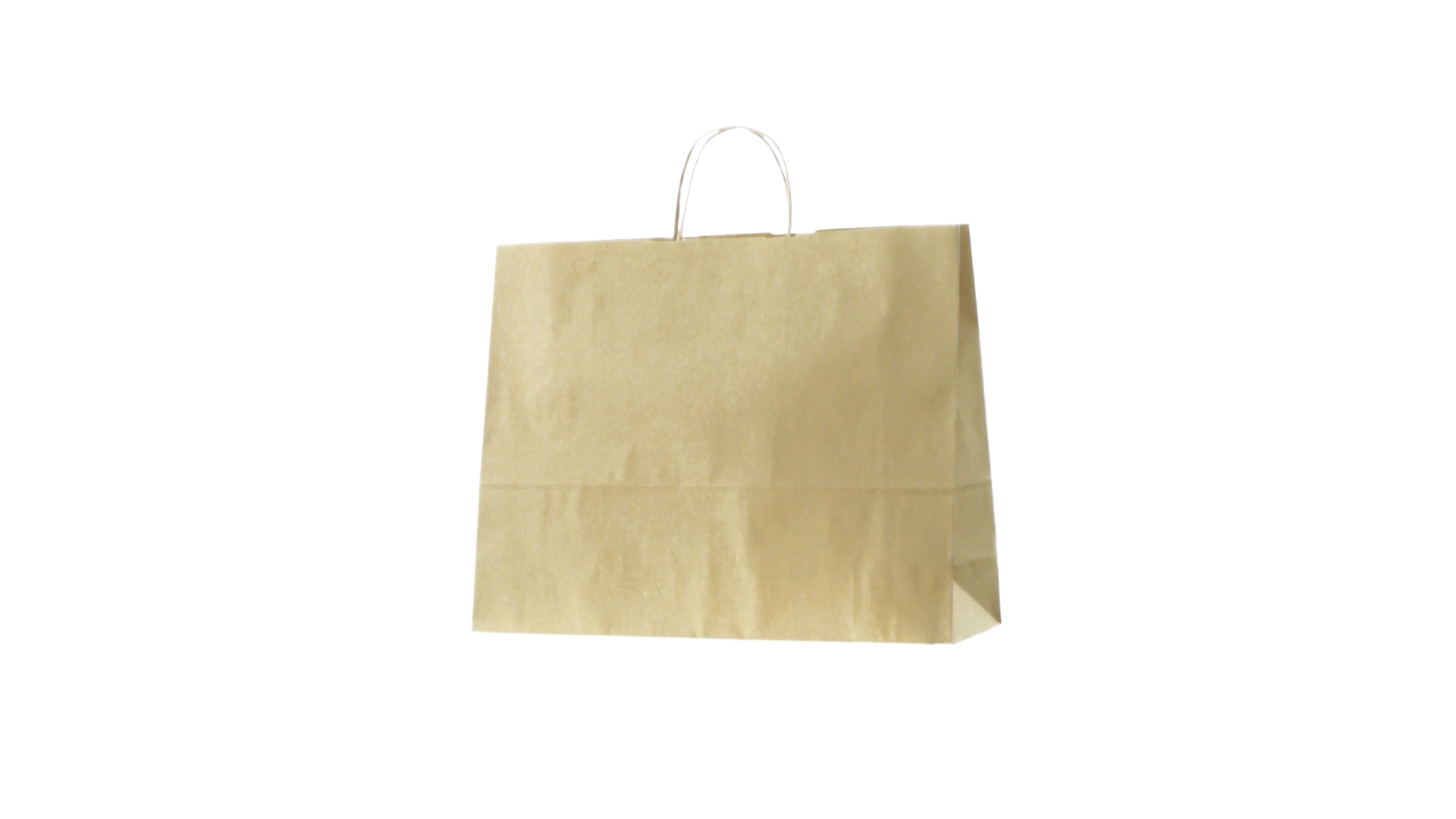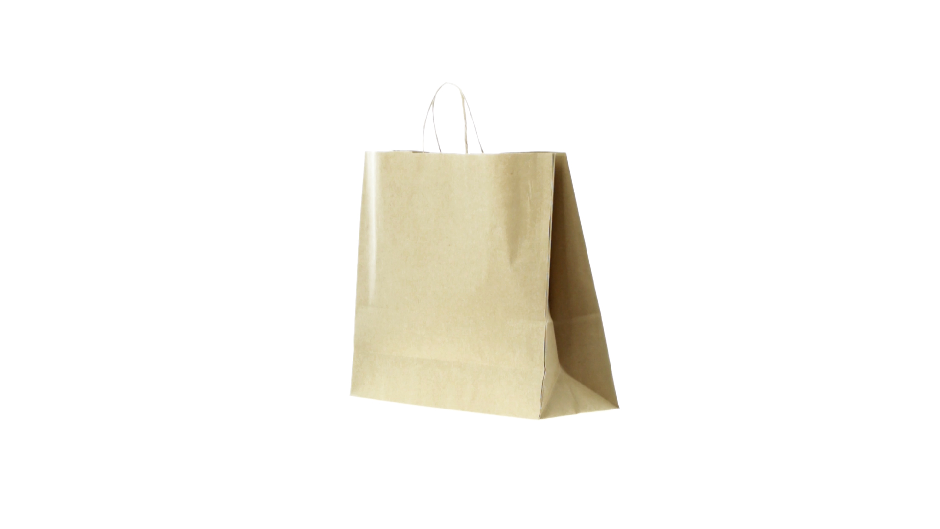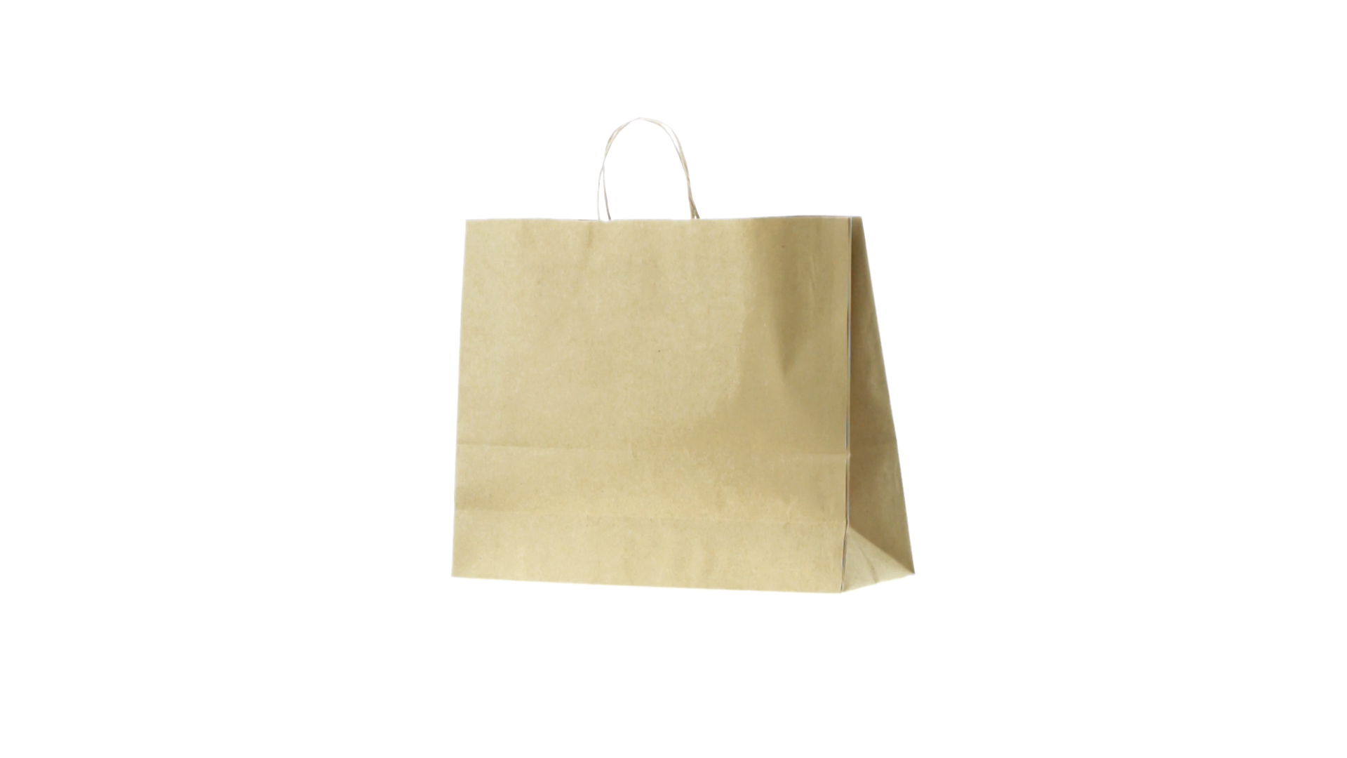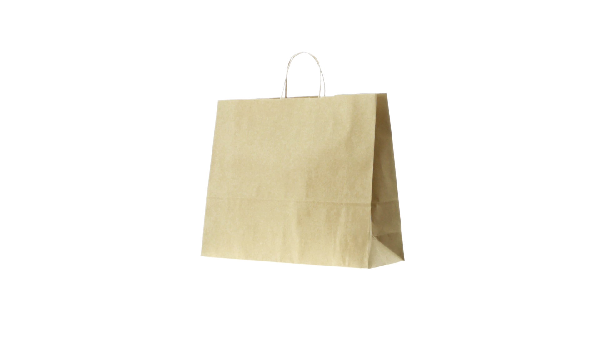 Tüte aus Papier (100 g/m2) in Naturfarbe mit kurzen, verstärkten Griffen und Zwickel. Belastbar mit bis zu 7 kg.