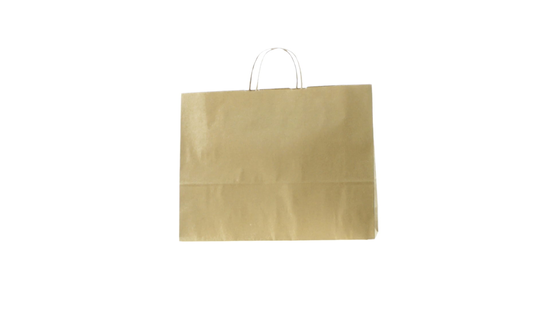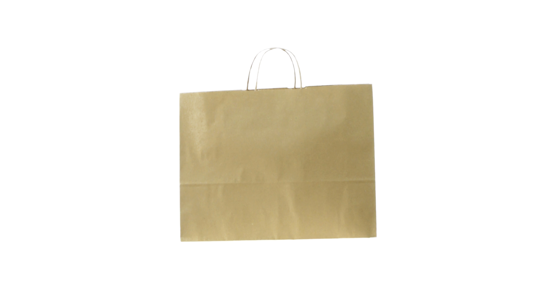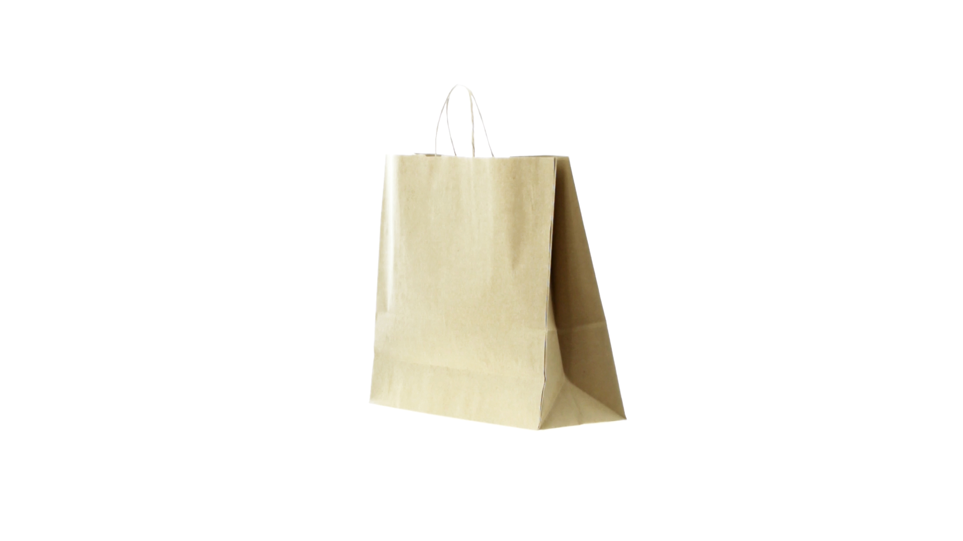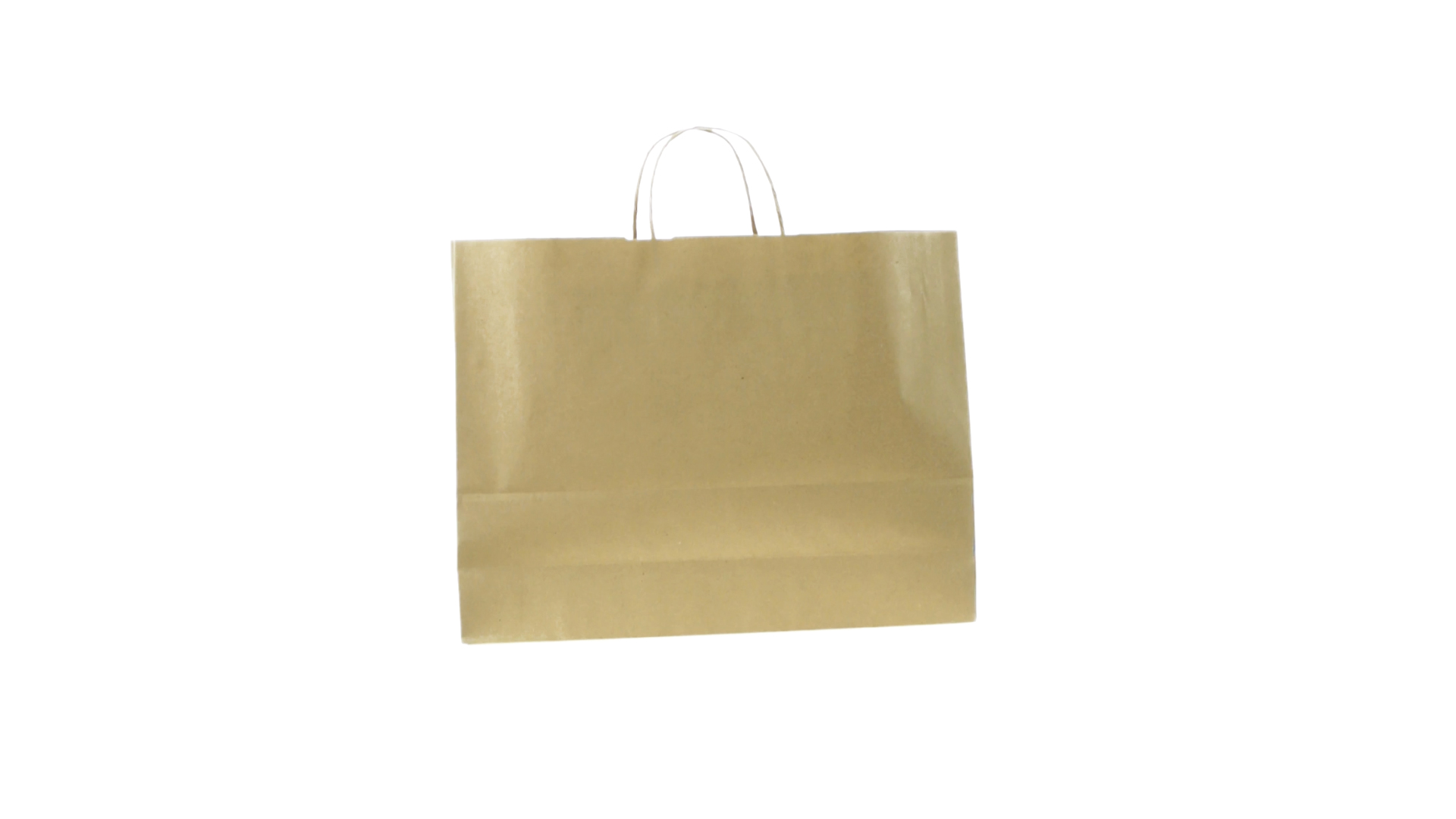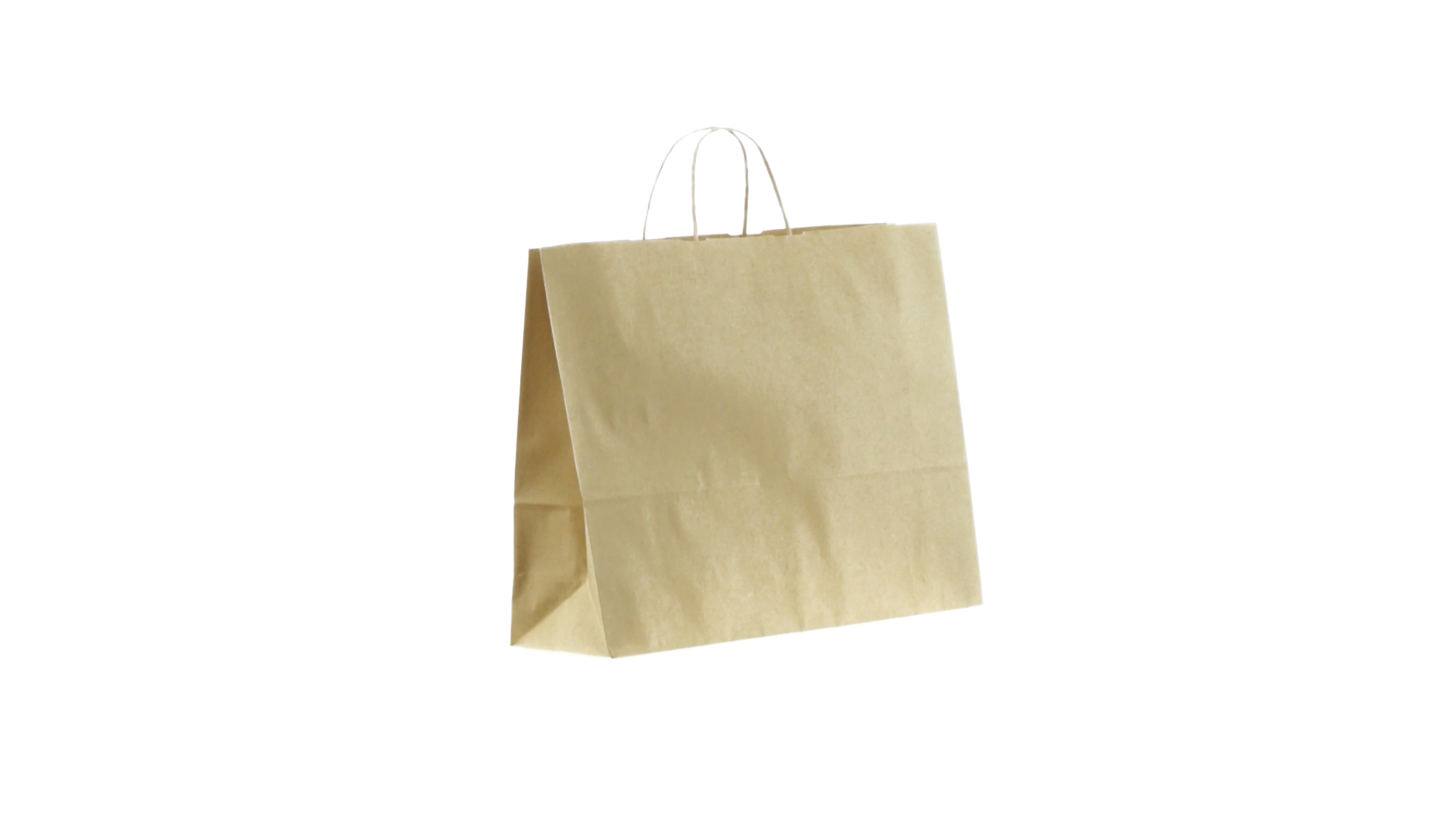 Tüte aus Papier (100 g/m2) in Naturfarbe mit kurzen, verstärkten Griffen und Zwickel. Belastbar mit bis zu 7 kg.