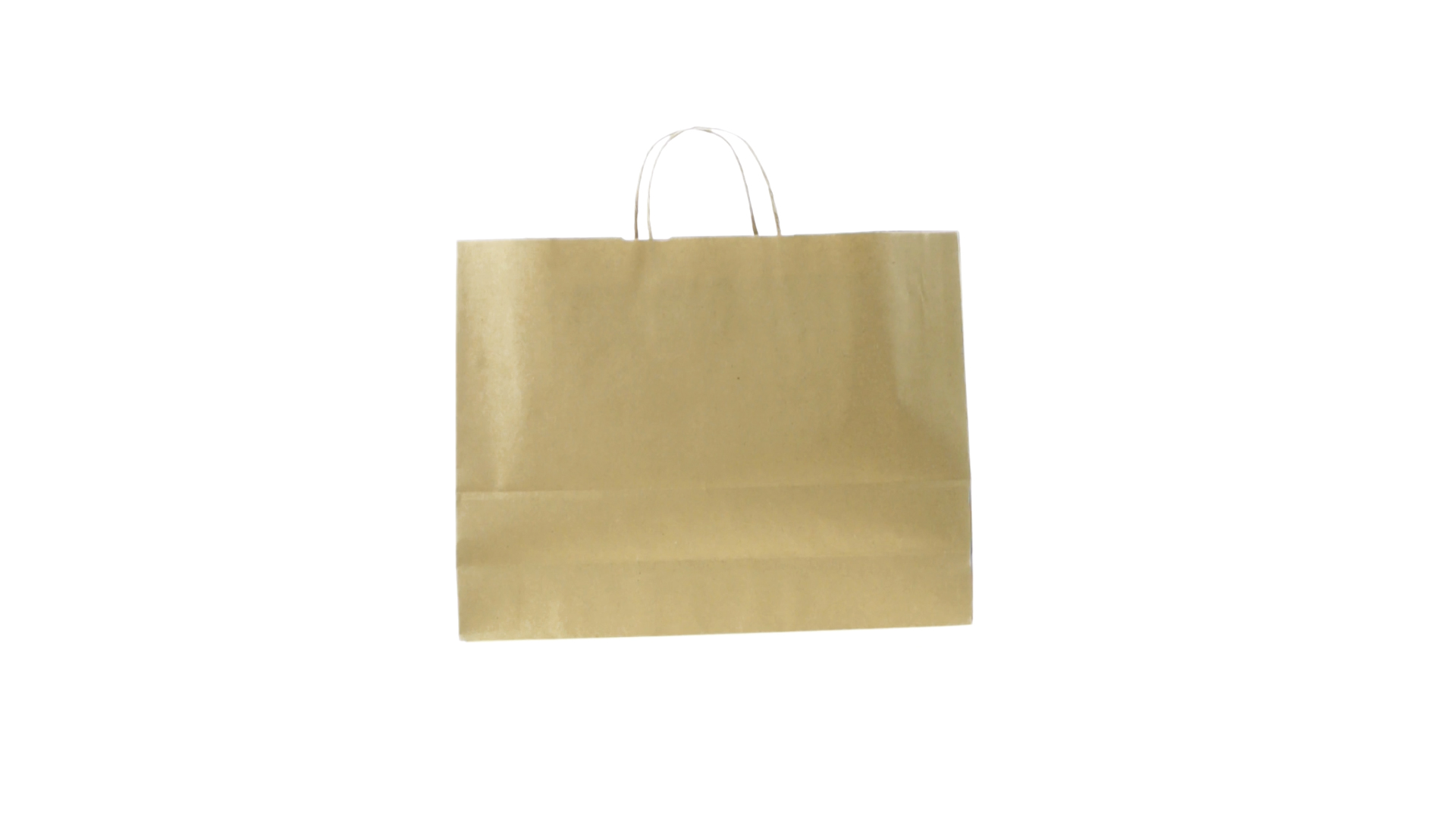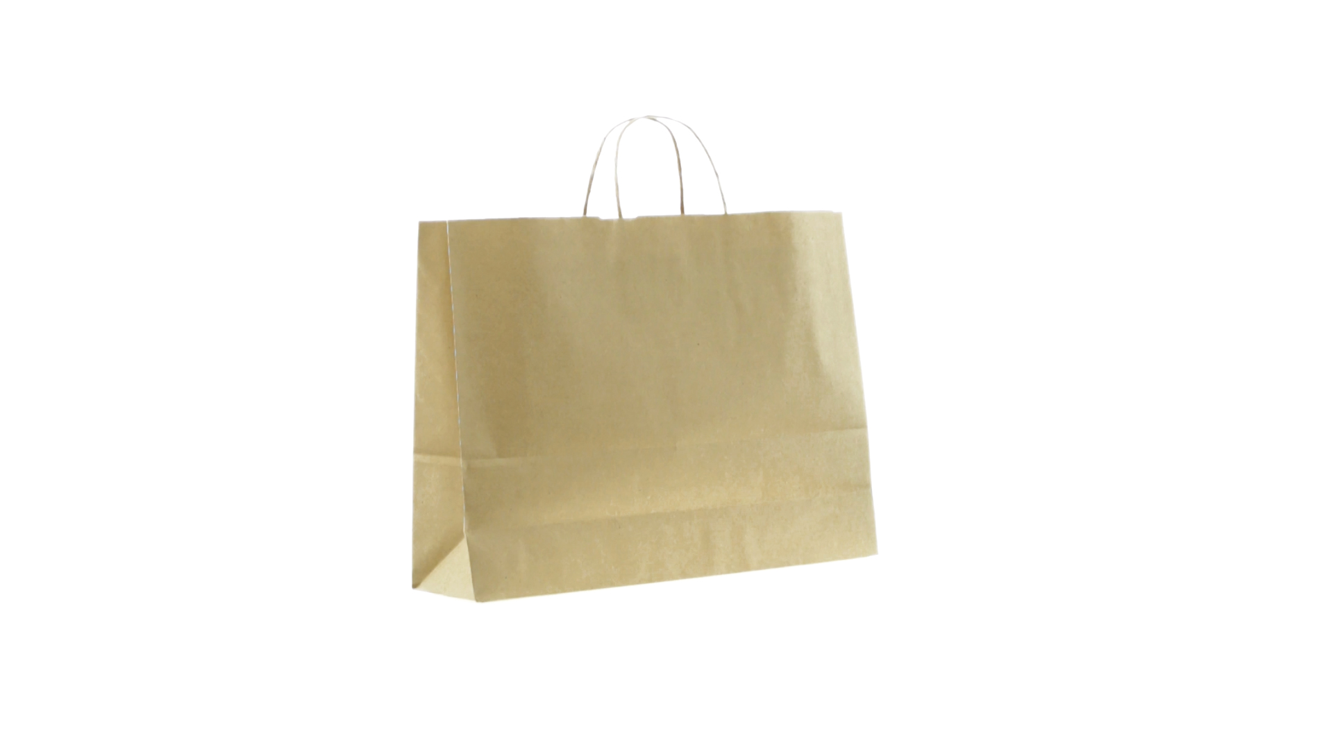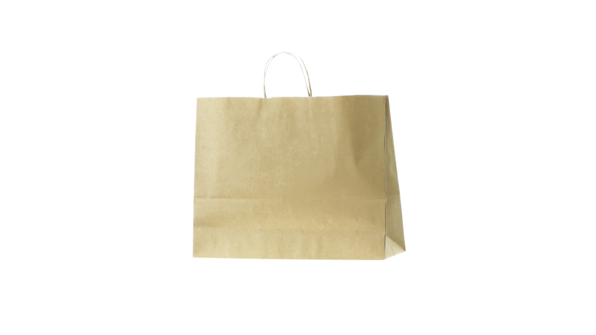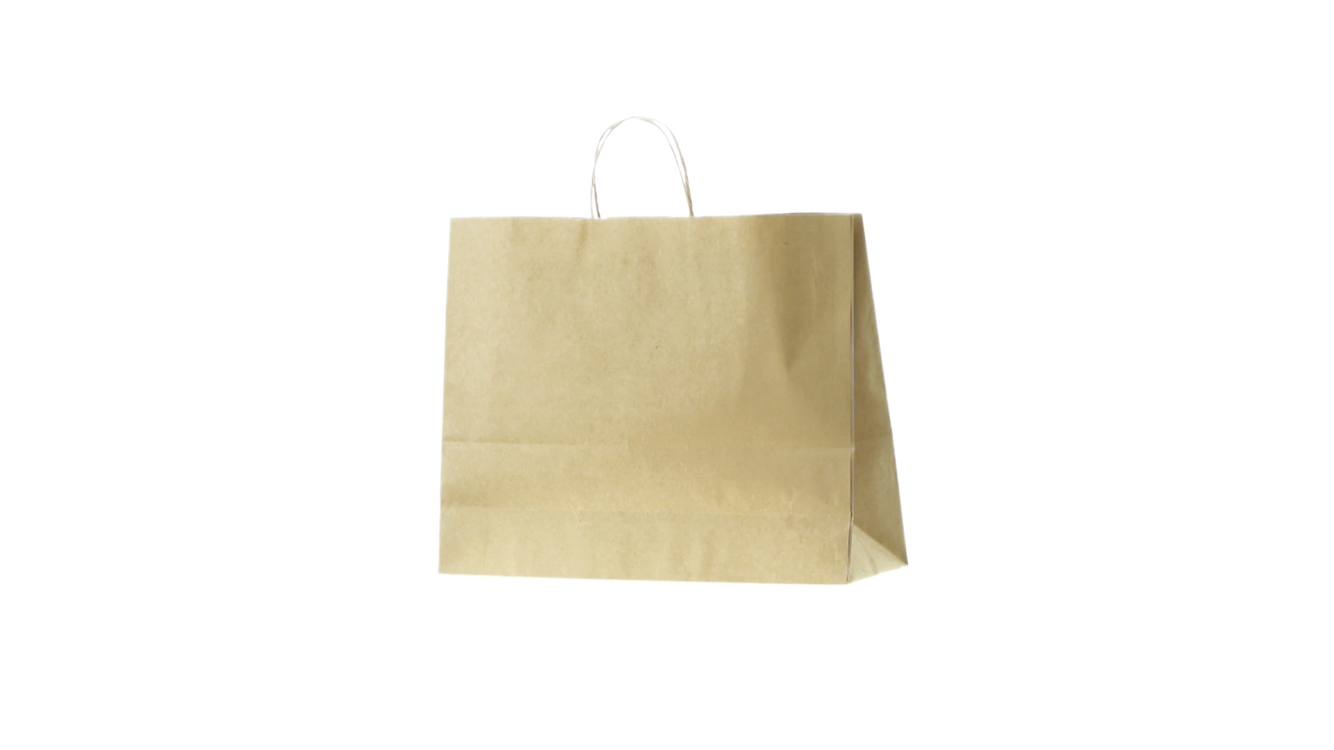 Tüte aus Papier (100 g/m2) in Naturfarbe mit kurzen, verstärkten Griffen und Zwickel. Belastbar mit bis zu 7 kg.