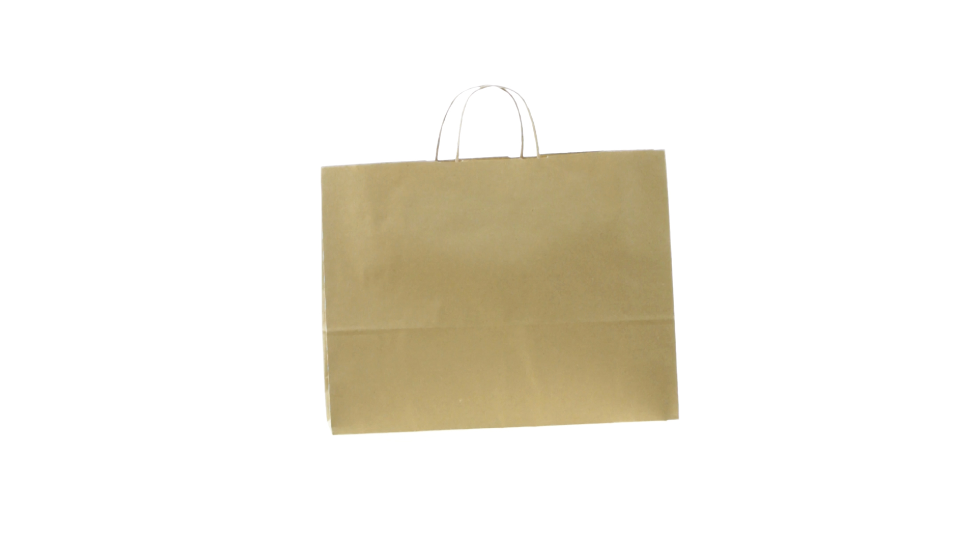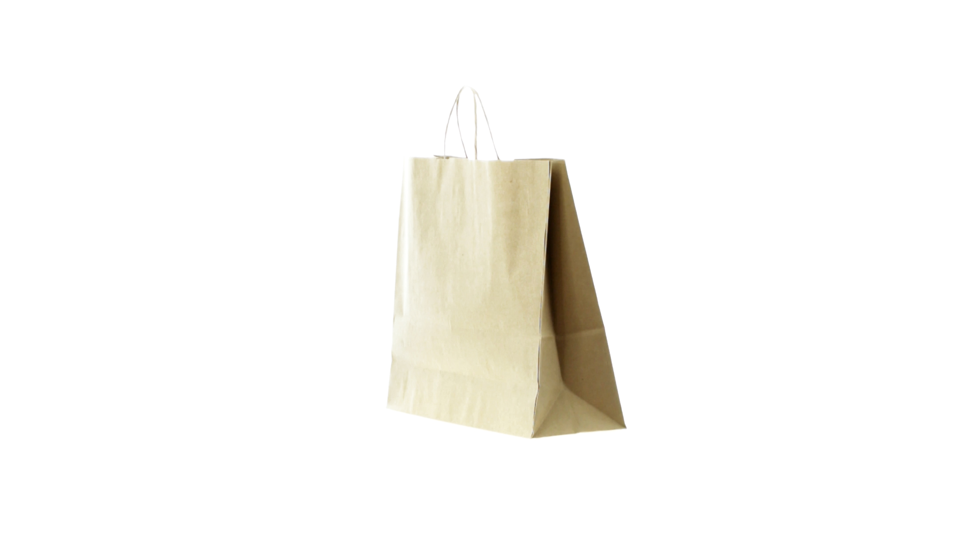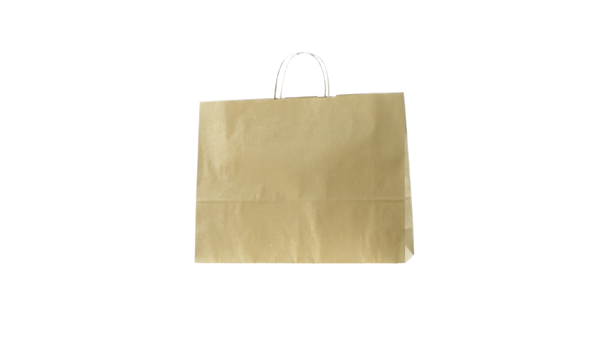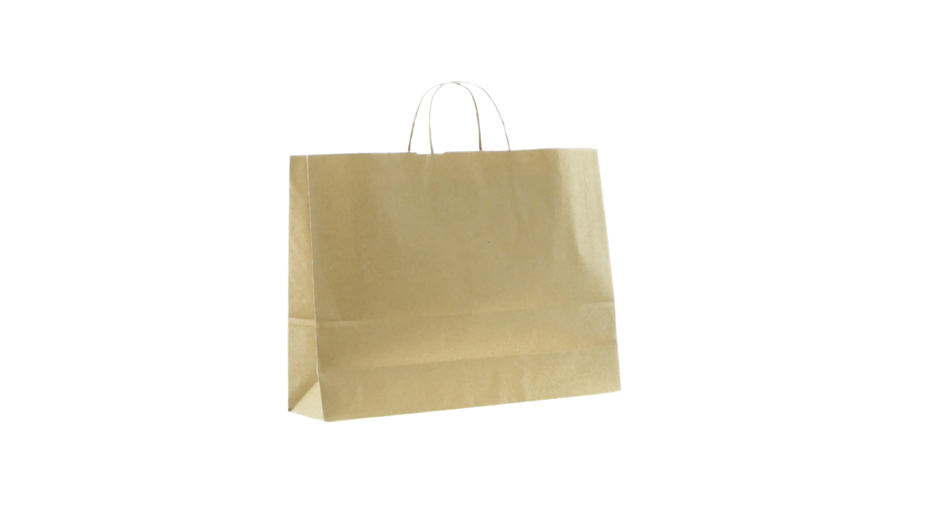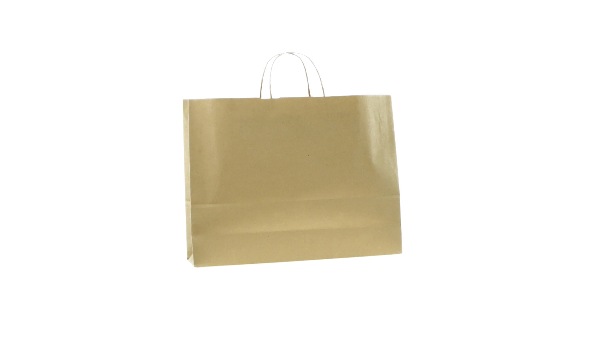 Tüte aus Papier (100 g/m2) in Naturfarbe mit kurzen, verstärkten Griffen und Zwickel. Belastbar mit bis zu 7 kg.