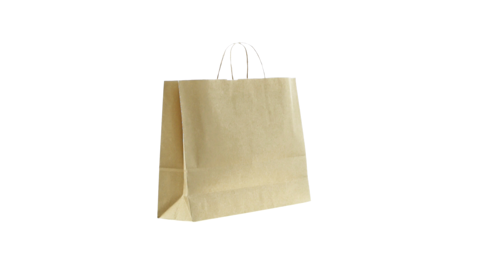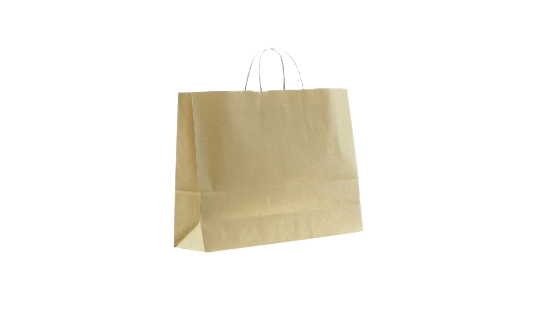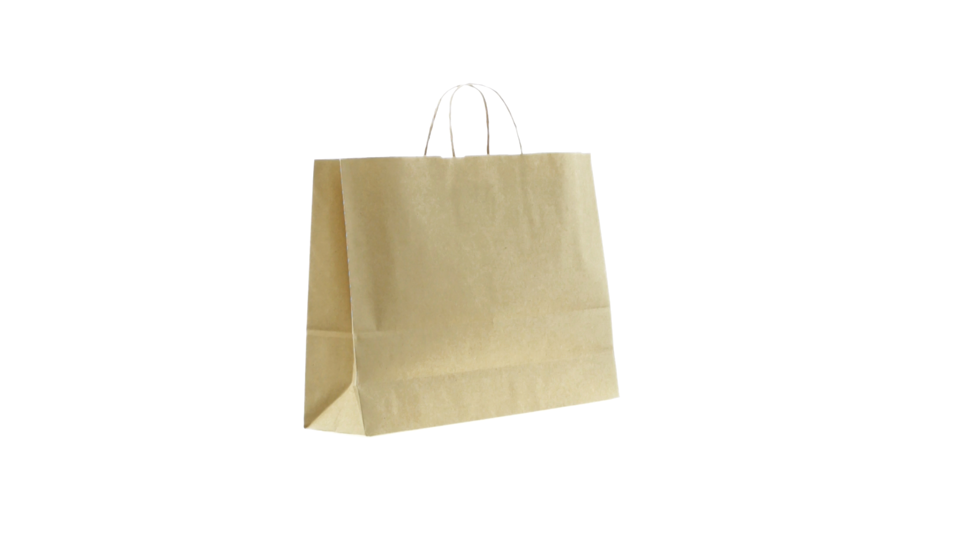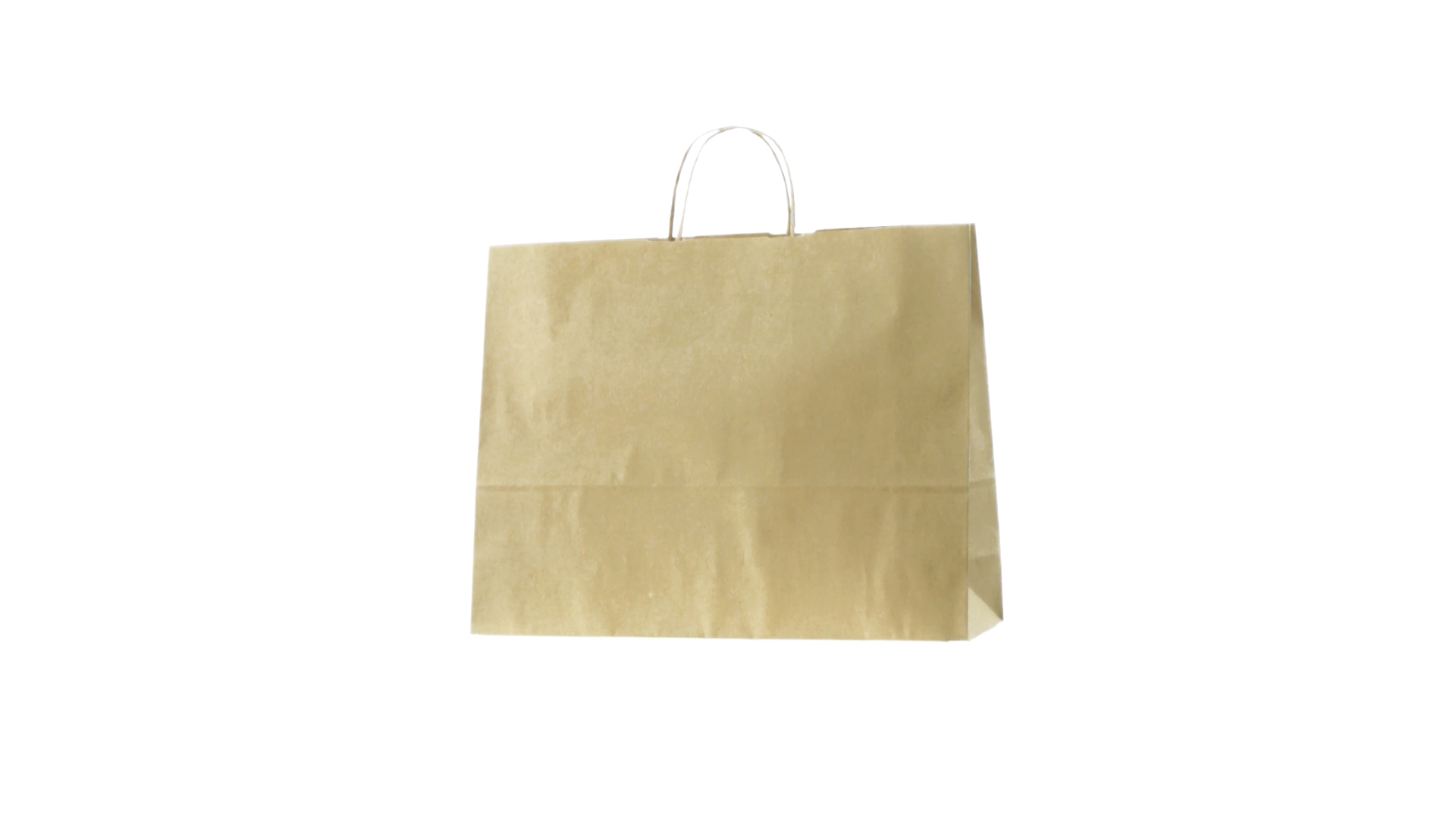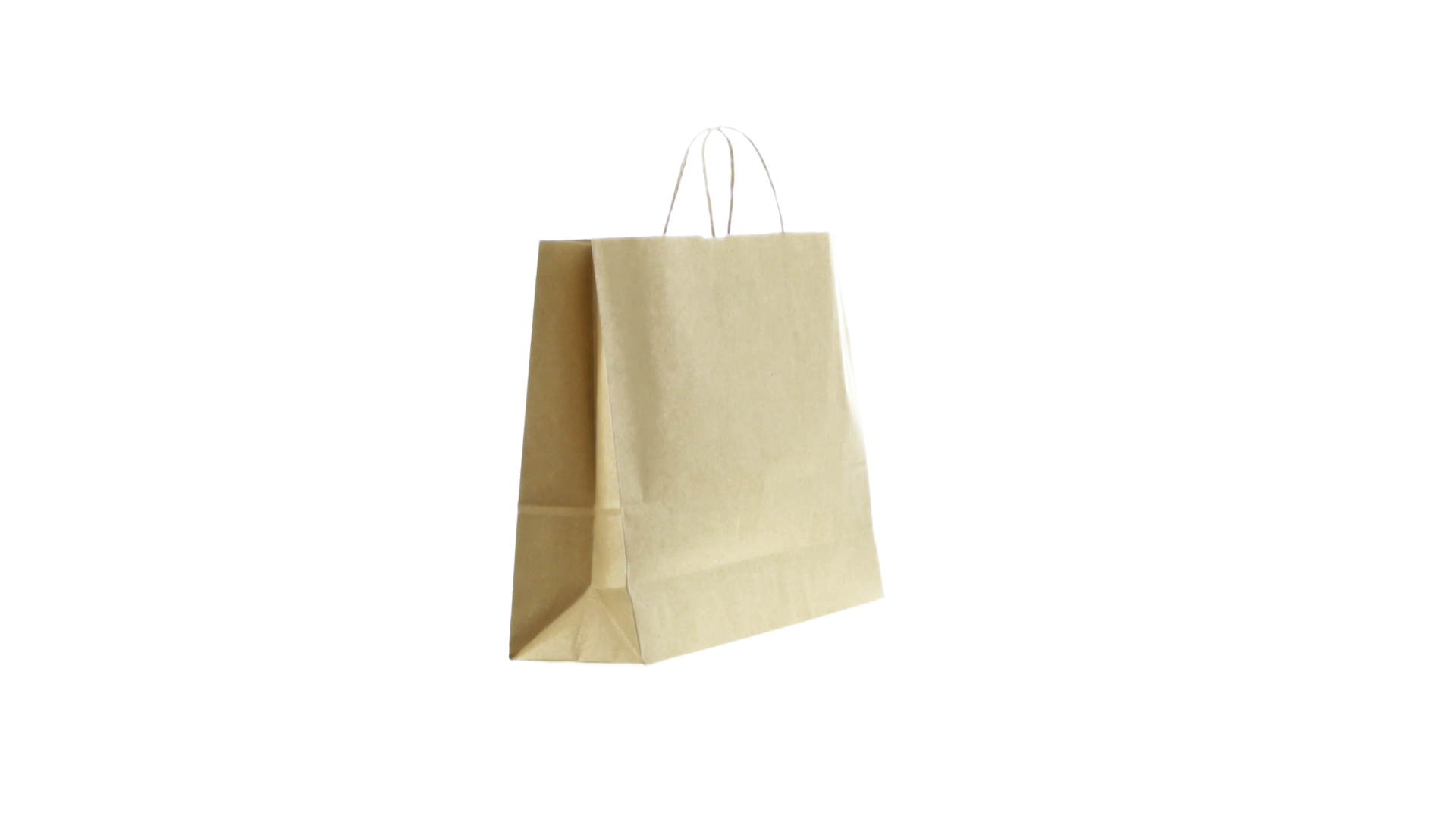 Tüte aus Papier (100 g/m2) in Naturfarbe mit kurzen, verstärkten Griffen und Zwickel. Belastbar mit bis zu 7 kg.