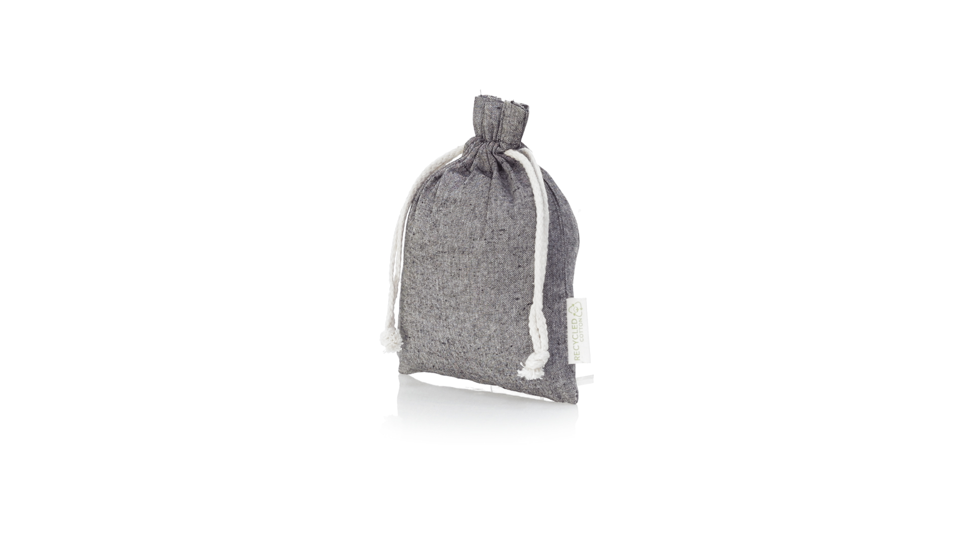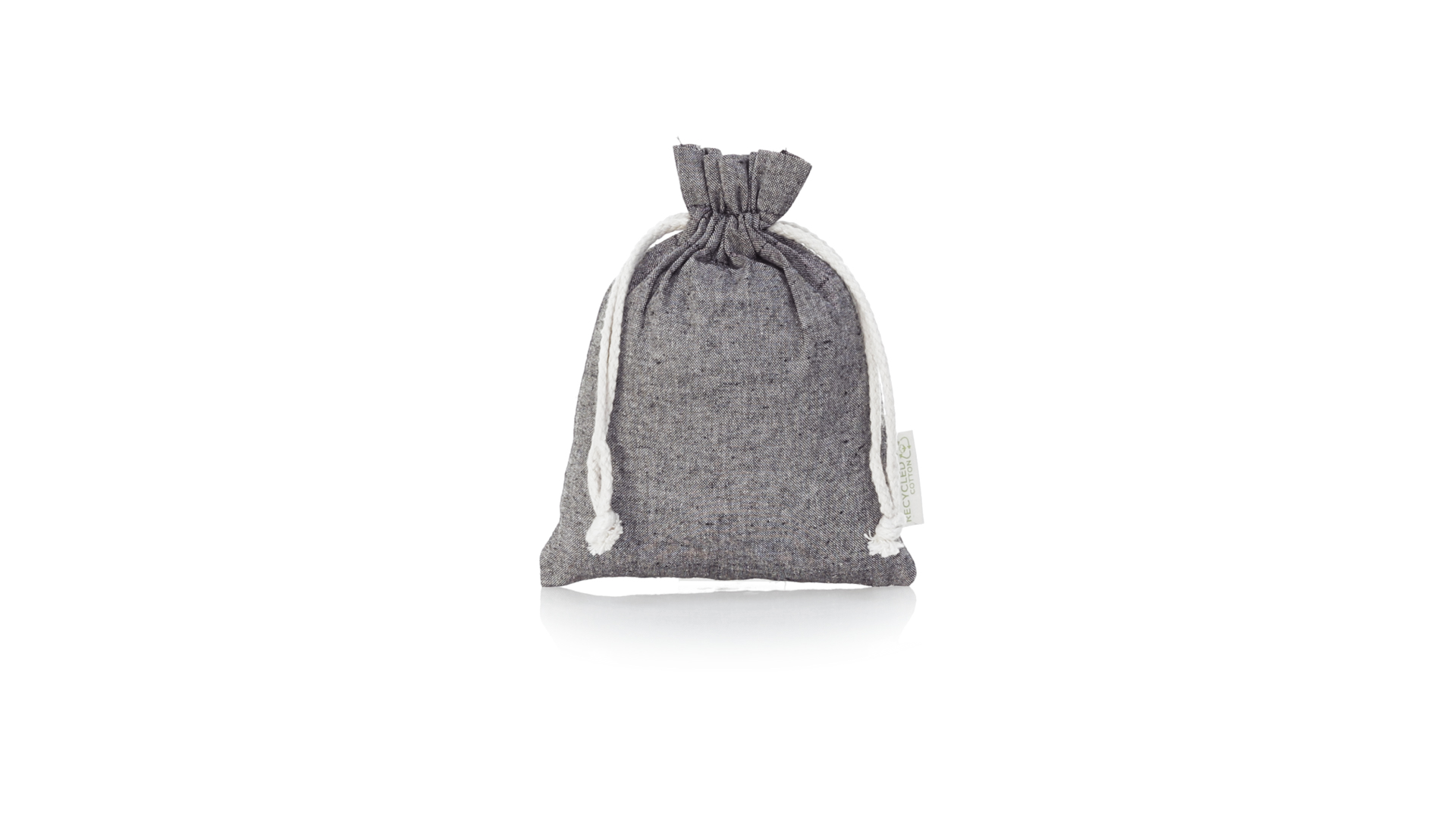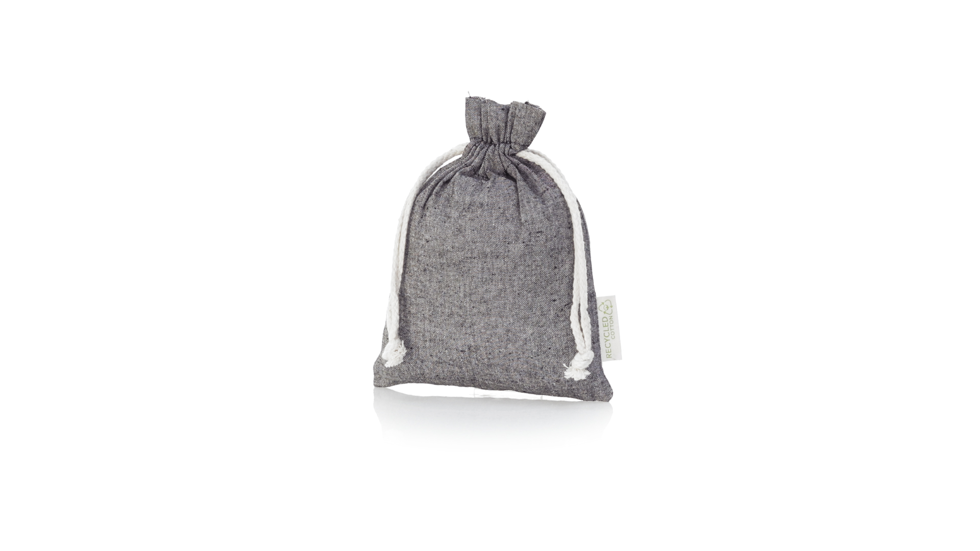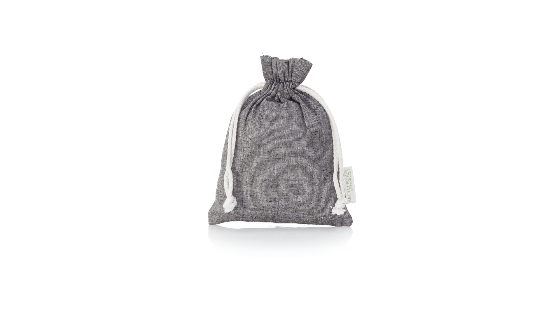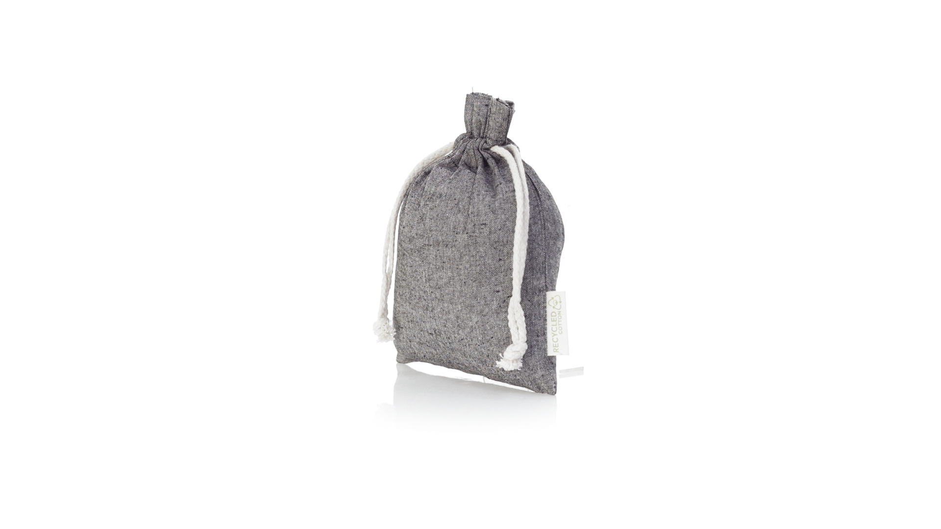 Umweltfreundliche Tasche aus widerstandsfähigem, recyceltem Baumwollmaterial von 120 g/m2. GRS-Zertifizierung (Global Recycled Standard), die die recycelte Herkunft des für die Herstellung des Produkts verwendeten Materials garantiert. Kordelzugverschluss aus Baumwolle und genähtes Finish, einschliesslich Aussenetikett mit Logo aus recycelter Baumwolle.