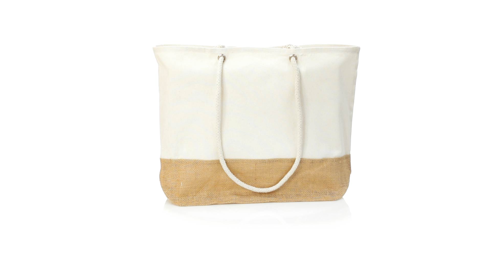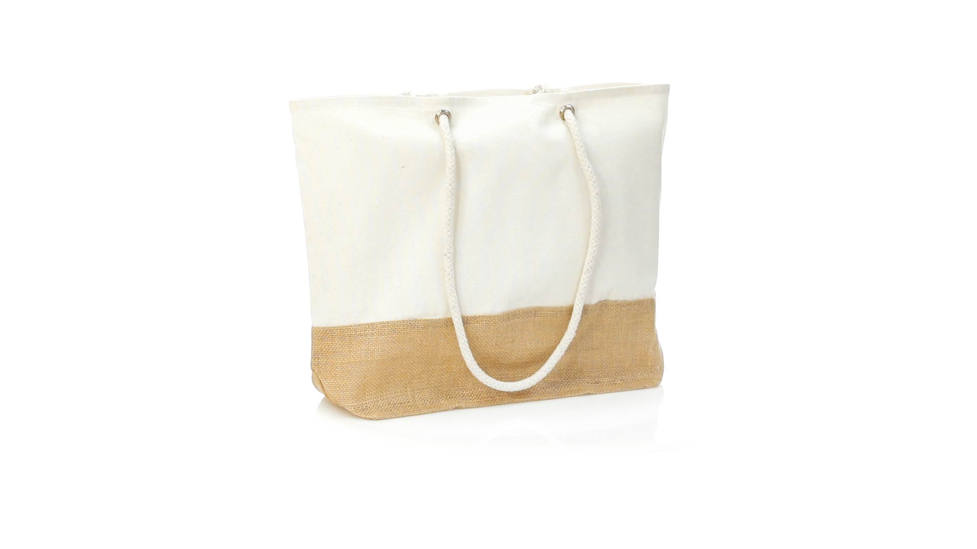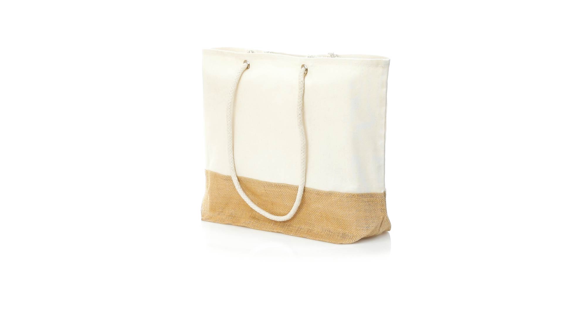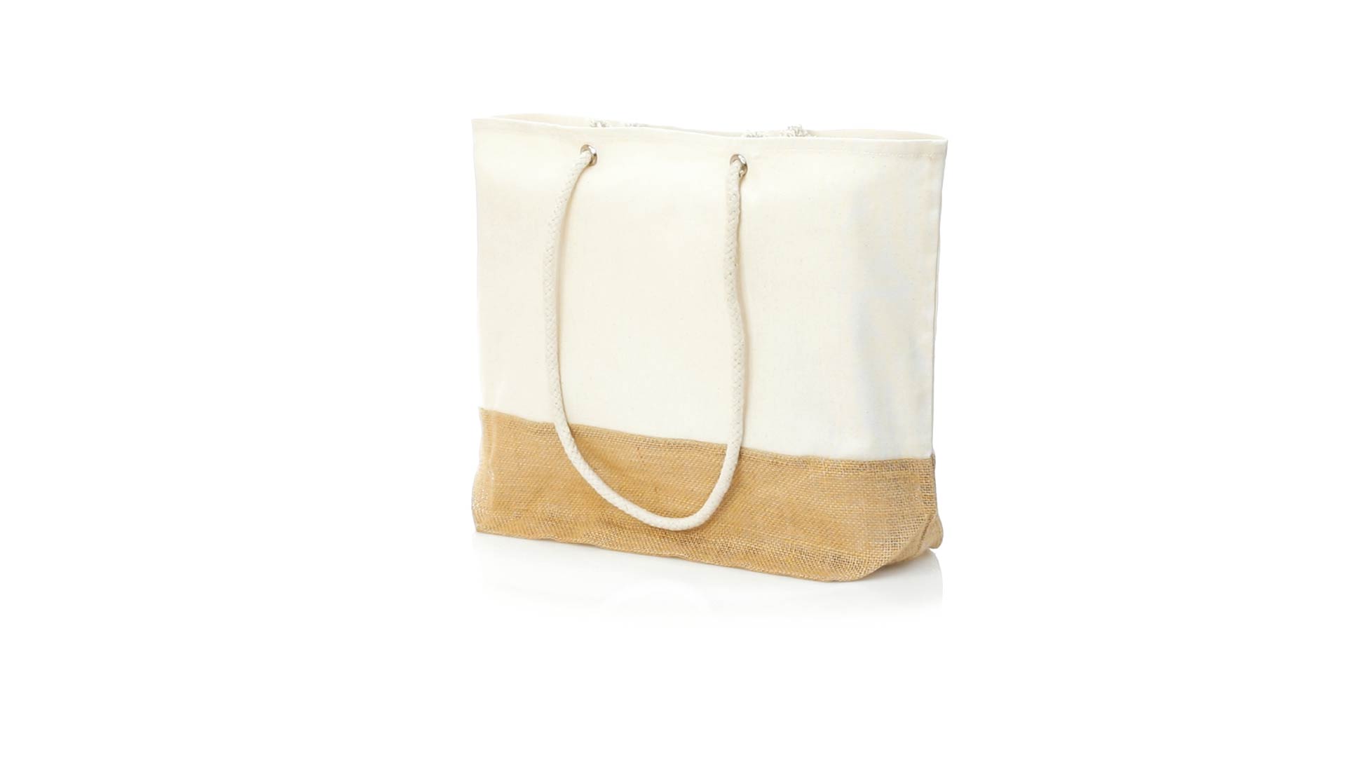 Tasche aus unserer Naturlinie in einer Kombination aus Jute- und Baumwollmaterialien. Grösse 48 x 35 + 15 cm, mit genähter Verarbeitung und langen, verstärkten Henkeln mit 90 cm Länge aus Baumwolle. Widerstandsfähig bis zu 9 kg Gewicht.