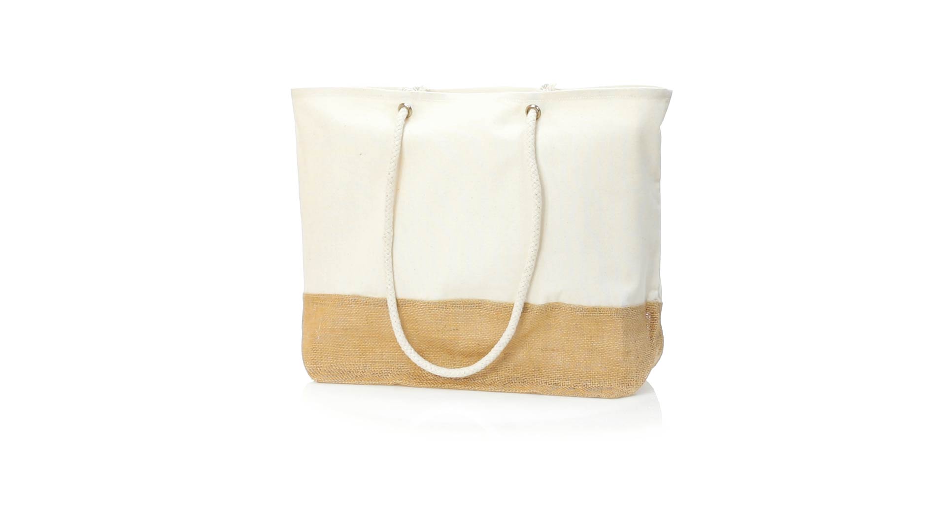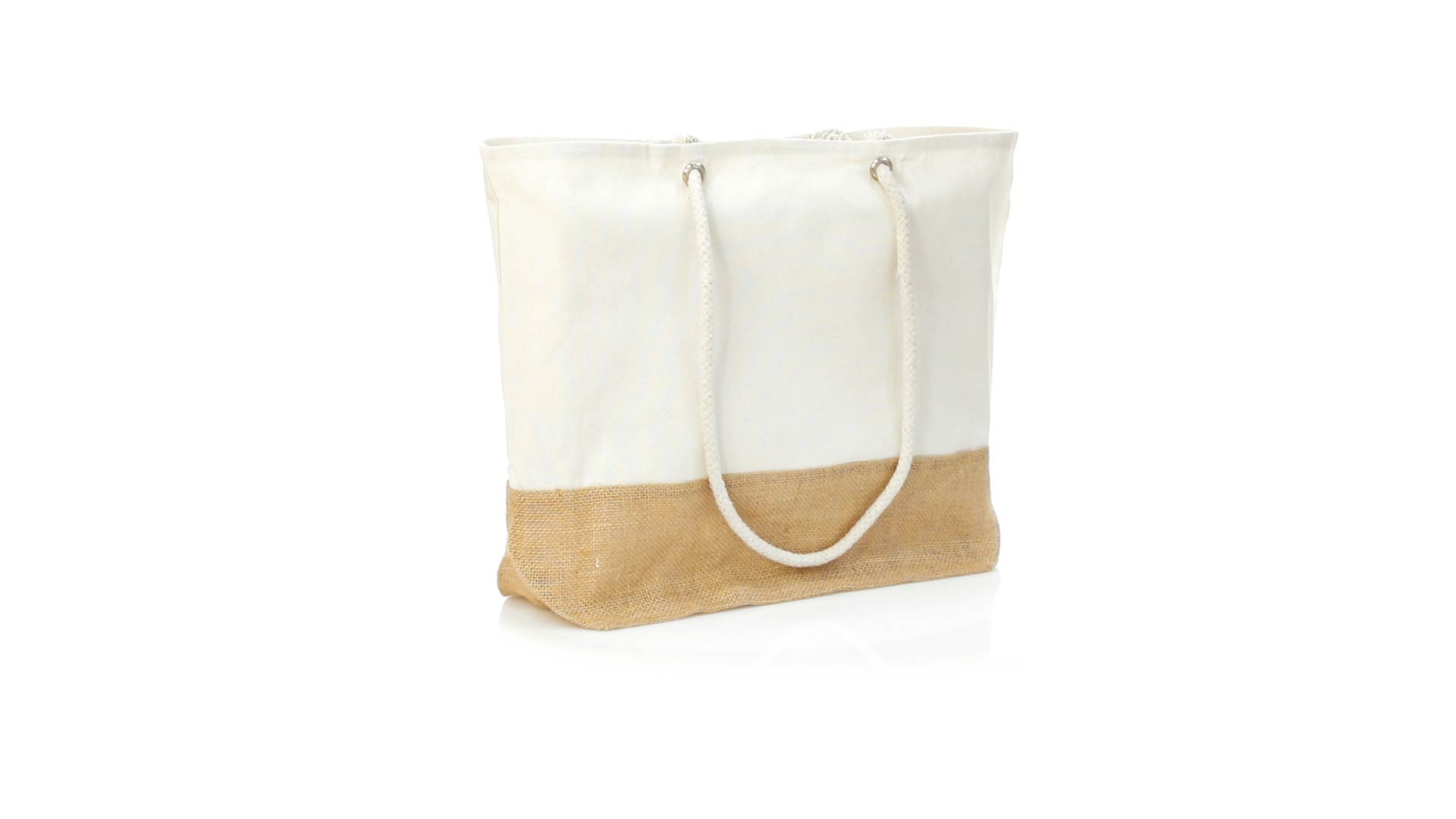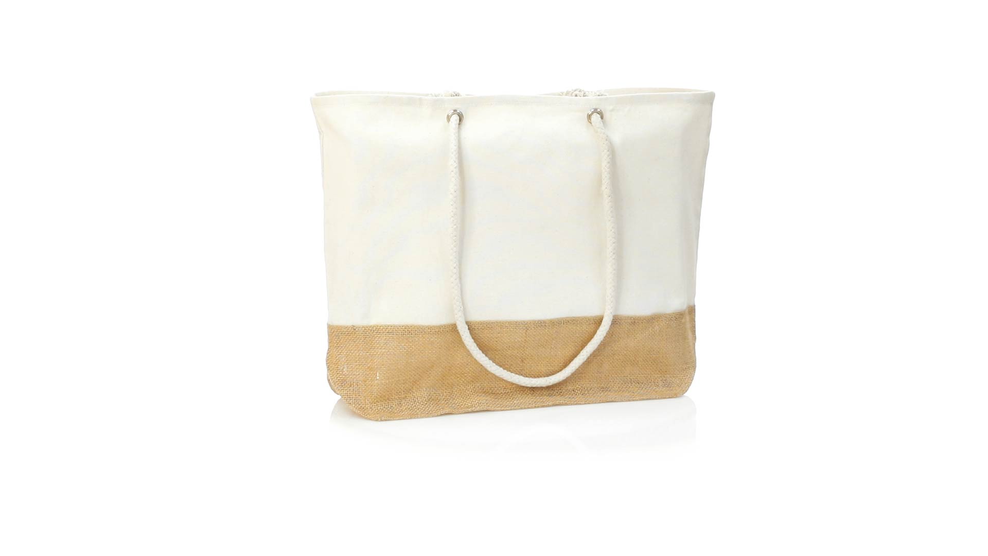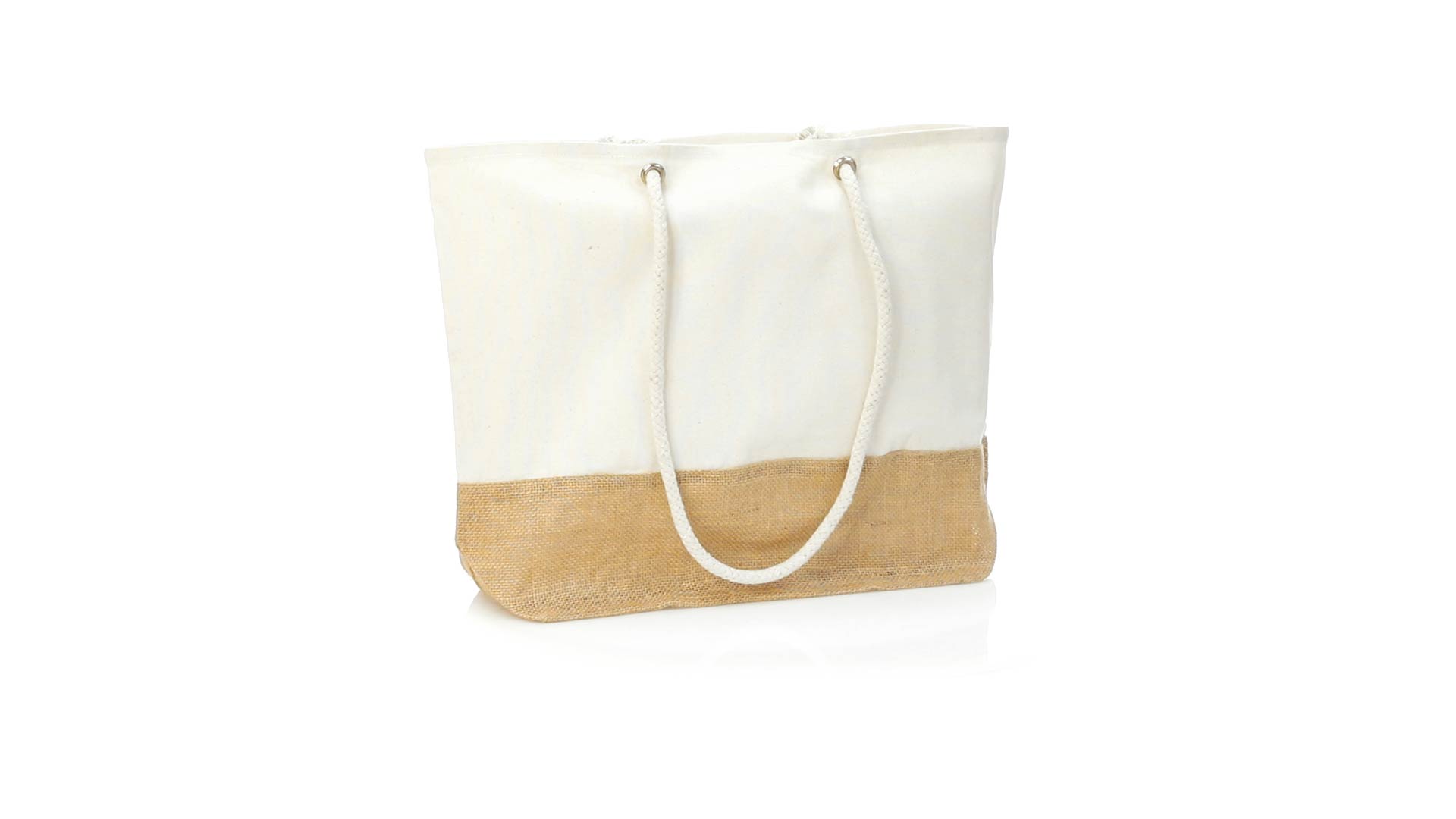 Tasche aus unserer Naturlinie in einer Kombination aus Jute- und Baumwollmaterialien. Grösse 48 x 35 + 15 cm, mit genähter Verarbeitung und langen, verstärkten Henkeln mit 90 cm Länge aus Baumwolle. Widerstandsfähig bis zu 9 kg Gewicht.