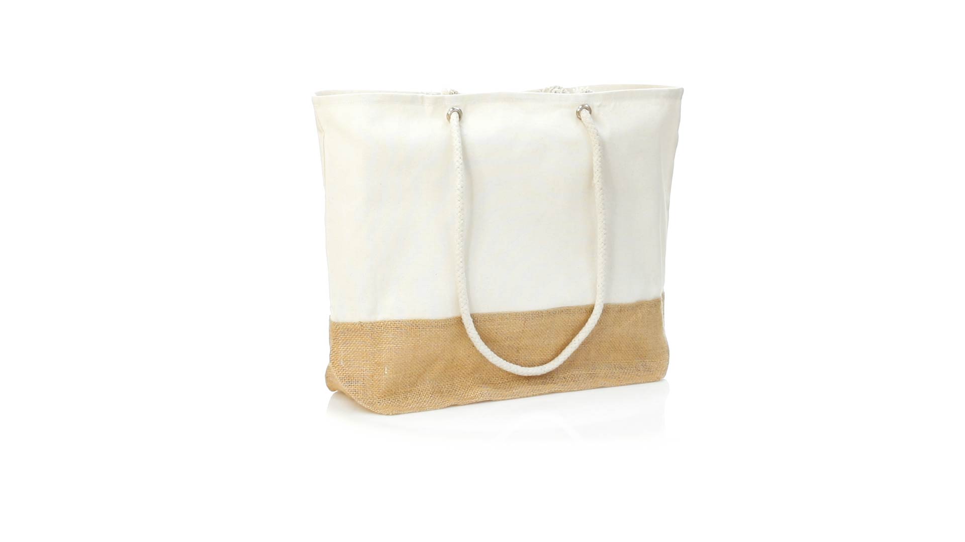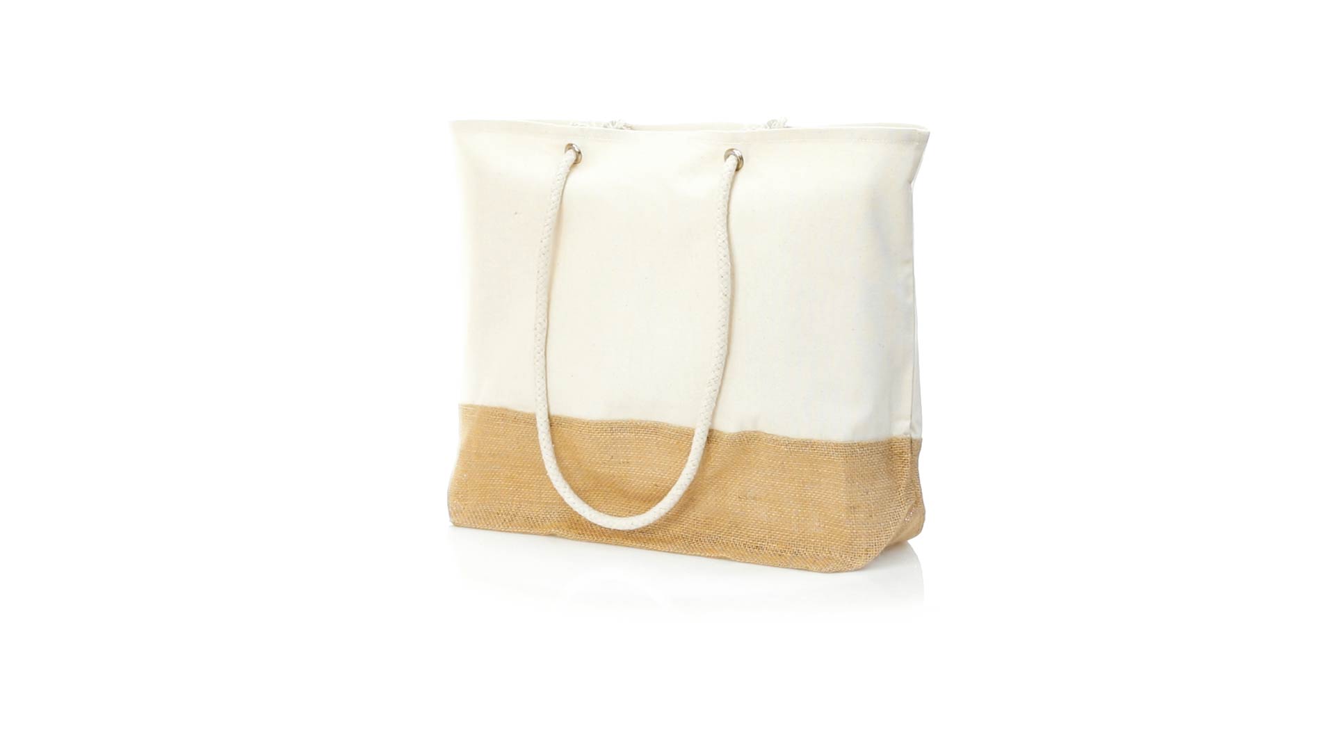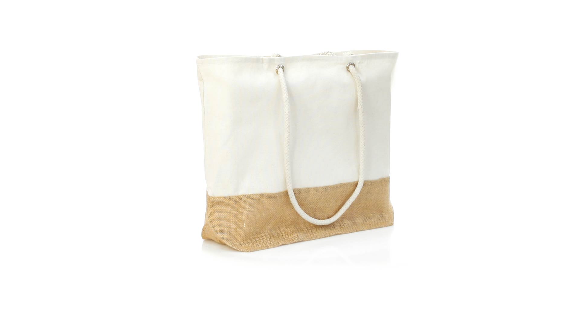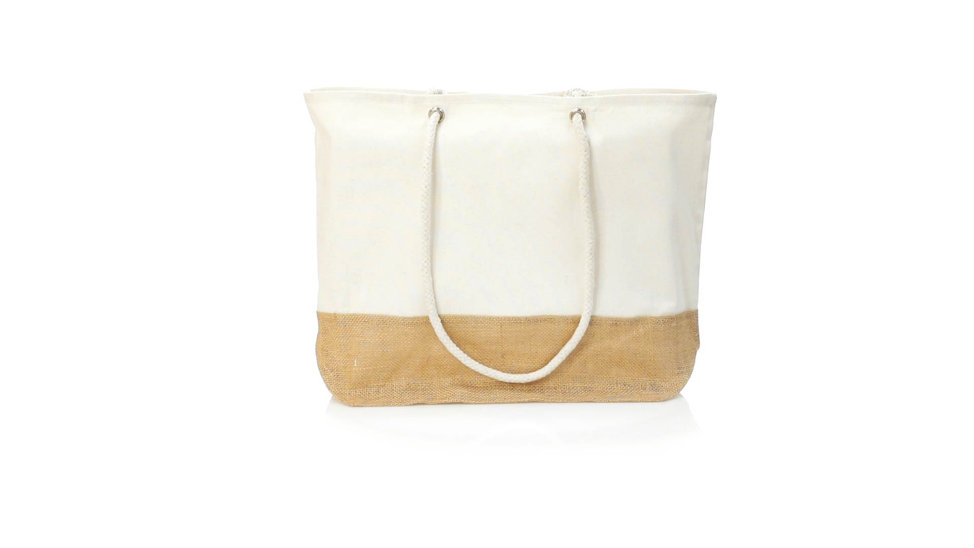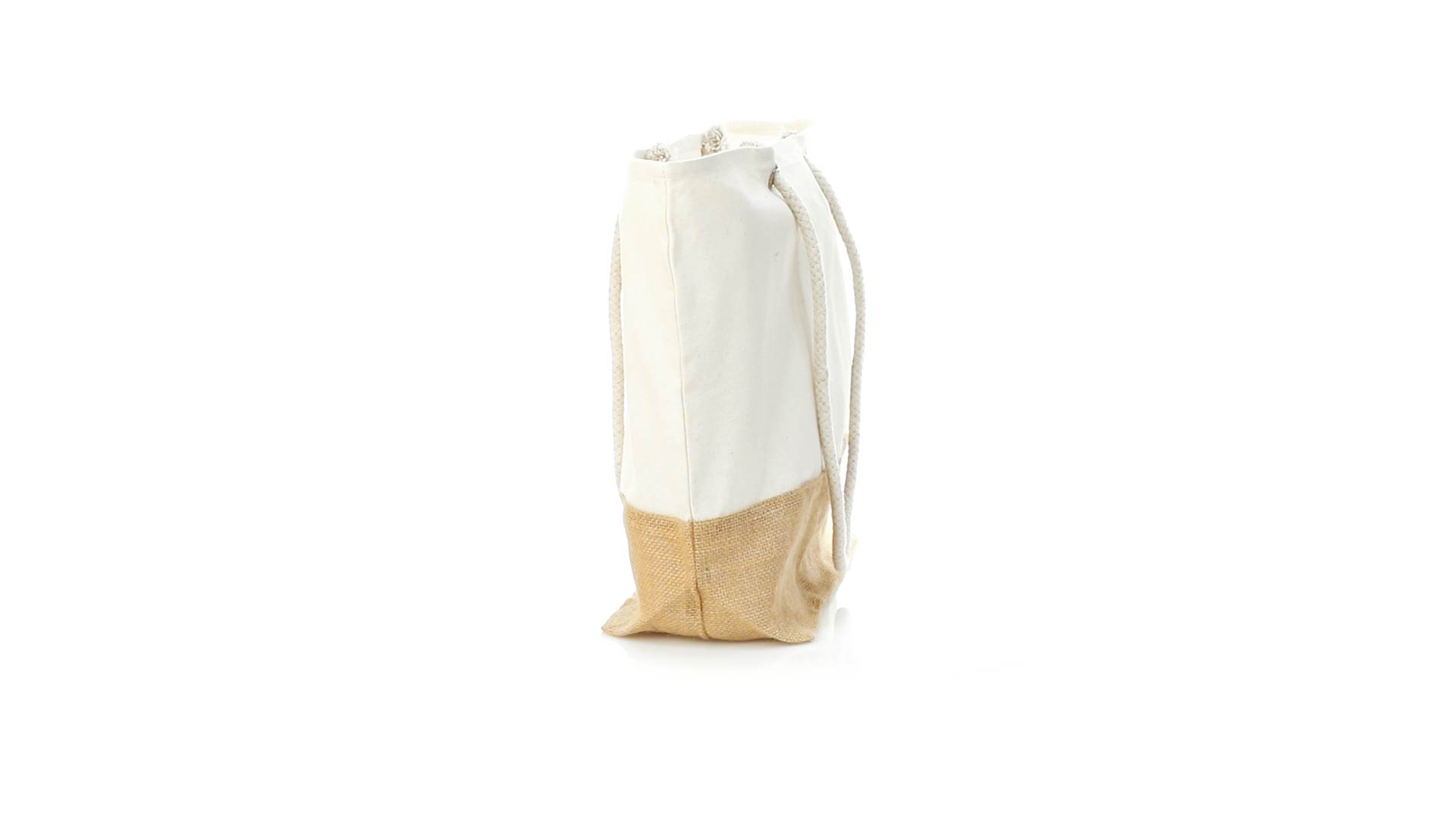 Tasche aus unserer Naturlinie in einer Kombination aus Jute- und Baumwollmaterialien. Grösse 48 x 35 + 15 cm, mit genähter Verarbeitung und langen, verstärkten Henkeln mit 90 cm Länge aus Baumwolle. Widerstandsfähig bis zu 9 kg Gewicht.