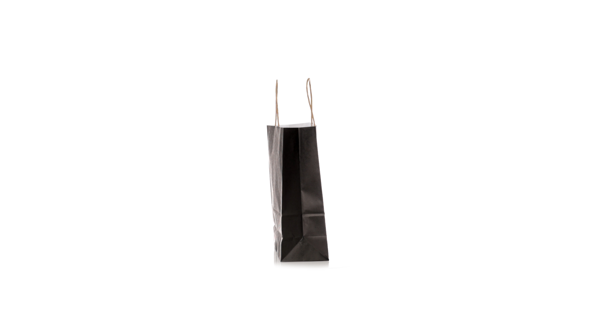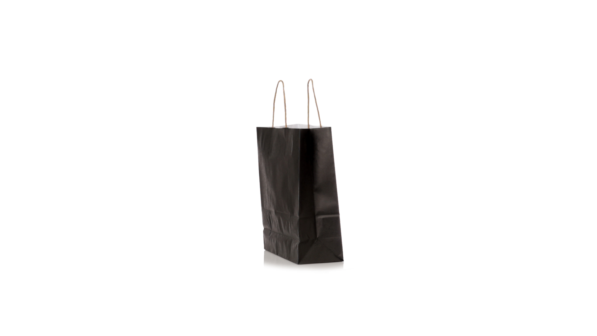 Natur Linie Tasche aus 100g/m2 Recyclingpapier in schwarzer Ausführung, mit kurzen, verstärkten Griffen in Naturfarbe und Zwickel. Widerstandsfähig bis zu einem Gewicht von 6 kg.