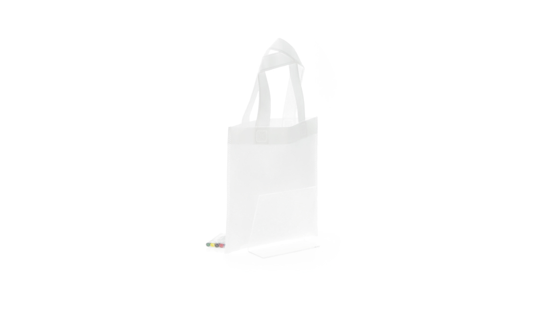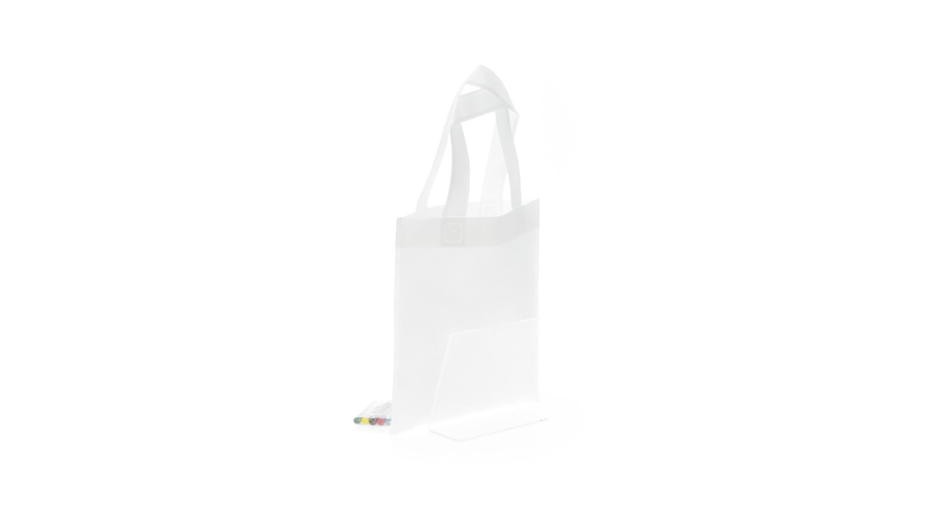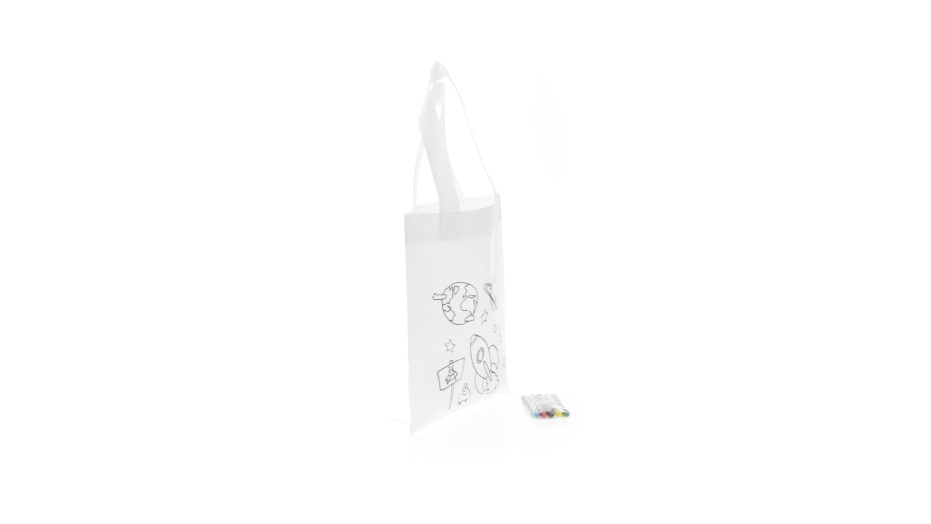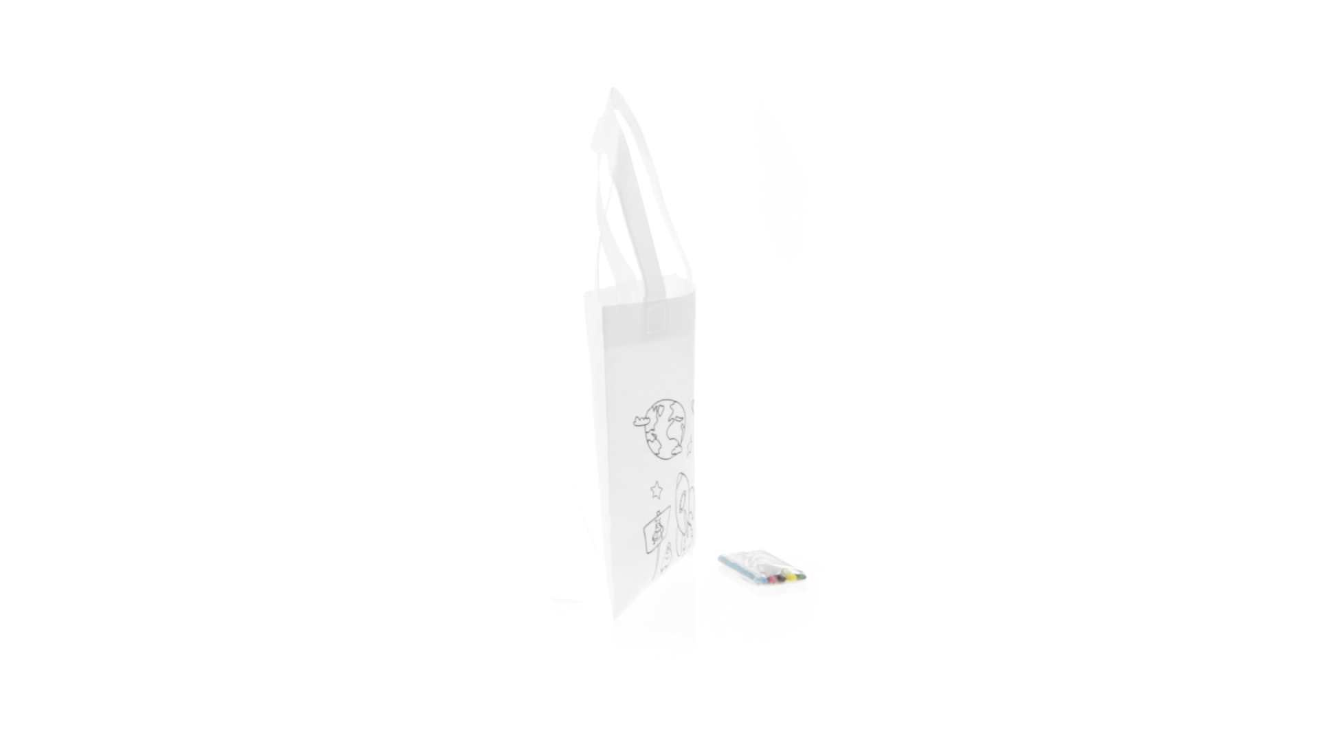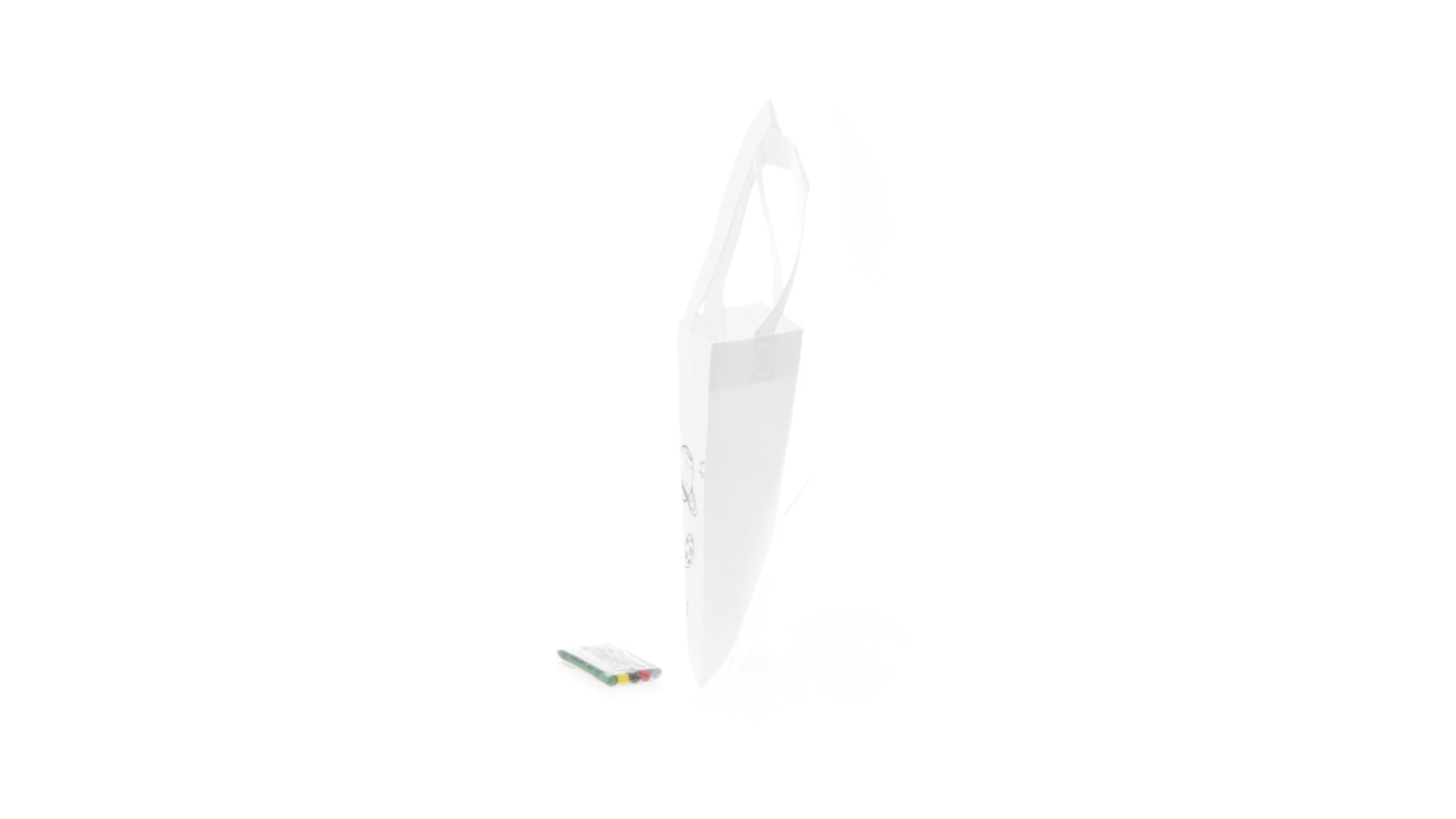 Non-Woven-Tasche aus Faservlies in Weiss. Speziell entwickelt für das Bemalen mit Wachsmalstiften. Enthält 5 zylinderförmige Wachsmalstifte in verschiedenen Farben. Mit 33 cm langen Henkeln und hitzeversiegeltem Finish.