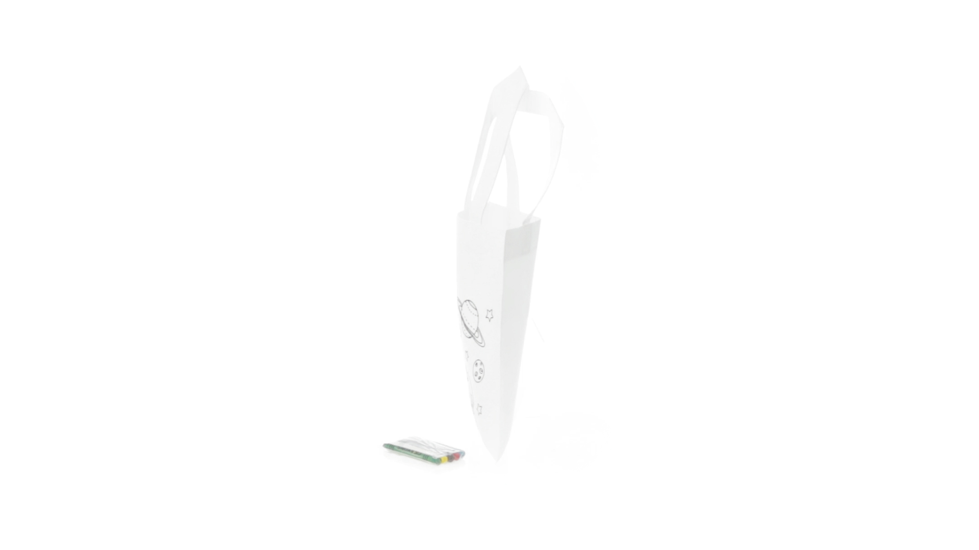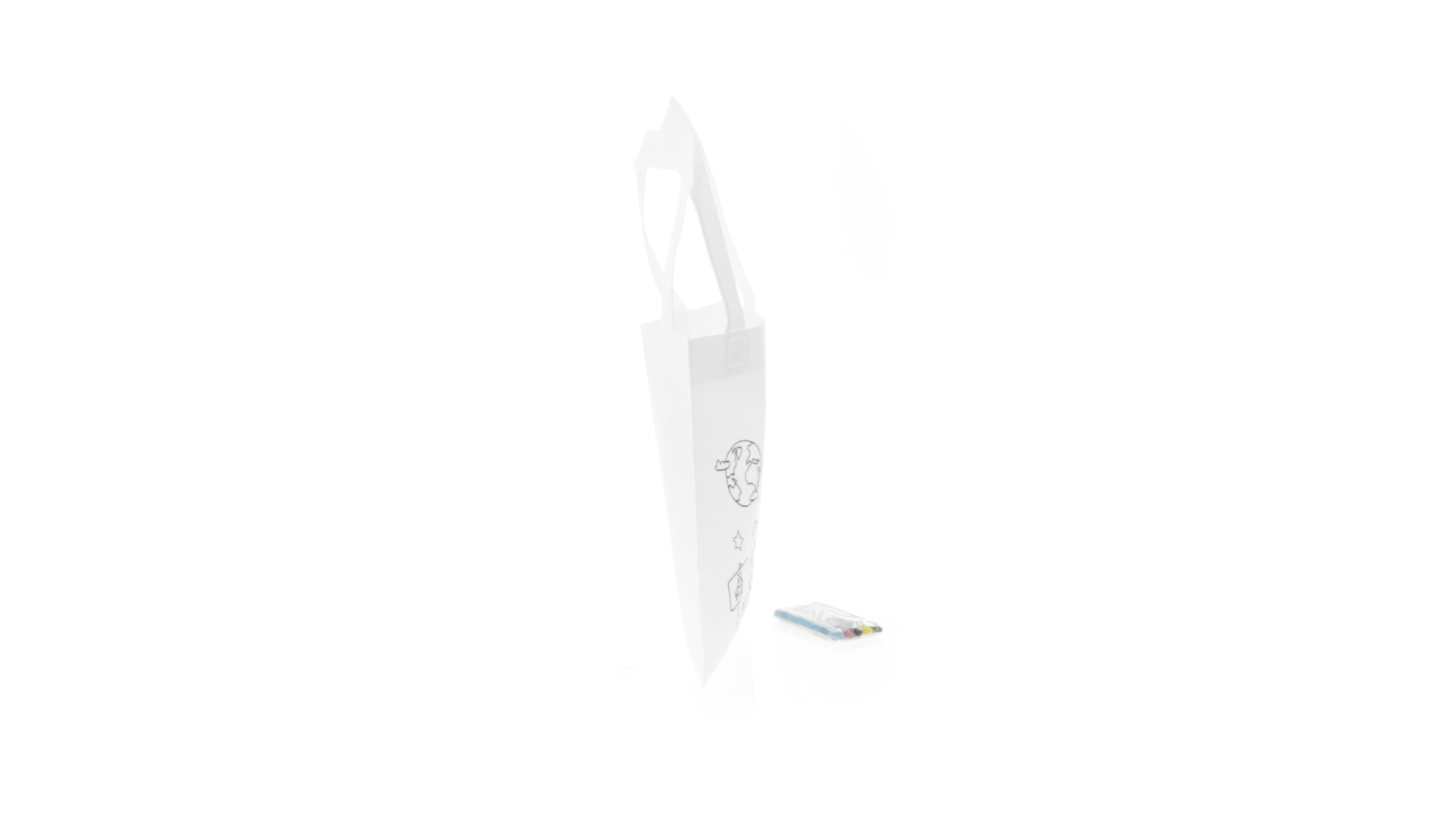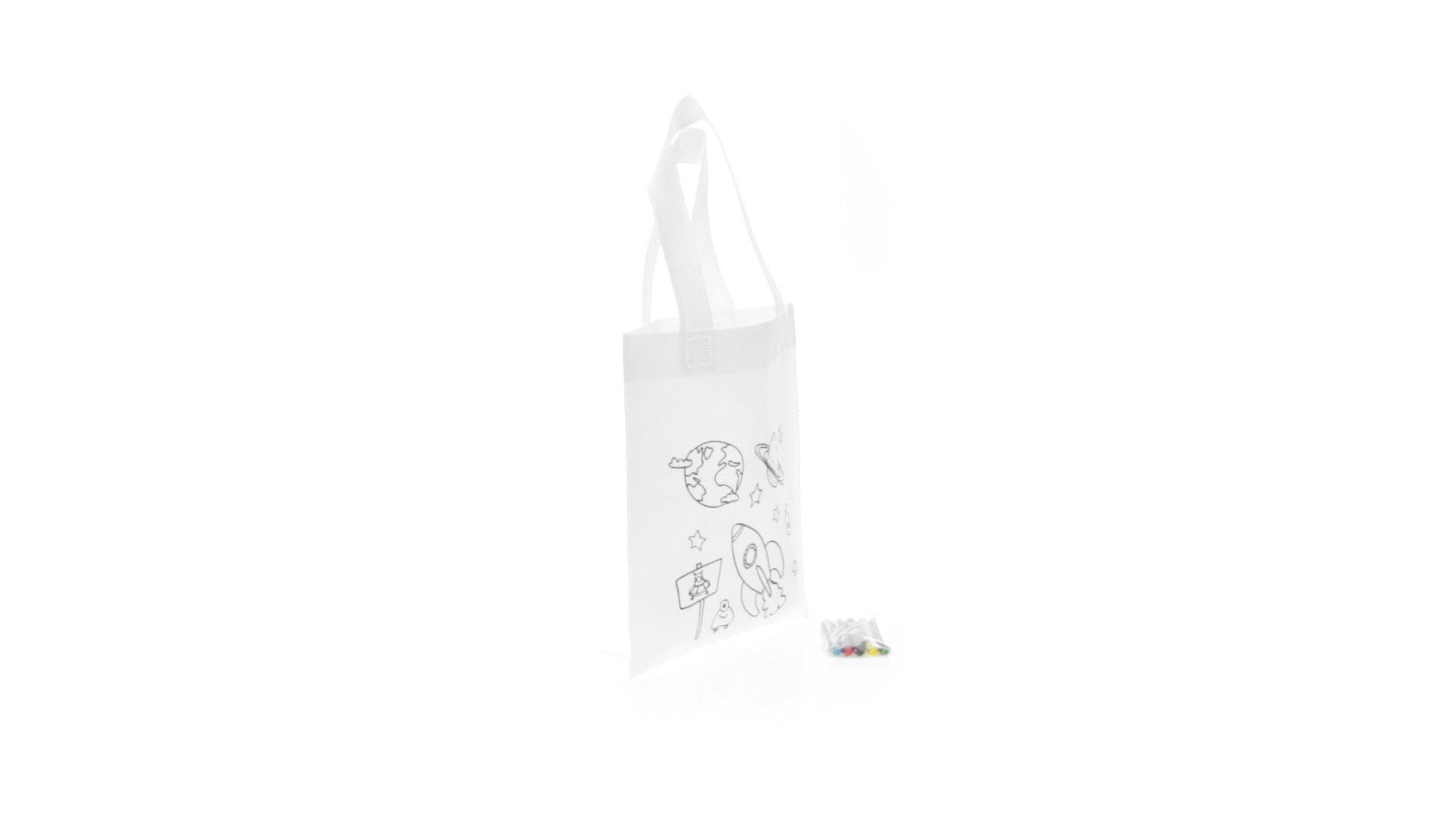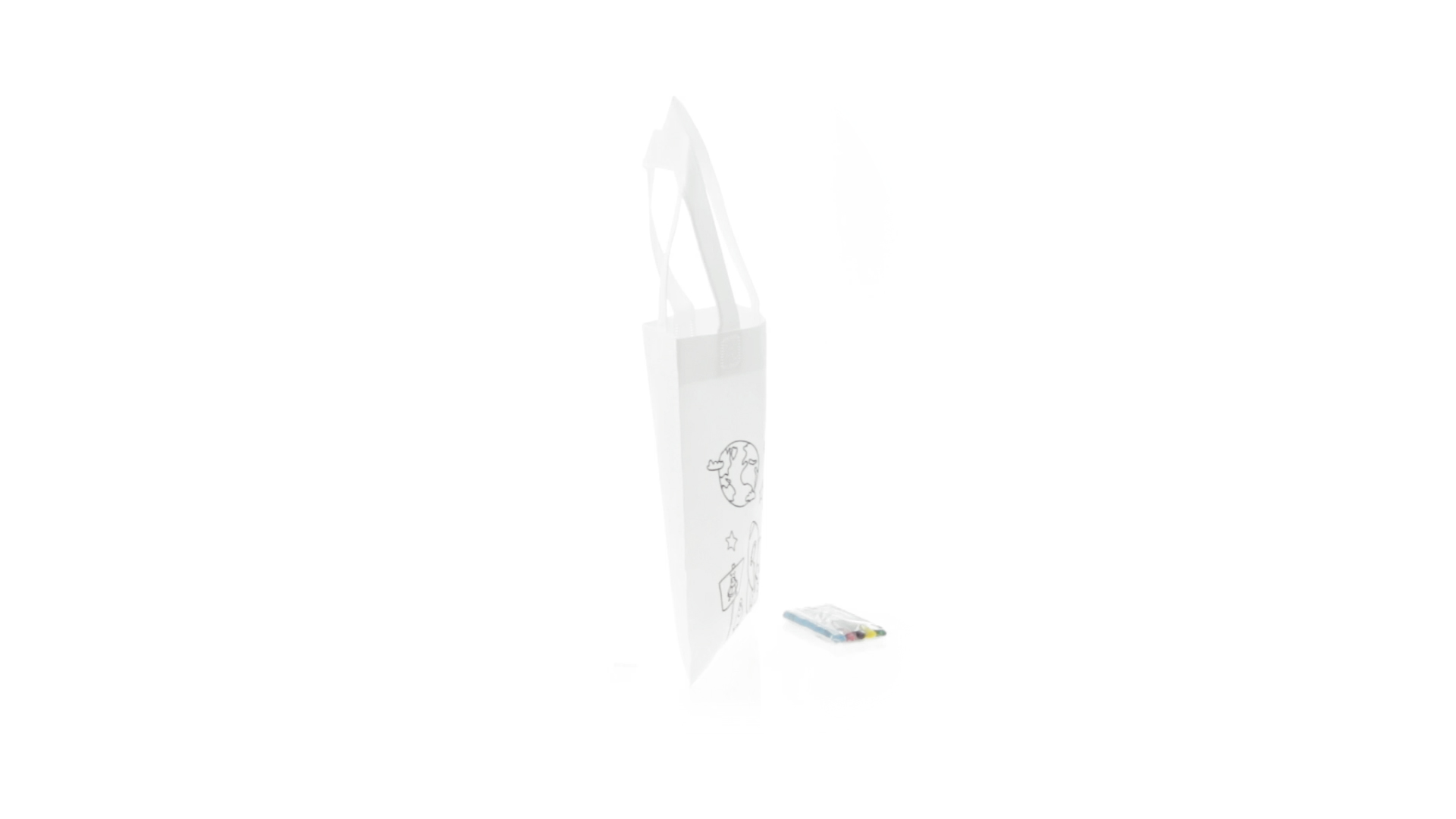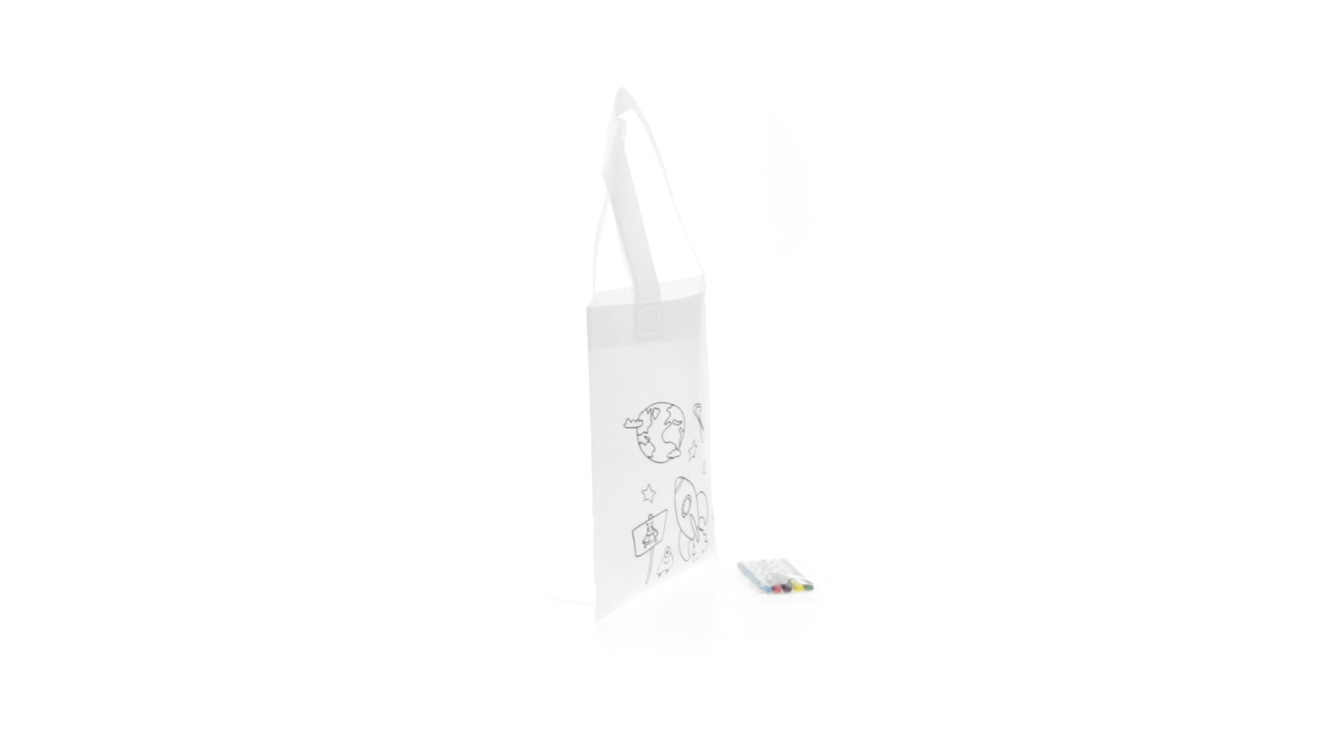 Non-Woven-Tasche aus Faservlies in Weiss. Speziell entwickelt für das Bemalen mit Wachsmalstiften. Enthält 5 zylinderförmige Wachsmalstifte in verschiedenen Farben. Mit 33 cm langen Henkeln und hitzeversiegeltem Finish.