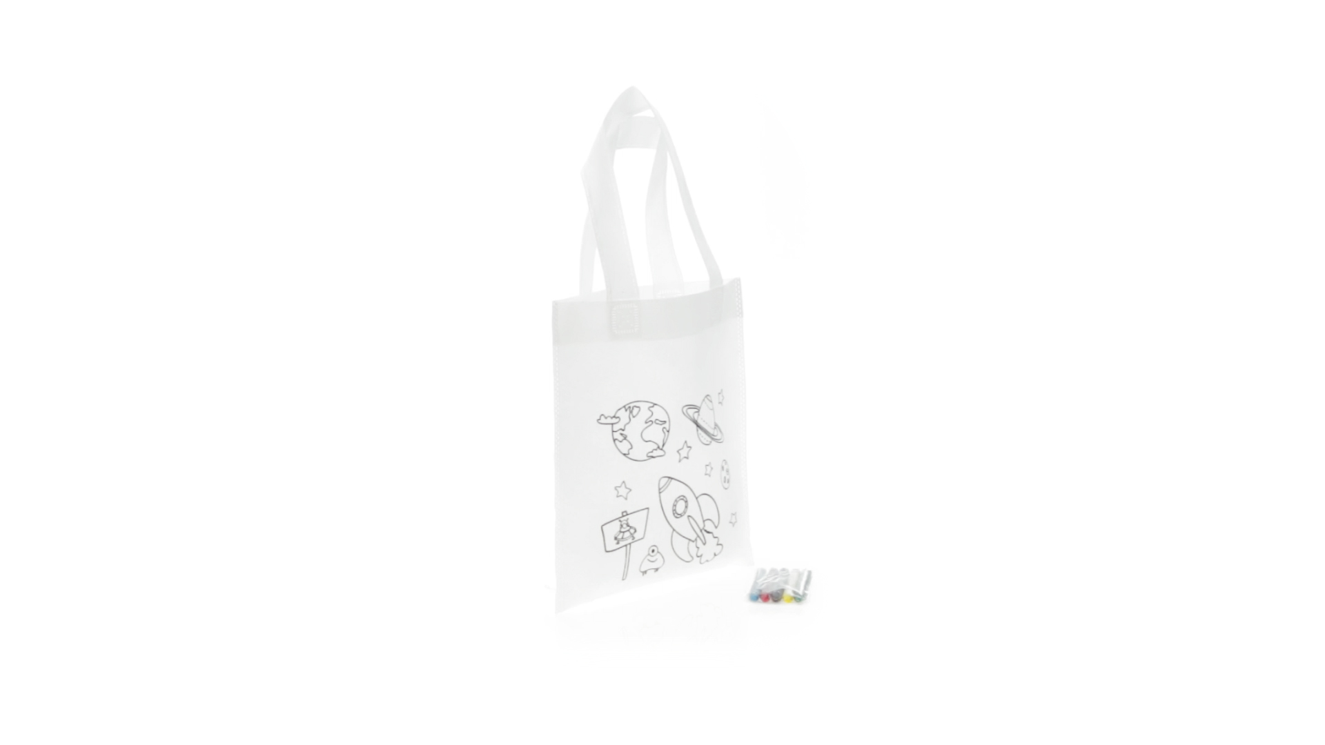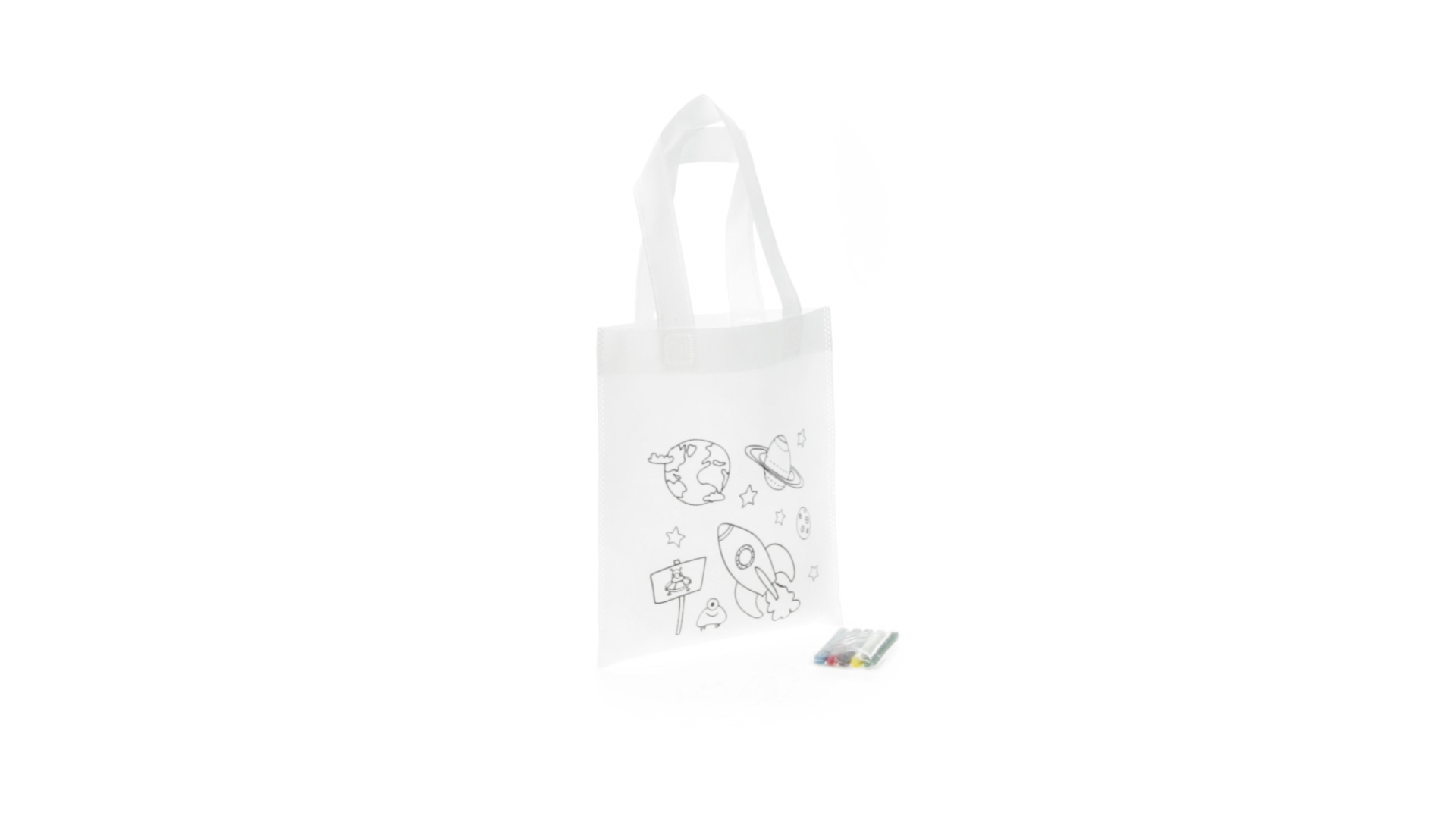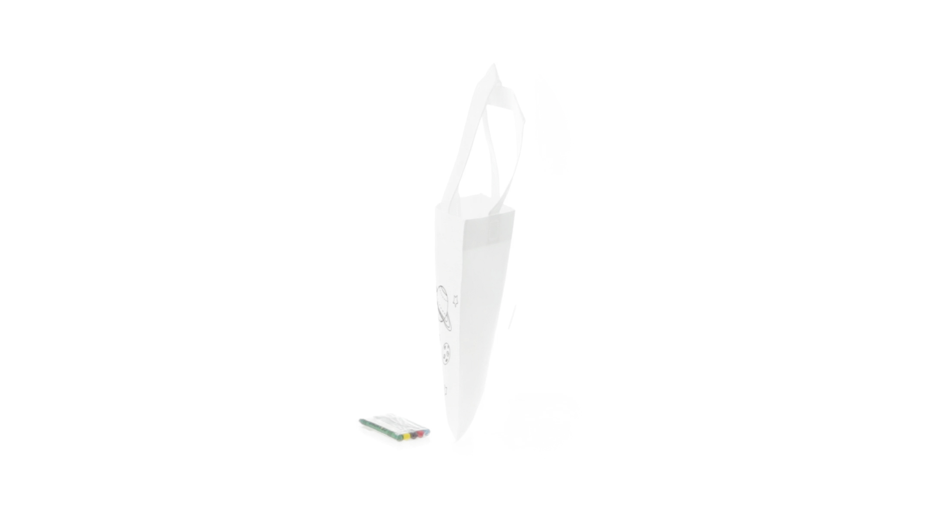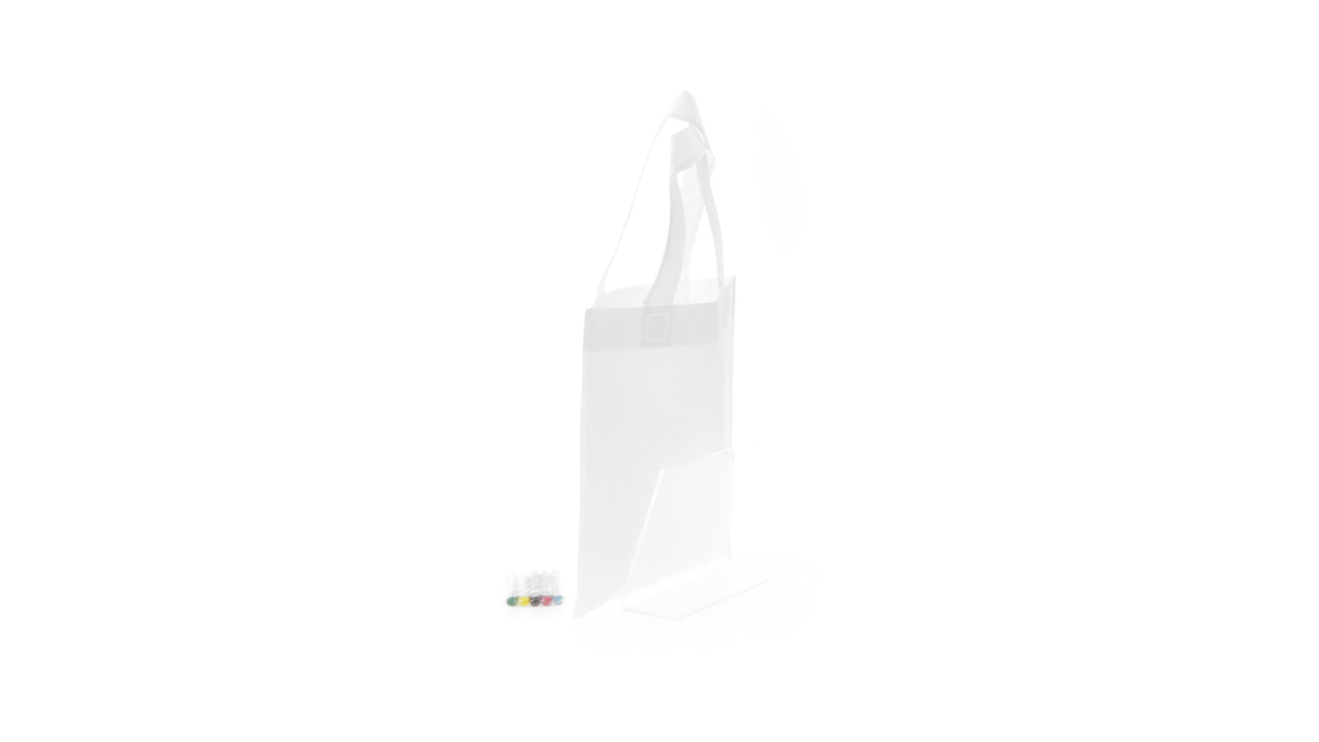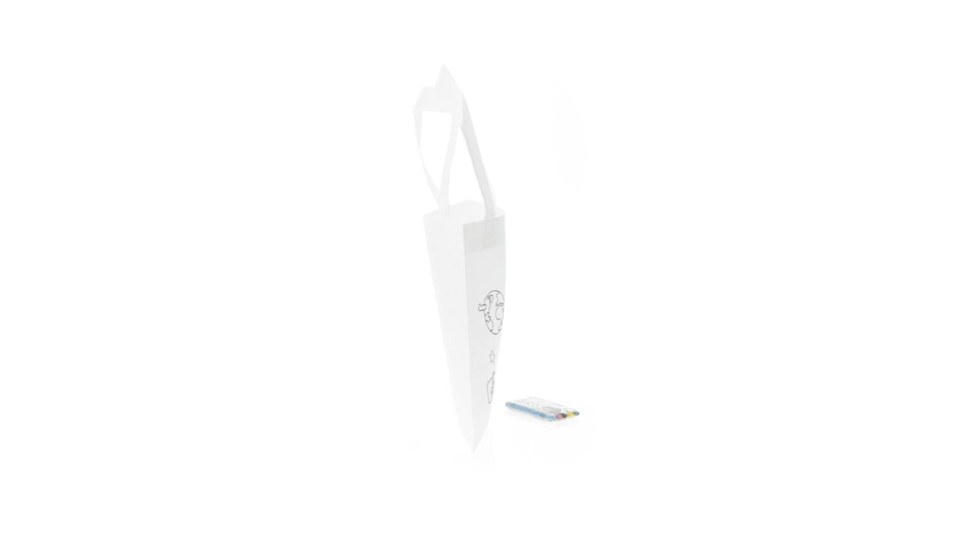 Non-Woven-Tasche aus Faservlies in Weiss. Speziell entwickelt für das Bemalen mit Wachsmalstiften. Enthält 5 zylinderförmige Wachsmalstifte in verschiedenen Farben. Mit 33 cm langen Henkeln und hitzeversiegeltem Finish.